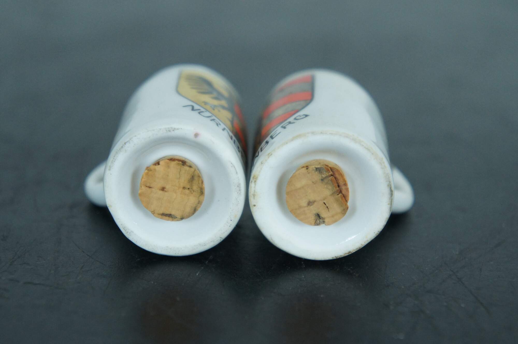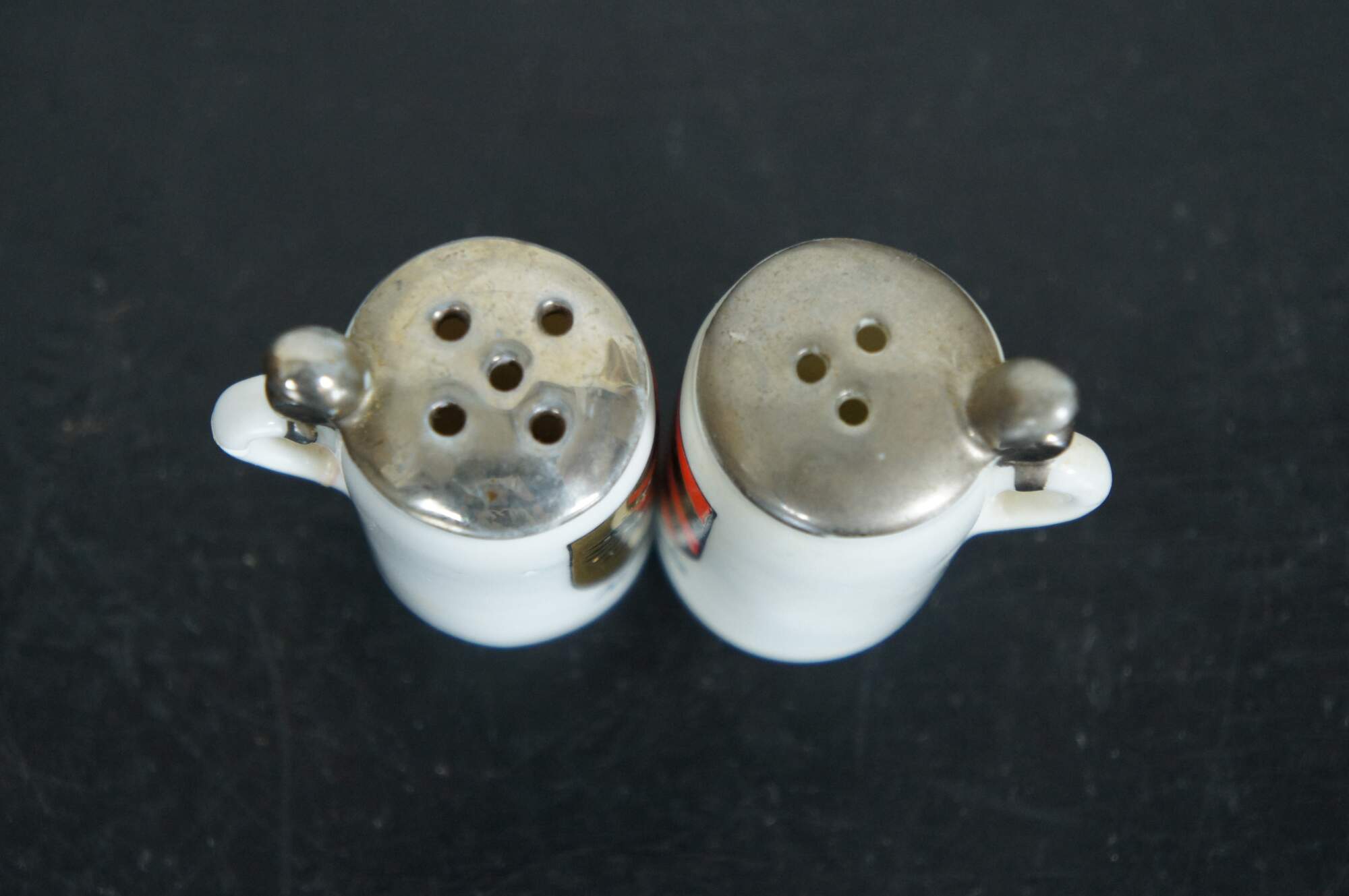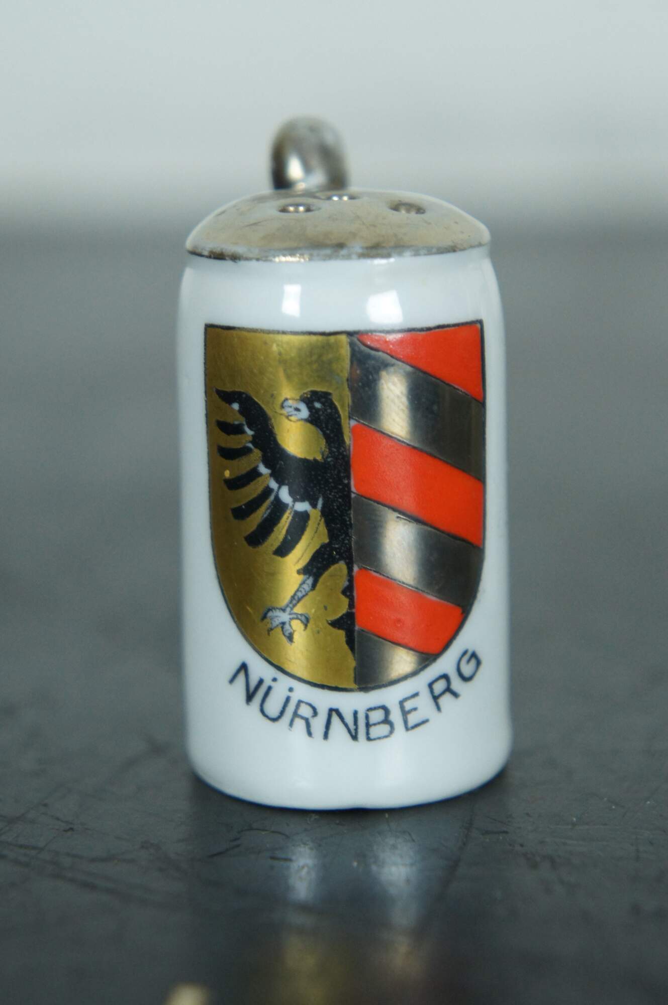 Vintage German Nurnberg salt and pepper shakers featuring heraldic crest / coat of arms in the form of steins / mugs or tankards.