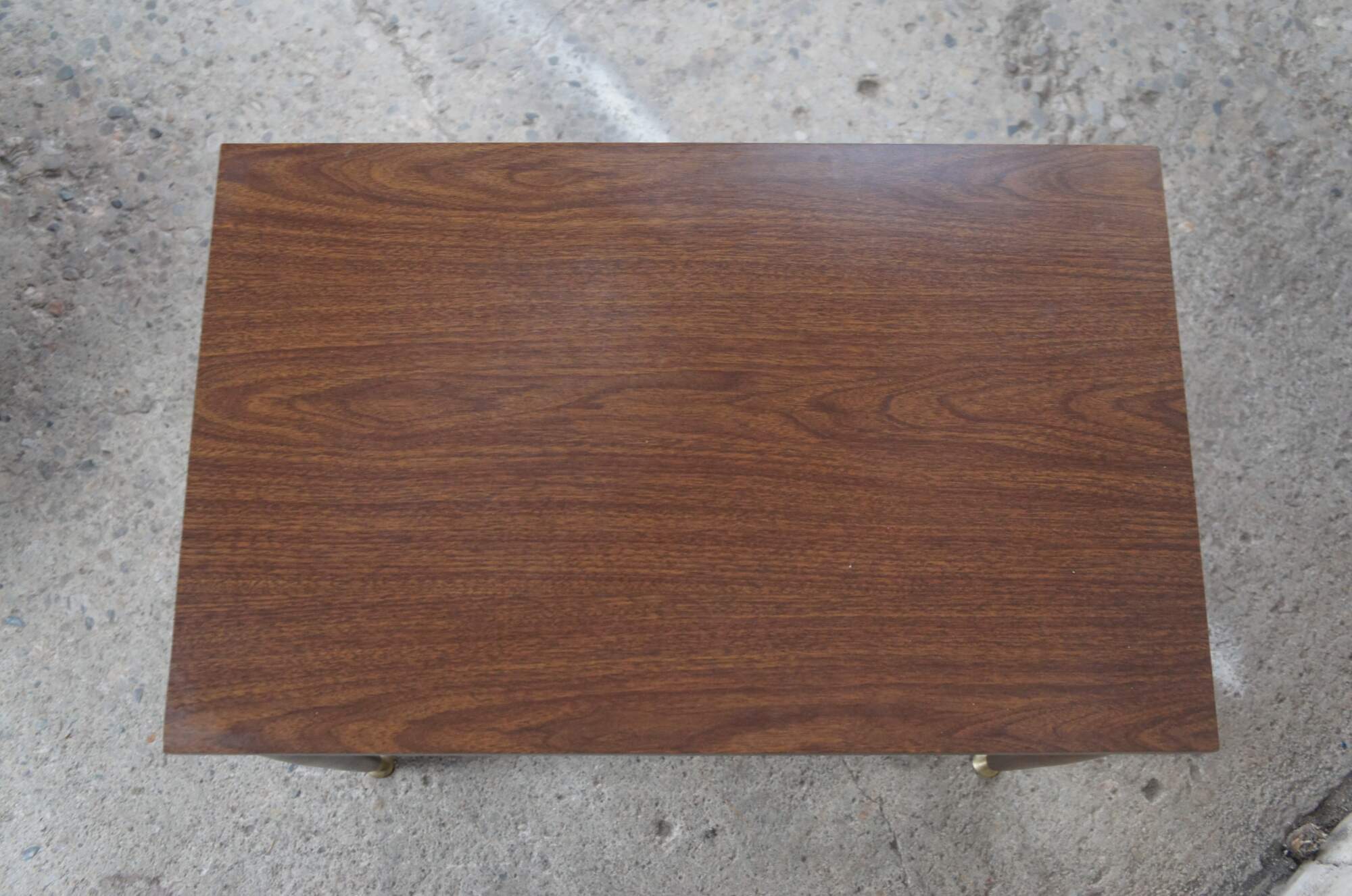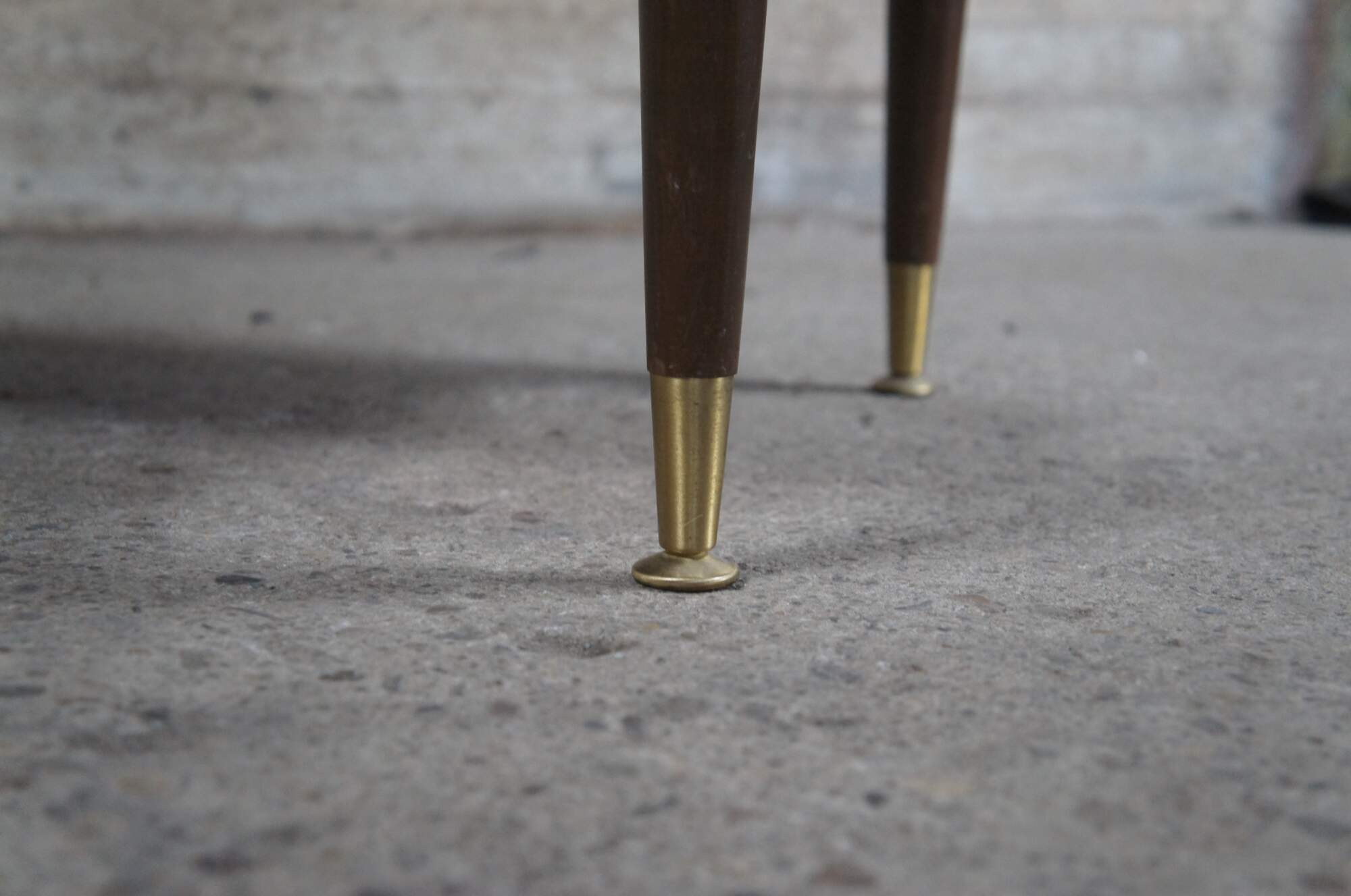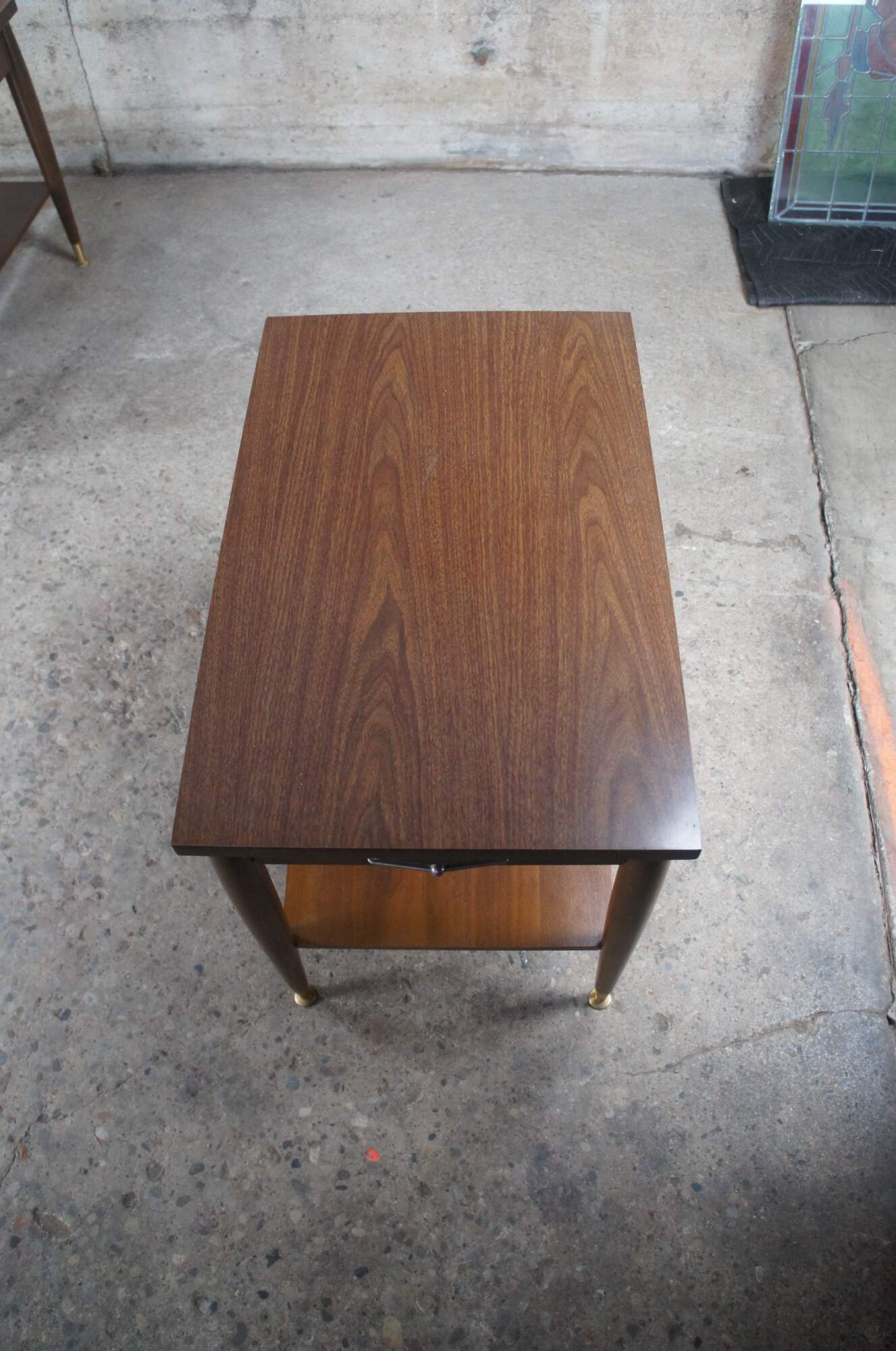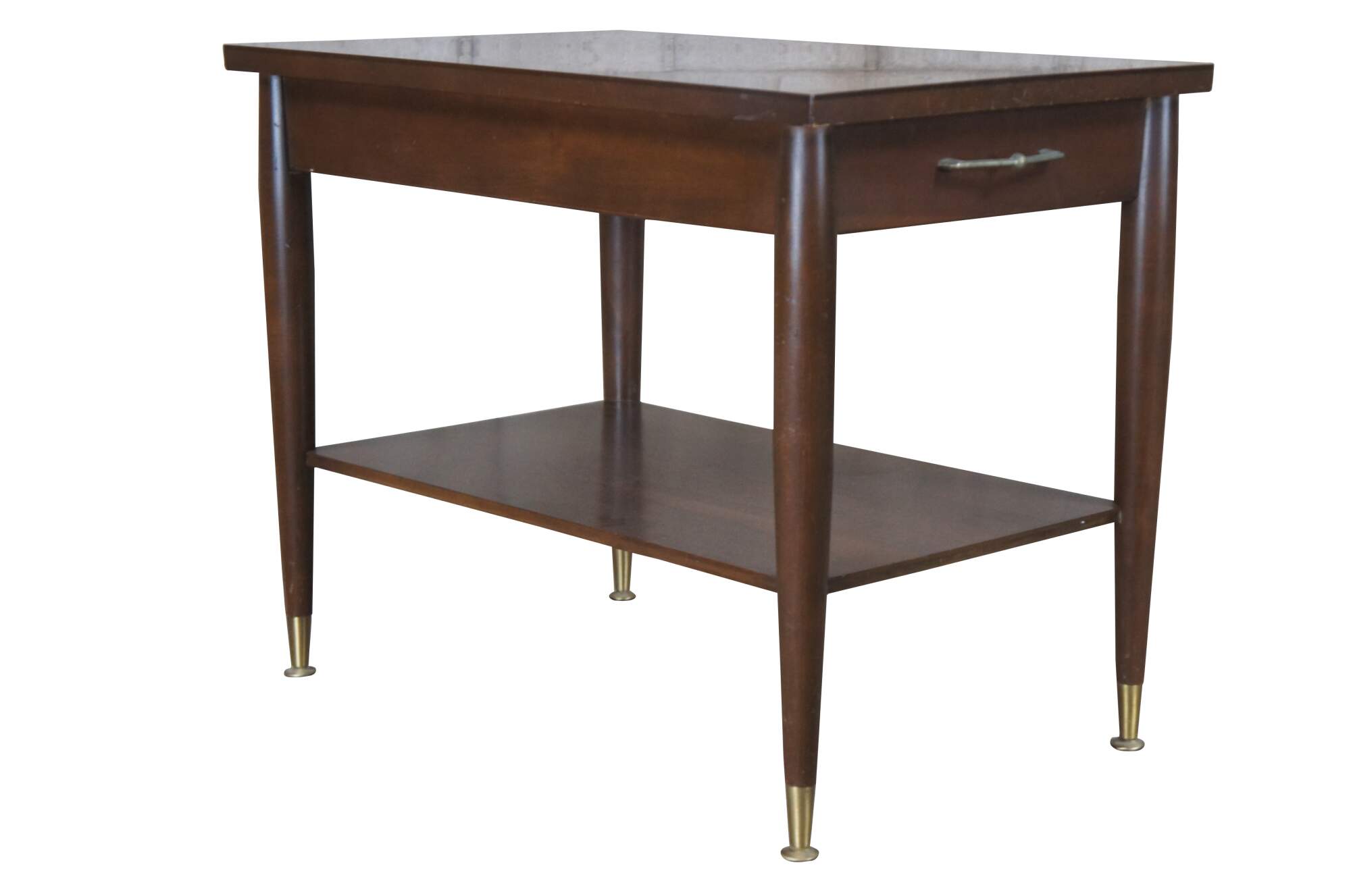 Two mid century modern Mersman end tables. Made of oak featuring rectangular form with two tier design, one drawer, tapered legs, and brass capped feet.