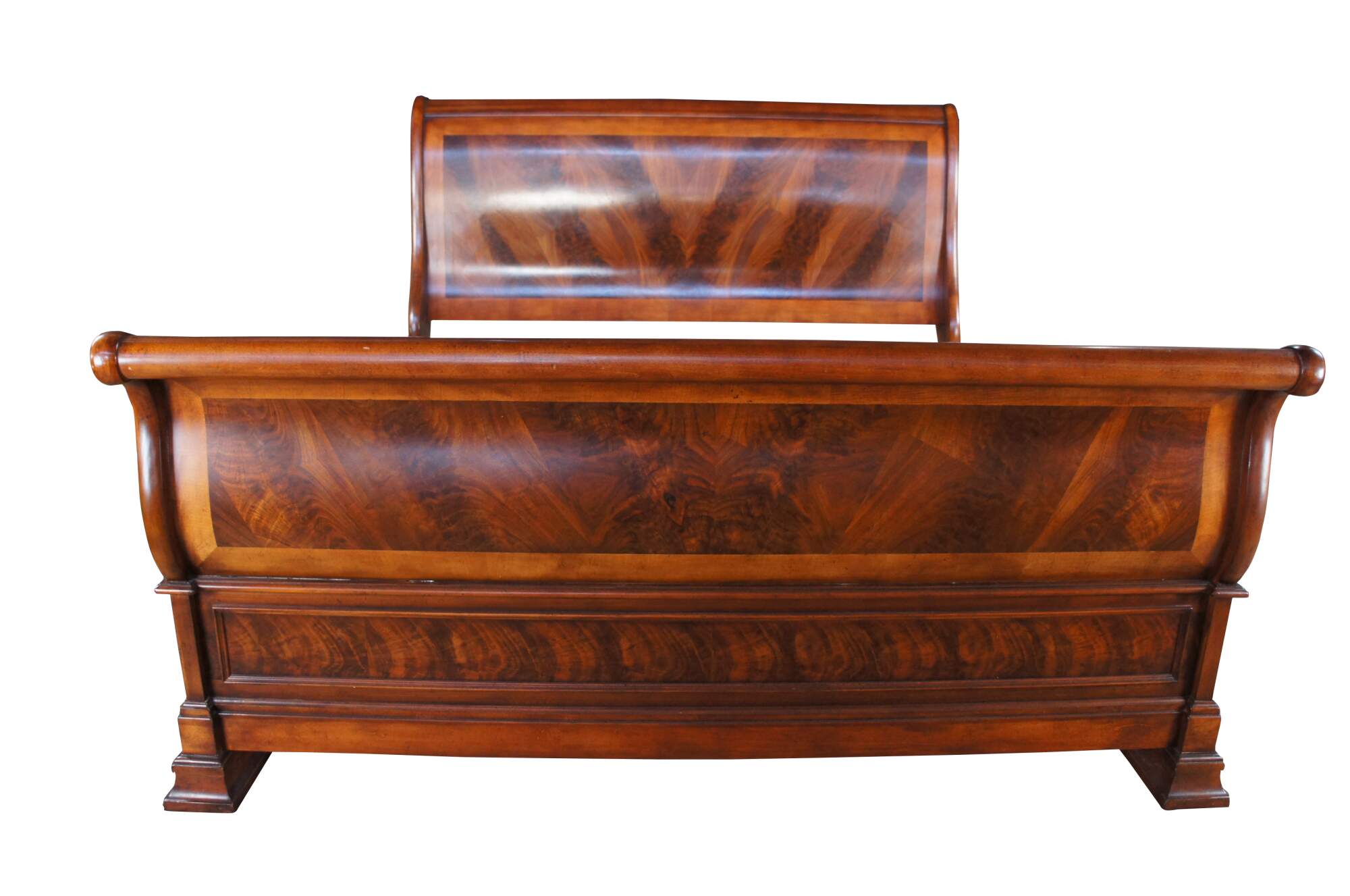 A large and impressive vintage king size sleigh bed. Made of flame mahogany featuring traditional serpentine form.