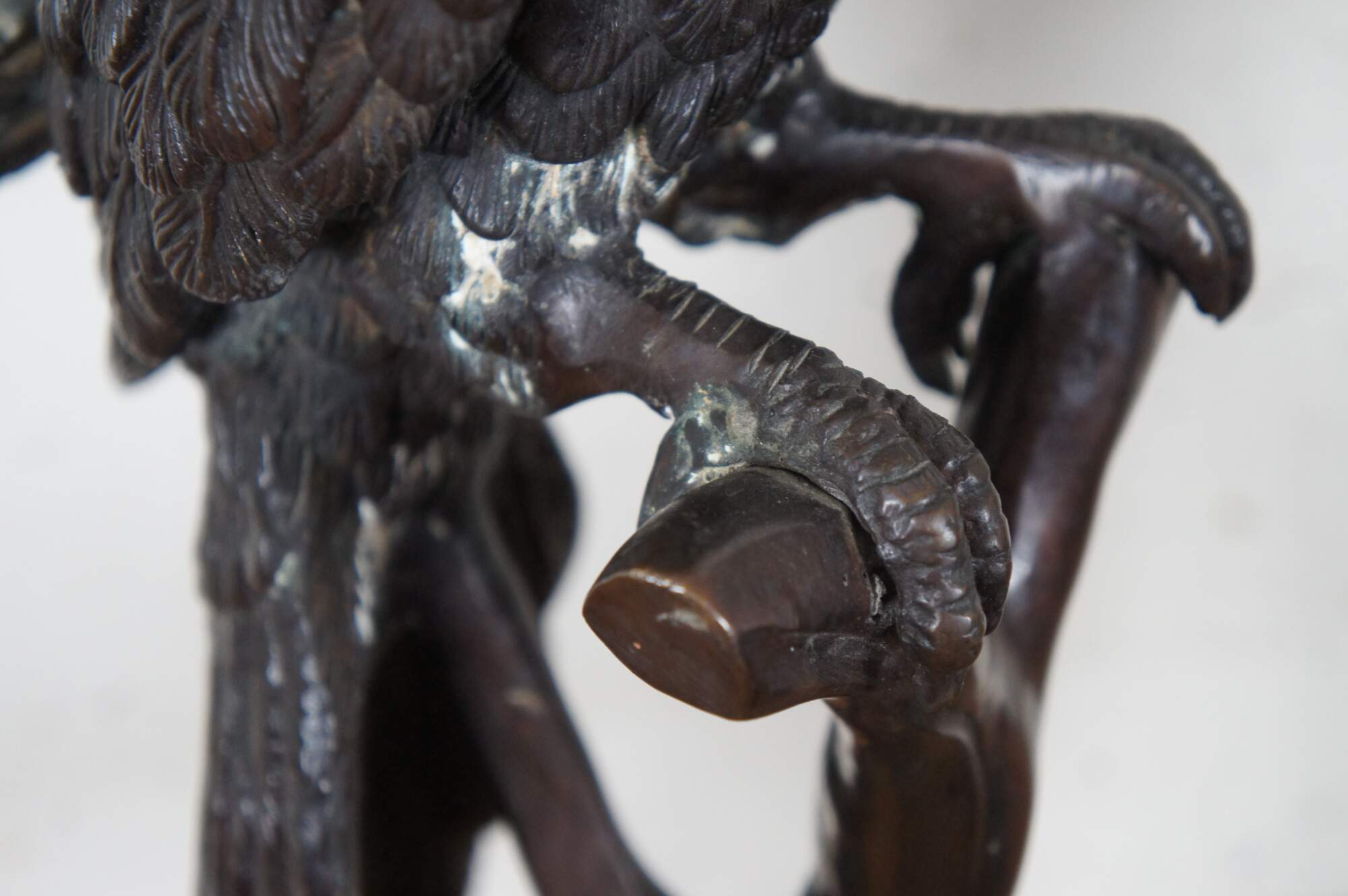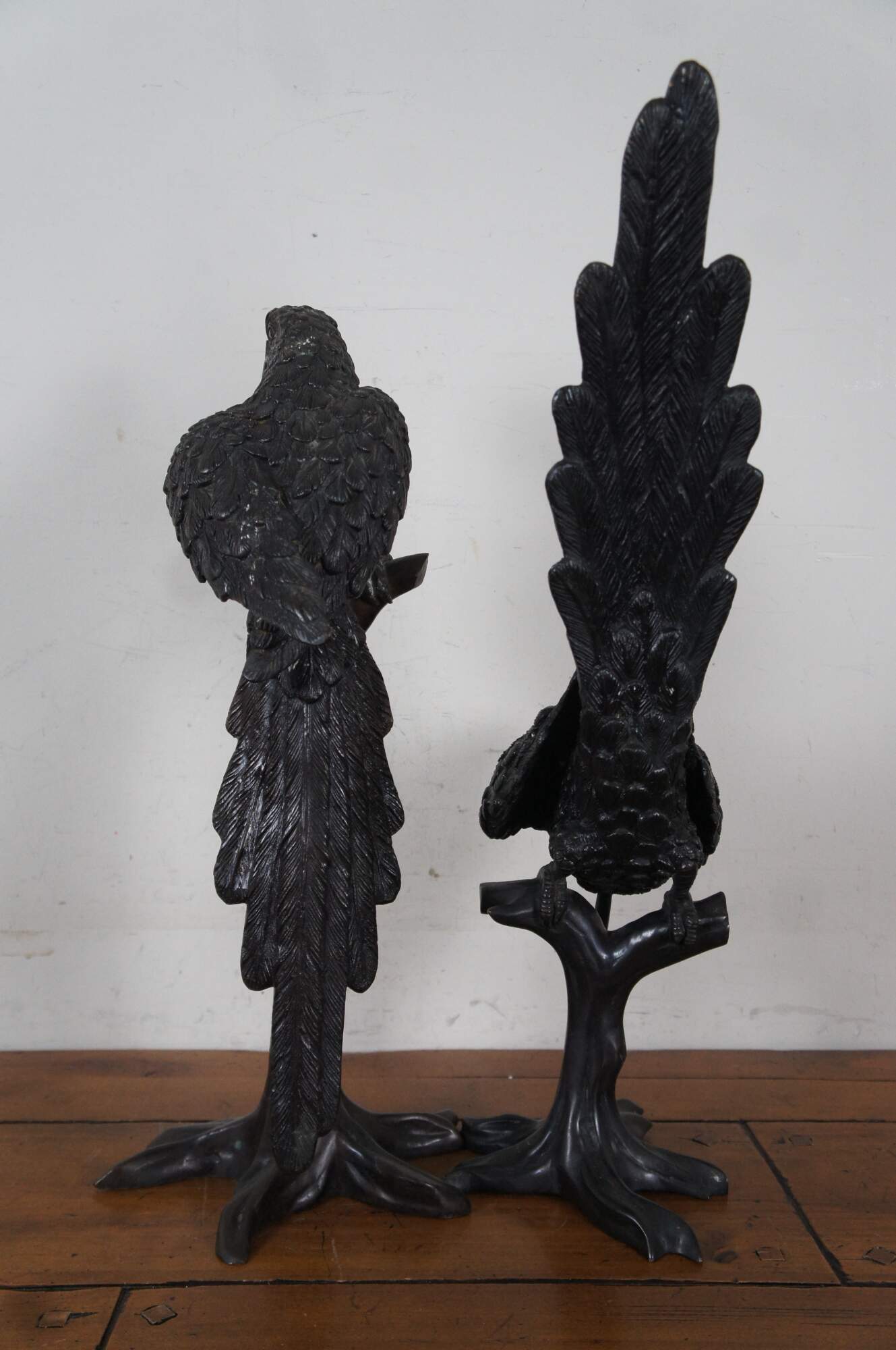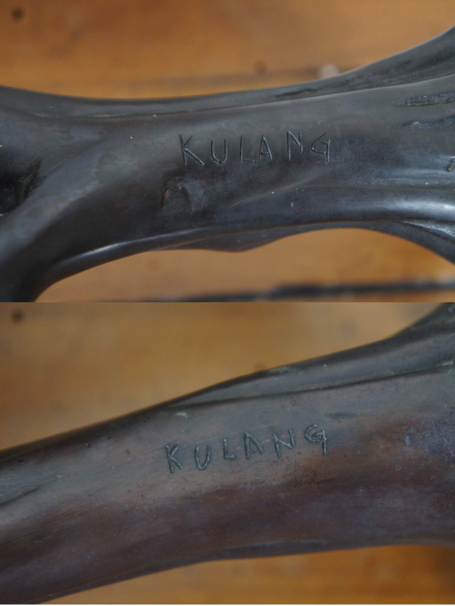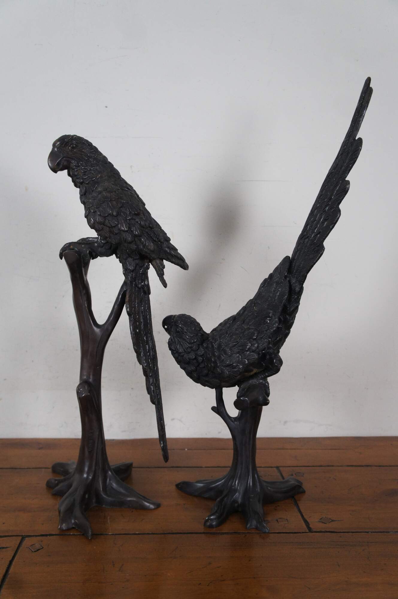 Mid century pair of French bronze Macaw Parrots / birds perched on stands with nice patina, signed Kulang. The parrots are shown with impressive life like design to the feathers, beaks and eyes, each with a unique expression and pose.