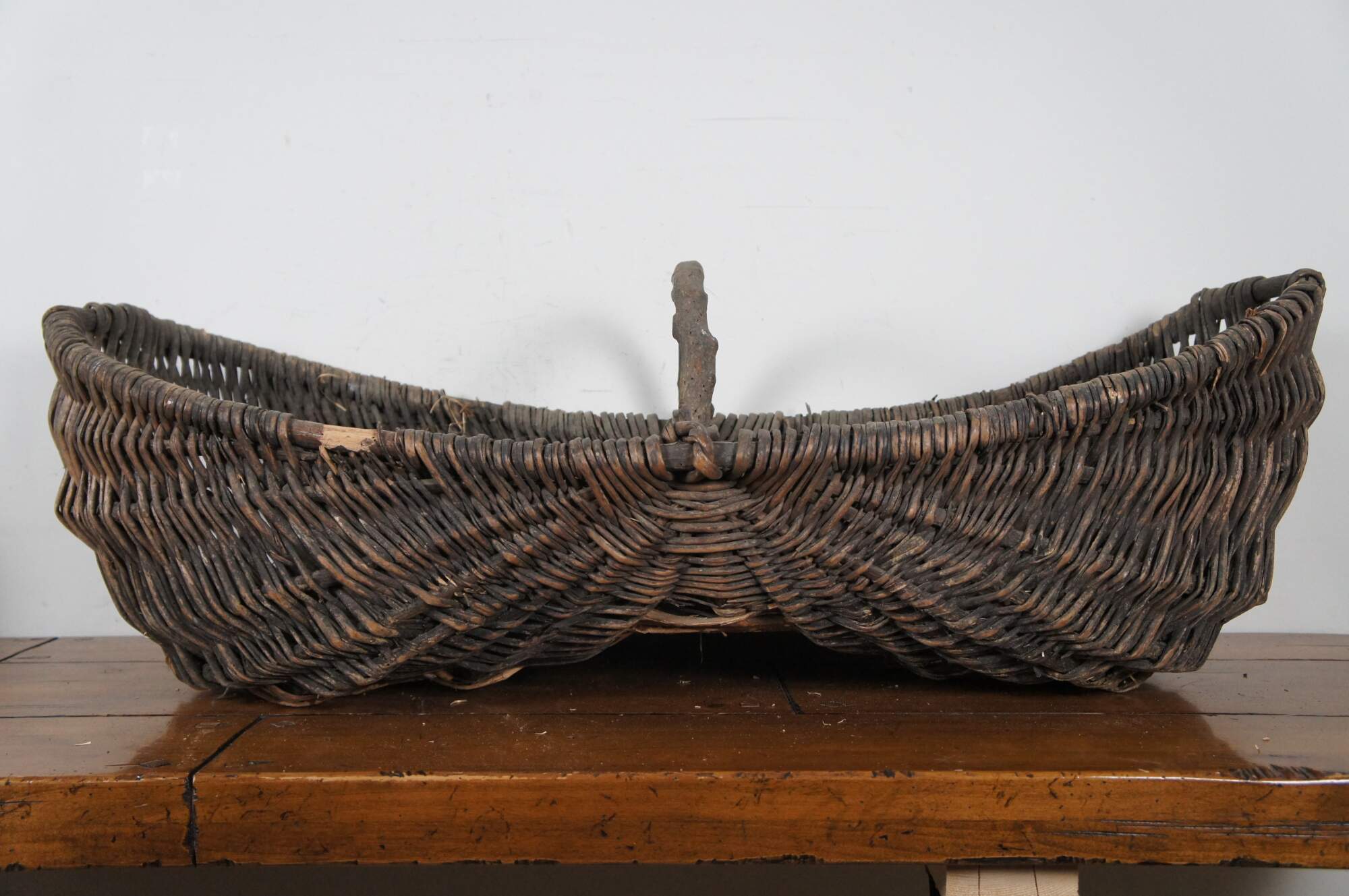 Large and impressive antique grape / wine harvest buttocks basket. Created in the Burgundy region of France circa 19th century, the unique basket made of handwoven wicker is oval in form and features a wooden frame with handle across the top.