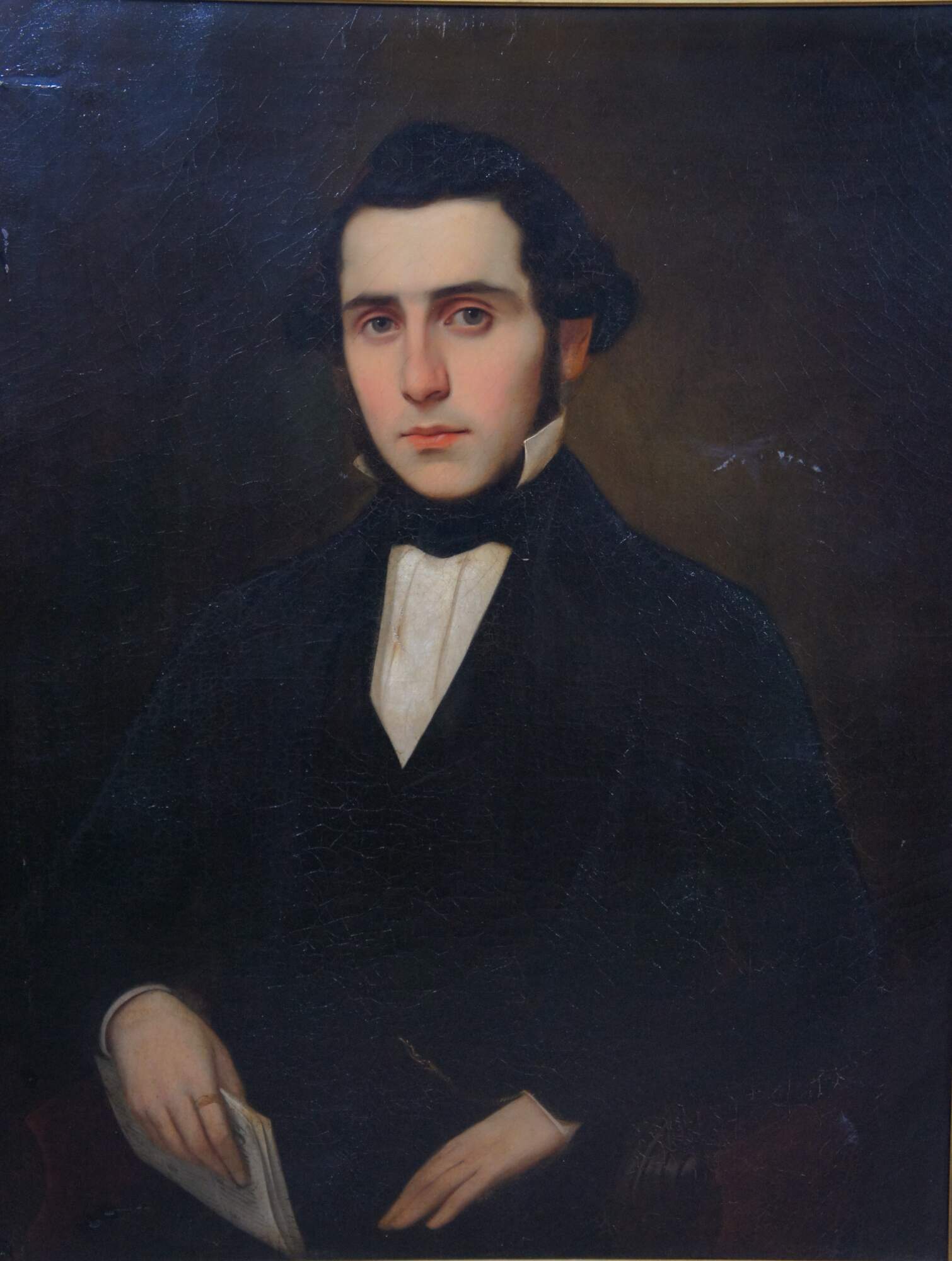 Antique pair of 19th century American School Folk Art oil painting. Features a man and woman (husband and wife) in formal Victorian attire. The man holds a document, while the woman sits delicately with her hands cupped, displaying her Art Nouveau jewelry, encrusted with turquois, rubies and diamonds. Framed in gold.
