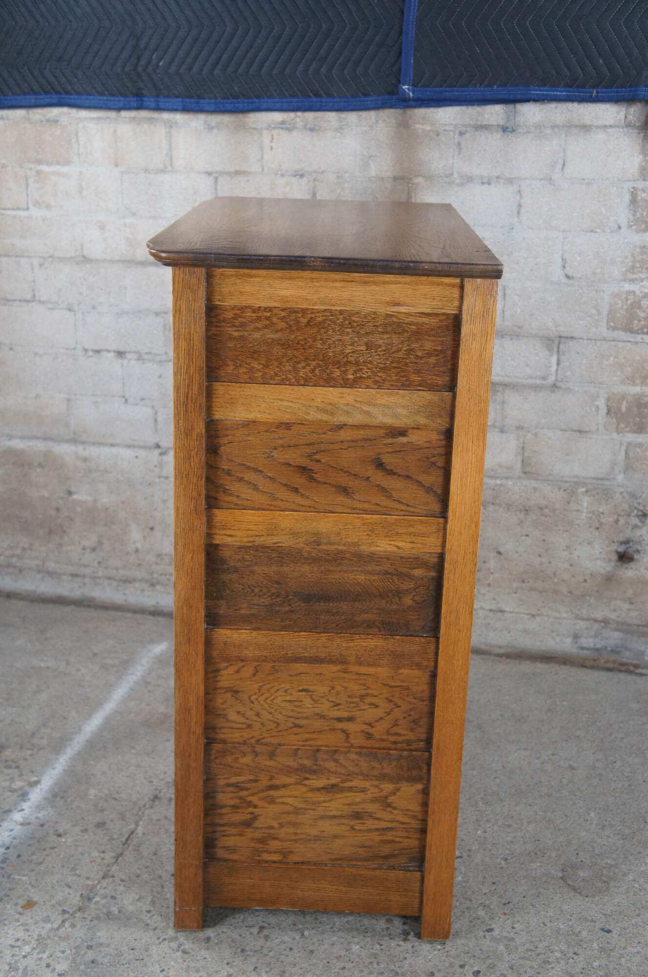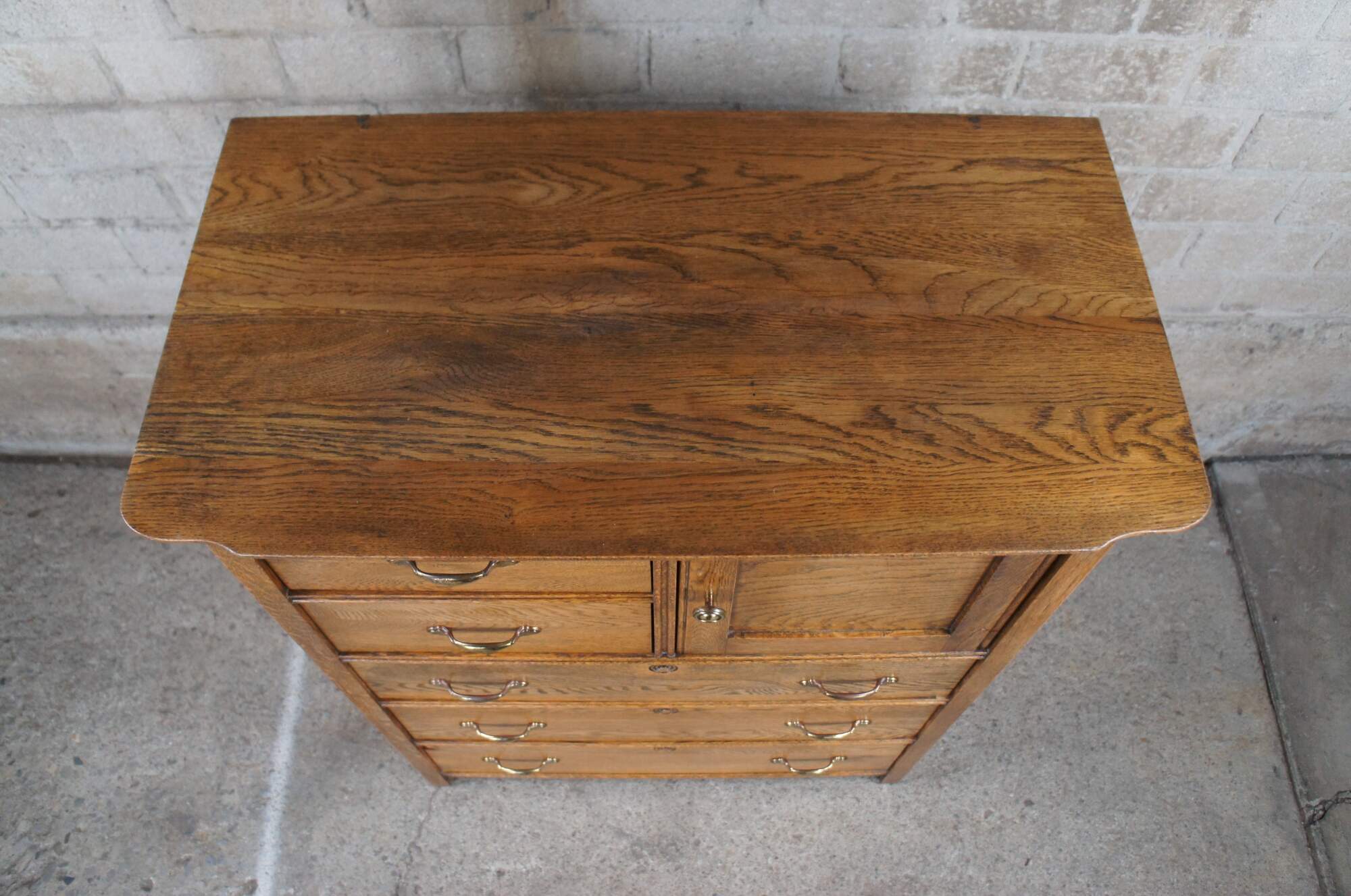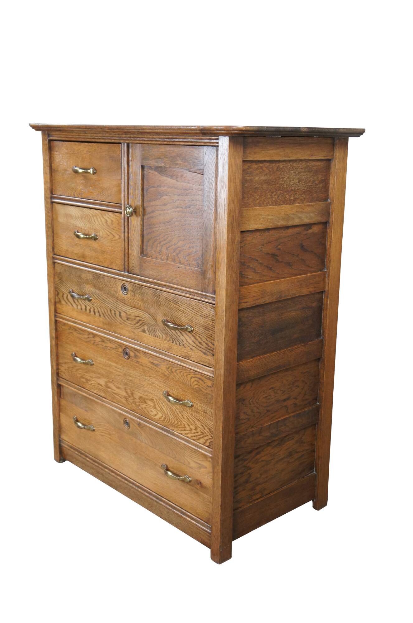 American Victorian Tallboy dresser, circa 1900s. Made from oak with five drawes and side cubby. Features paneled siding and brass hardware.