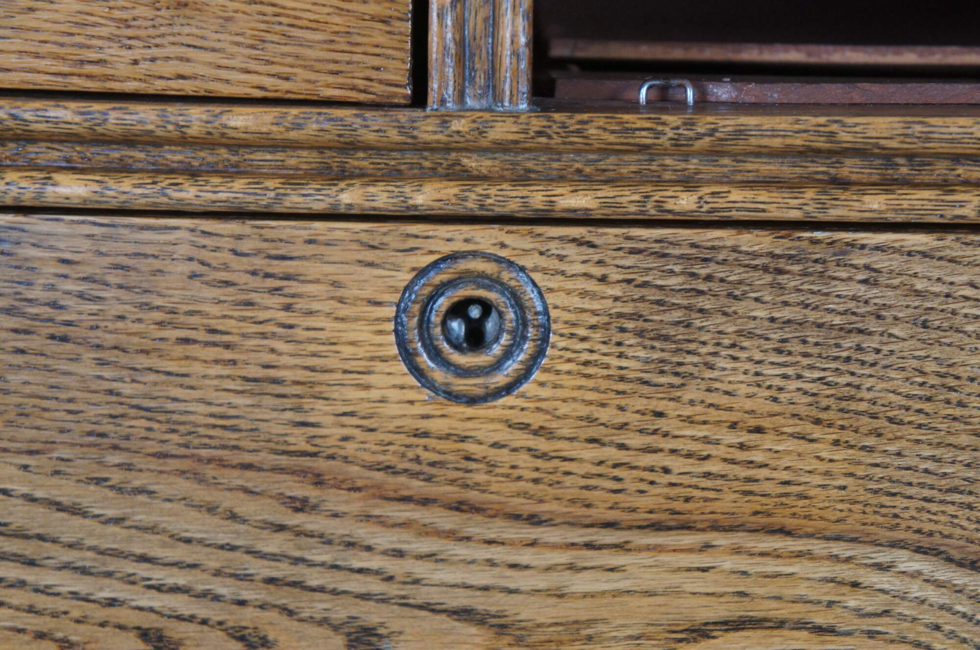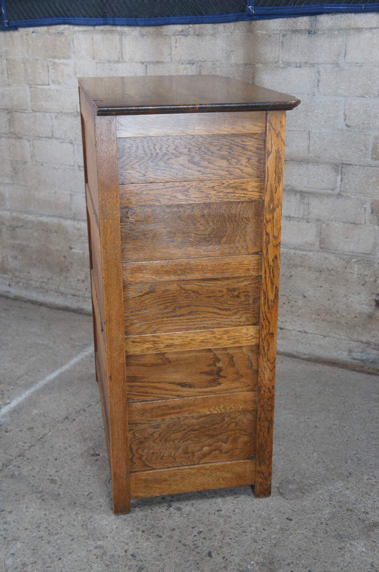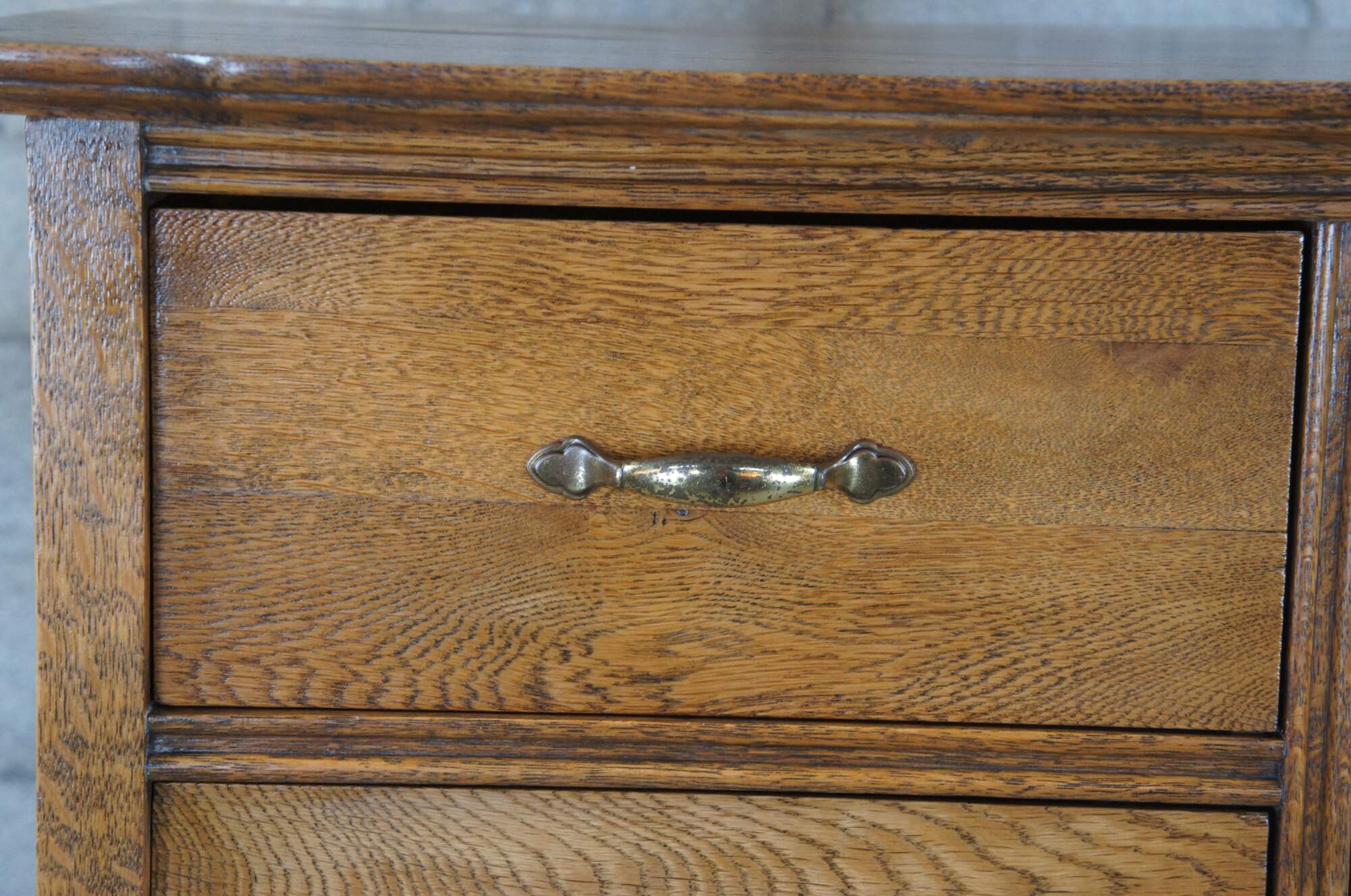 American Victorian Tallboy dresser, circa 1900s. Made from oak with five drawes and side cubby. Features paneled siding and brass hardware.
