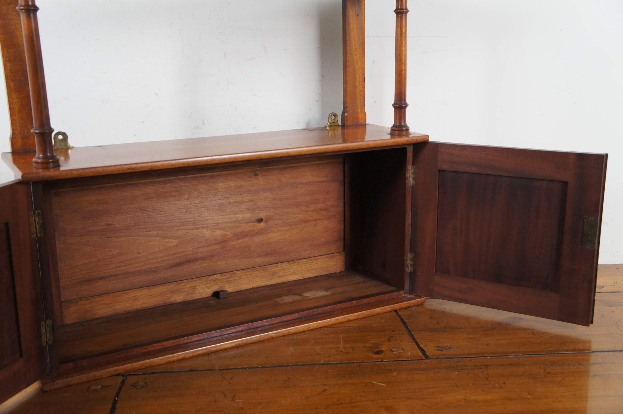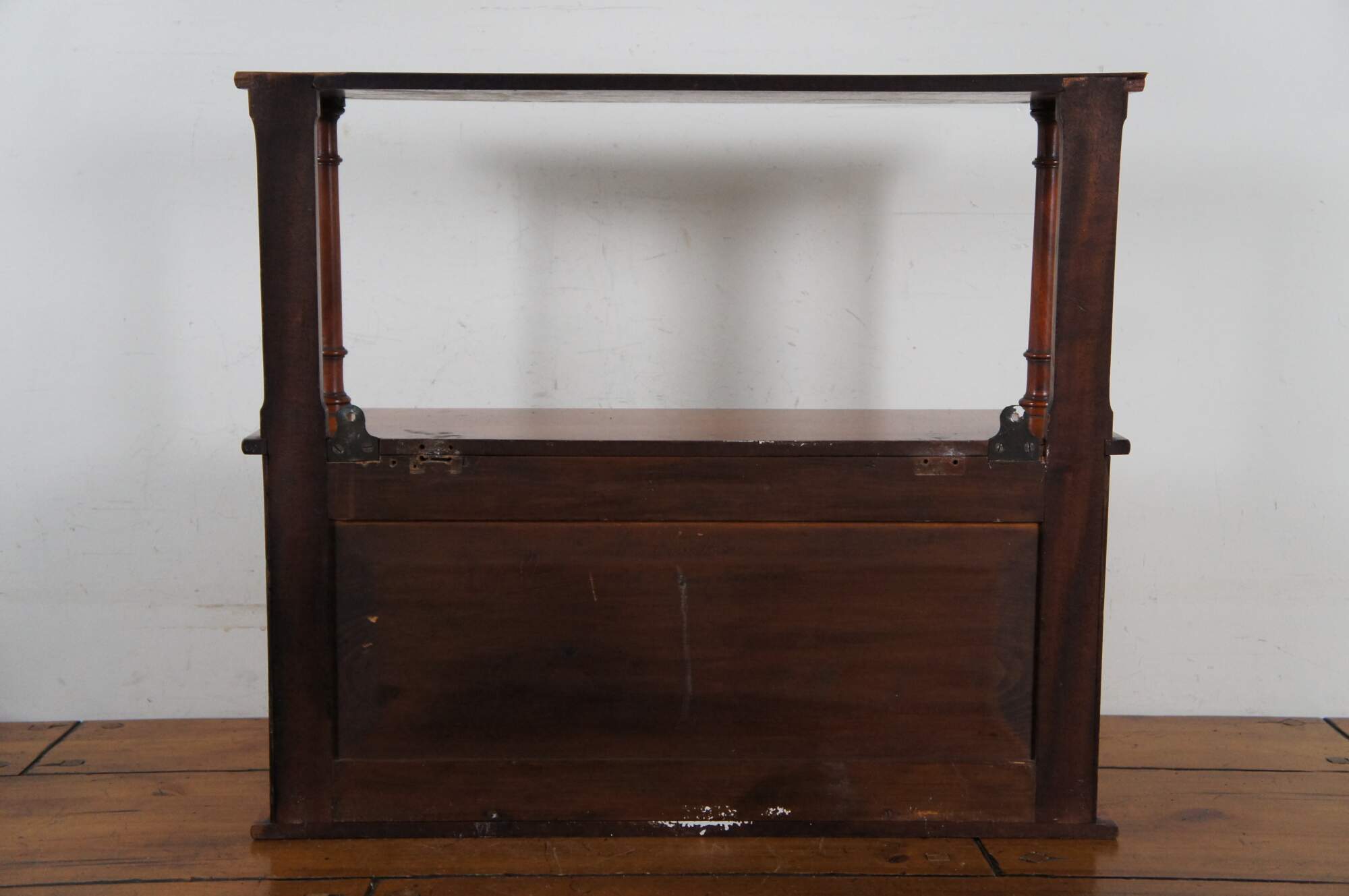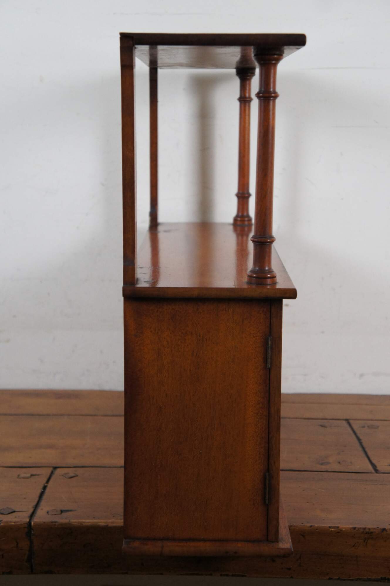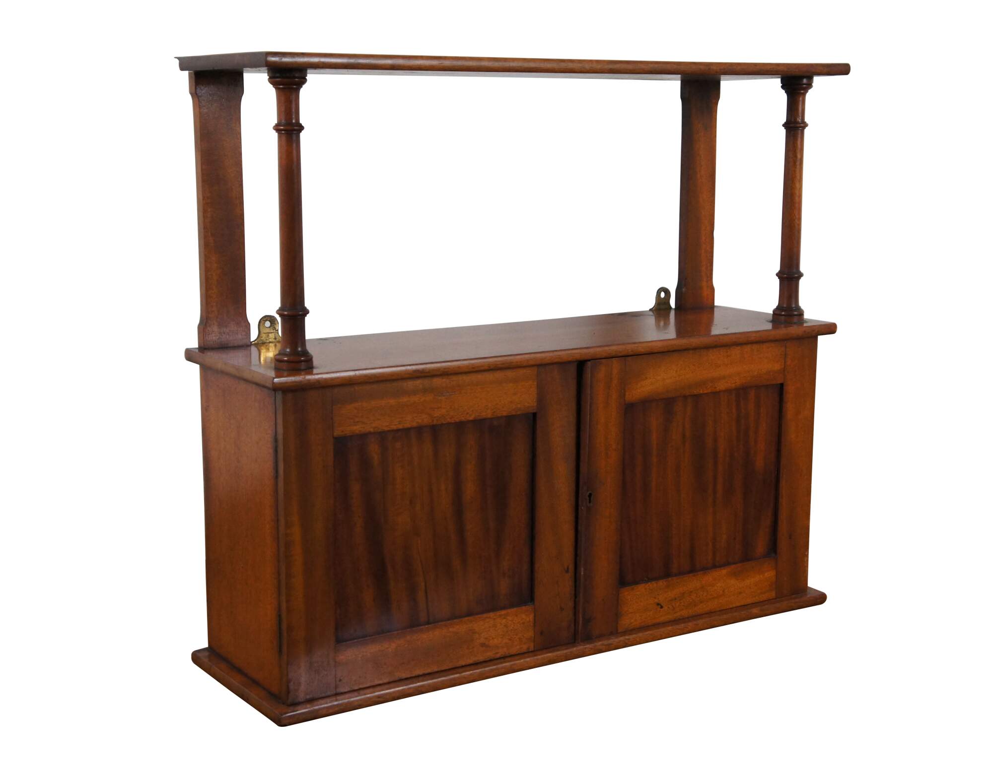 Antique mahogany wall hanging whatnot cabinet featuring a two tier design with paneled doors below a shelf framed with turned columns. Hand operated latch on left hand door.