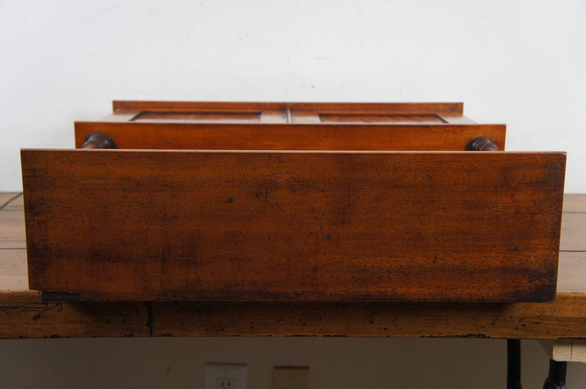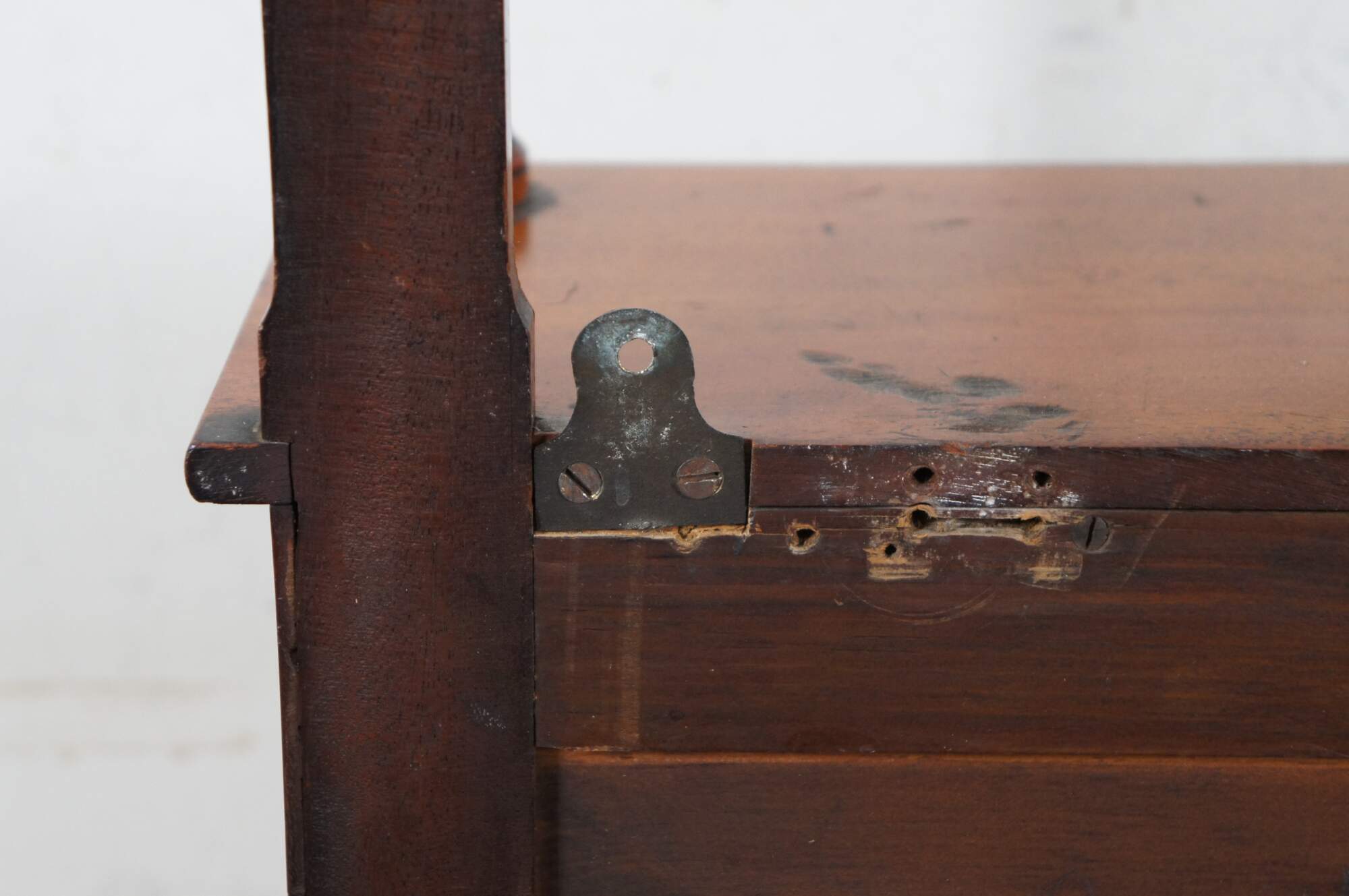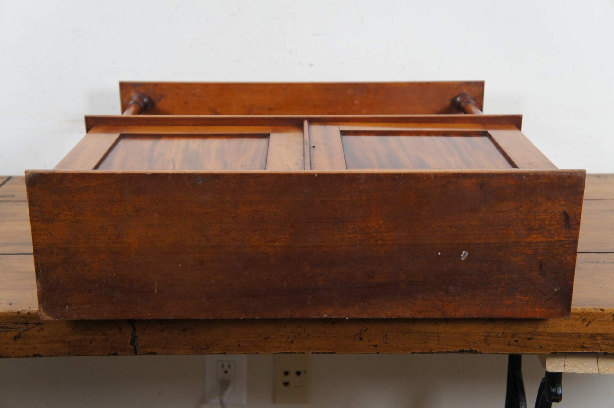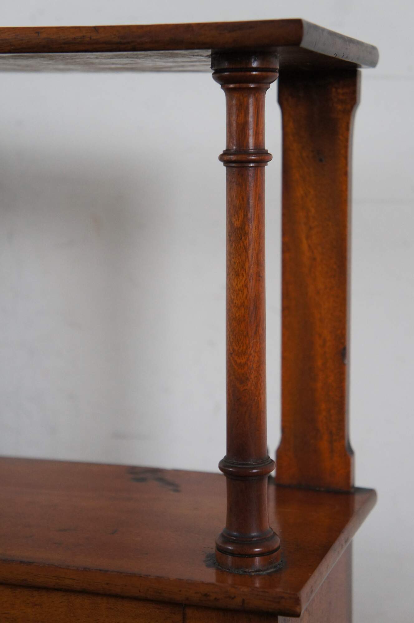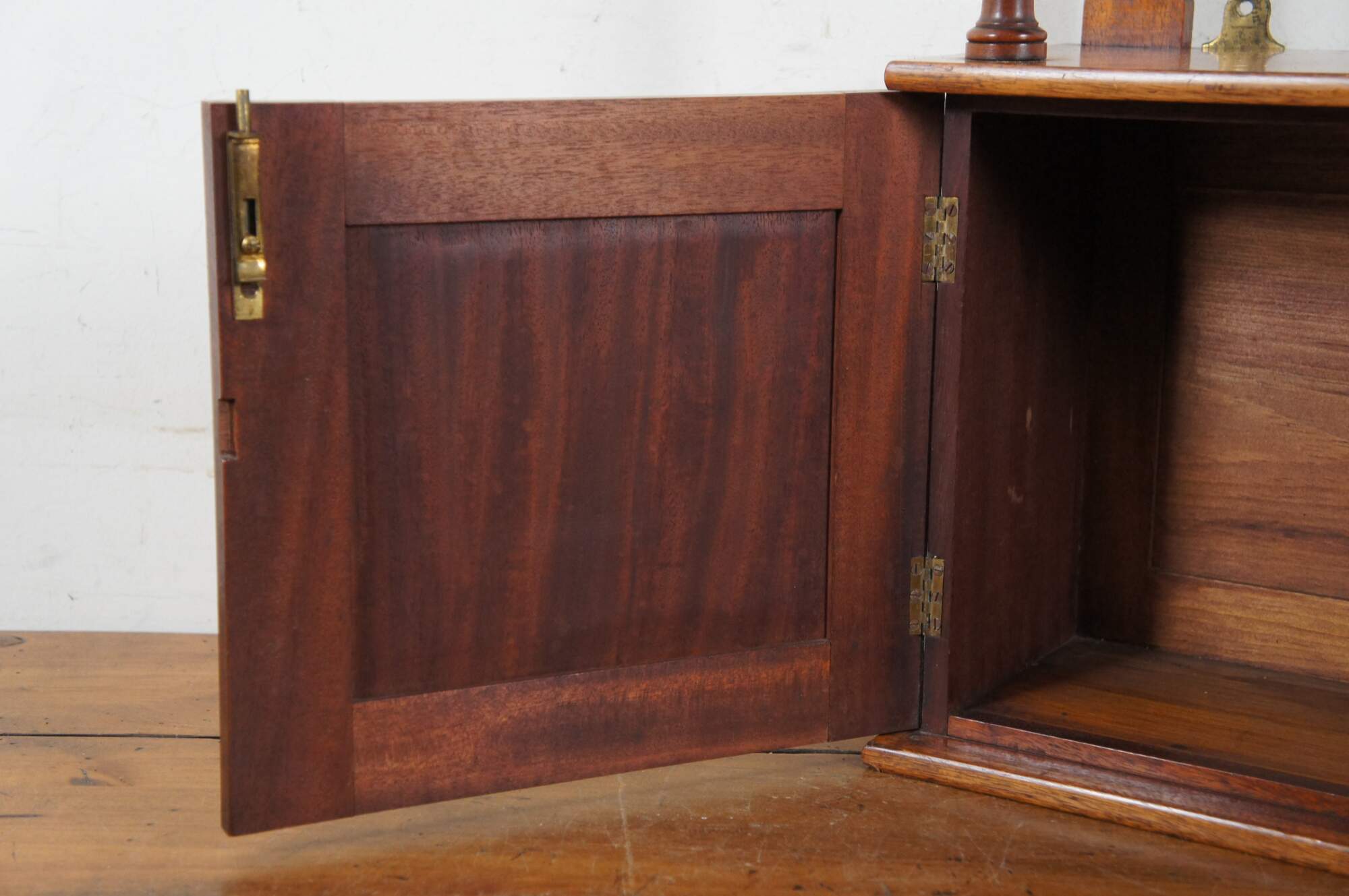 Antique mahogany wall hanging whatnot cabinet featuring a two tier design with paneled doors below a shelf framed with turned columns. Hand operated latch on left hand door.