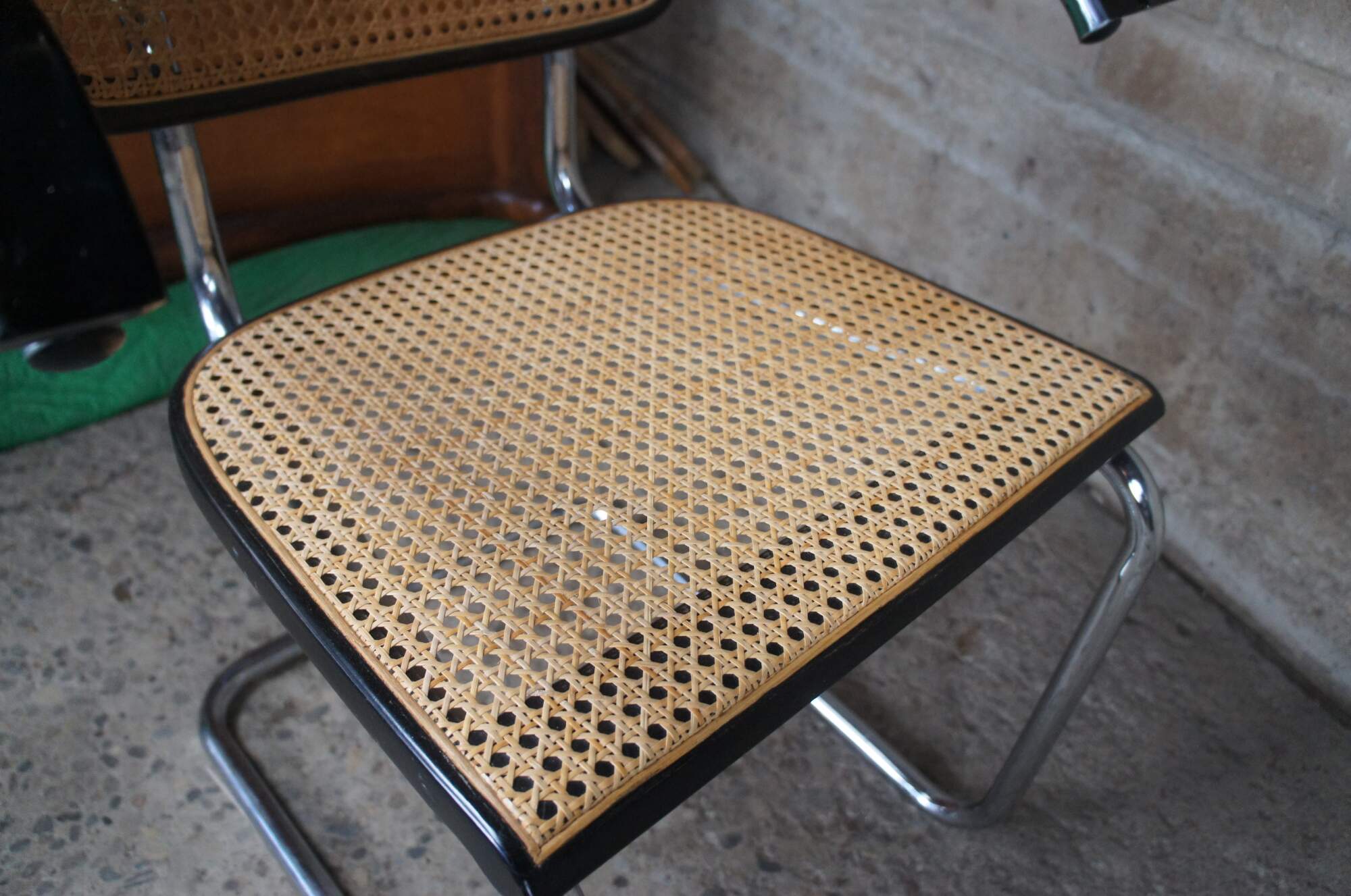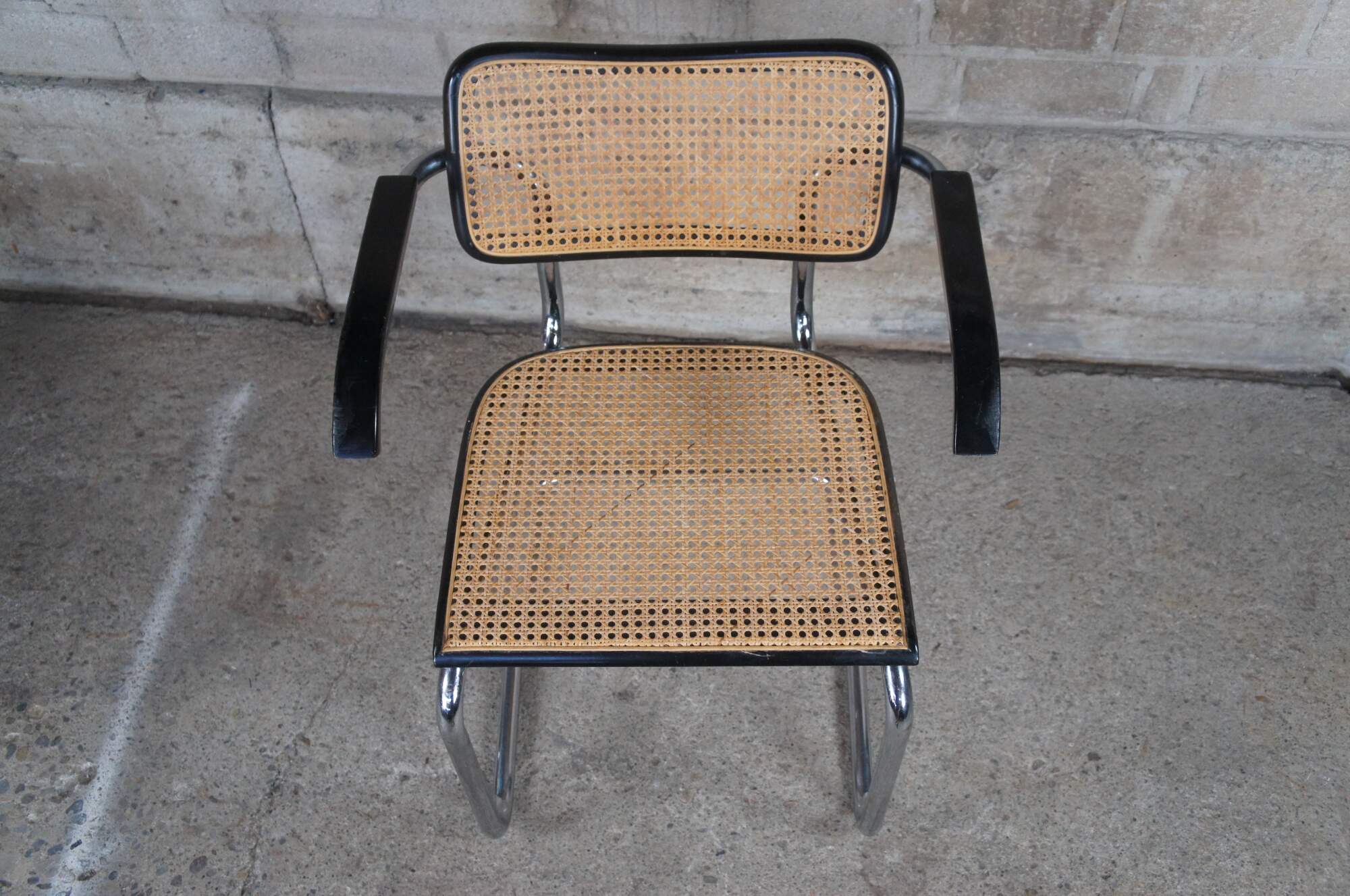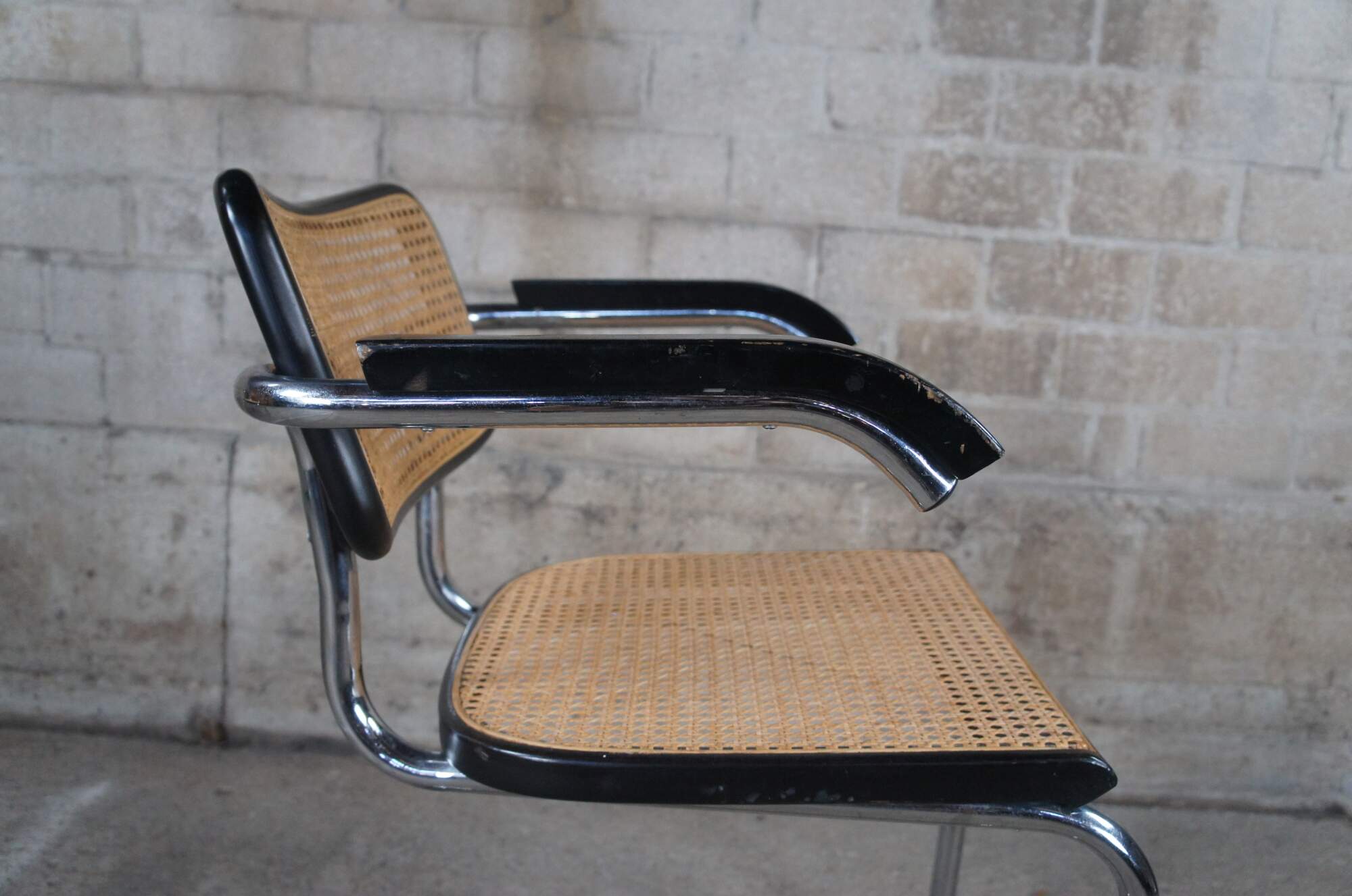 Four vintage Marcel Breuer Cesca Gavina Knoll dining armchairs. Made of tubular steel / chrome featuring caned seat and back with ebonized frame and arms. Linearity balanced by subtle curves; wicker caning punctuated by a wooden frame; and a cantilevered form that seems to float in thin air. Made in Italy, circa 1970s.