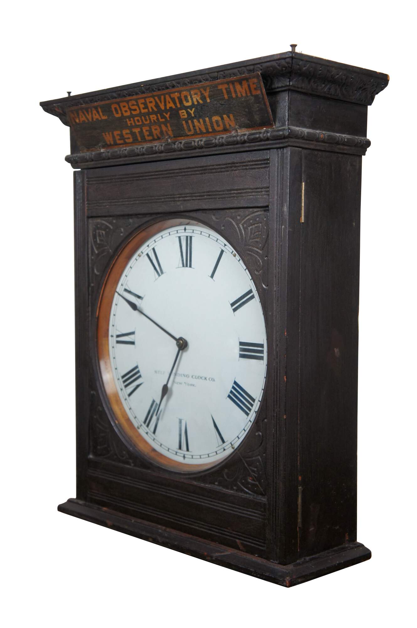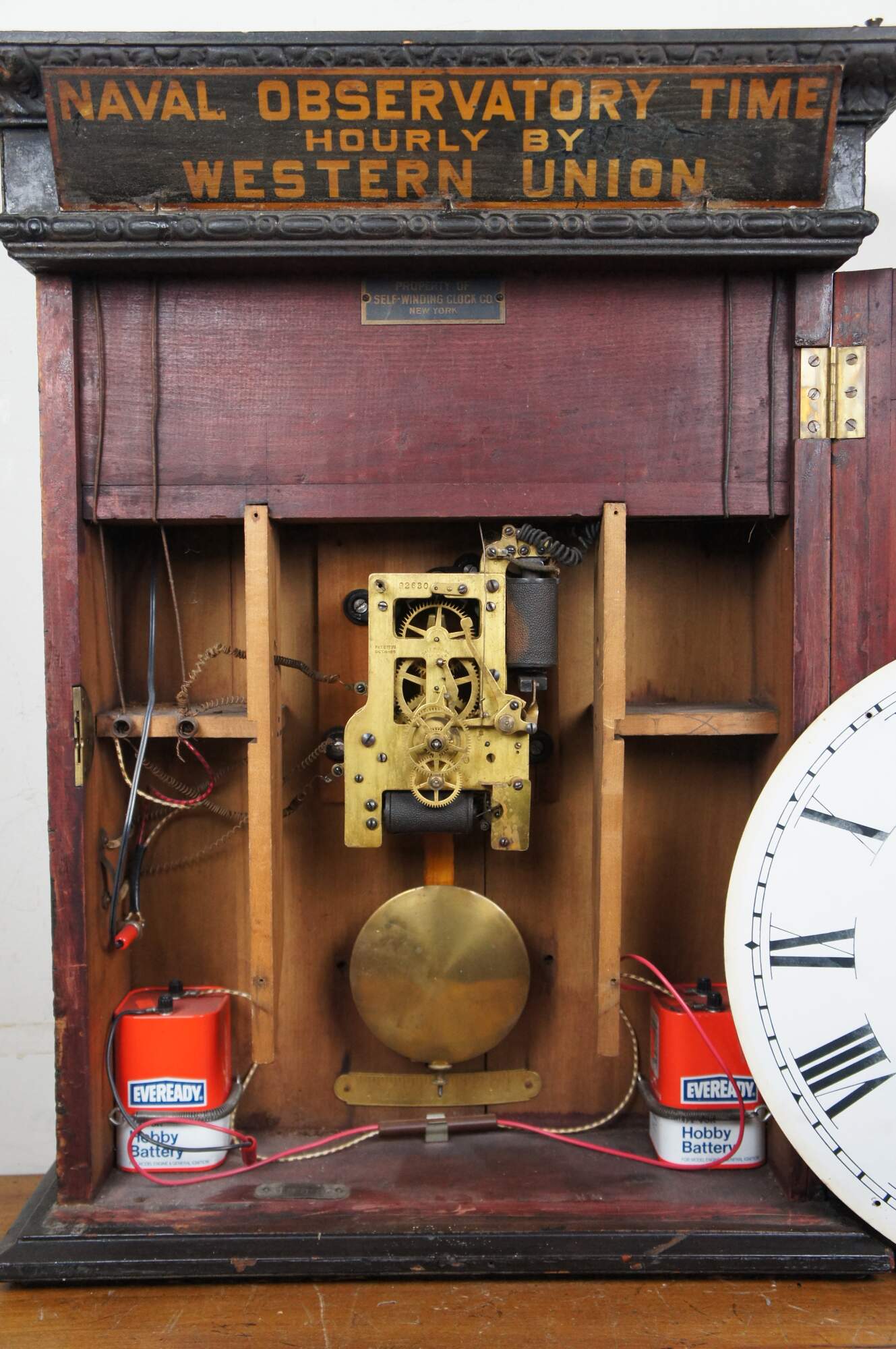 Antique Western Union, Naval Observatory Time, self winding clock. Features a tall wooden case with carved corners and pediment mounted with tin sign reading "Naval Observatory Time Hourly By Western Union. White metal face with black Roman numerals and hands. Interior of case labeled "Property of Self-Winging Clock Co New York" and serial number on metal tag as well as on works. F Style / Vibrator movement, Serial Number 92630 (likely manufactured before 1917). Patented Oct. 4, 1898 by the Self Winding Clock Company. Fitted with Archer AC Adapter.