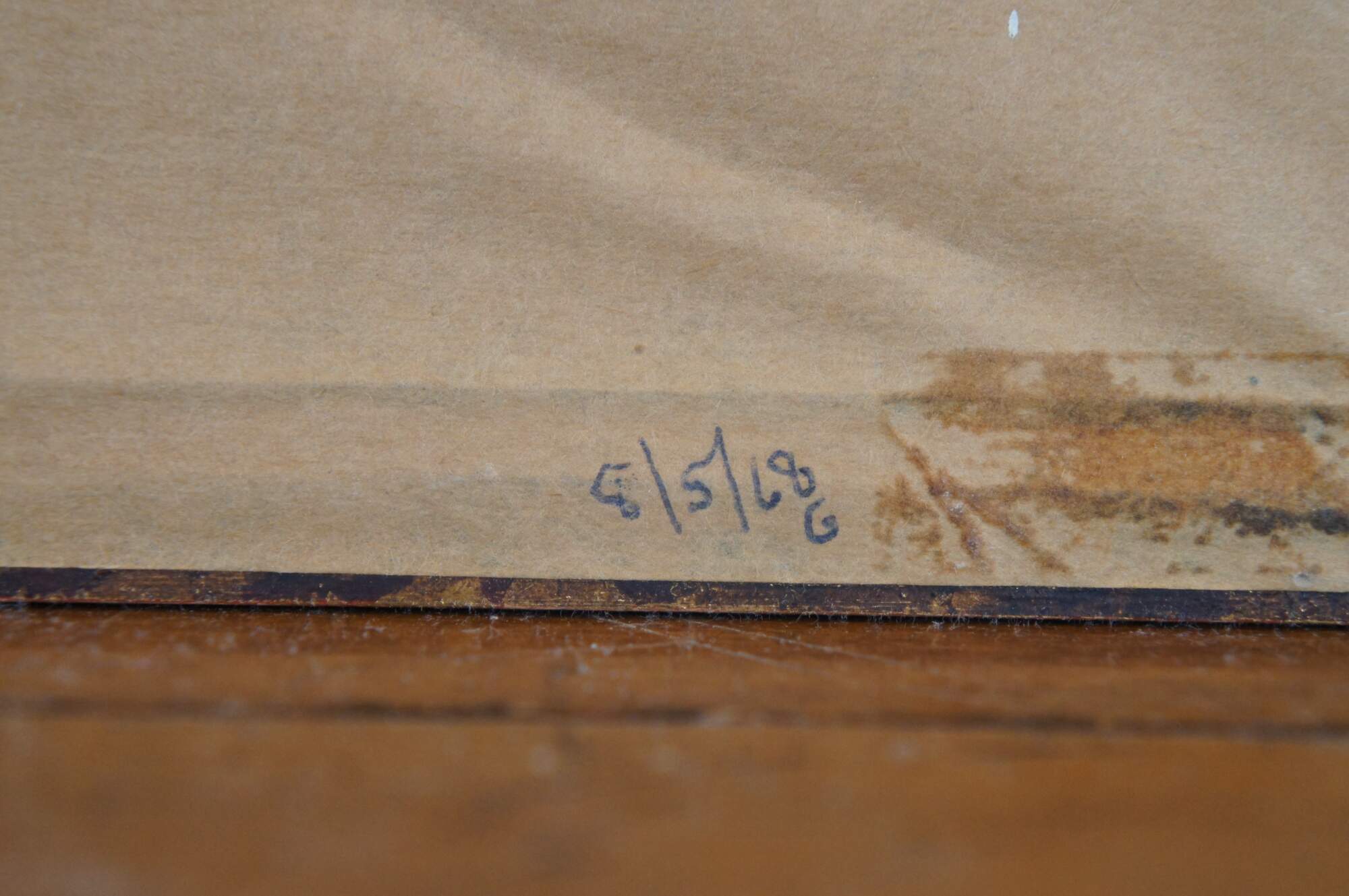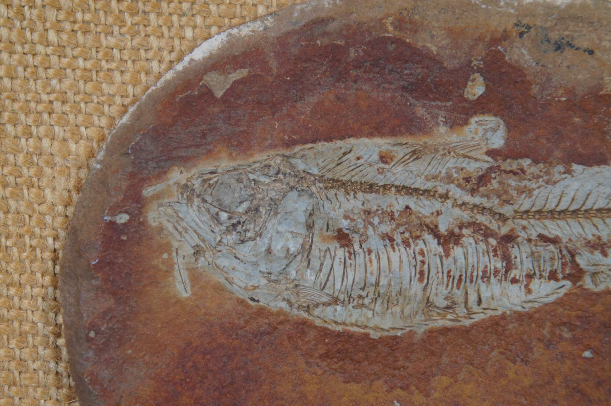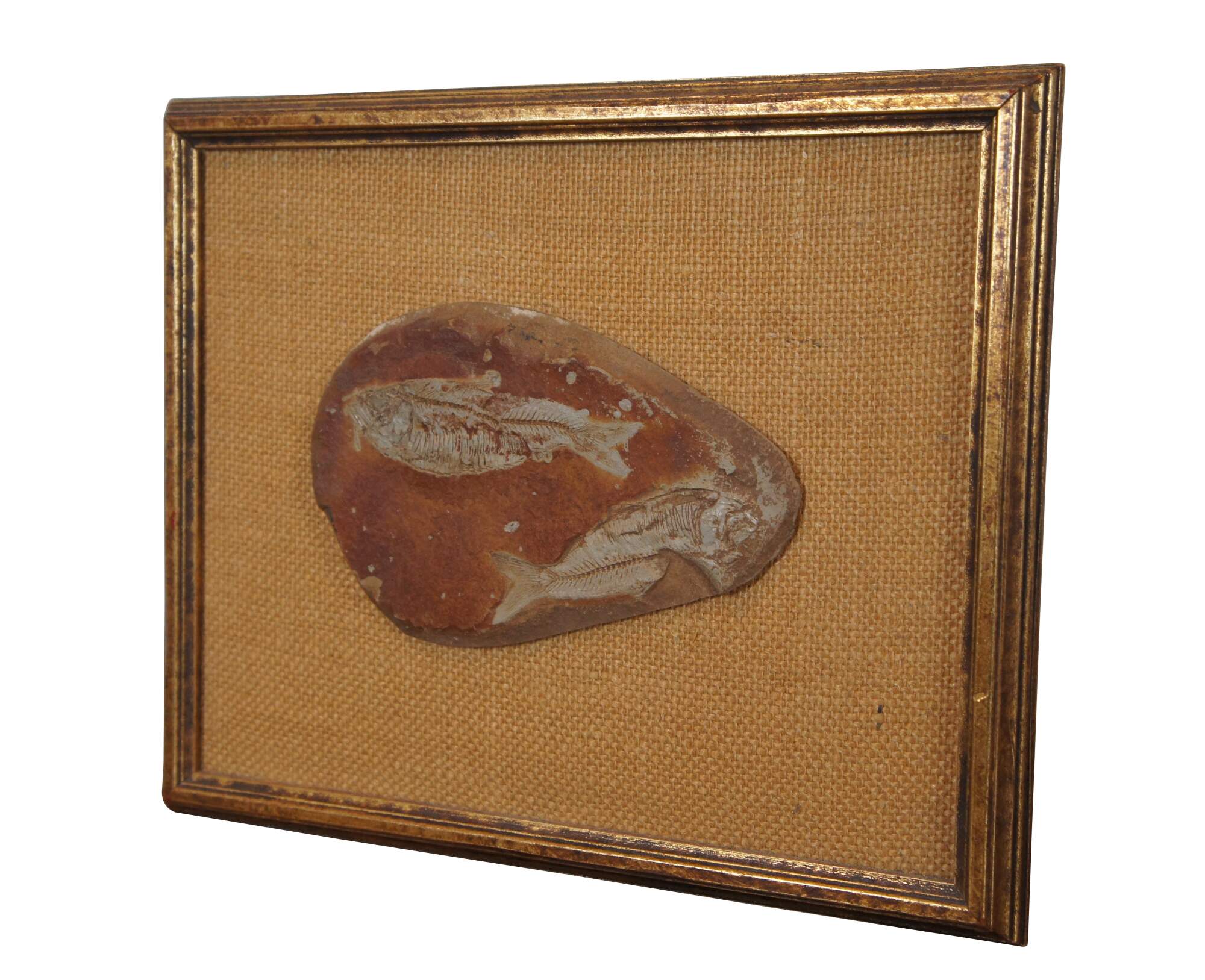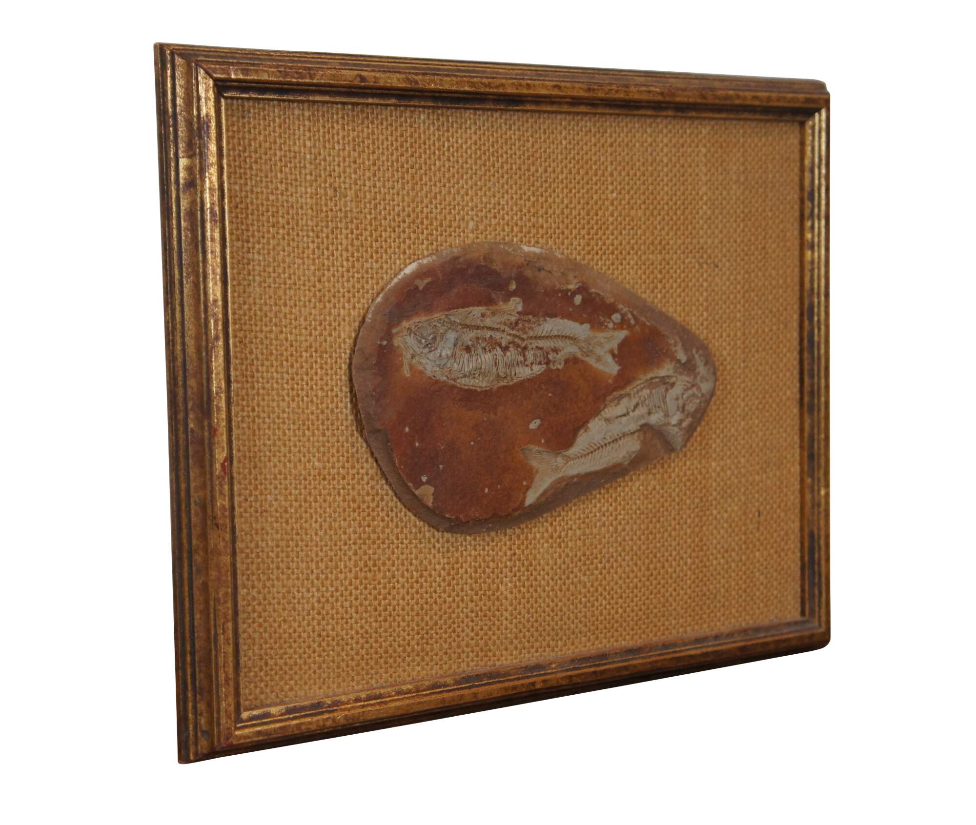 Antique fossilized Diplomystus fishes in slate rock, mounted to burlap, framed in gold circa 1968.