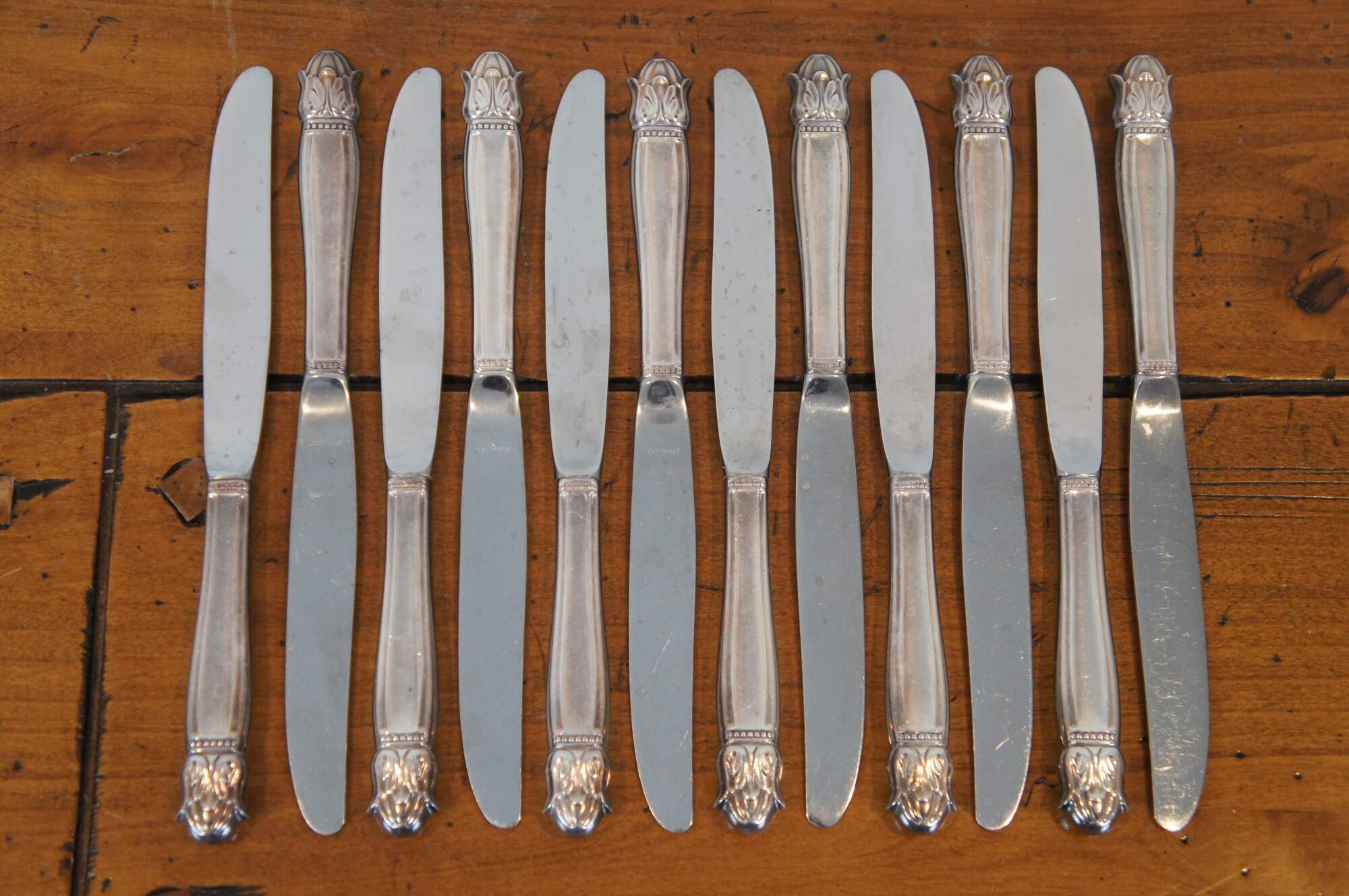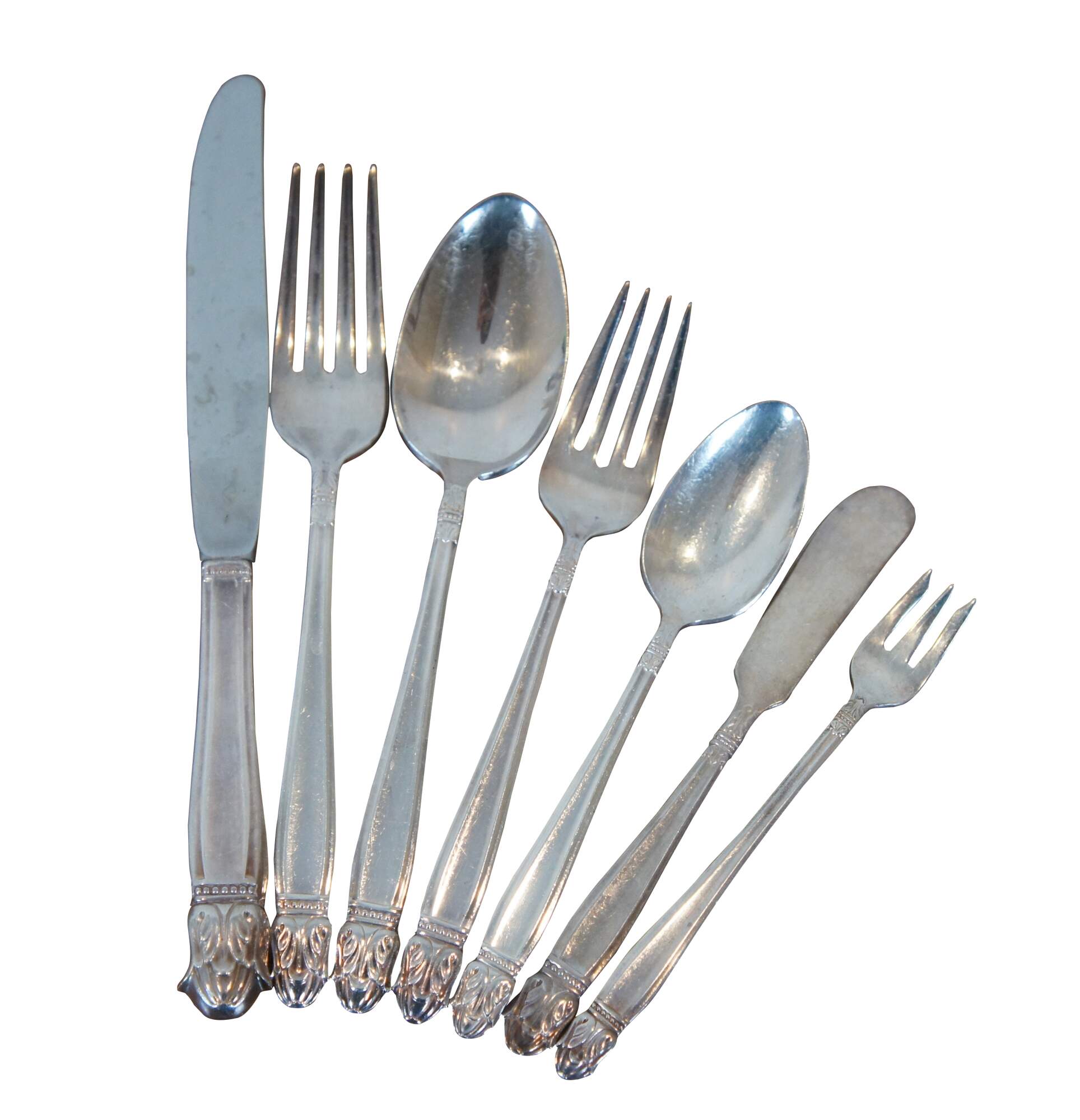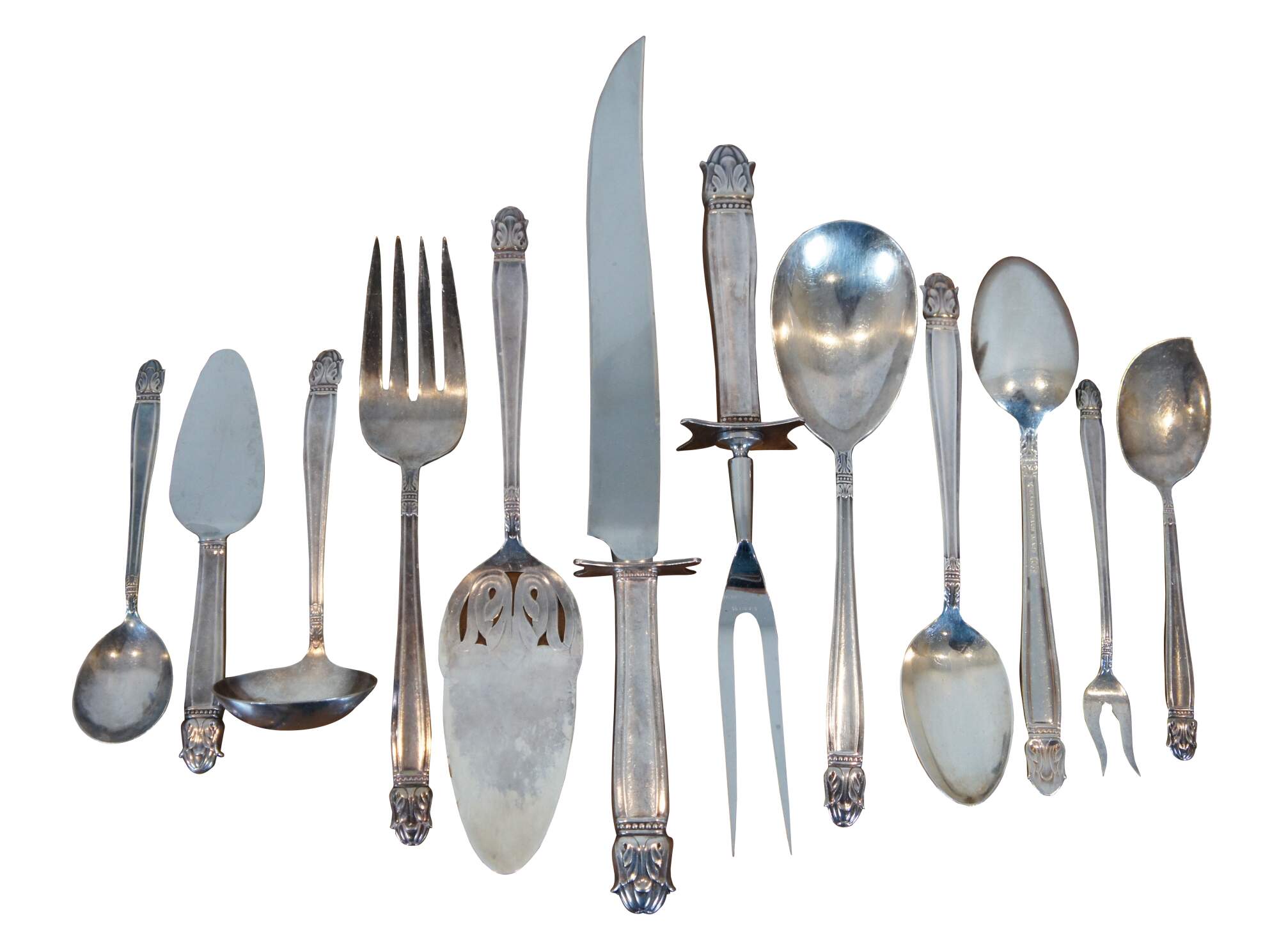 Pattern: Danish Princess, first introduced 1938. This vintage set includes: Carving knife & fork, pie server, casserole spoon, serving fork, 2 serving spoons, gravy ladle, berry spoon, cheese spreader, sugar spoon, shrimp fork, 12 table forks, 12 table spoons, 12 dinner forks, 11 salad forks, 23 teaspoons, 10 spreaders, 12 cocktail forks.