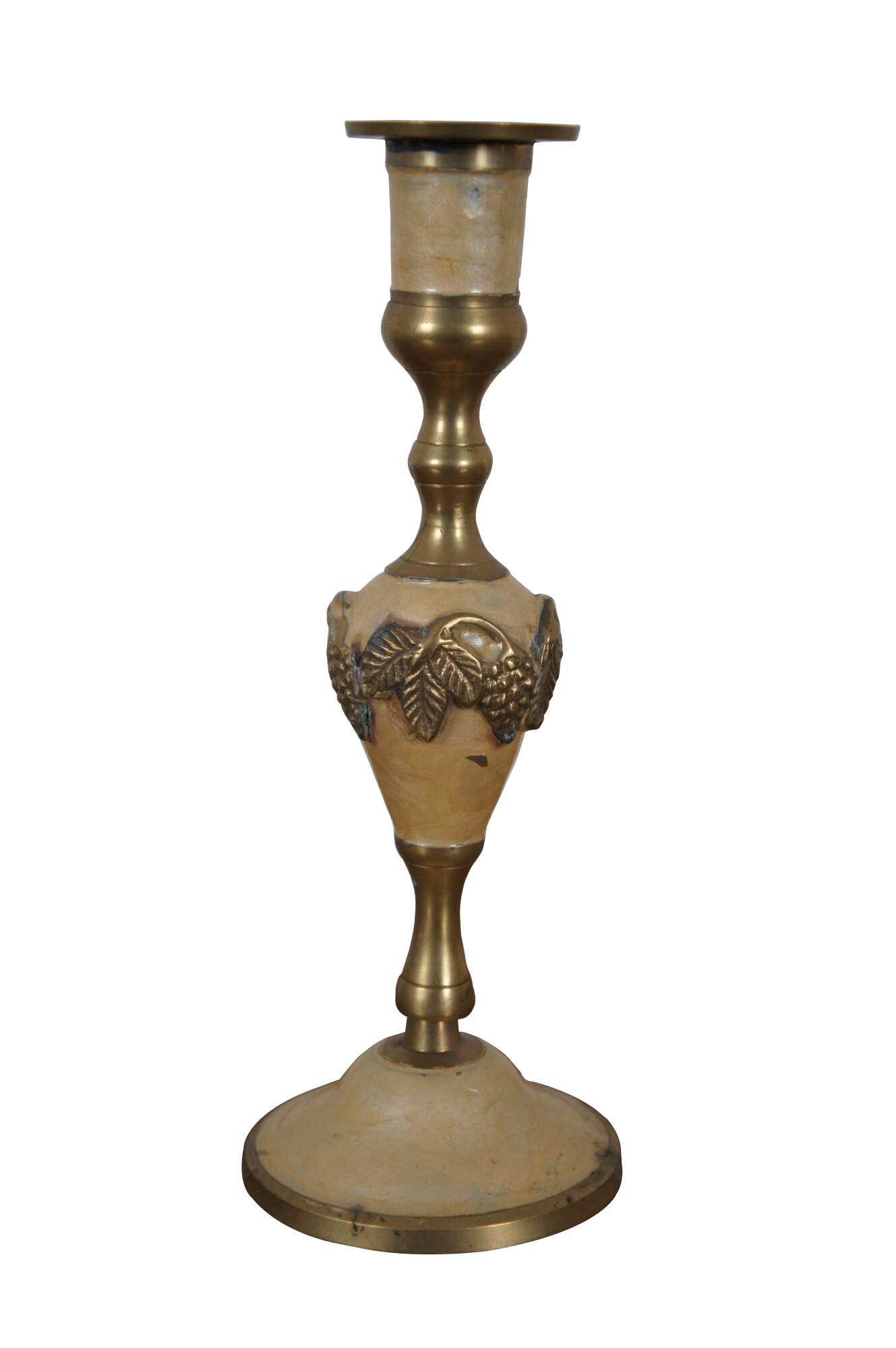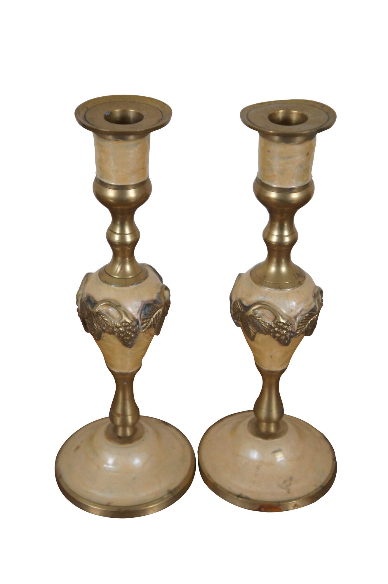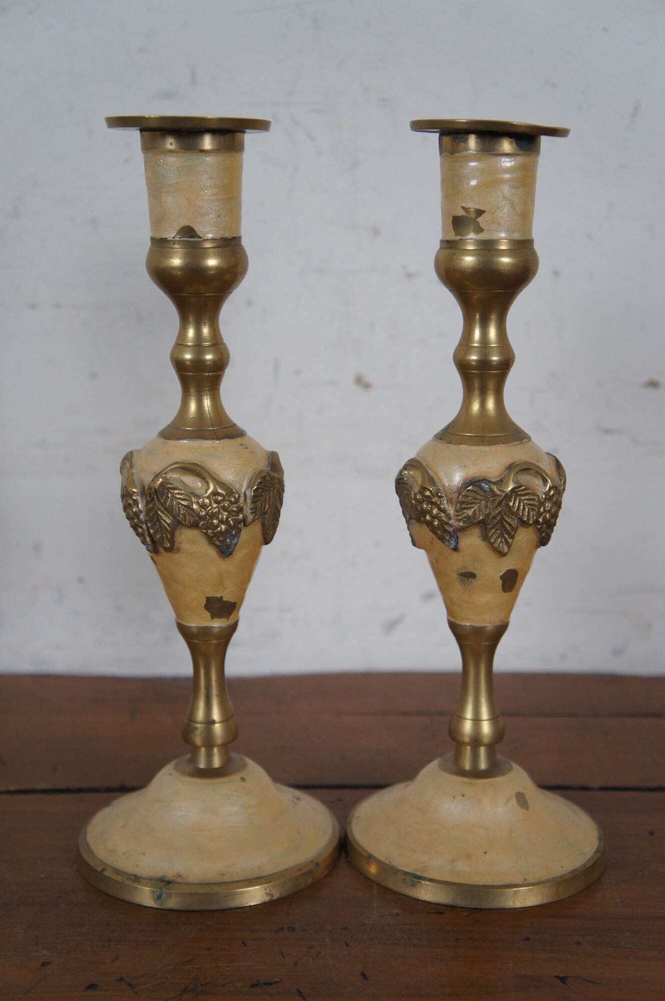 Two vintage enameled brass candlesticks or candle holders featuring a grape and leaves motif.