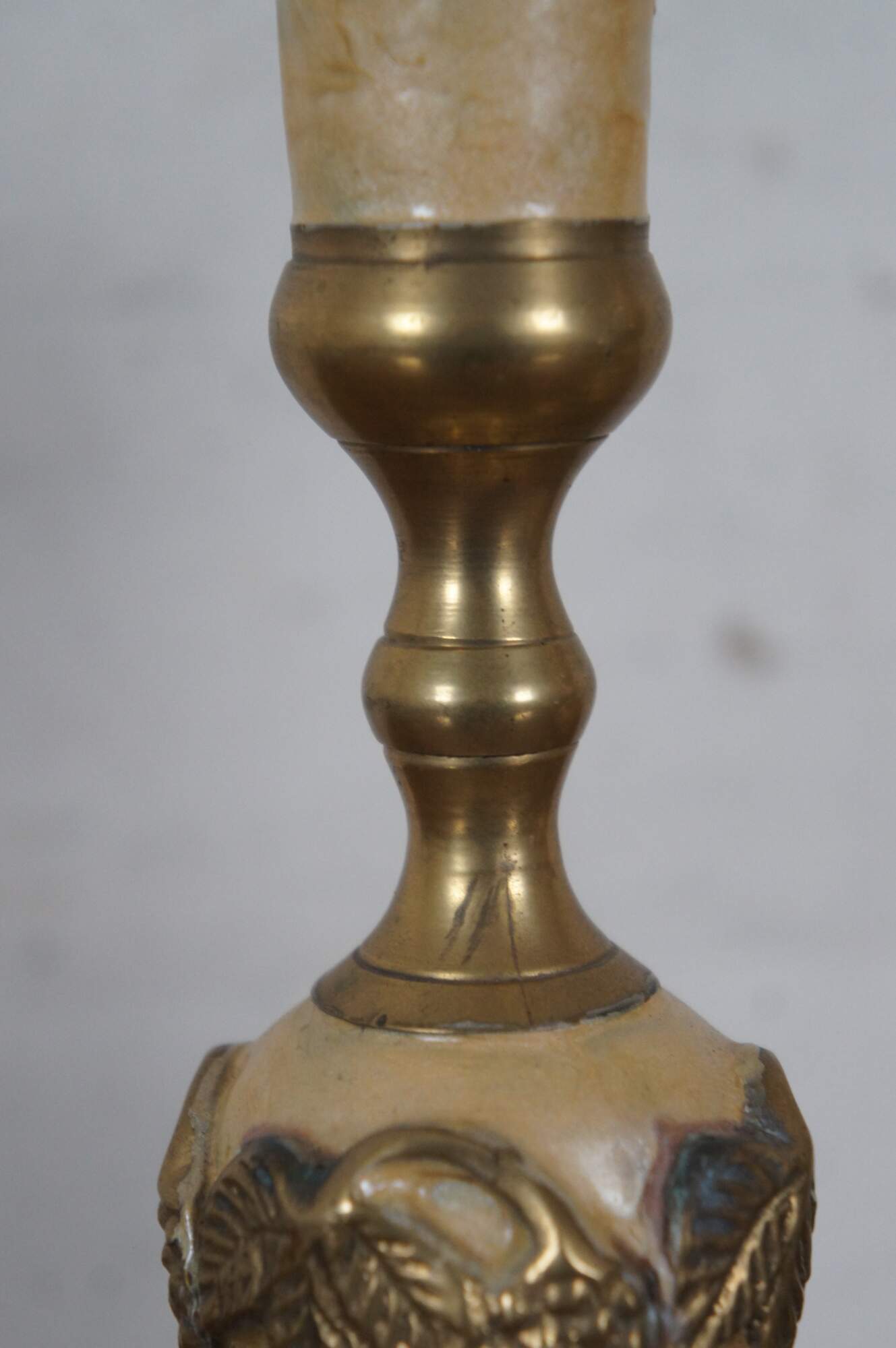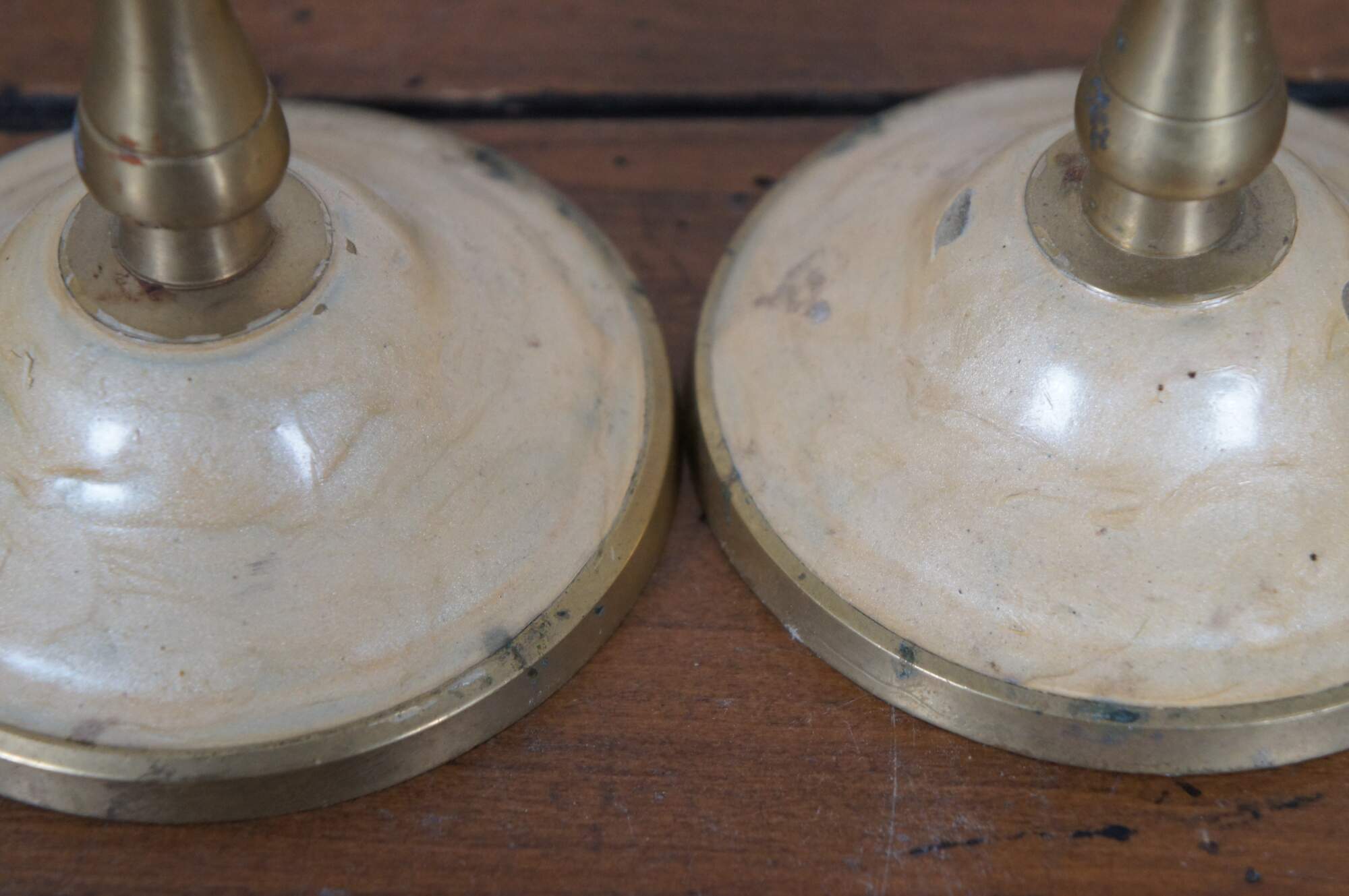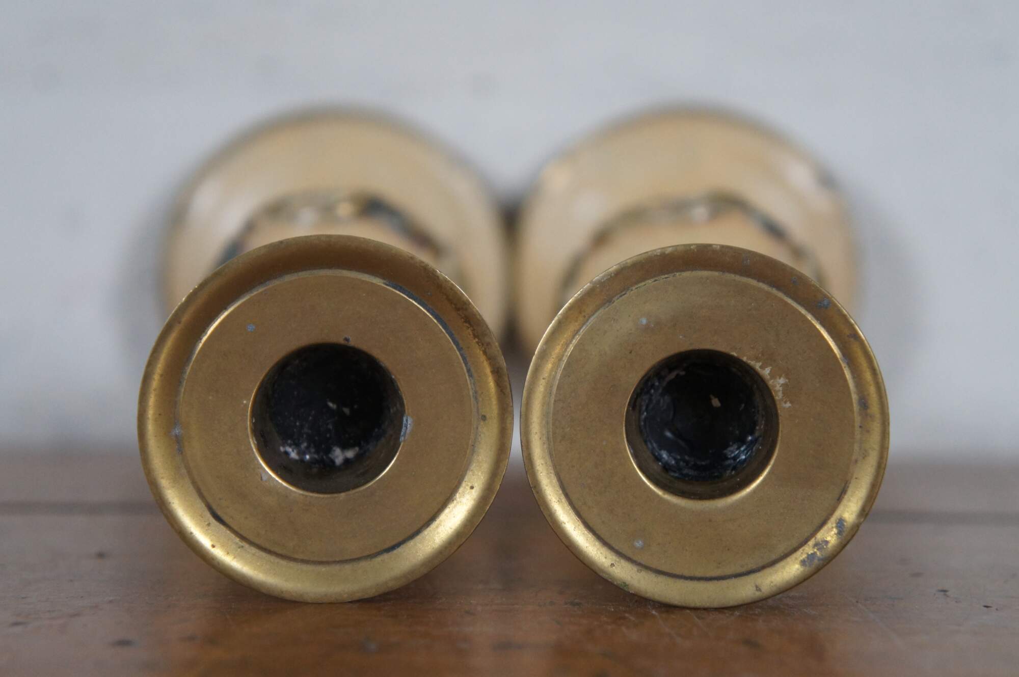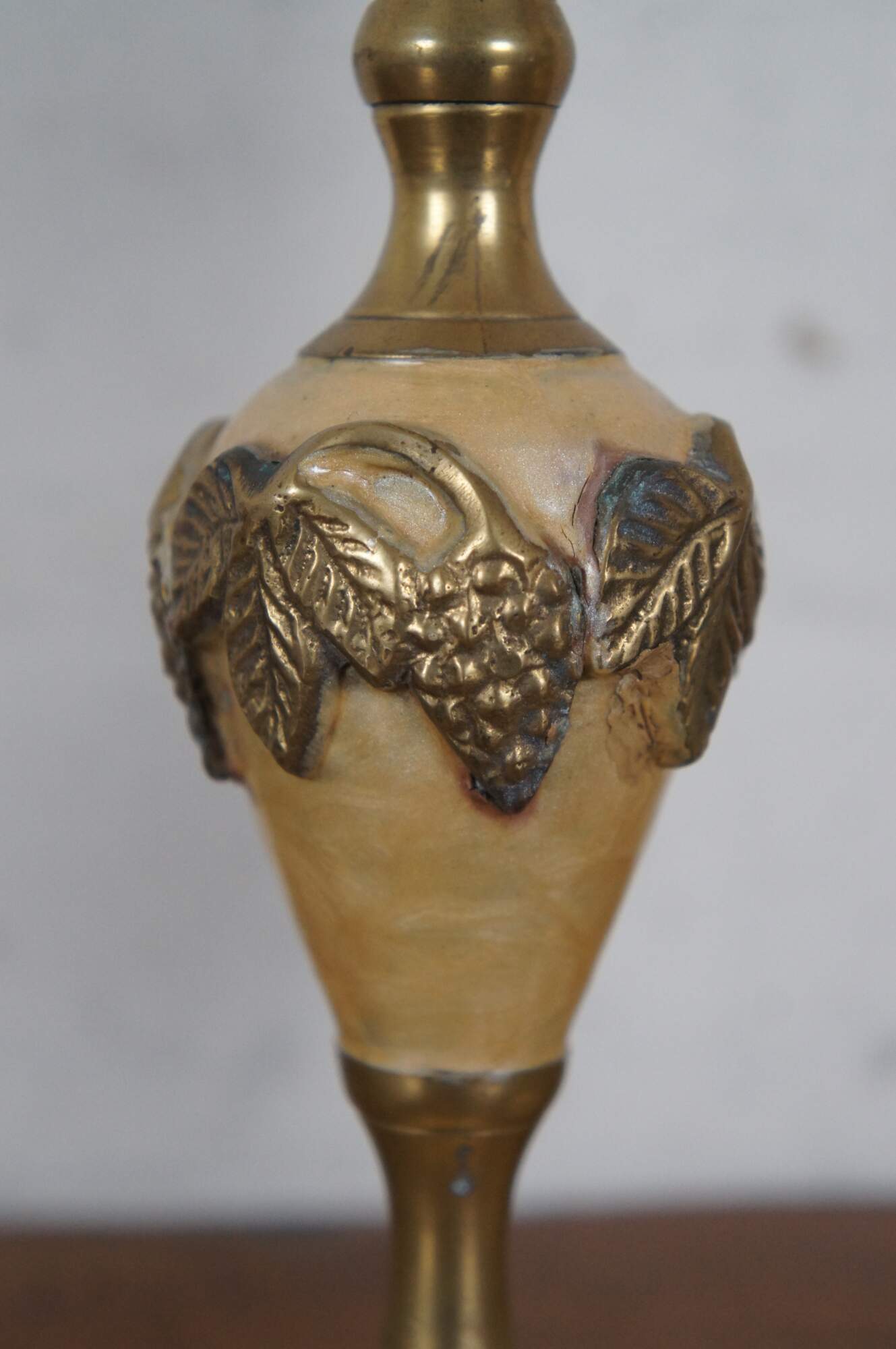 Two vintage enameled brass candlesticks or candle holders featuring a grape and leaves motif.