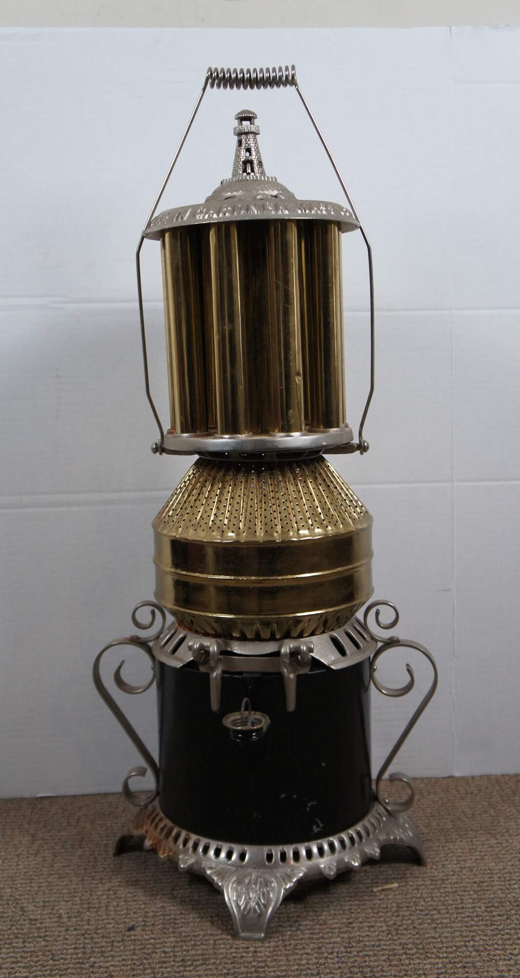 A rare and impressive American Central Oil & Gas Lighthouse 110 parlor or cabin heater. The heater has a lighthouse finial paying homage to the Cape May Lighthouse.