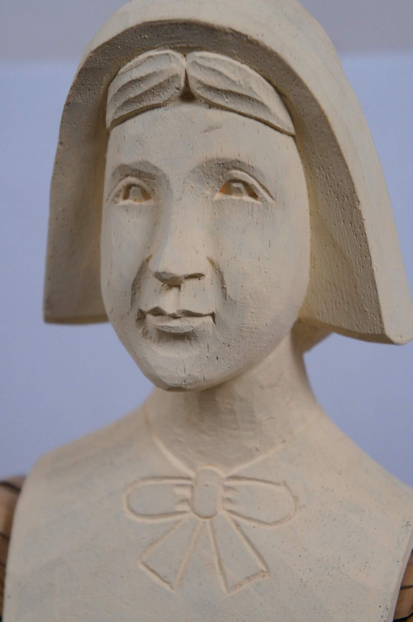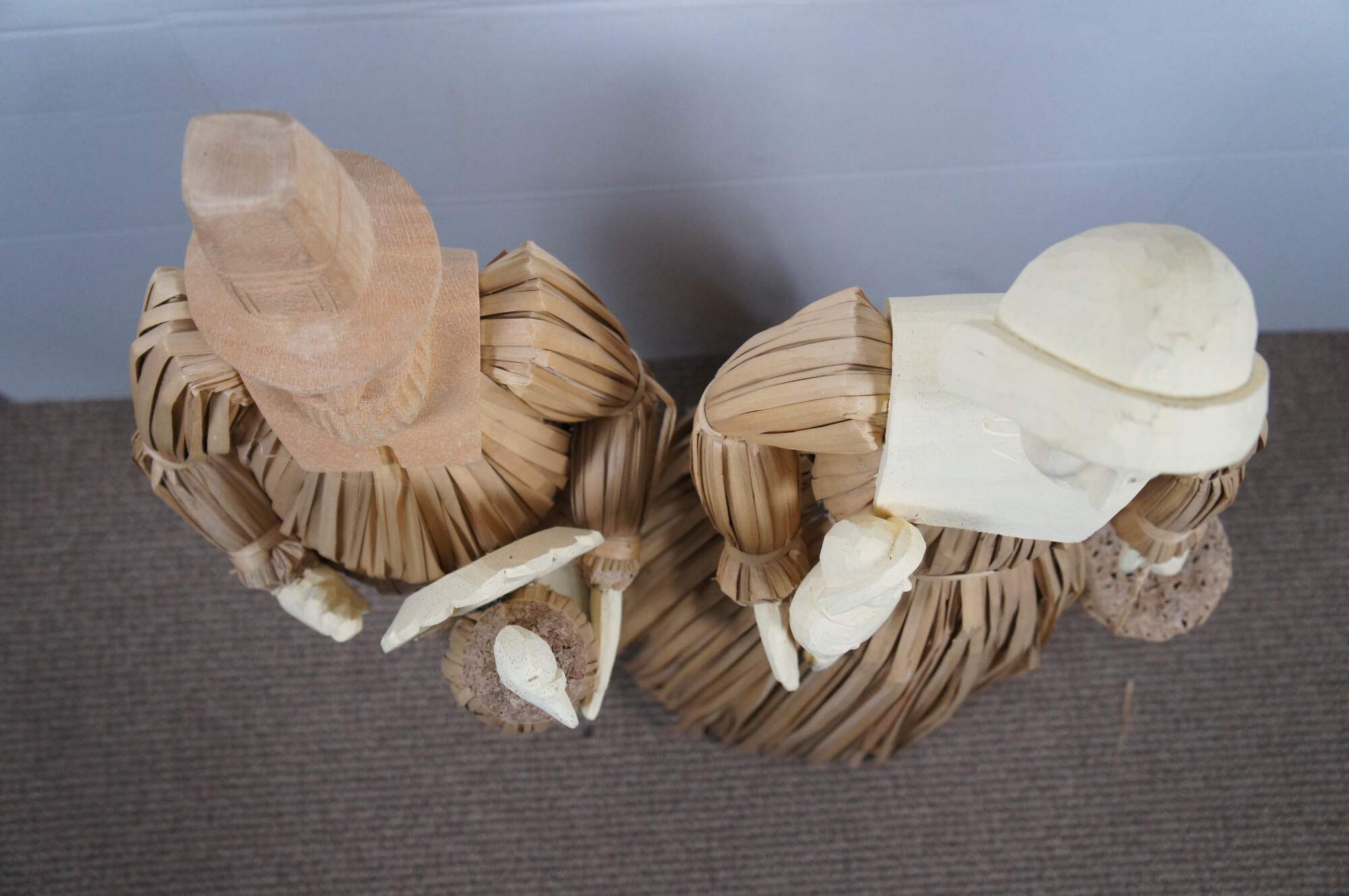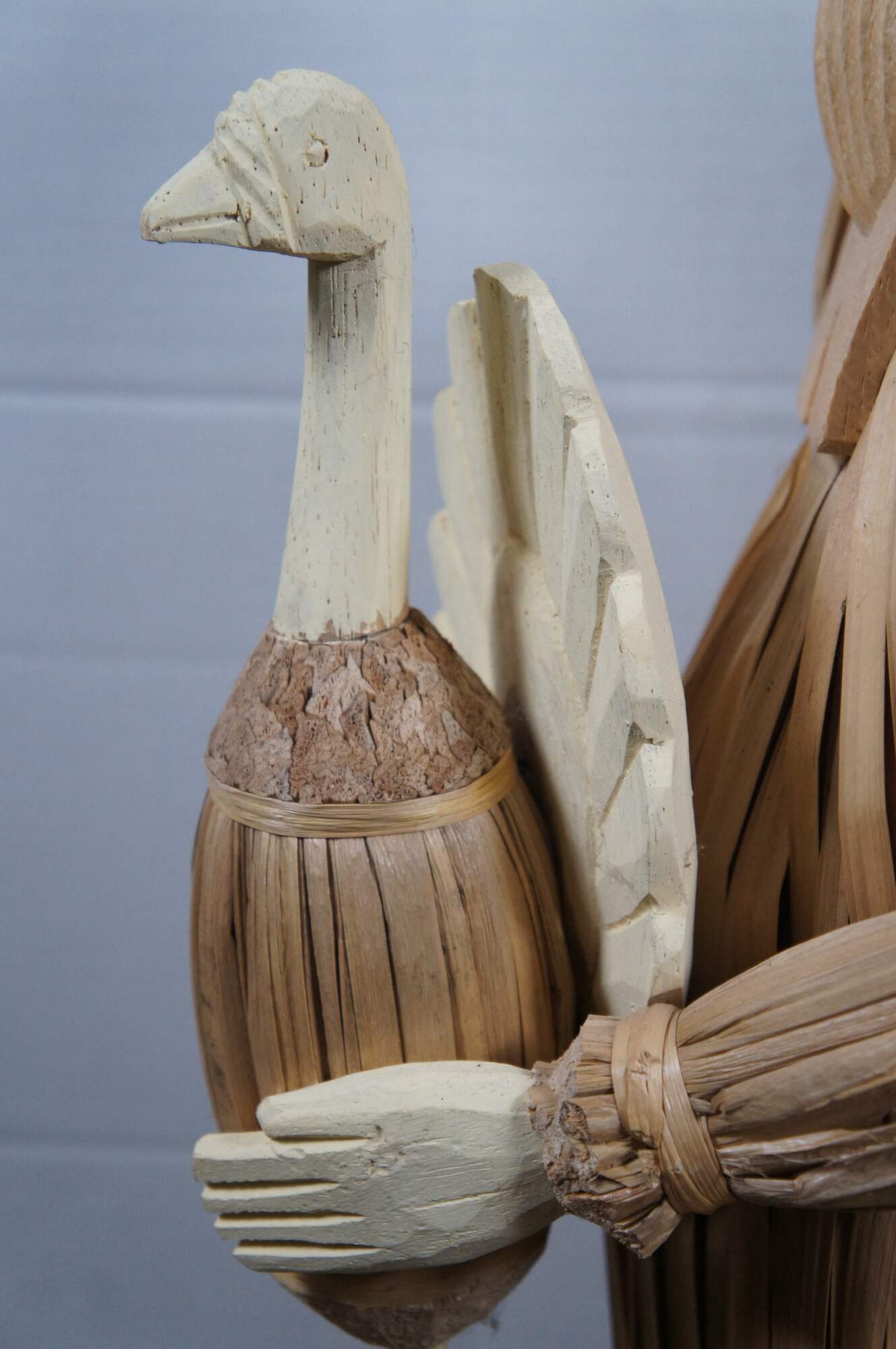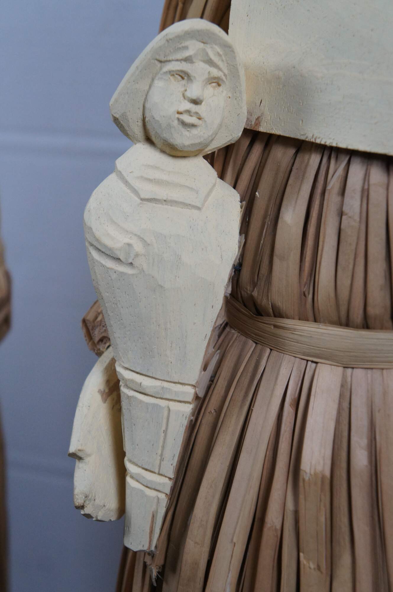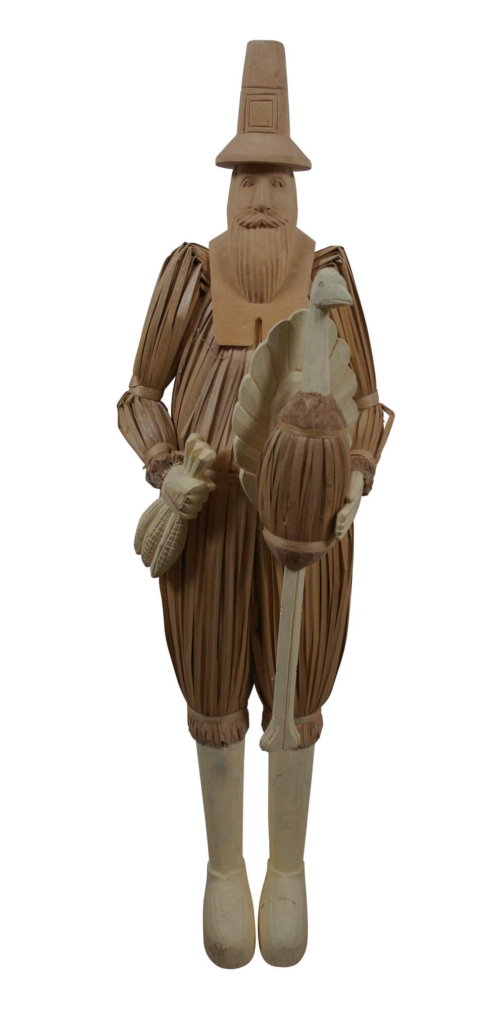 Two large vintage wood and corn husk artisian folk art doll statues or sculptures featuring Thanksgiving Pilgrims in traditional attire with turkey, corn, a baby and a pale. Autumn Harvest / fall.