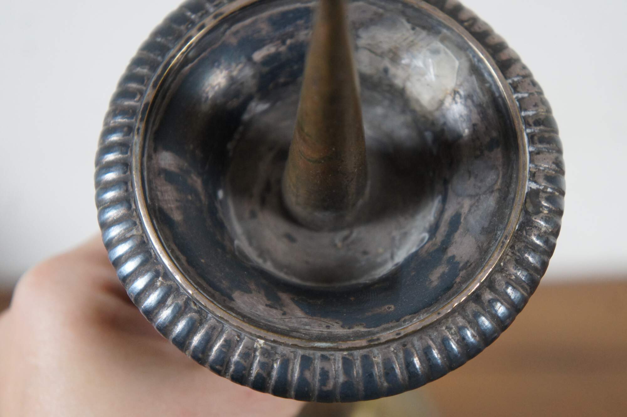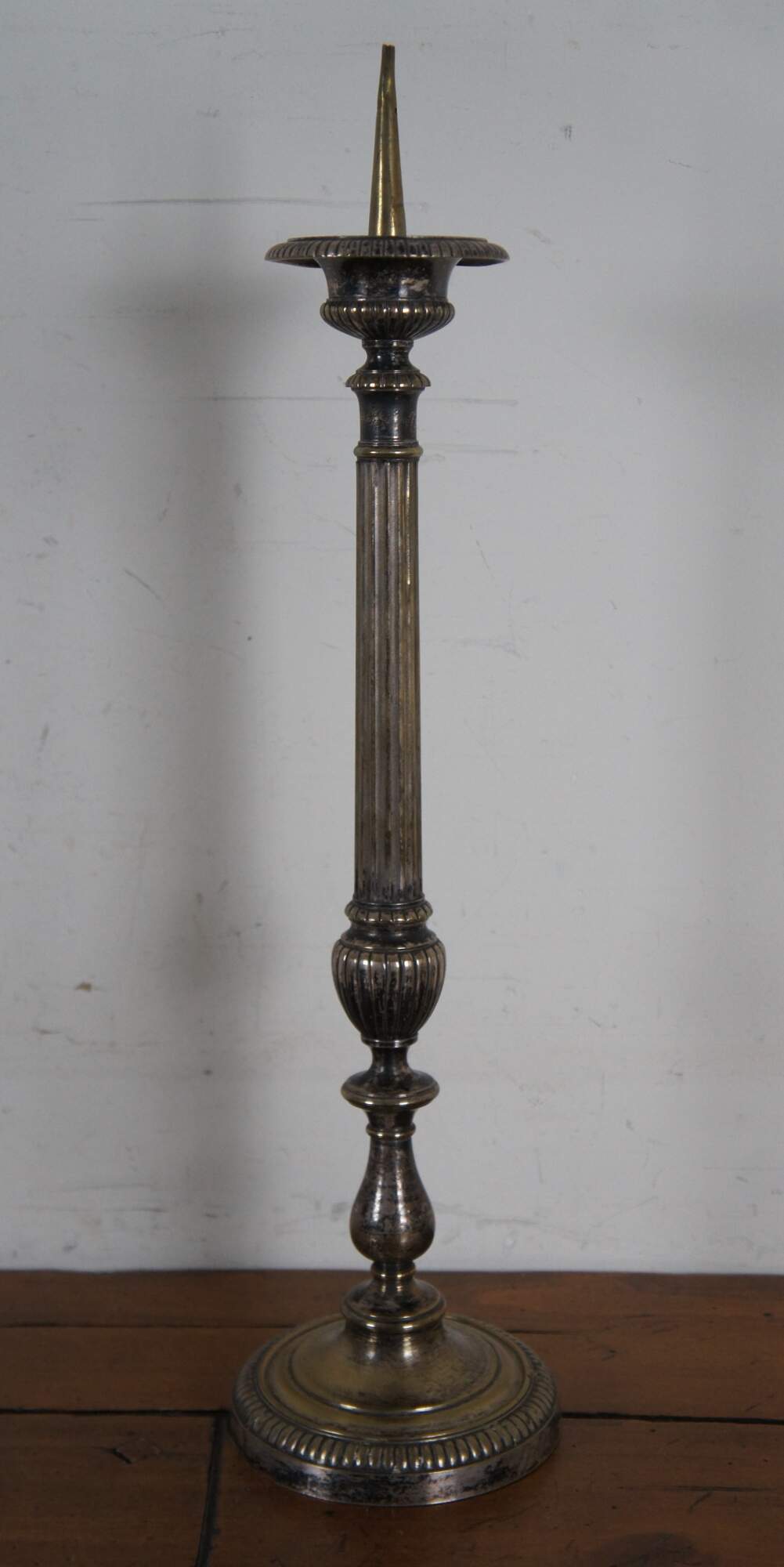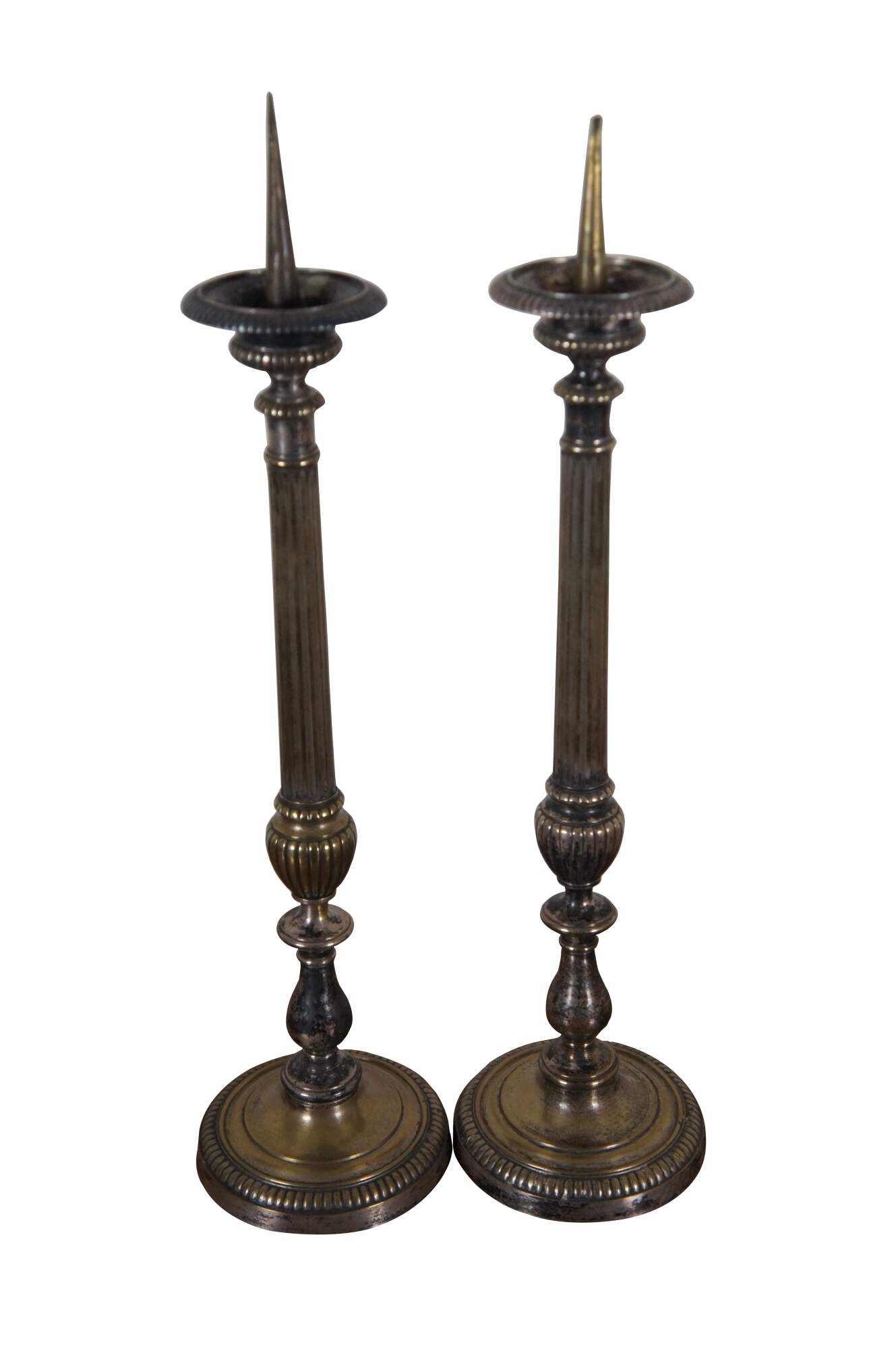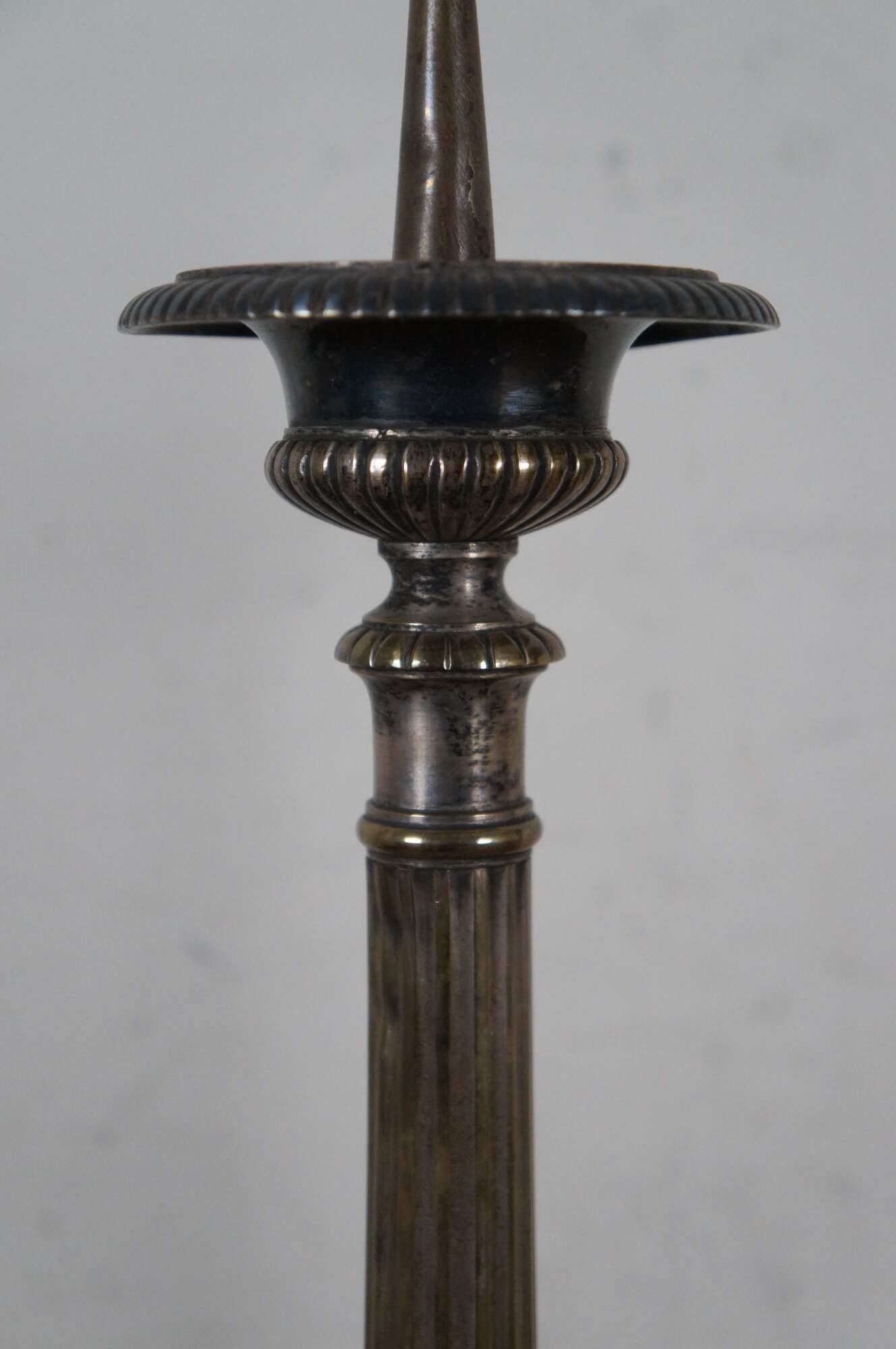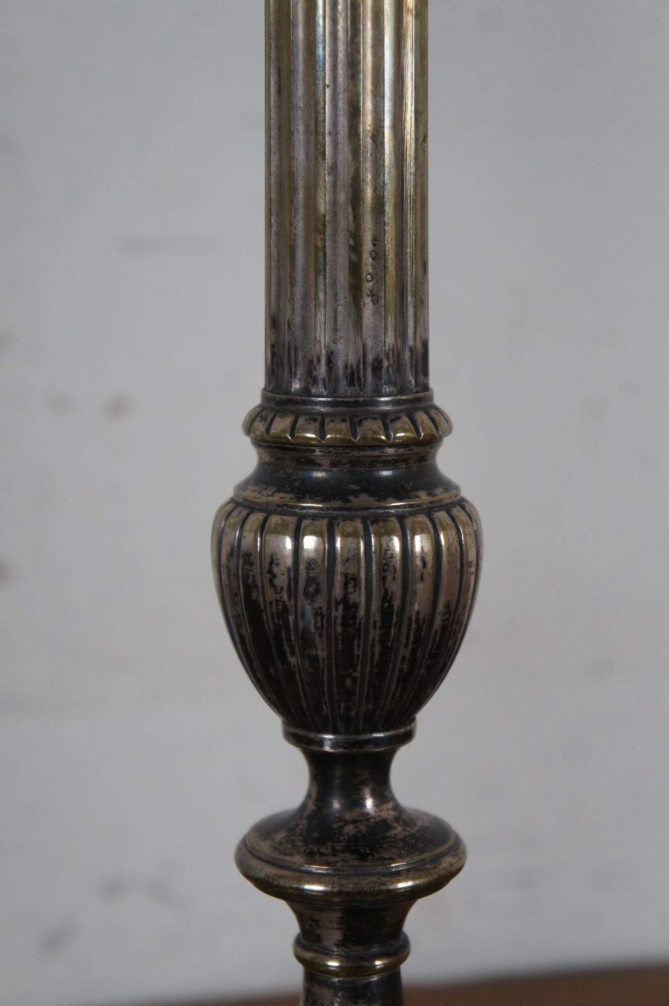 Two antique French Louis XVI style silverplate mantel or floor prickets / candlesticks / candle holders featuring a tall reeded column with trophy urn form pedestal base.