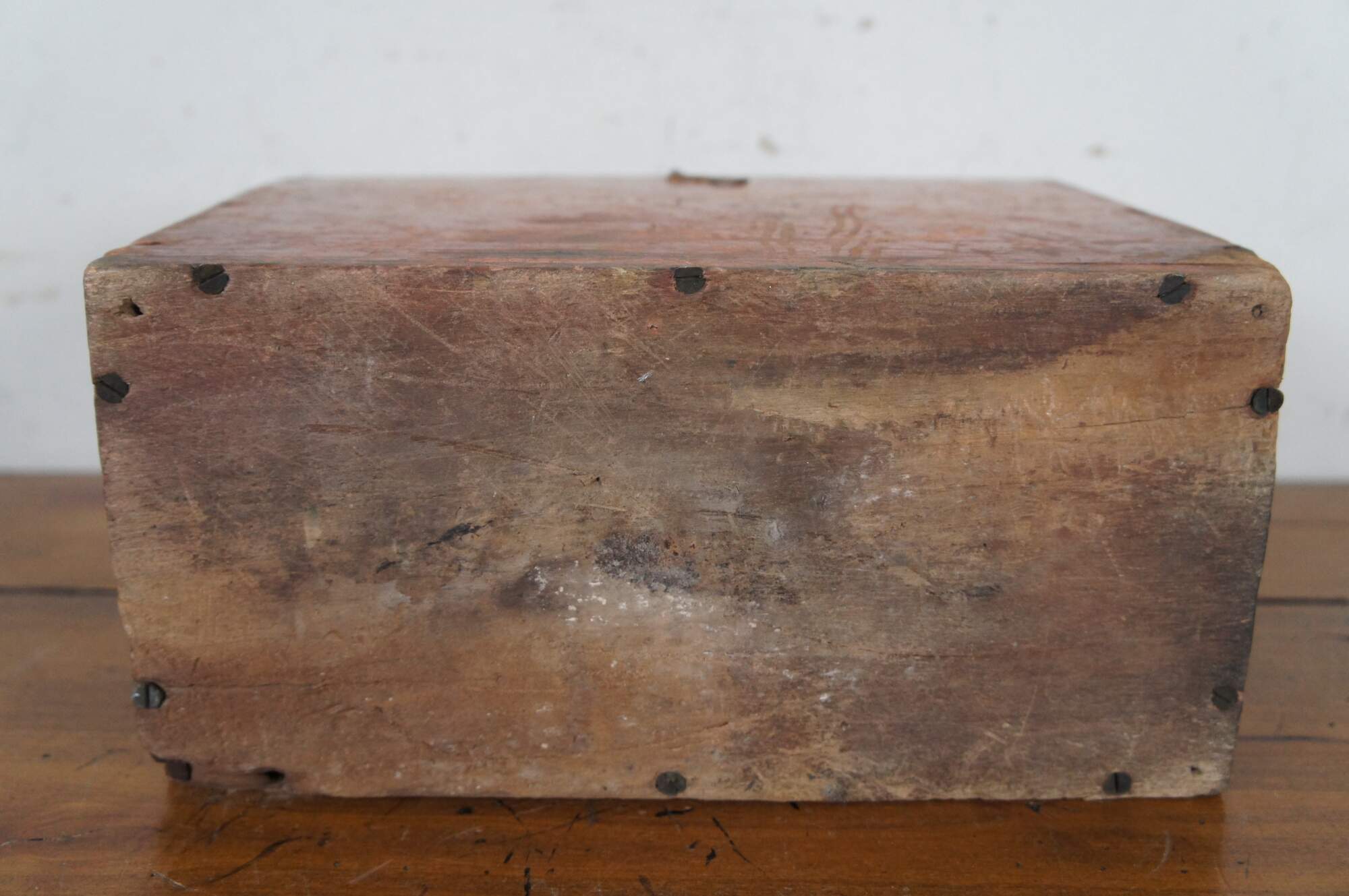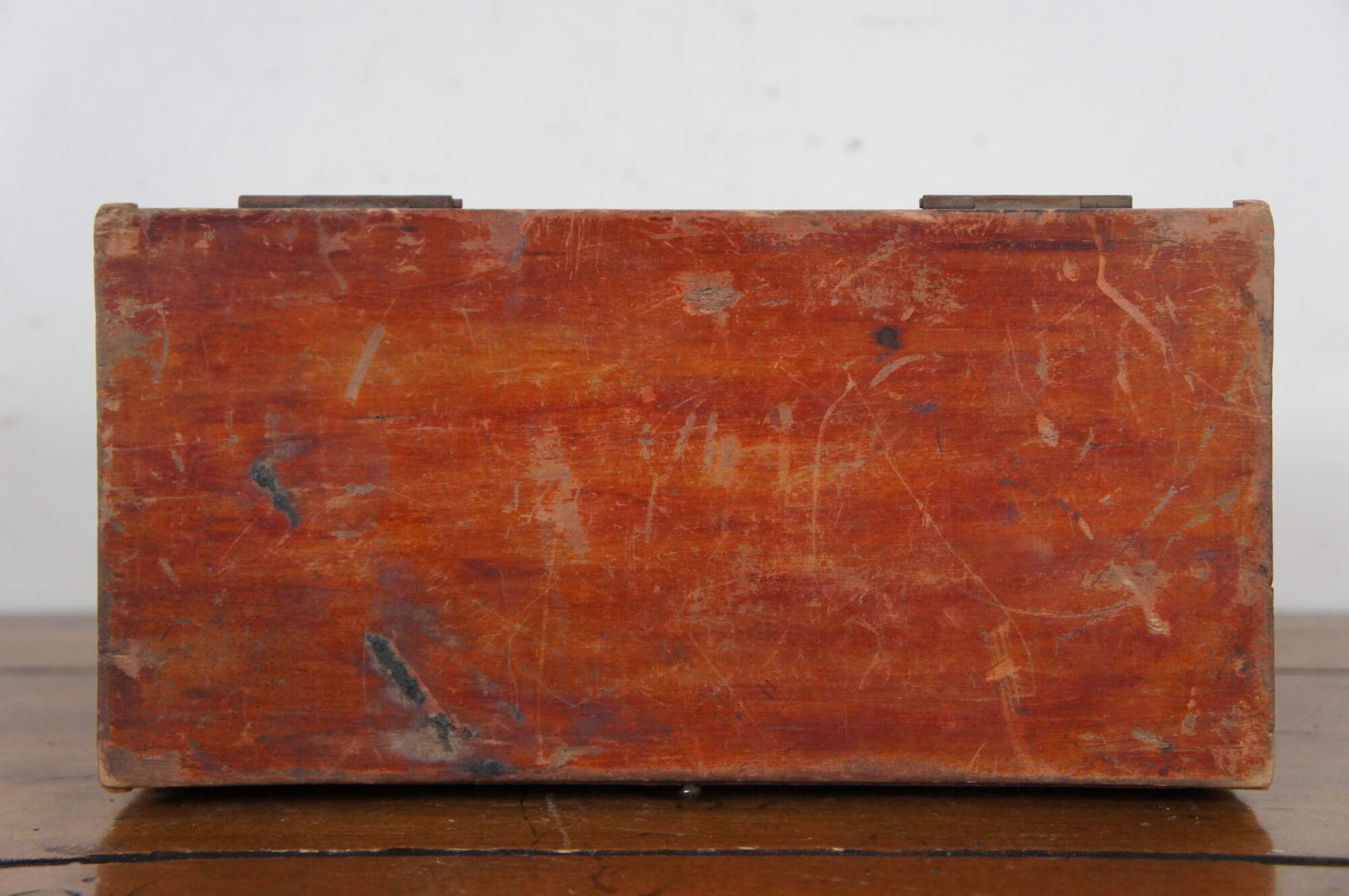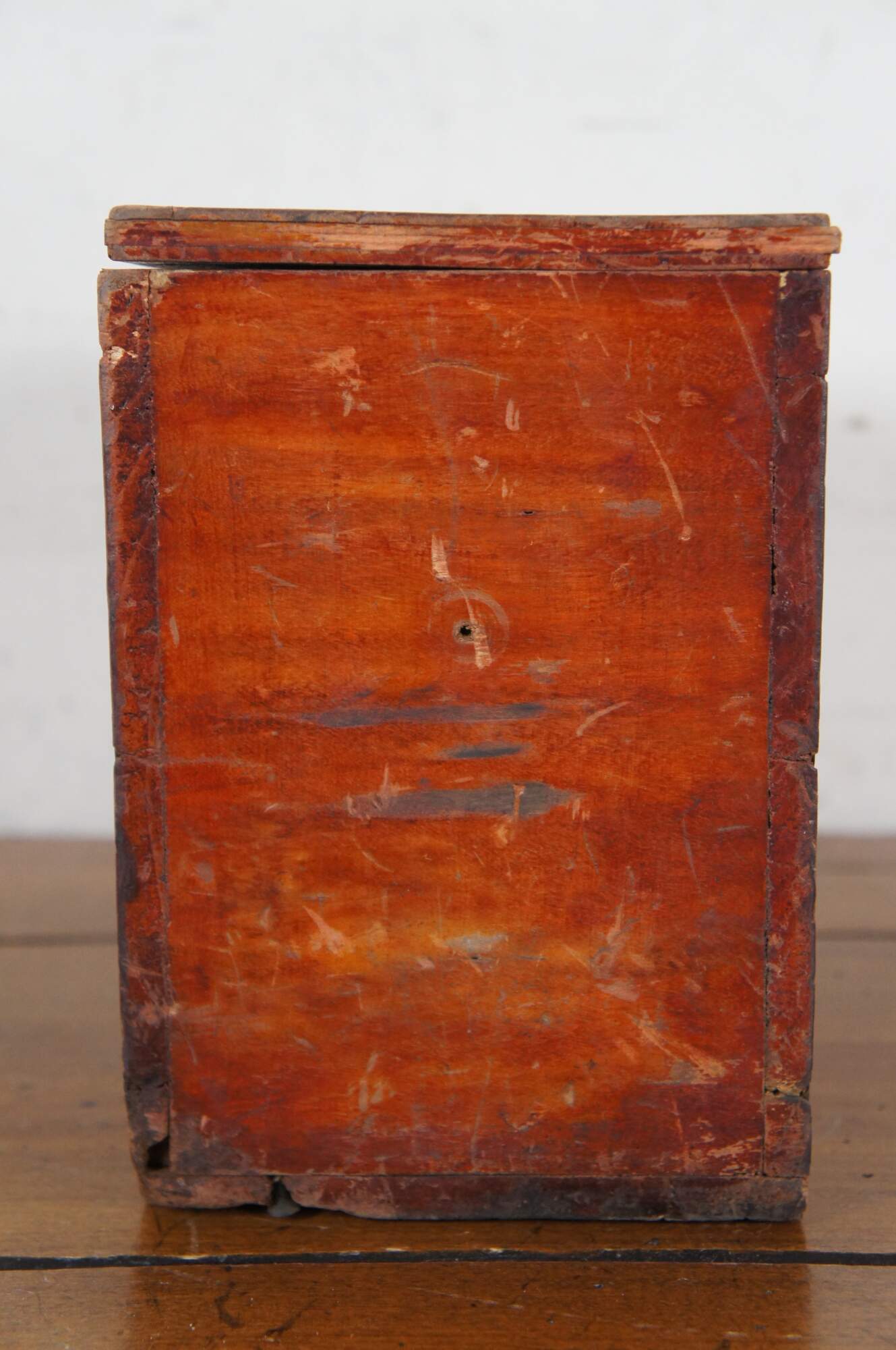 Antique primitive red painted wood keepsake letter trinket storage box with latch.