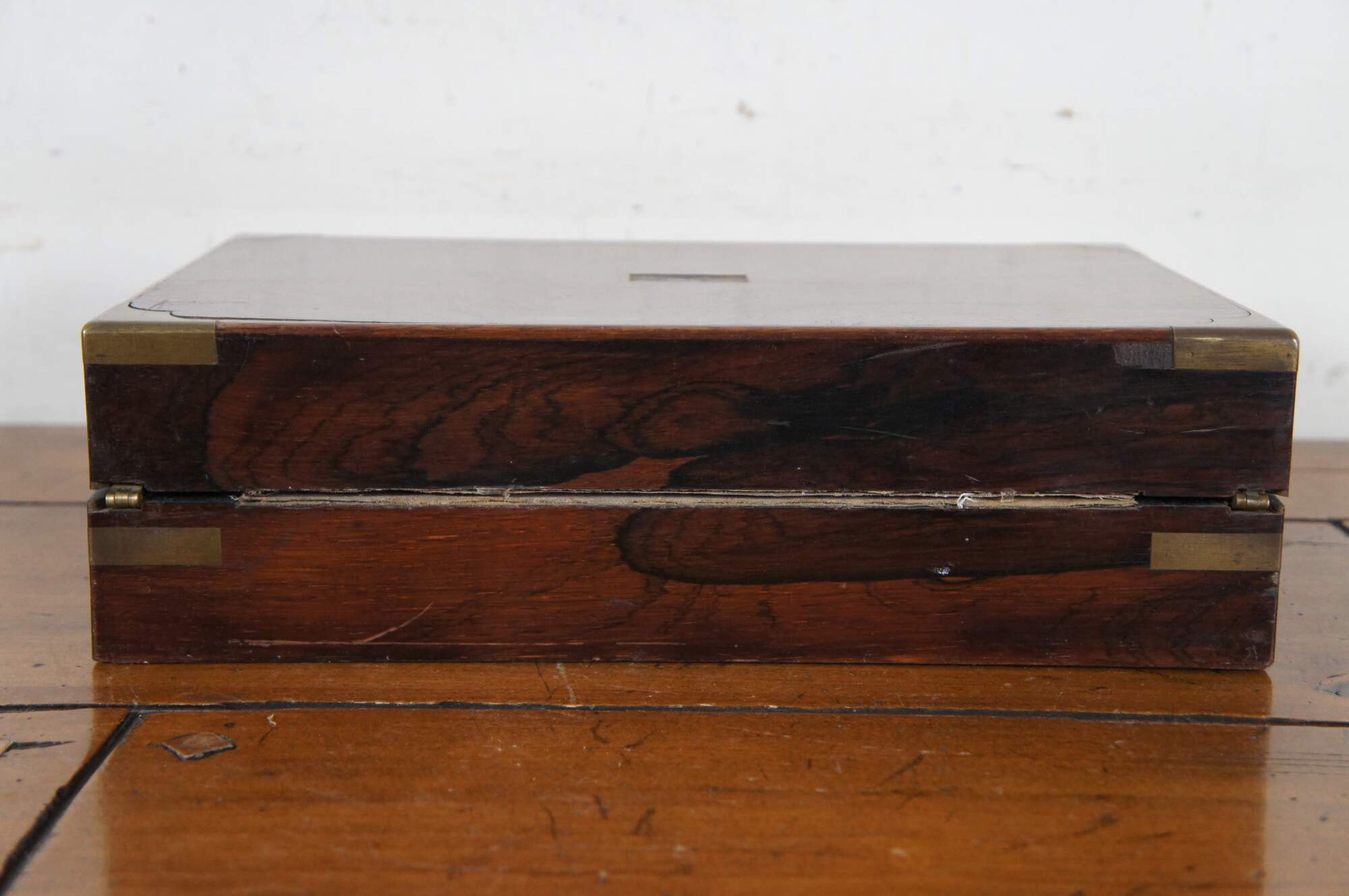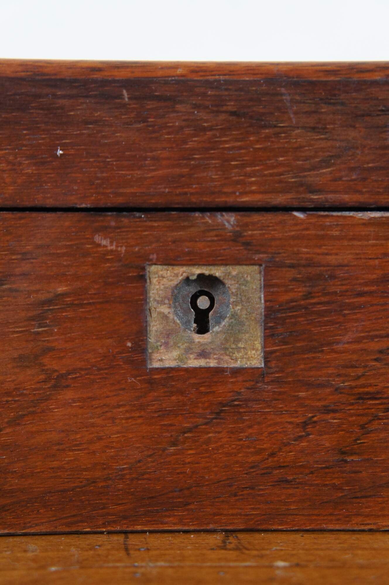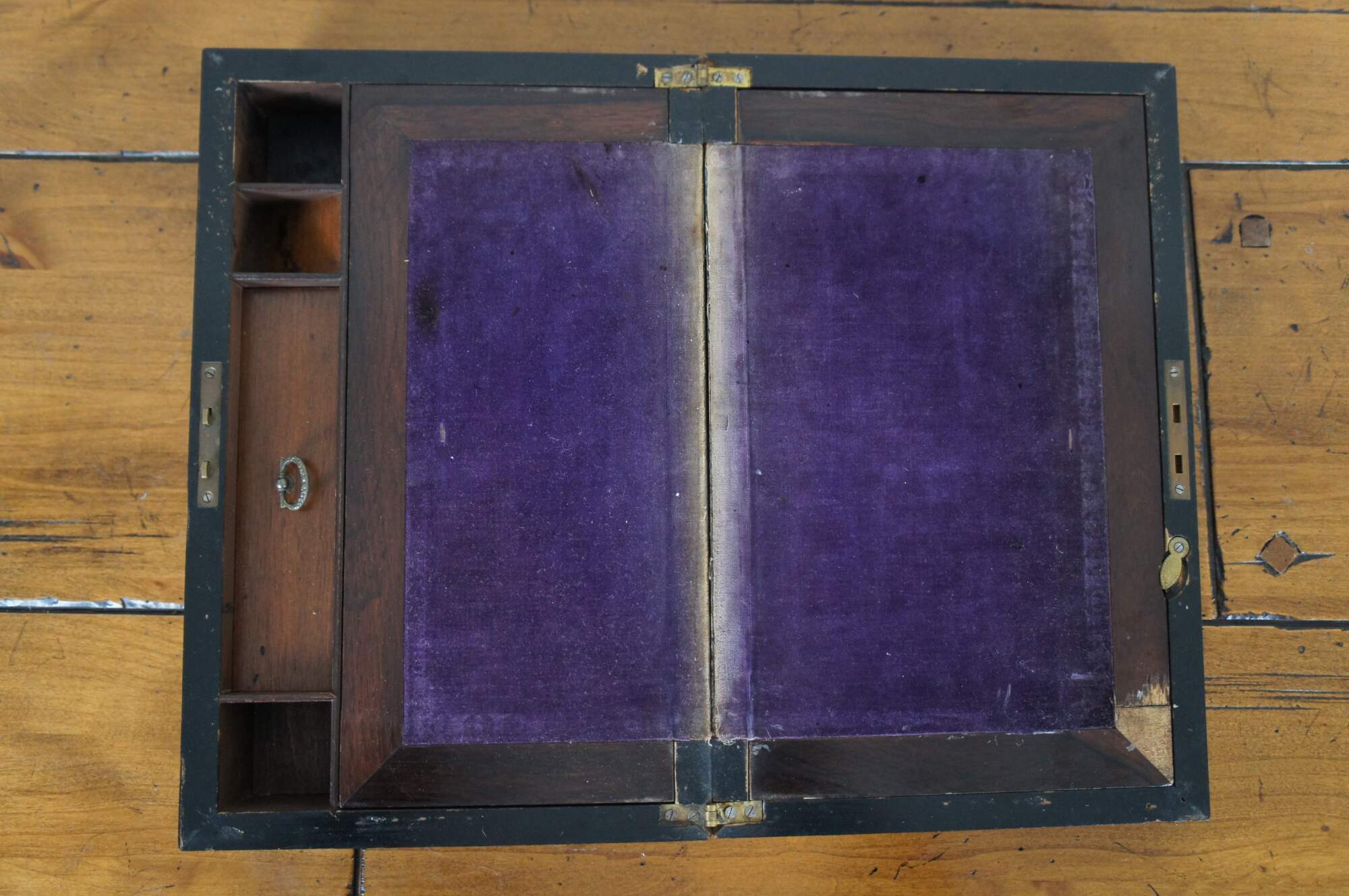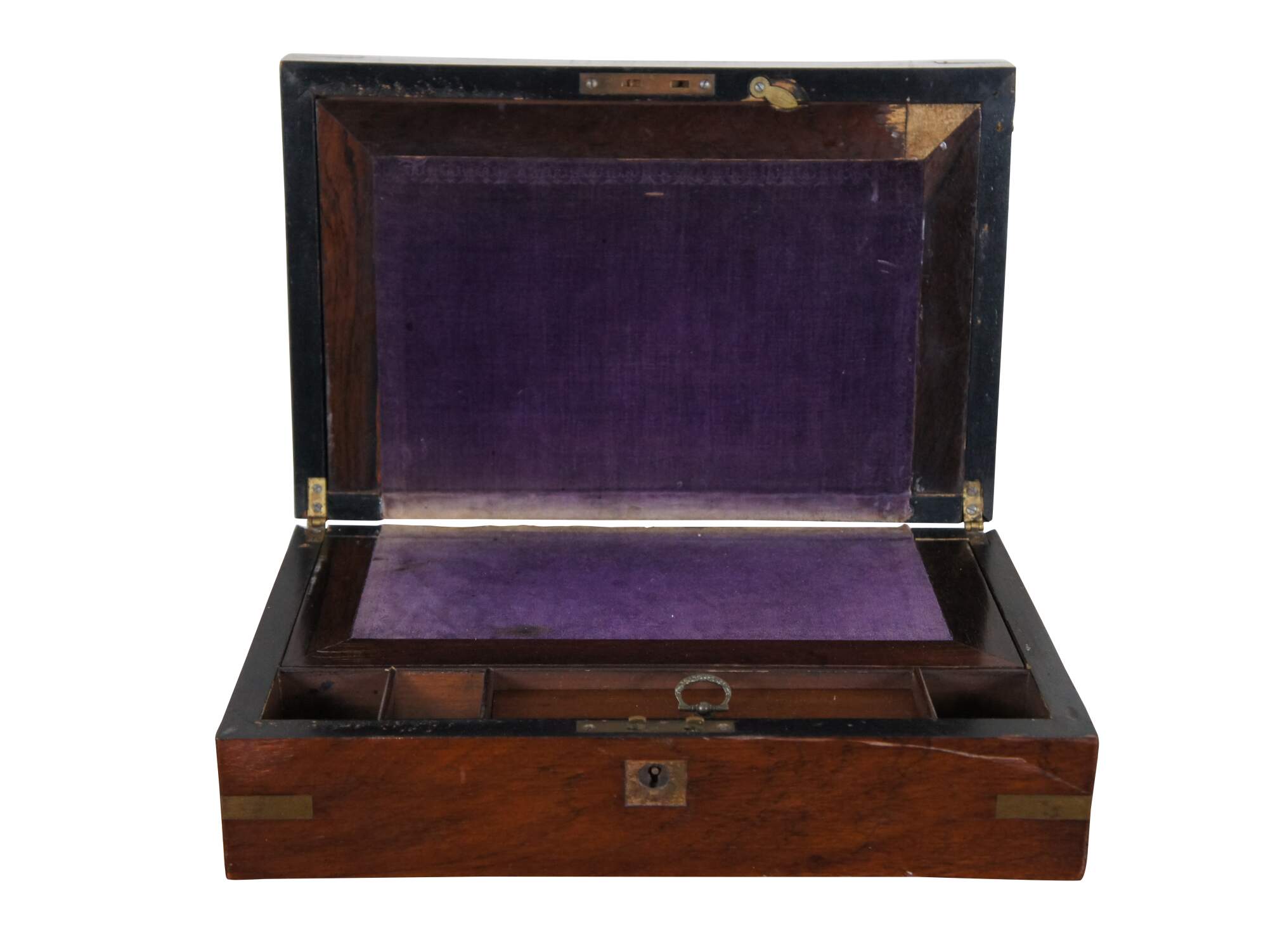 Fair condition; wear and distressing commensurate with age and use, scuffing / scraping / splitting, missing veneer, wear to velvet, detached nameplate, no key or key plate.