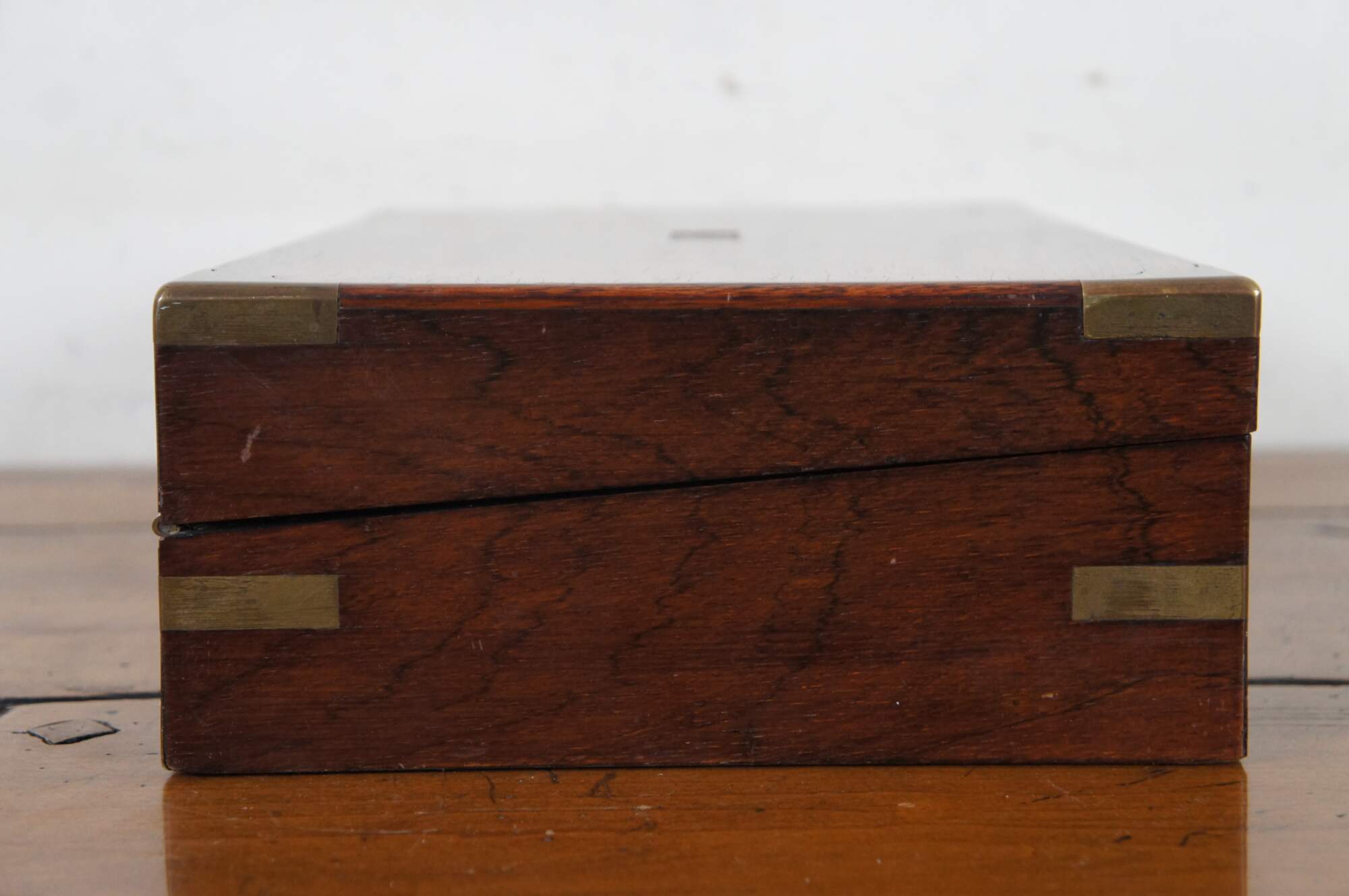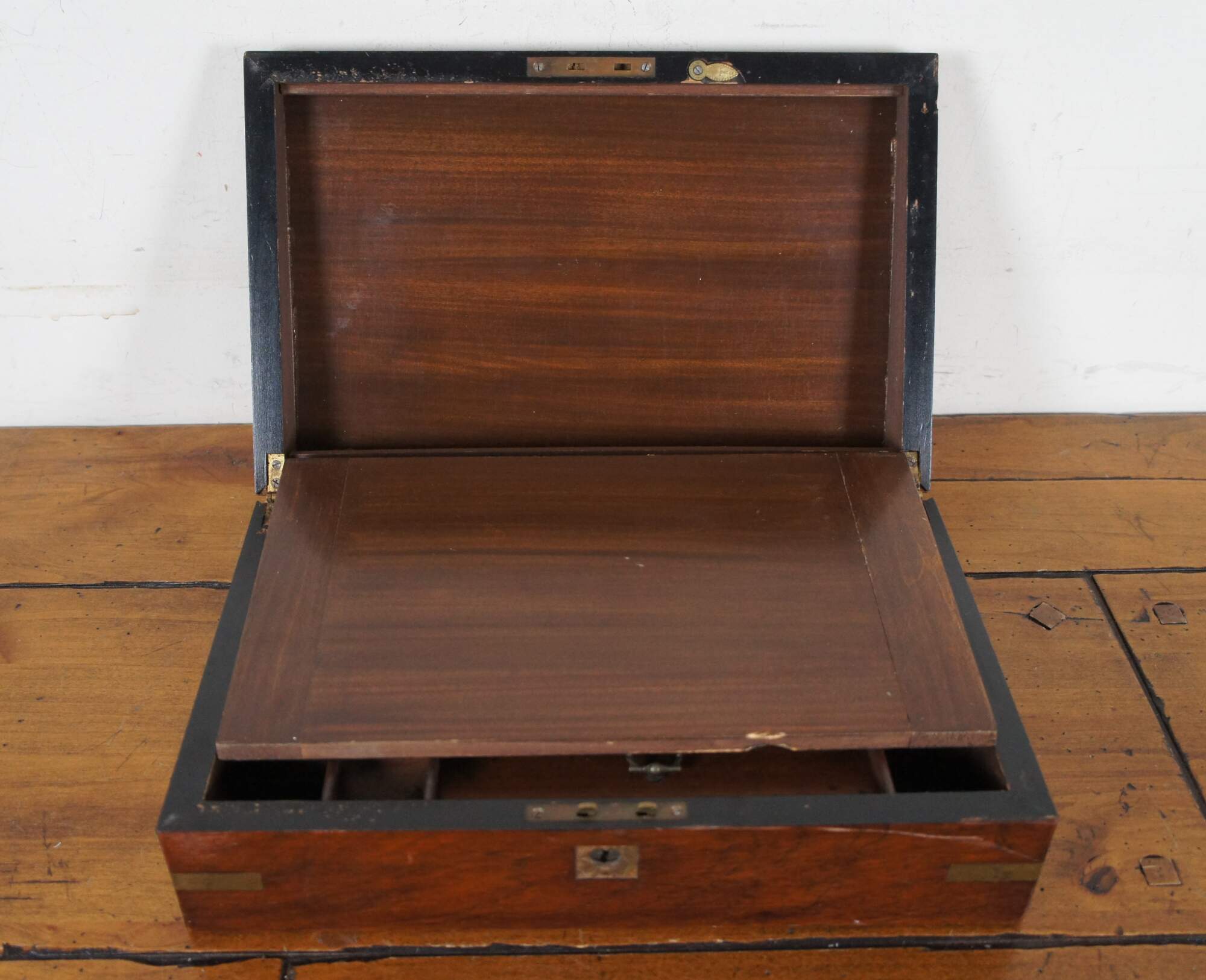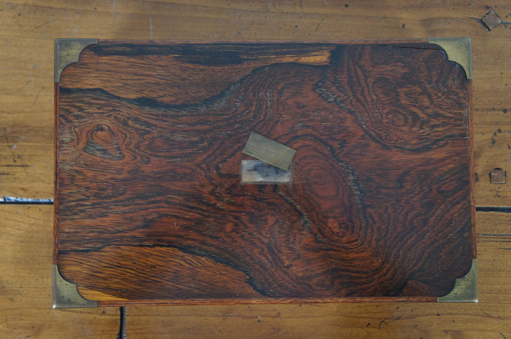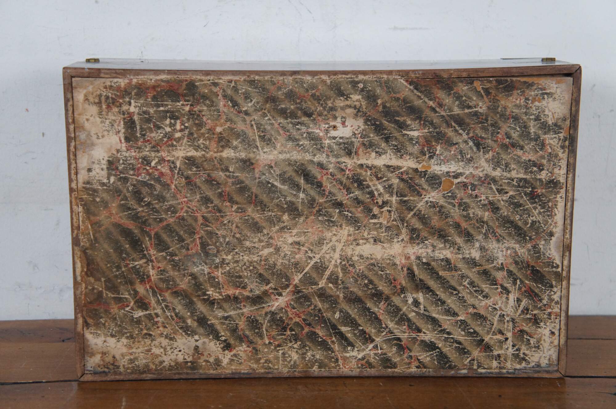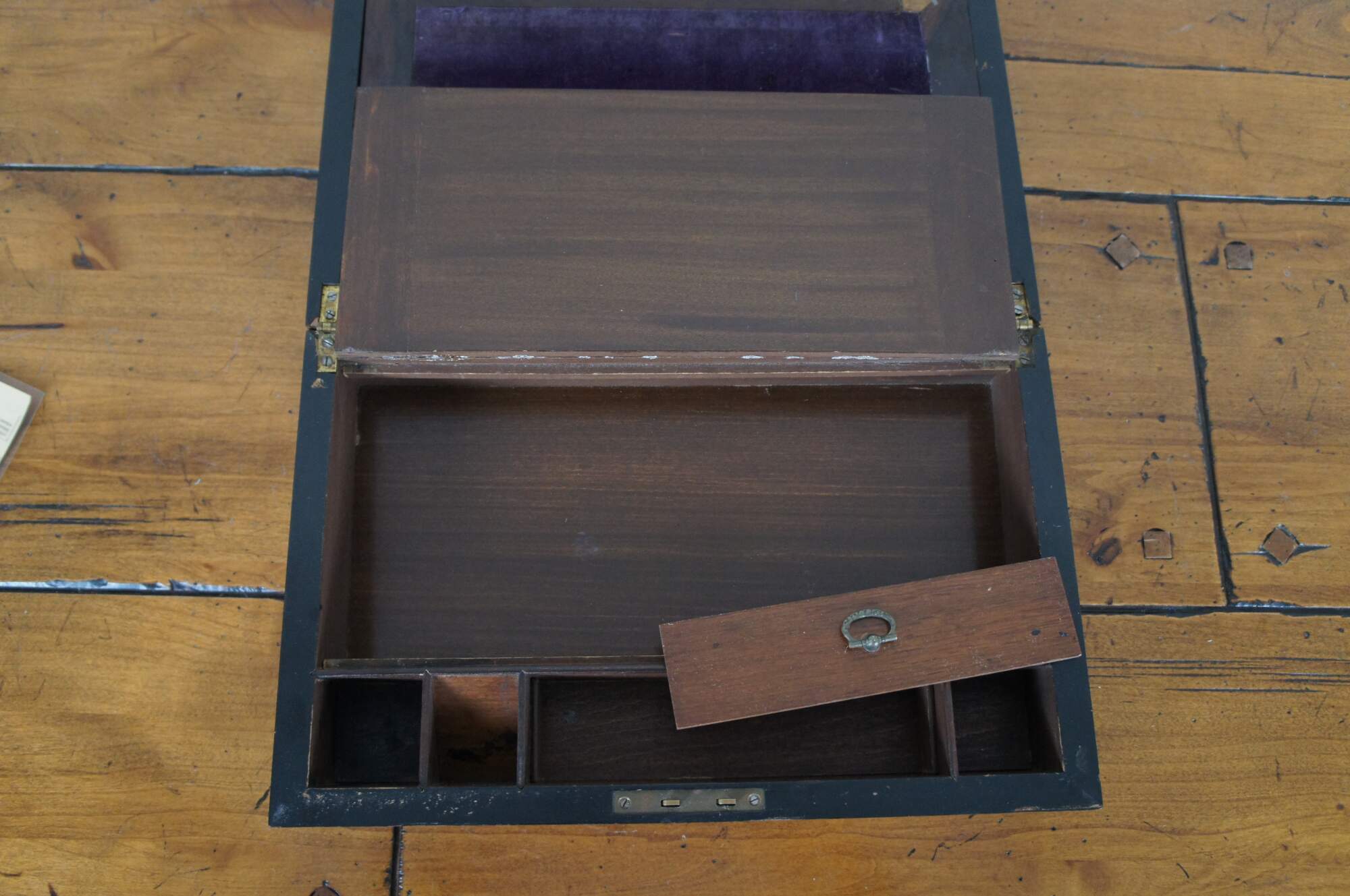 Fair condition; wear and distressing commensurate with age and use, scuffing / scraping / splitting, missing veneer, wear to velvet, detached nameplate, no key or key plate.