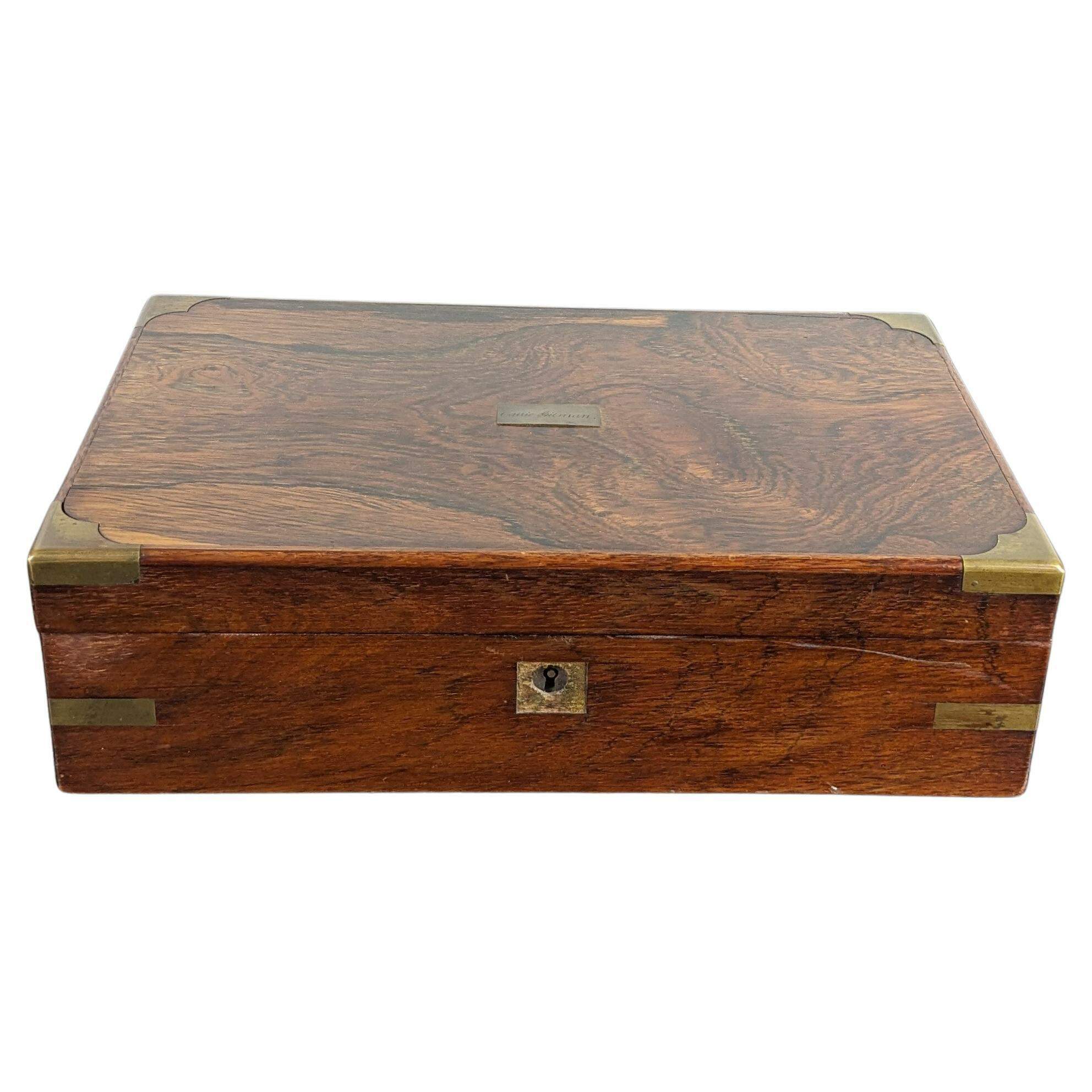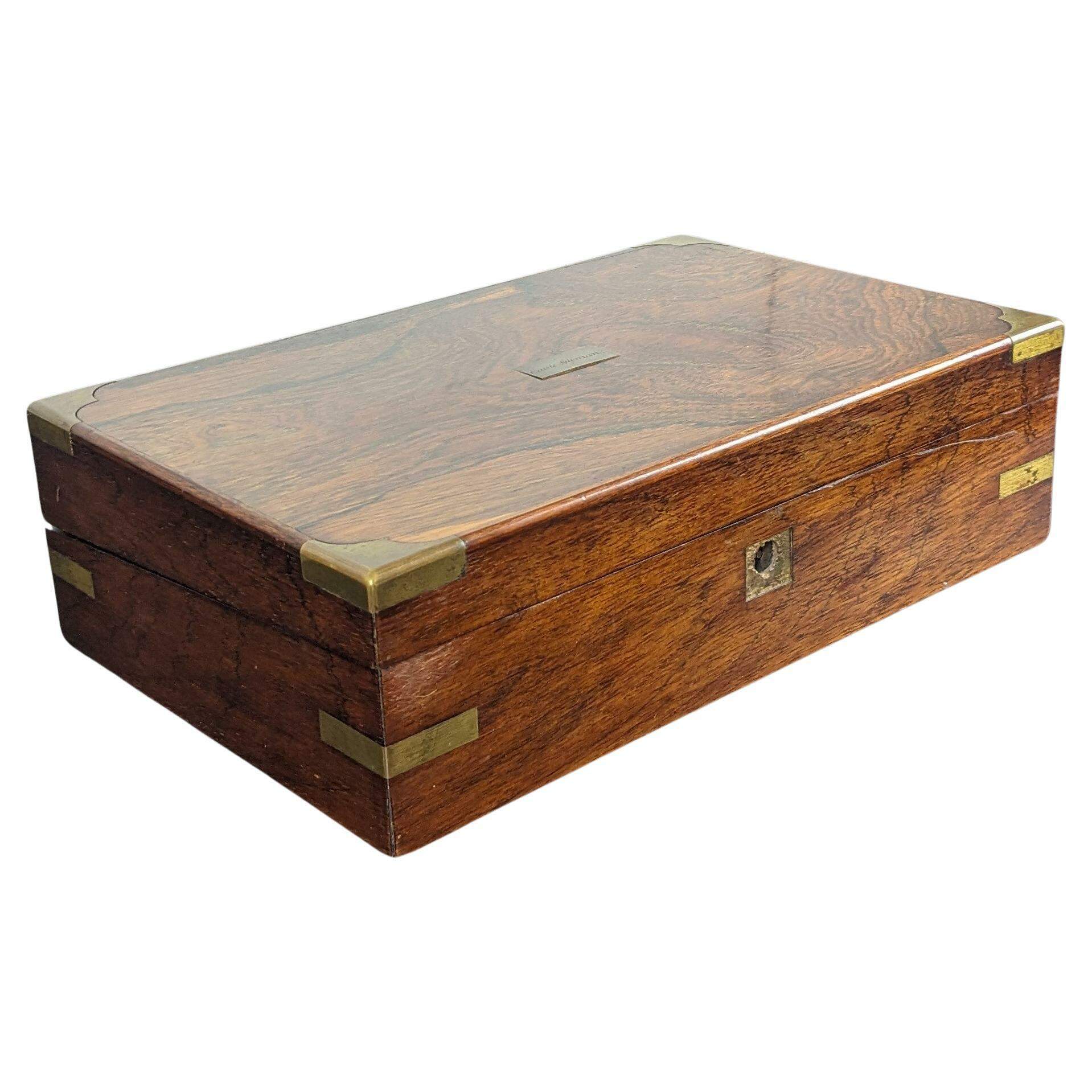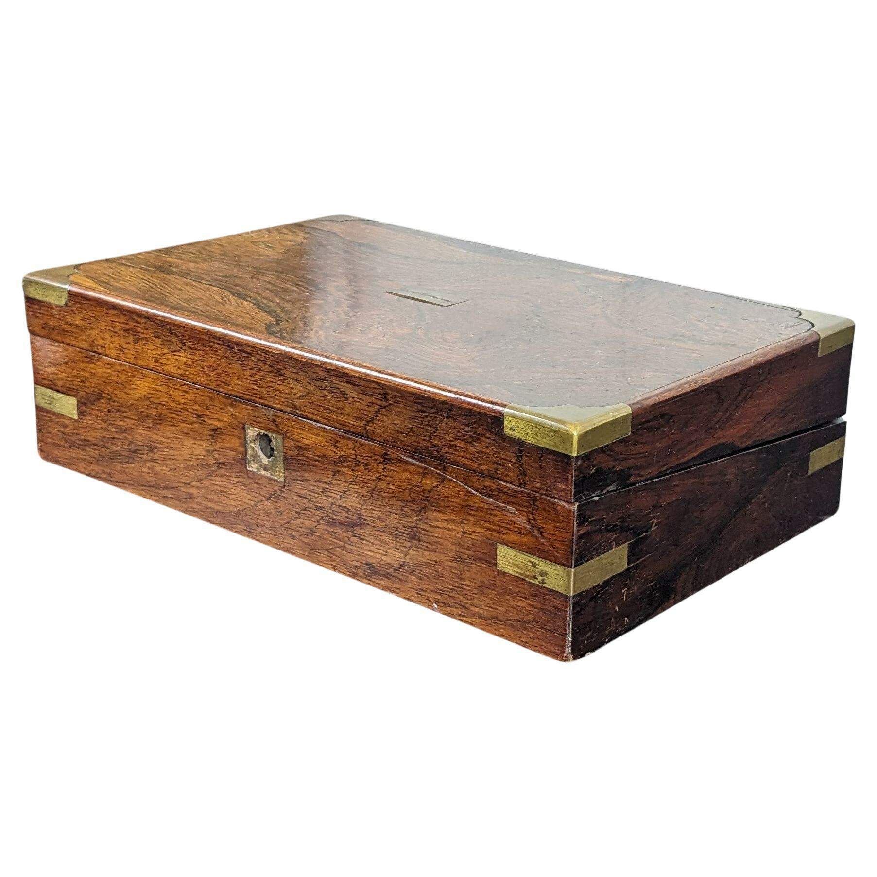 Antique 19th Century English Georgian campaign writing slope, box or travel desk. Made from rosewood featuring rectangular form with brass banding. Opens to purple velvet interior with multiple storage compartments and writing surfaces.