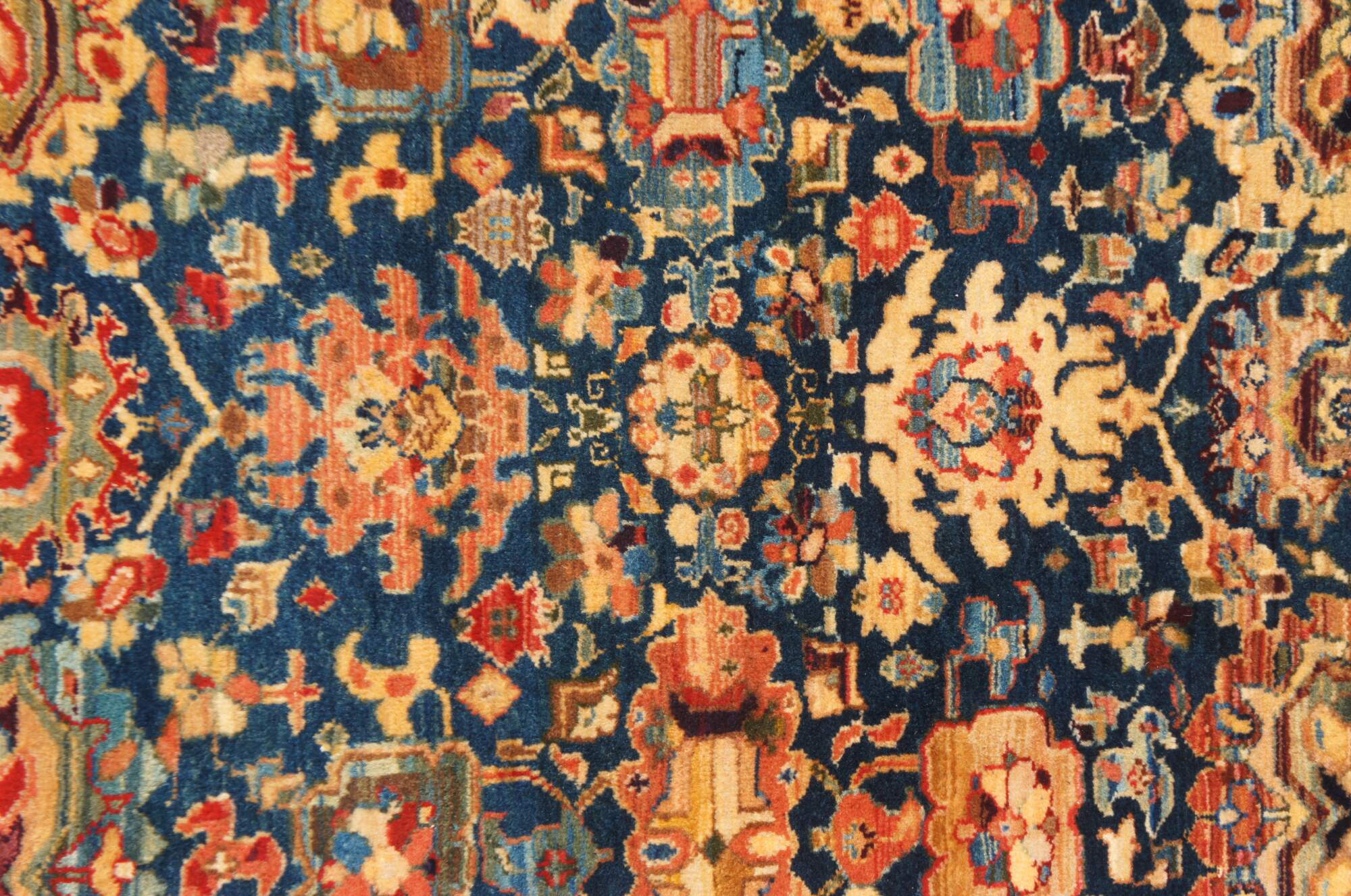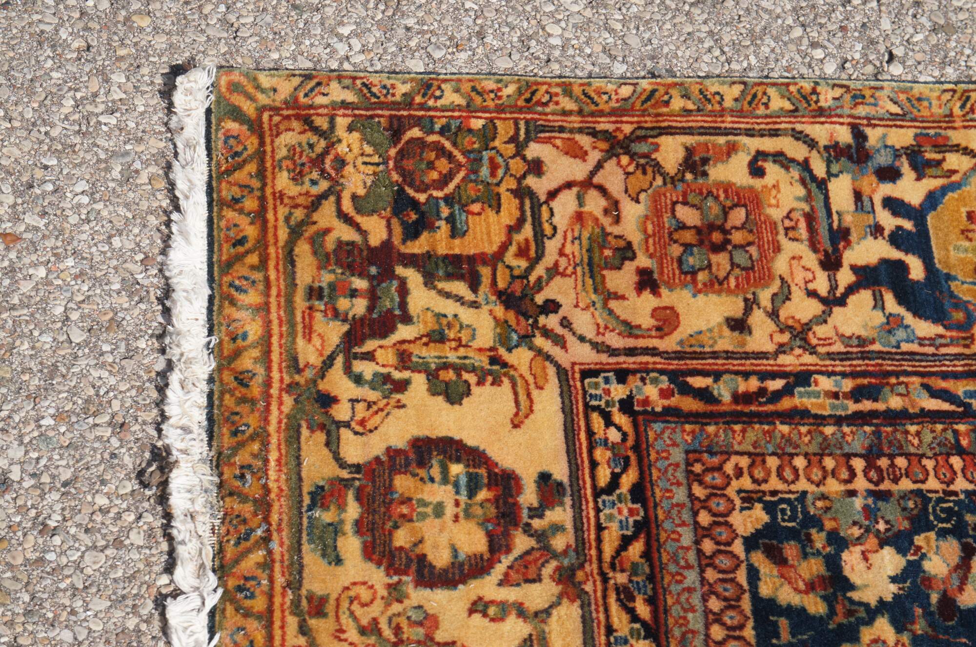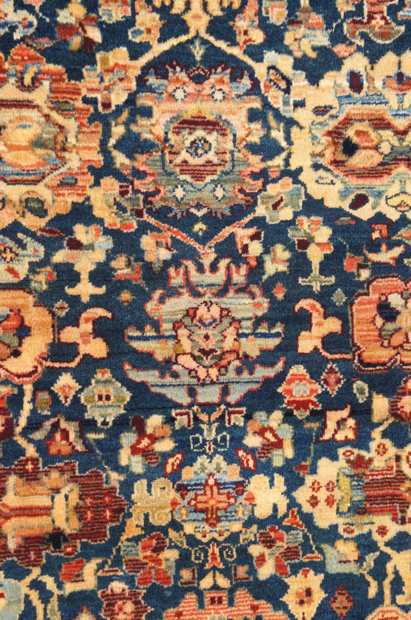 Genuine hand knotted oriental area rug. Features a colorful blue and gold geometric design. Hand woven from wool, 144kpsi