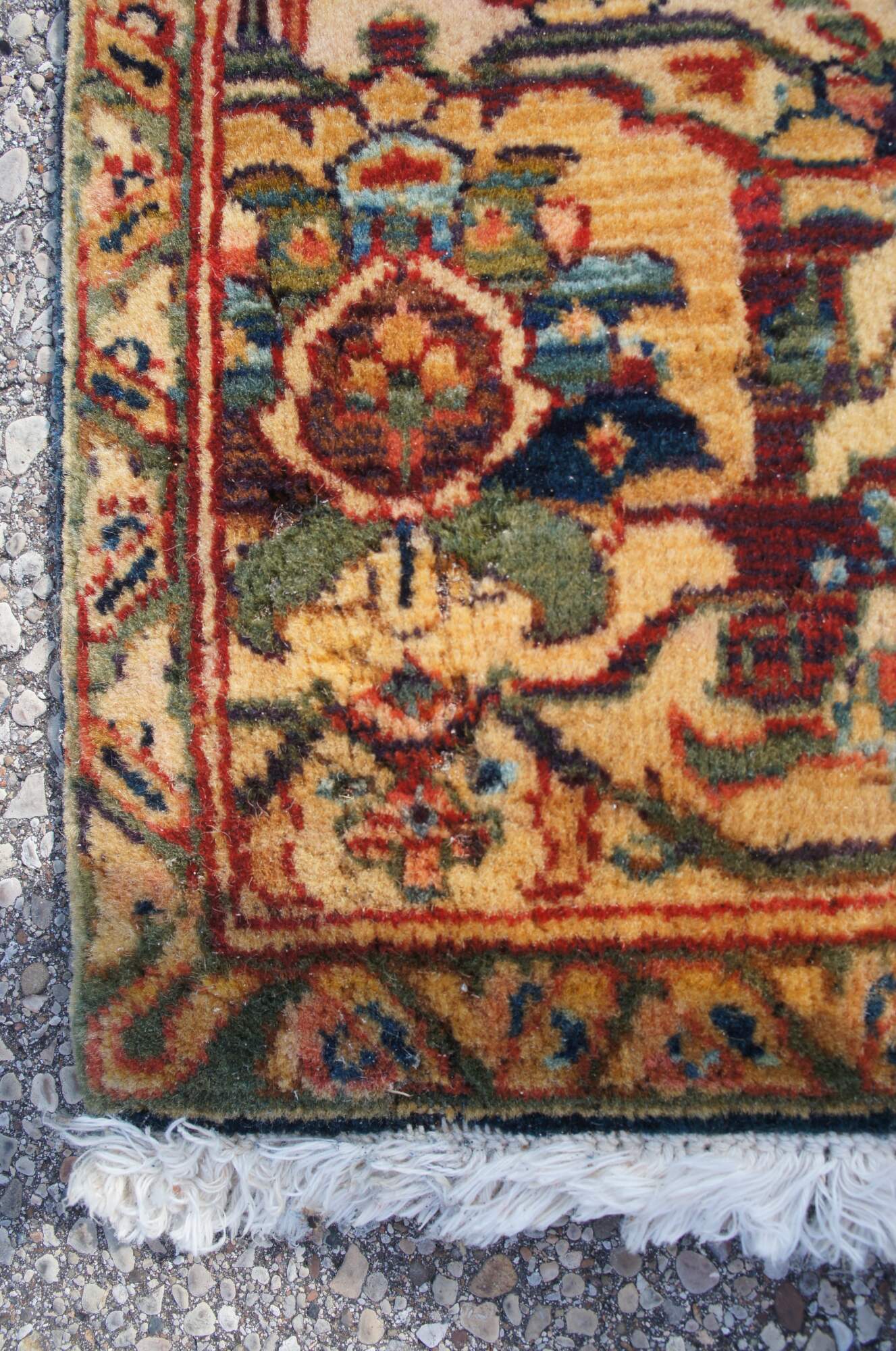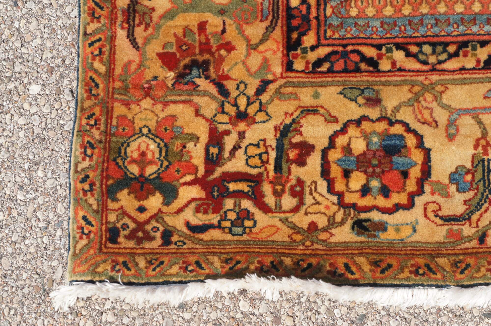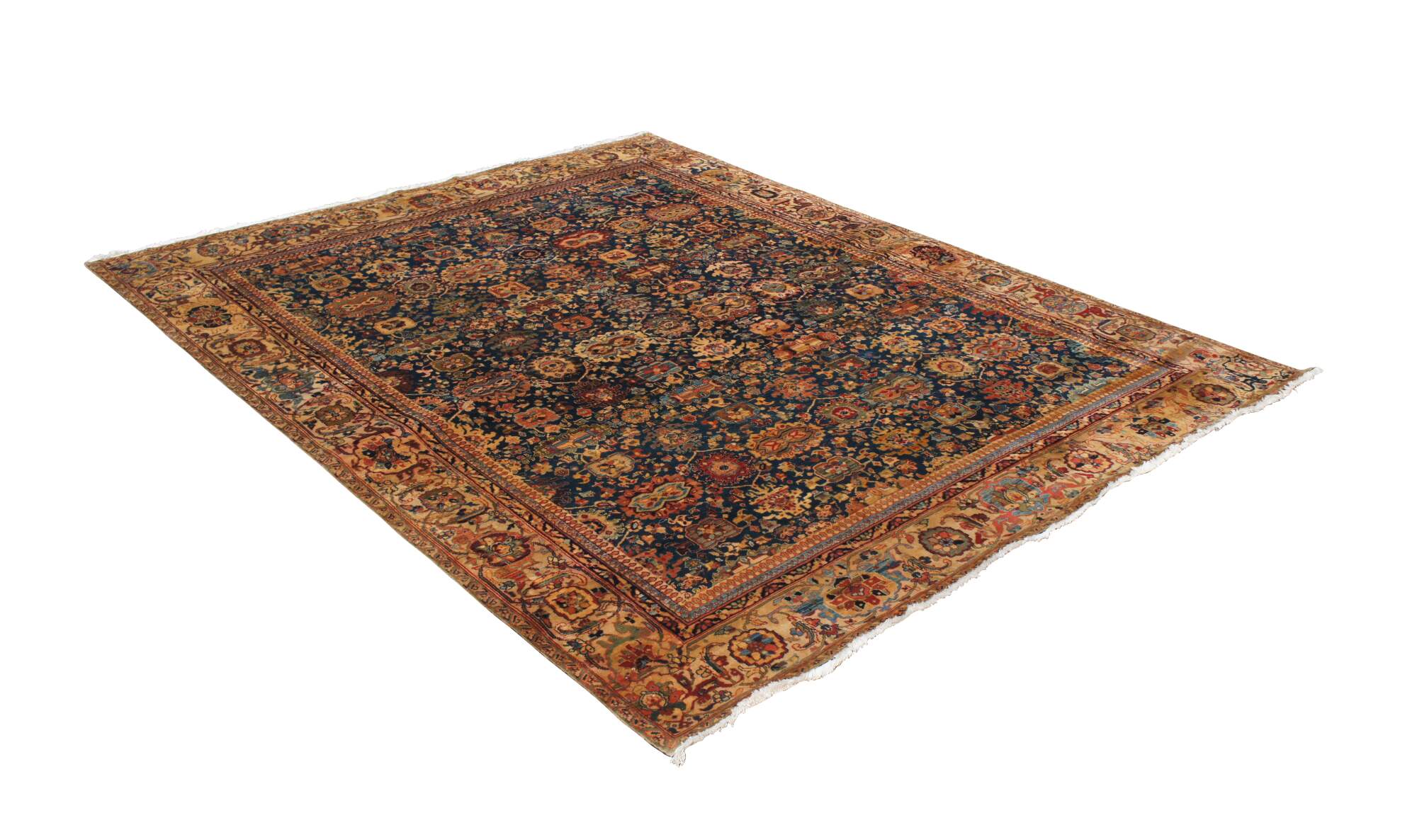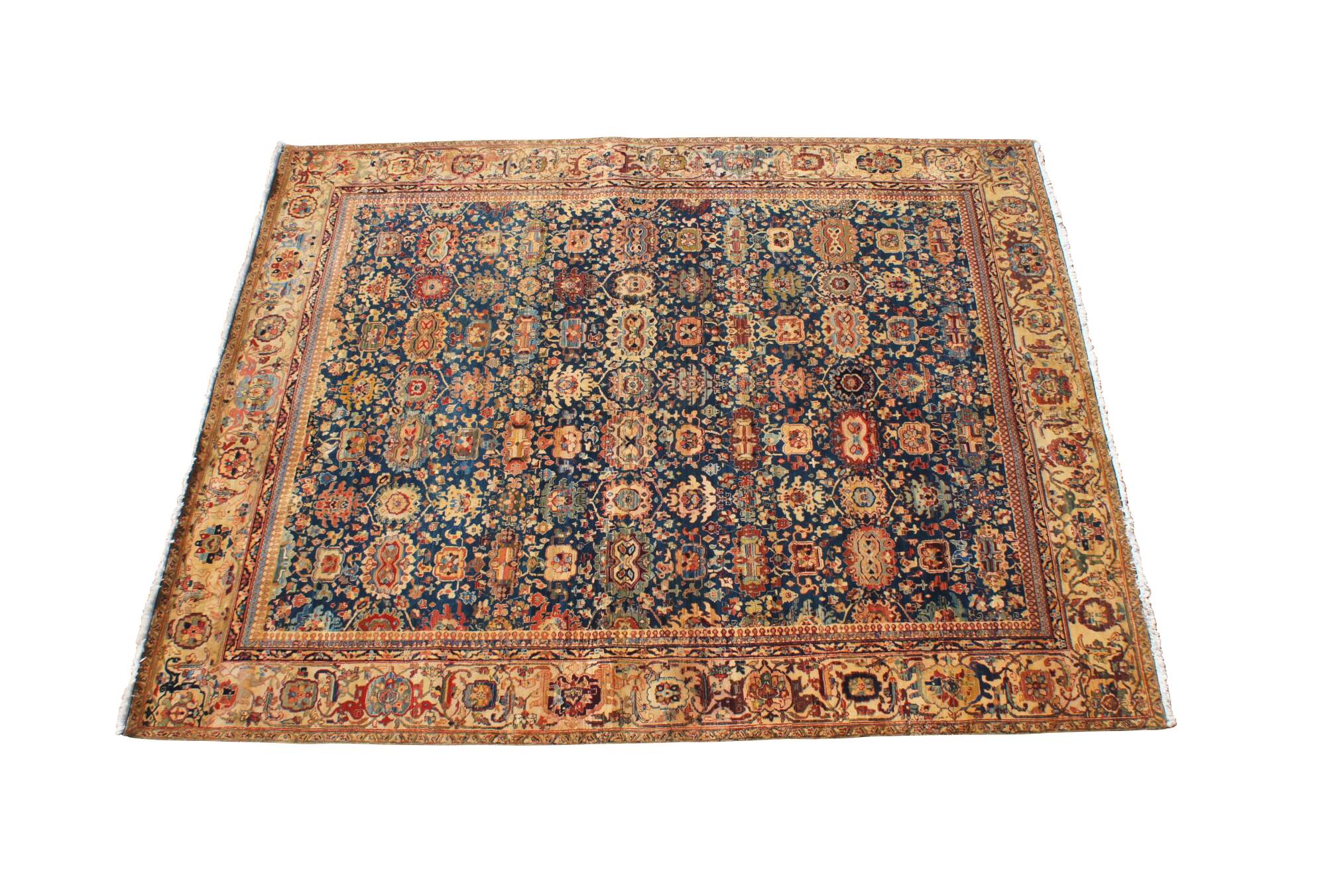 Genuine hand knotted oriental area rug. Features a colorful blue and gold geometric design. Hand woven from wool, 144kpsi