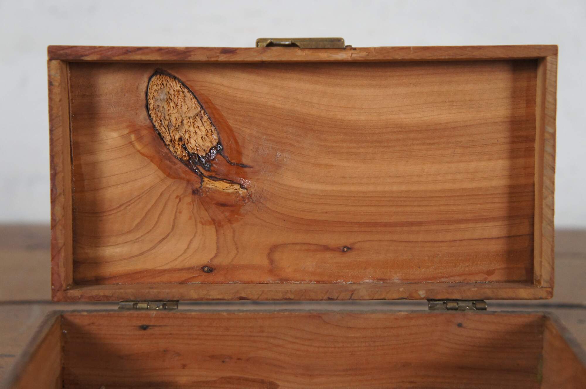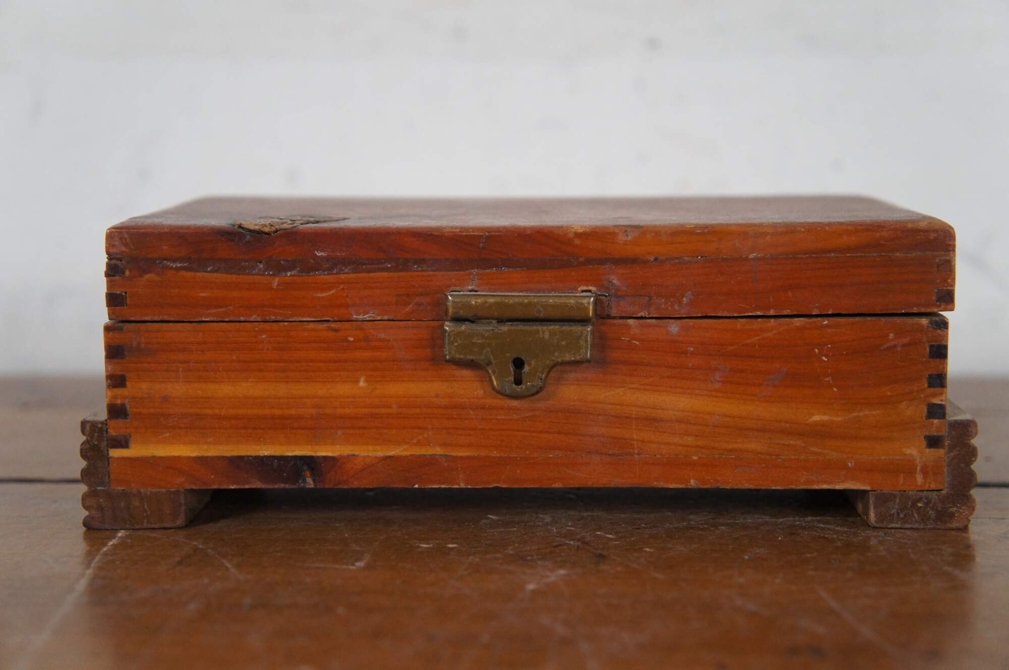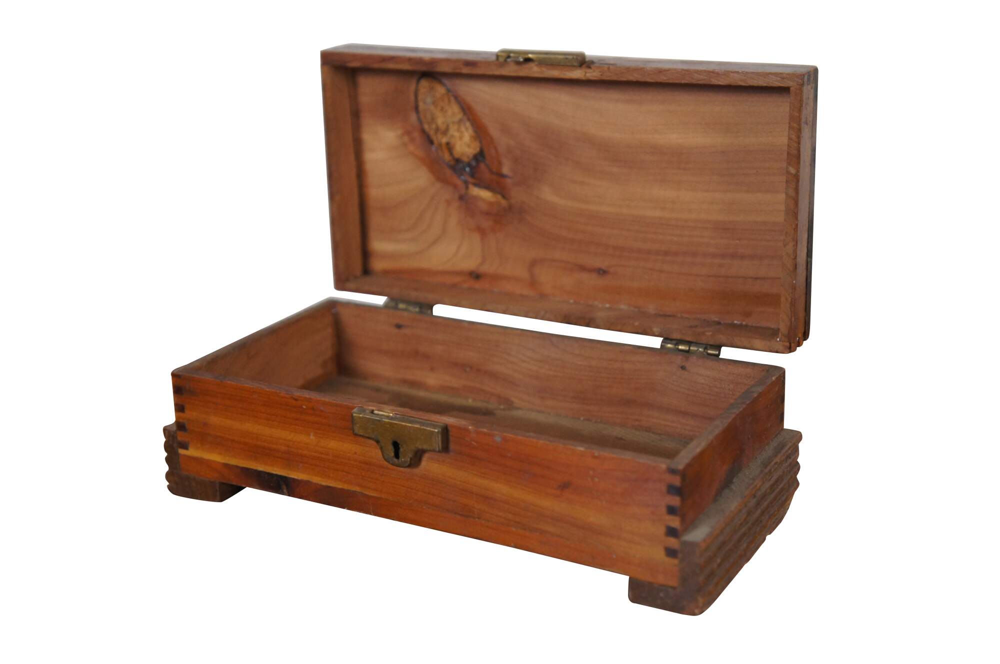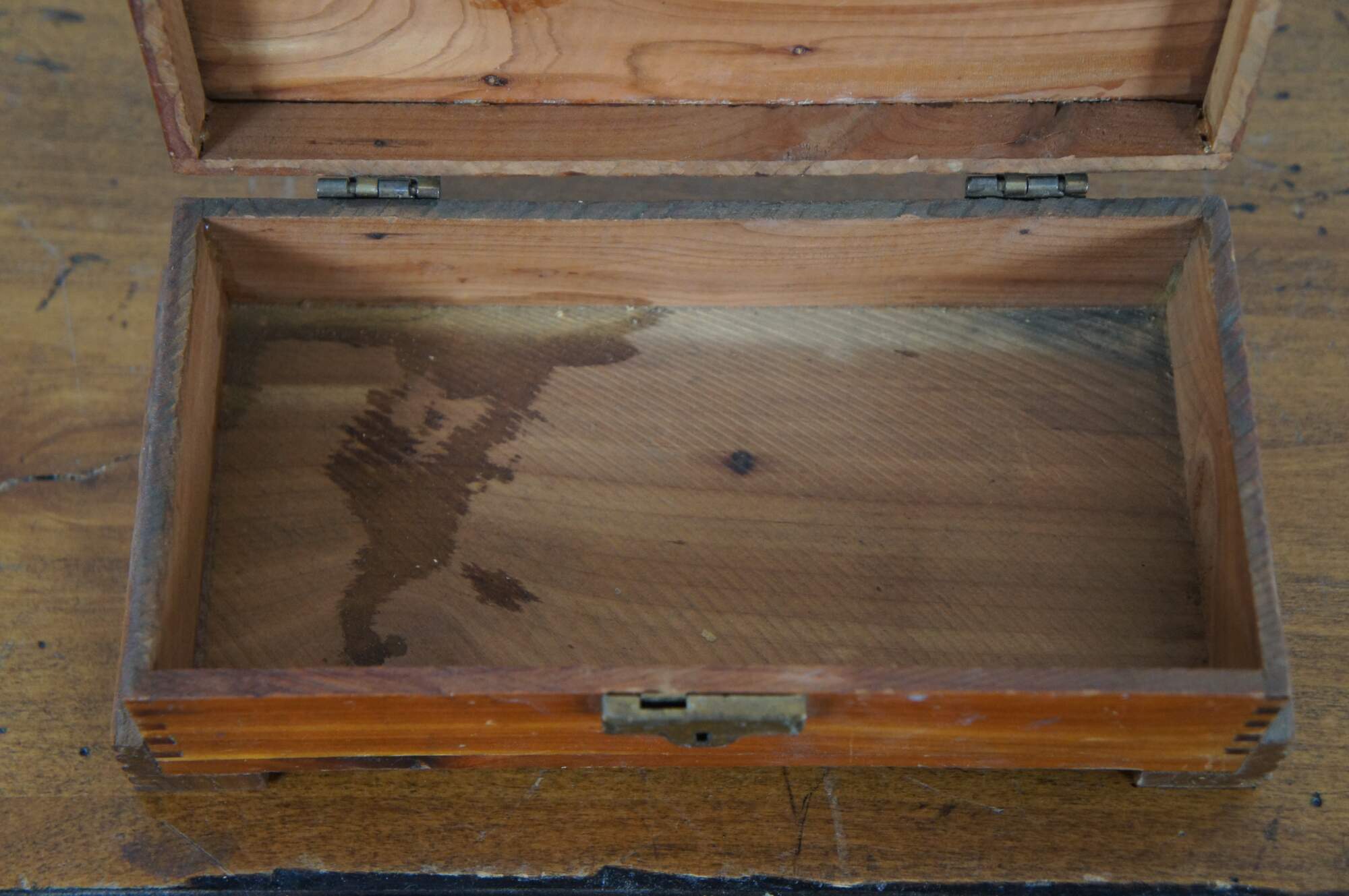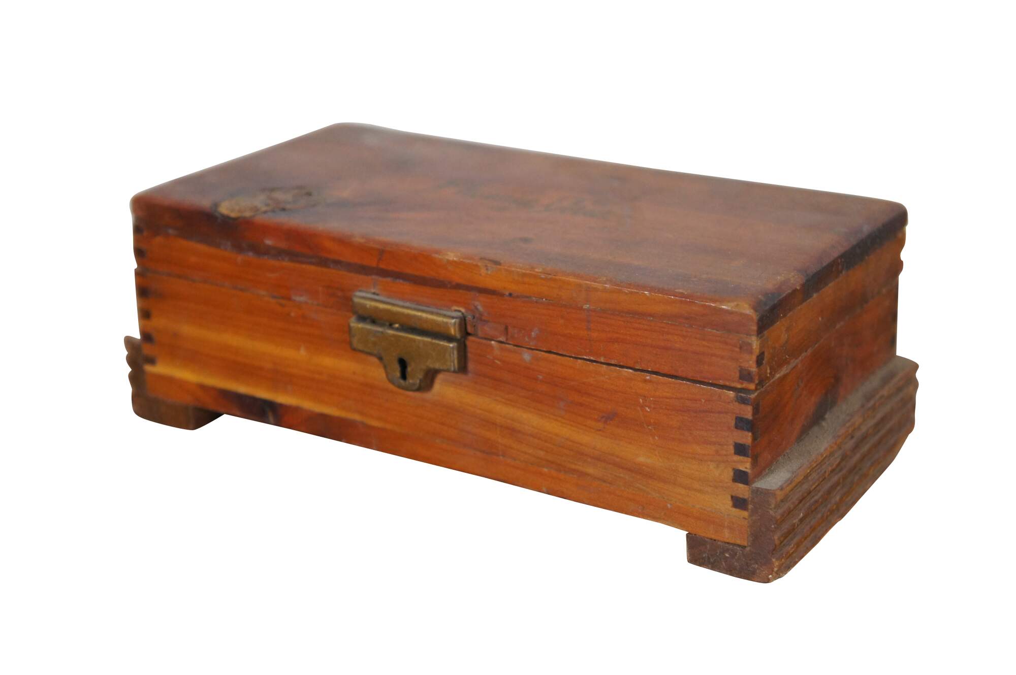 Vintage pine souvenir keepsake box featuring dovetailed joinery, footed base and brass hardware. Phoenix, Arizona.
