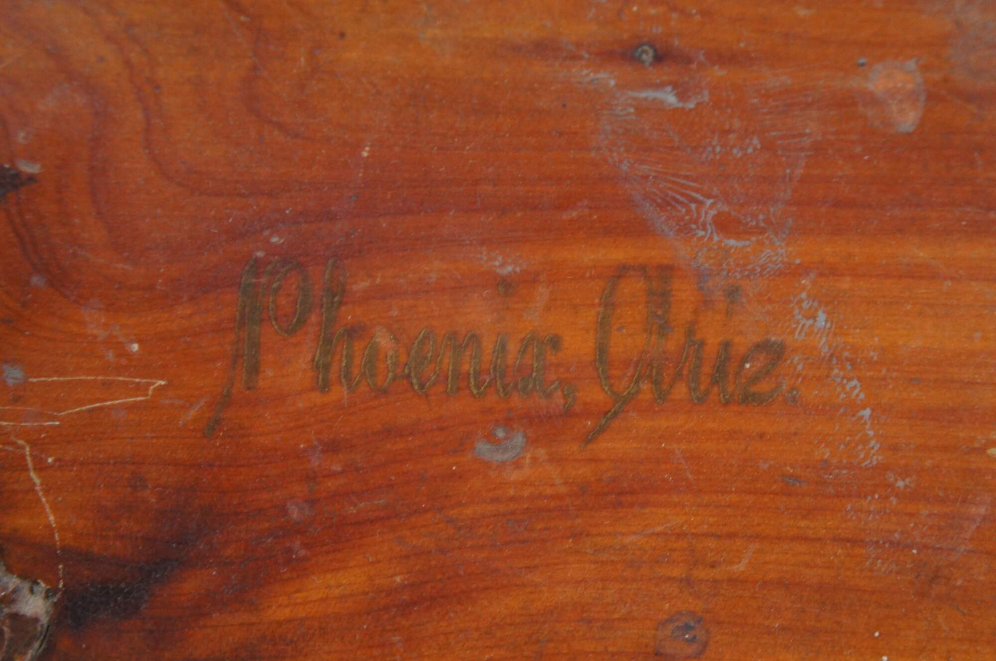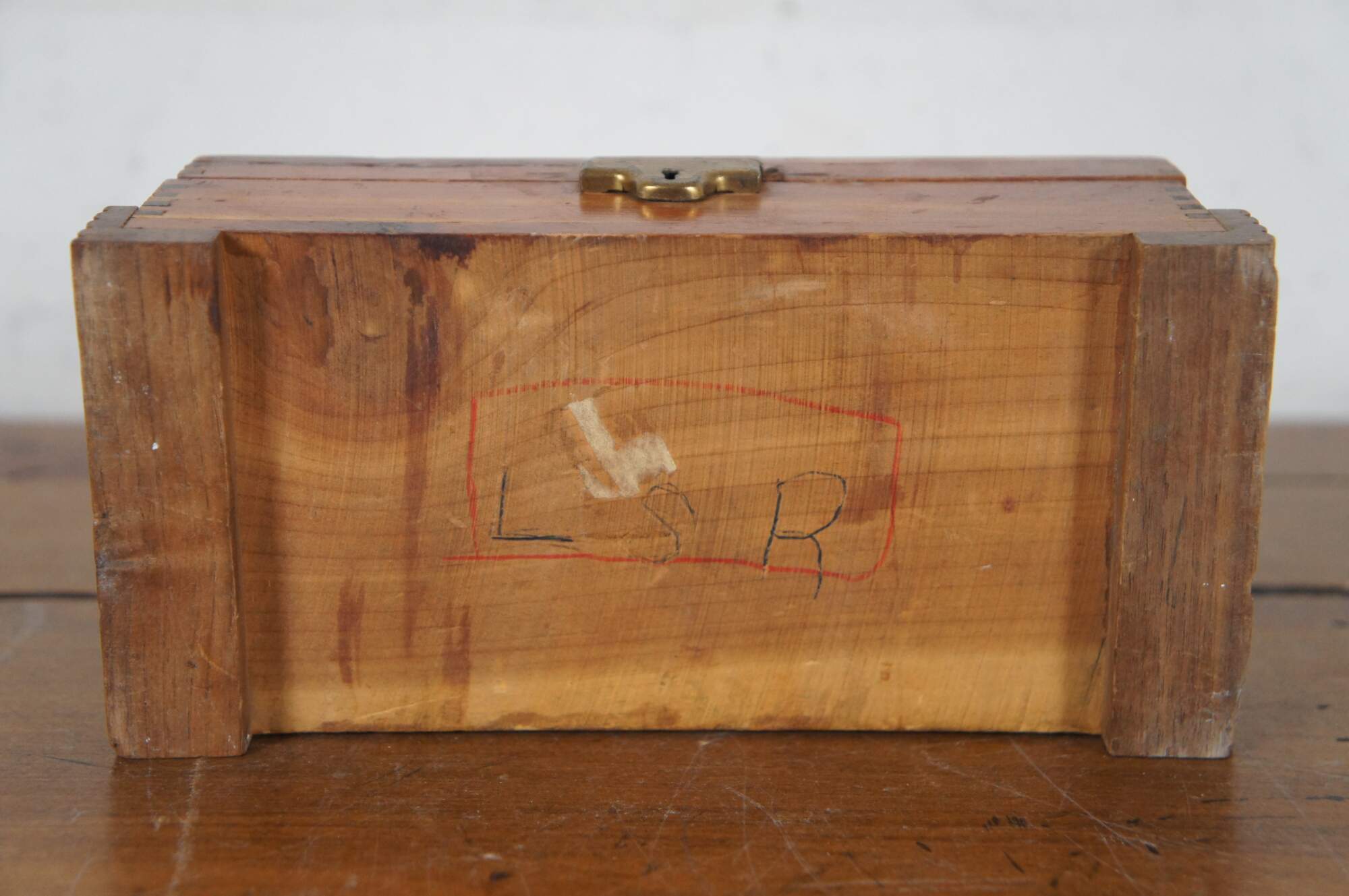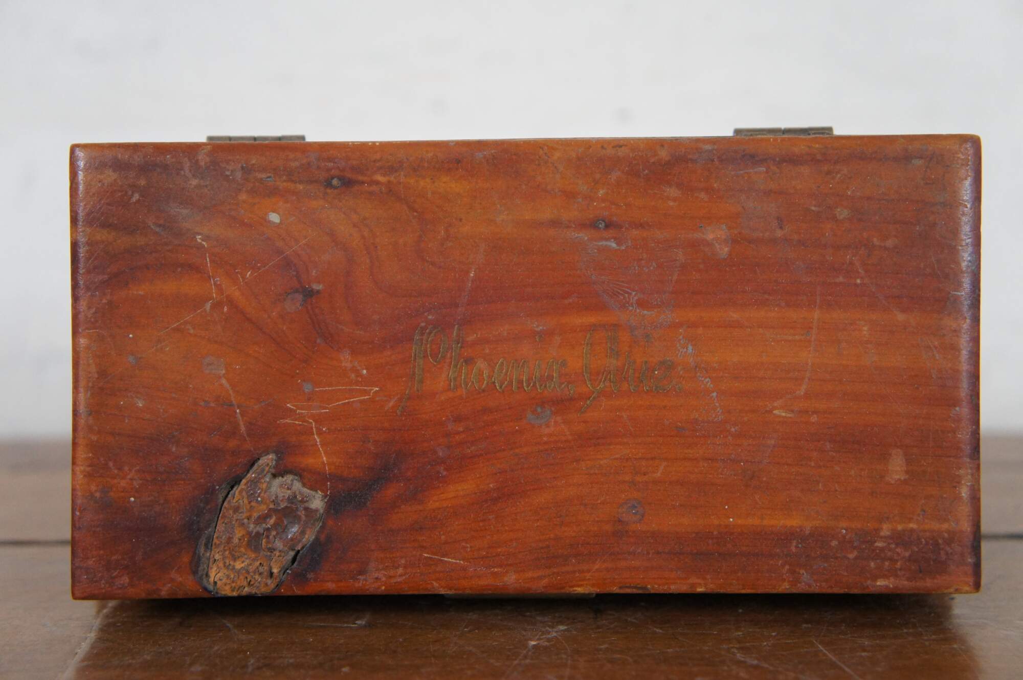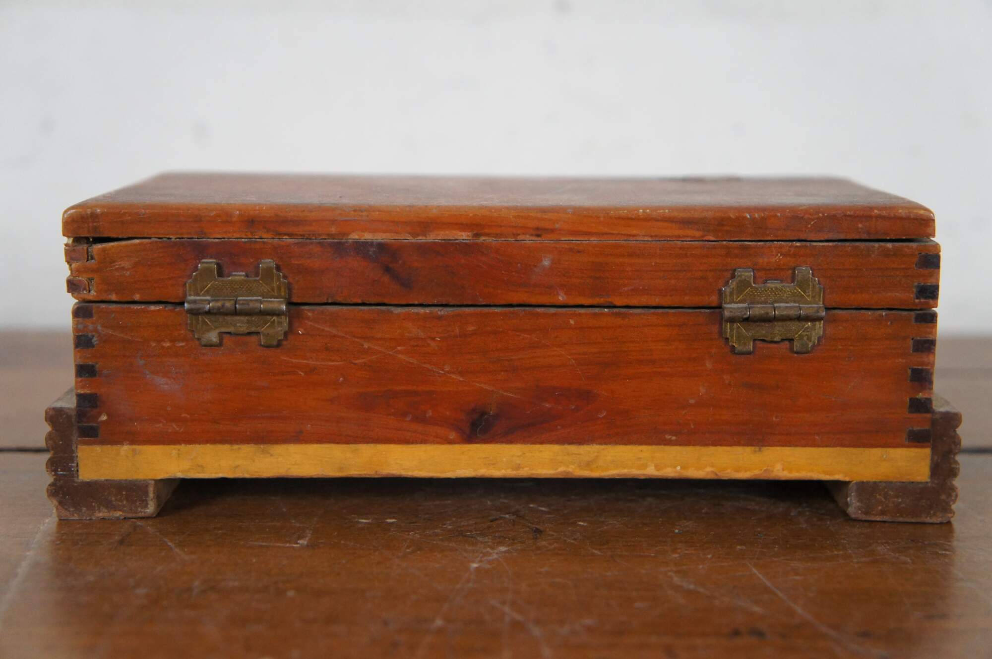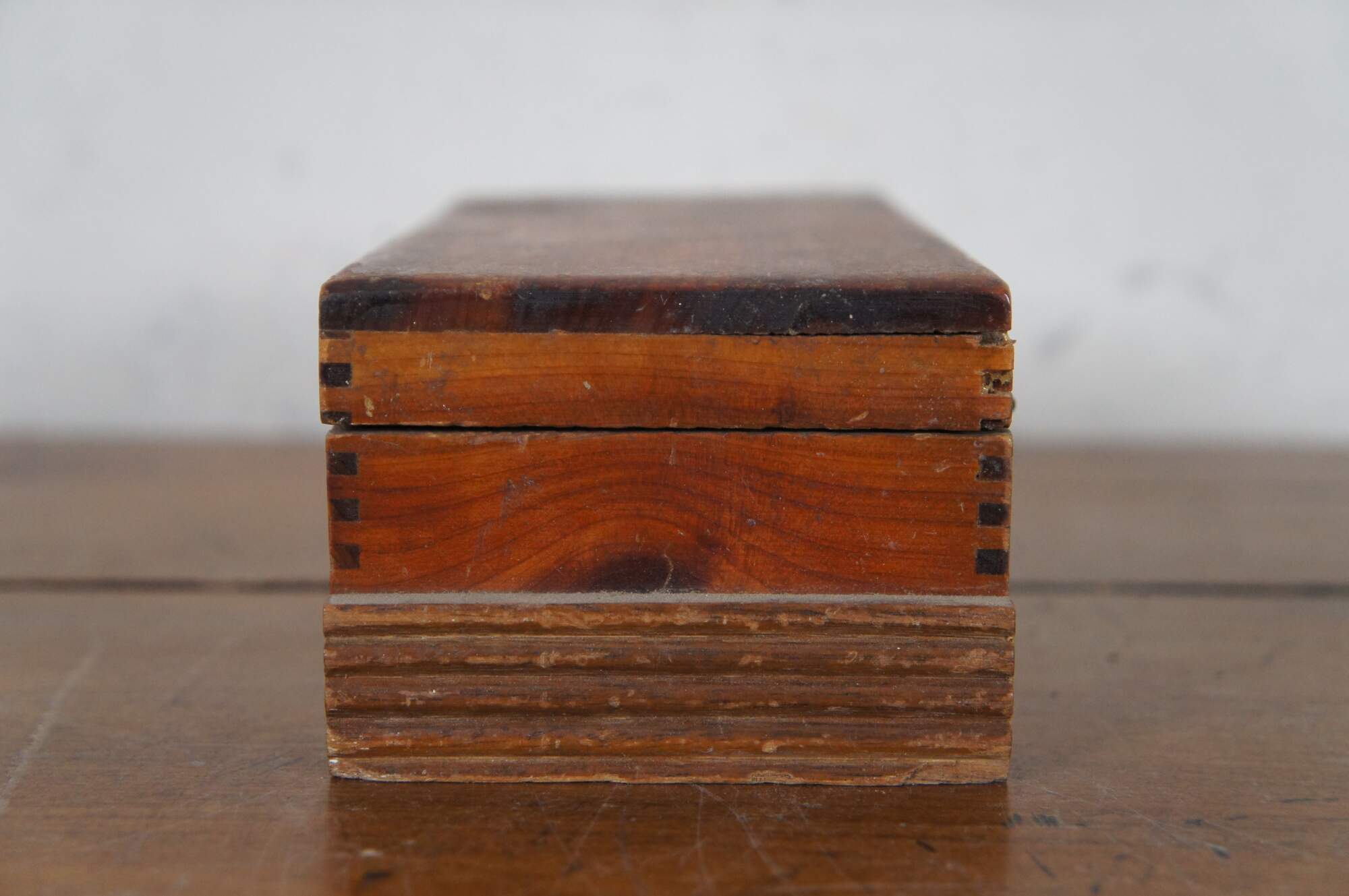 Vintage pine souvenir keepsake box featuring dovetailed joinery, footed base and brass hardware. Phoenix, Arizona.