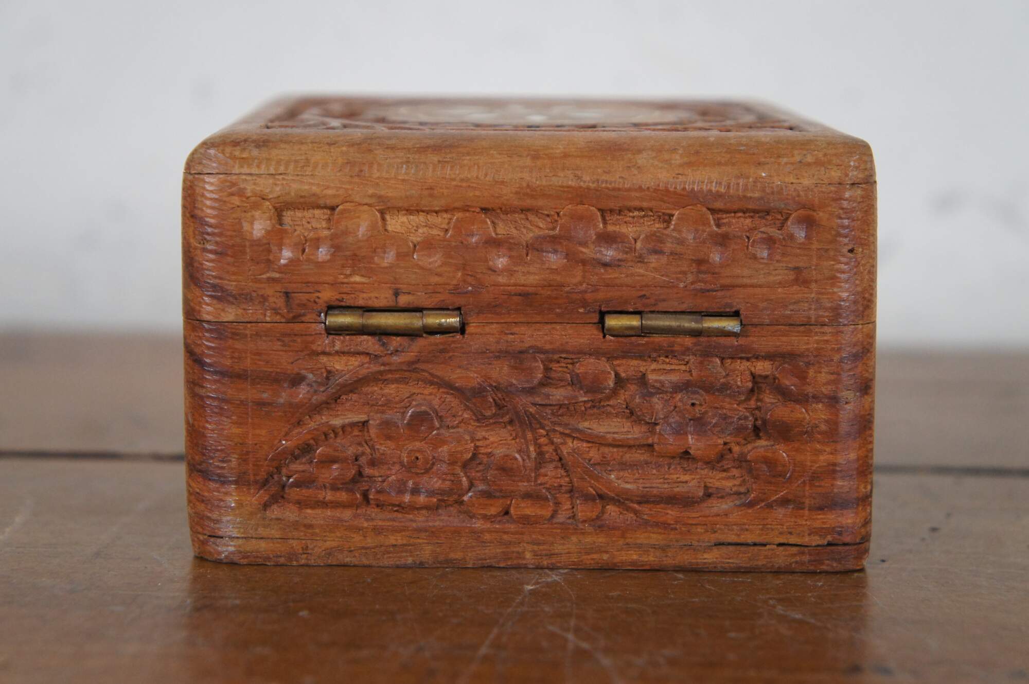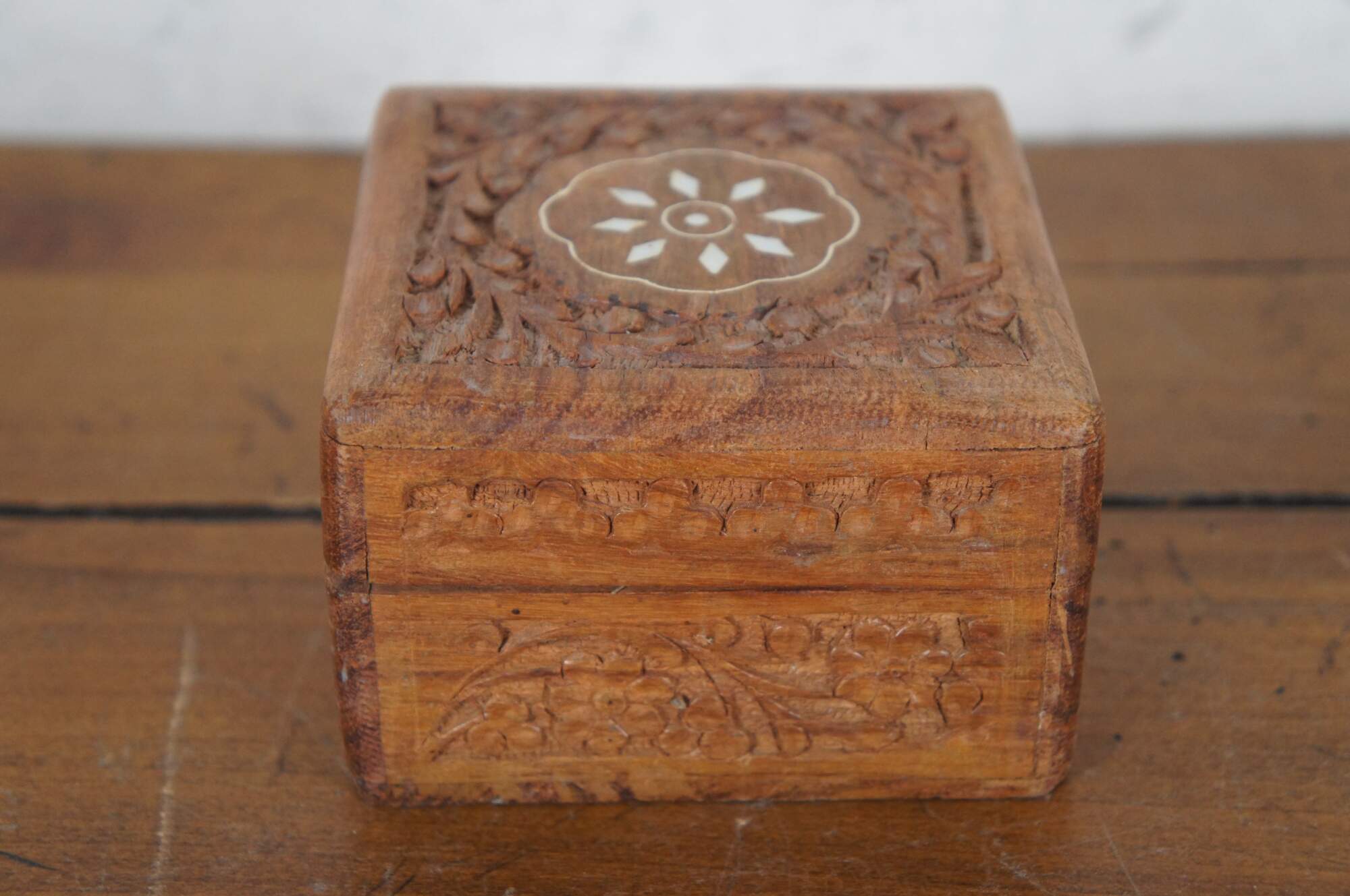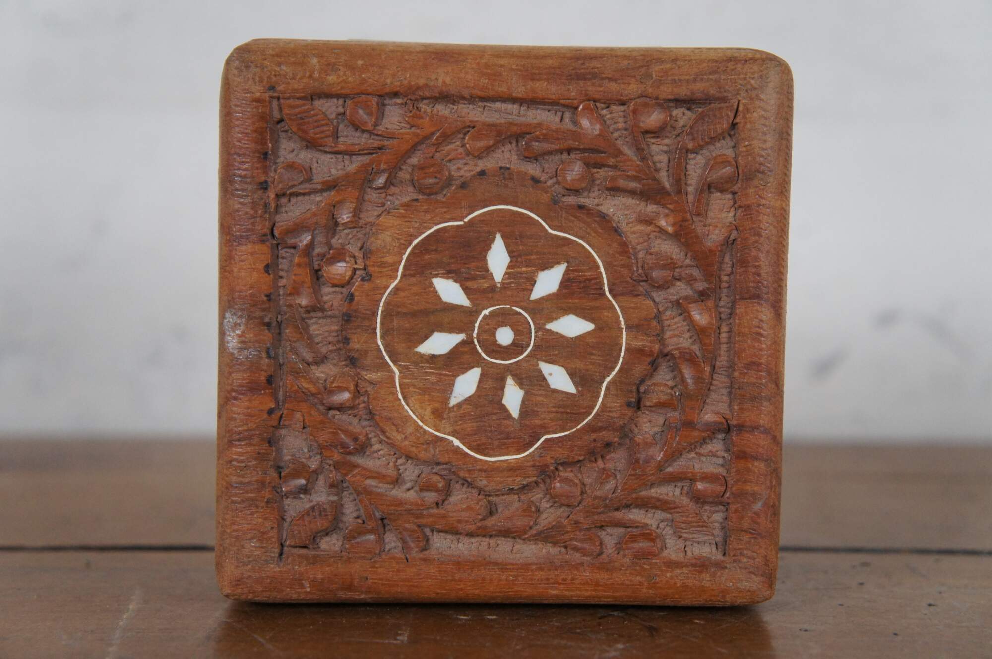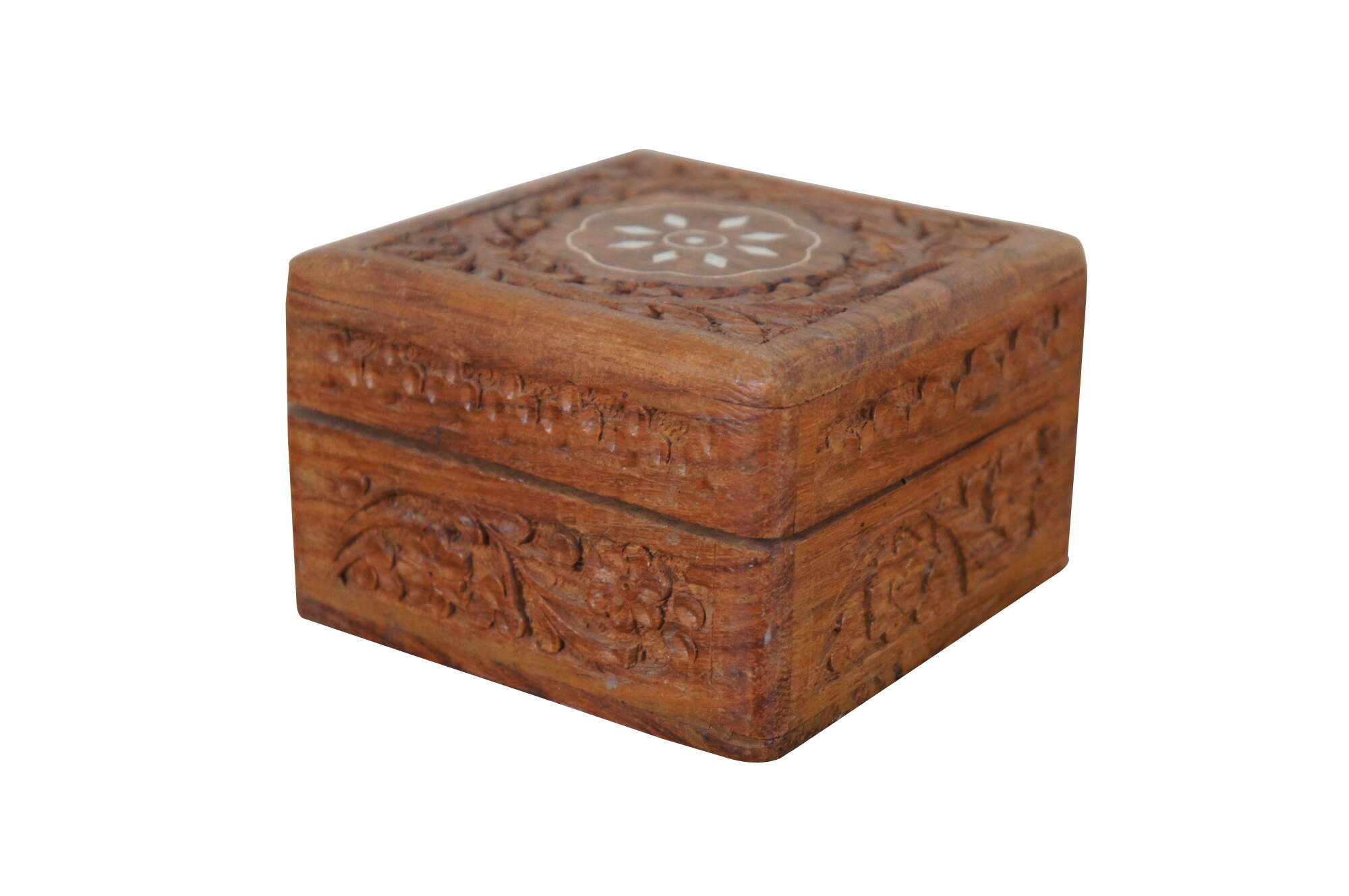 Vintage Sheesham wood / Indian Rosewood hinged jewelry / keepsake / trinket box featuring square form with carved floral and inlaid accents.