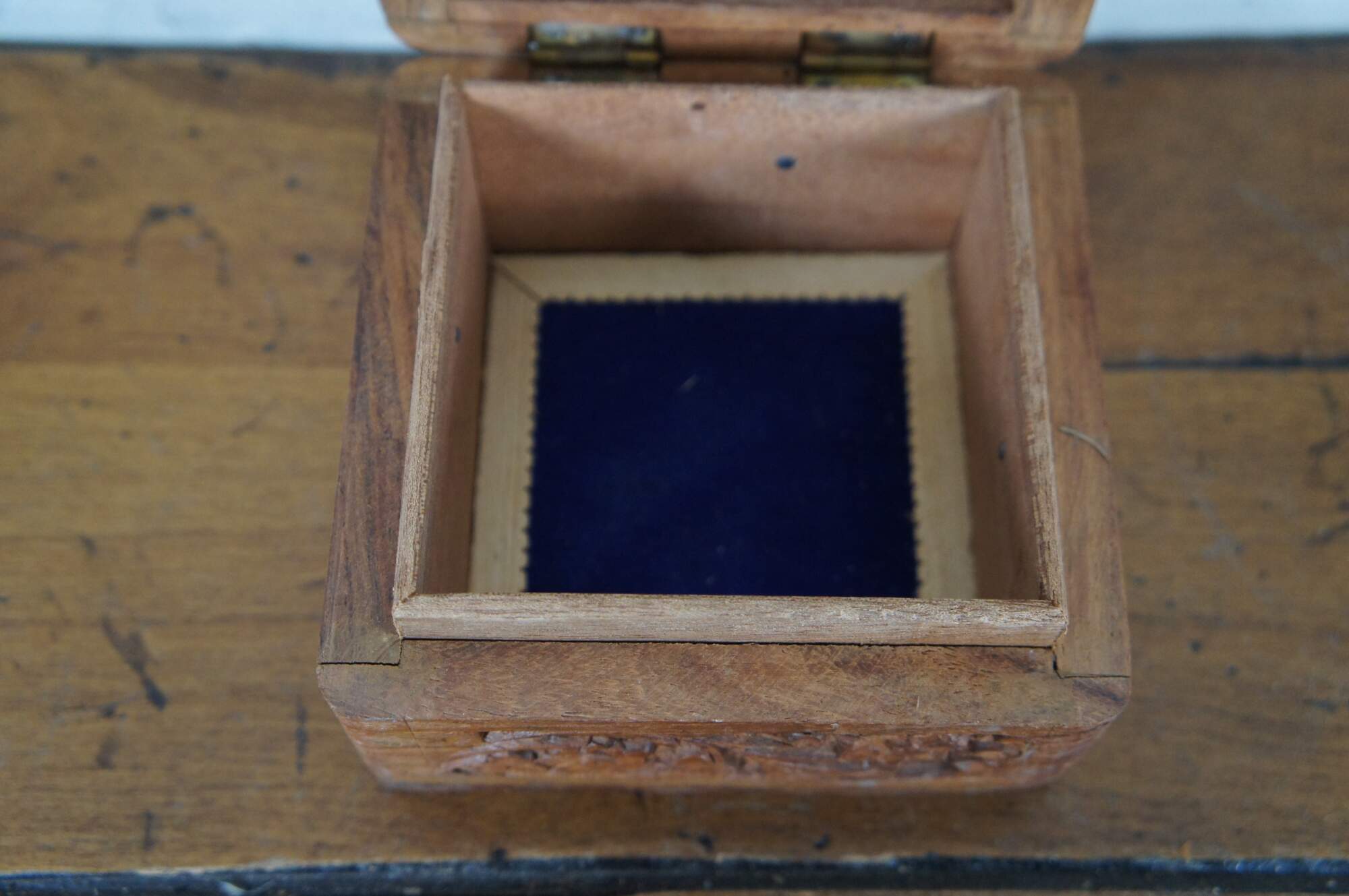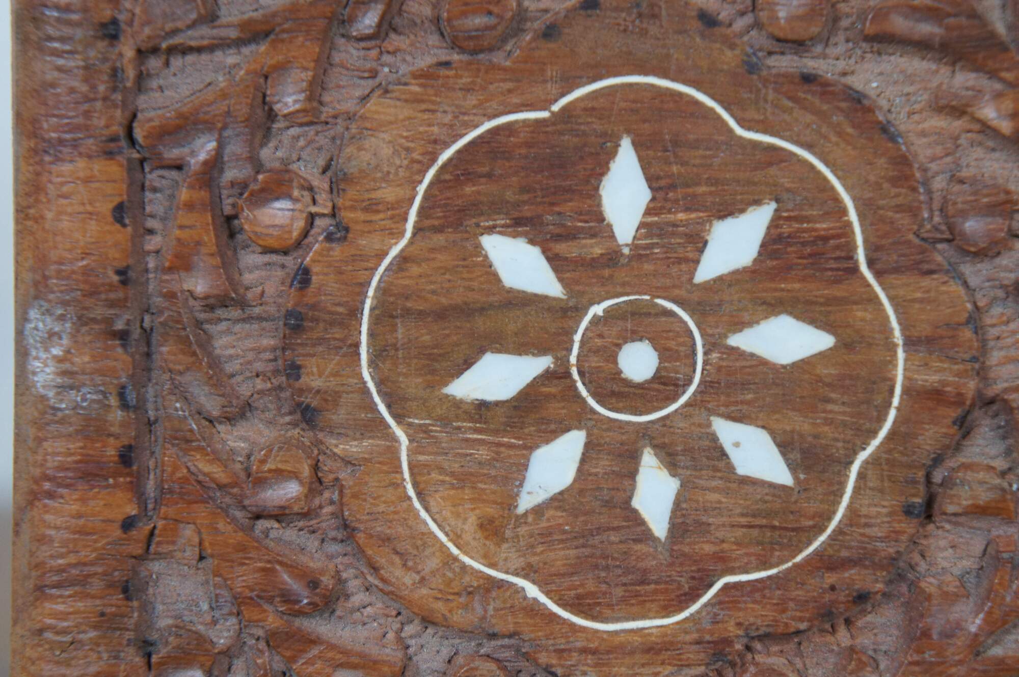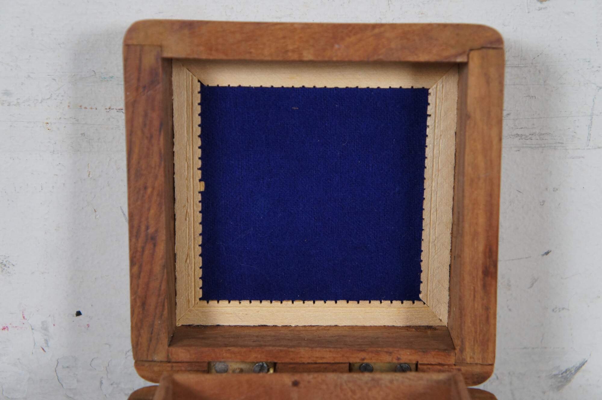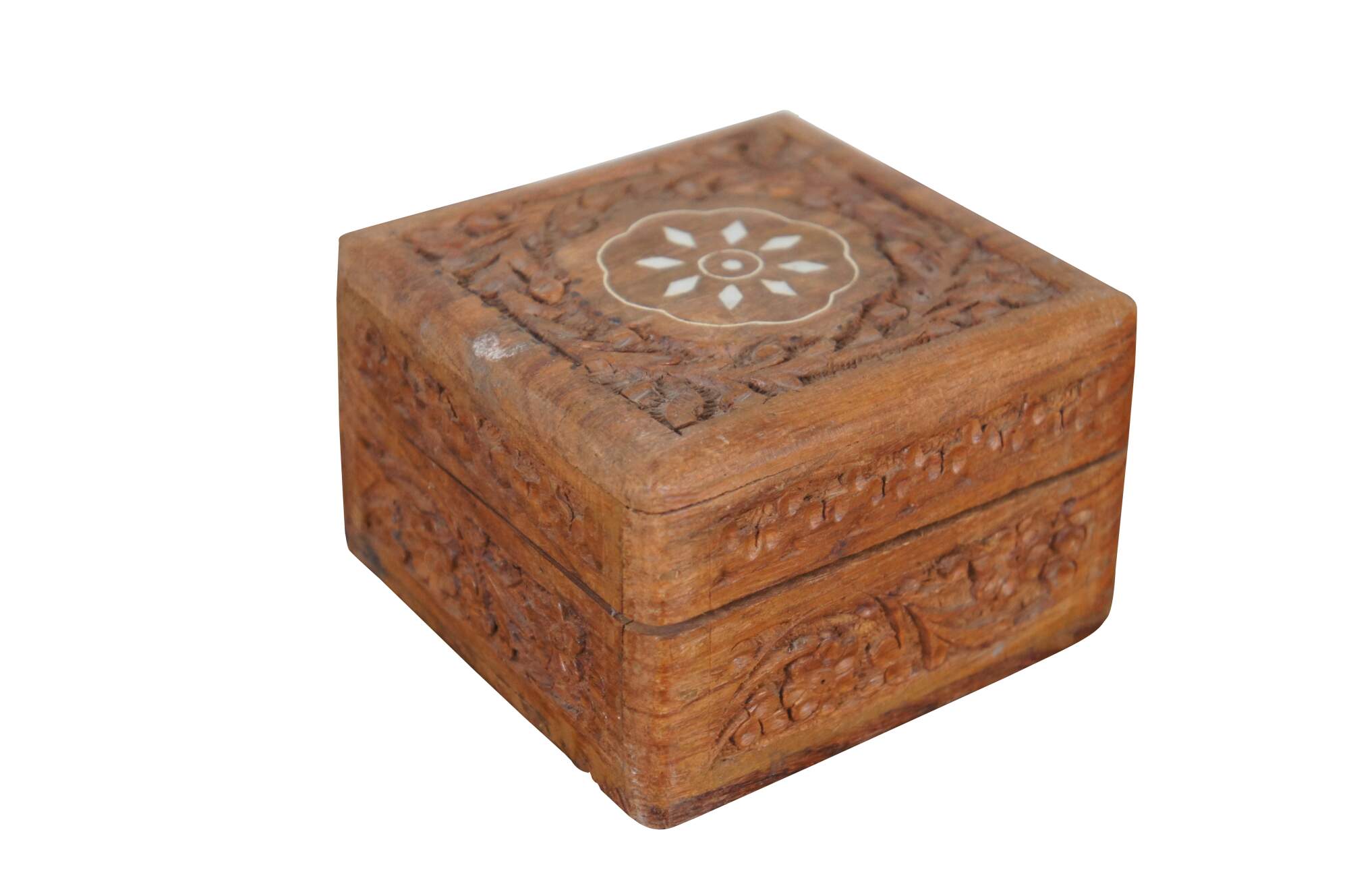 Vintage Sheesham wood / Indian Rosewood hinged jewelry / keepsake / trinket box featuring square form with carved floral and inlaid accents.