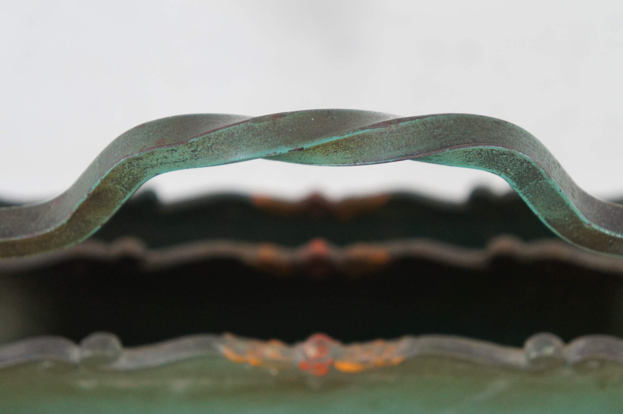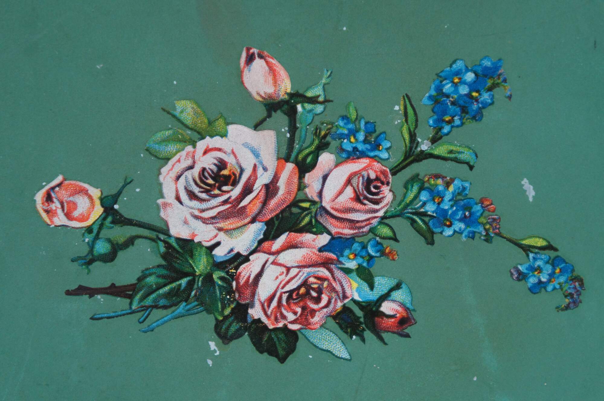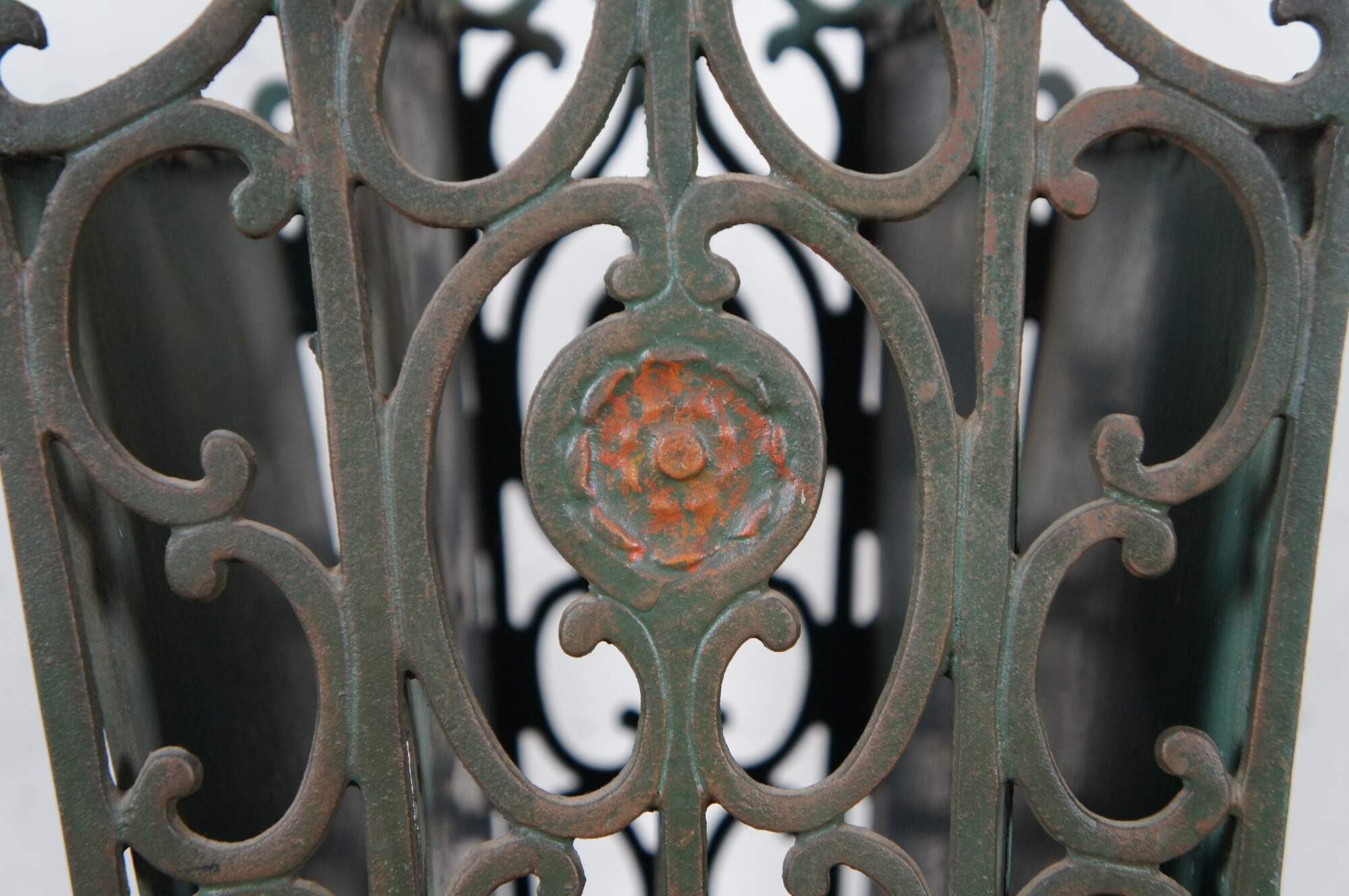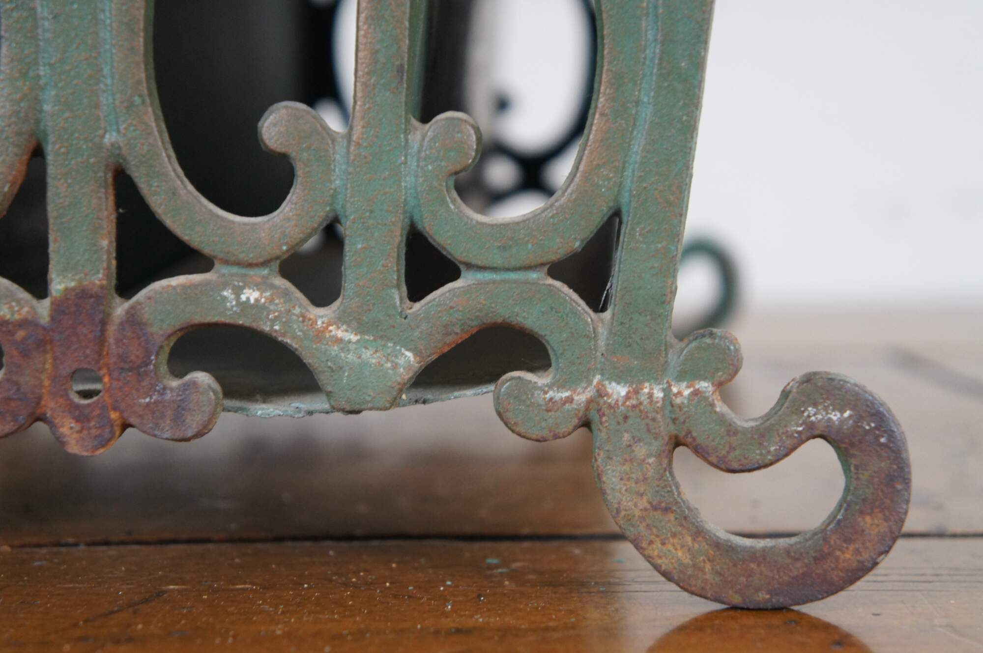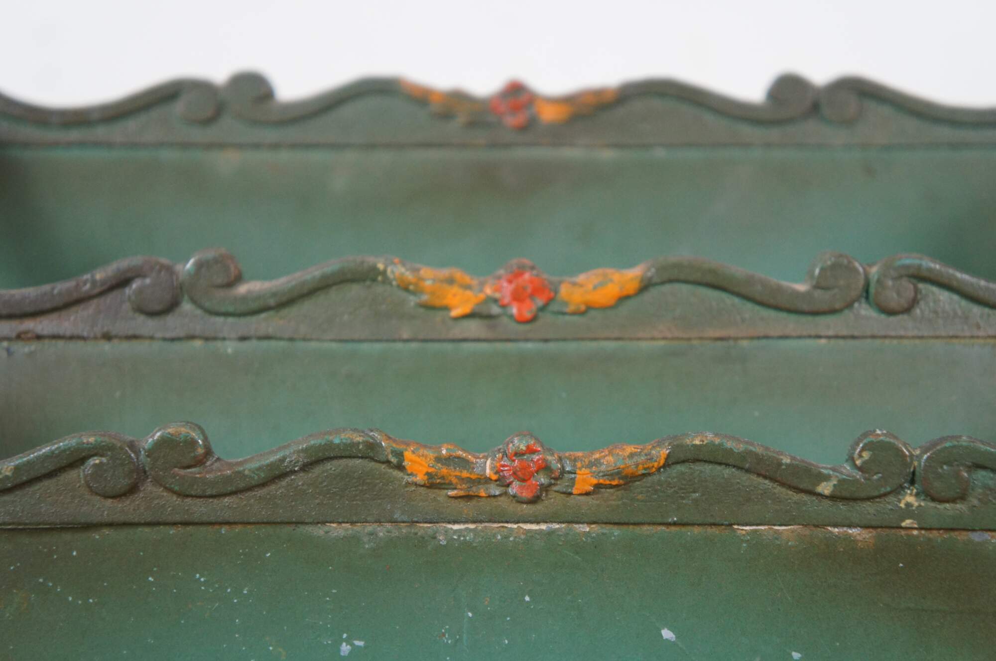 Antique Victorian wrought iron tole magazine / newspaper / music / document / letter holder or rack featuring reticulated serpentine form with green painted tole and floral rose litho design.
