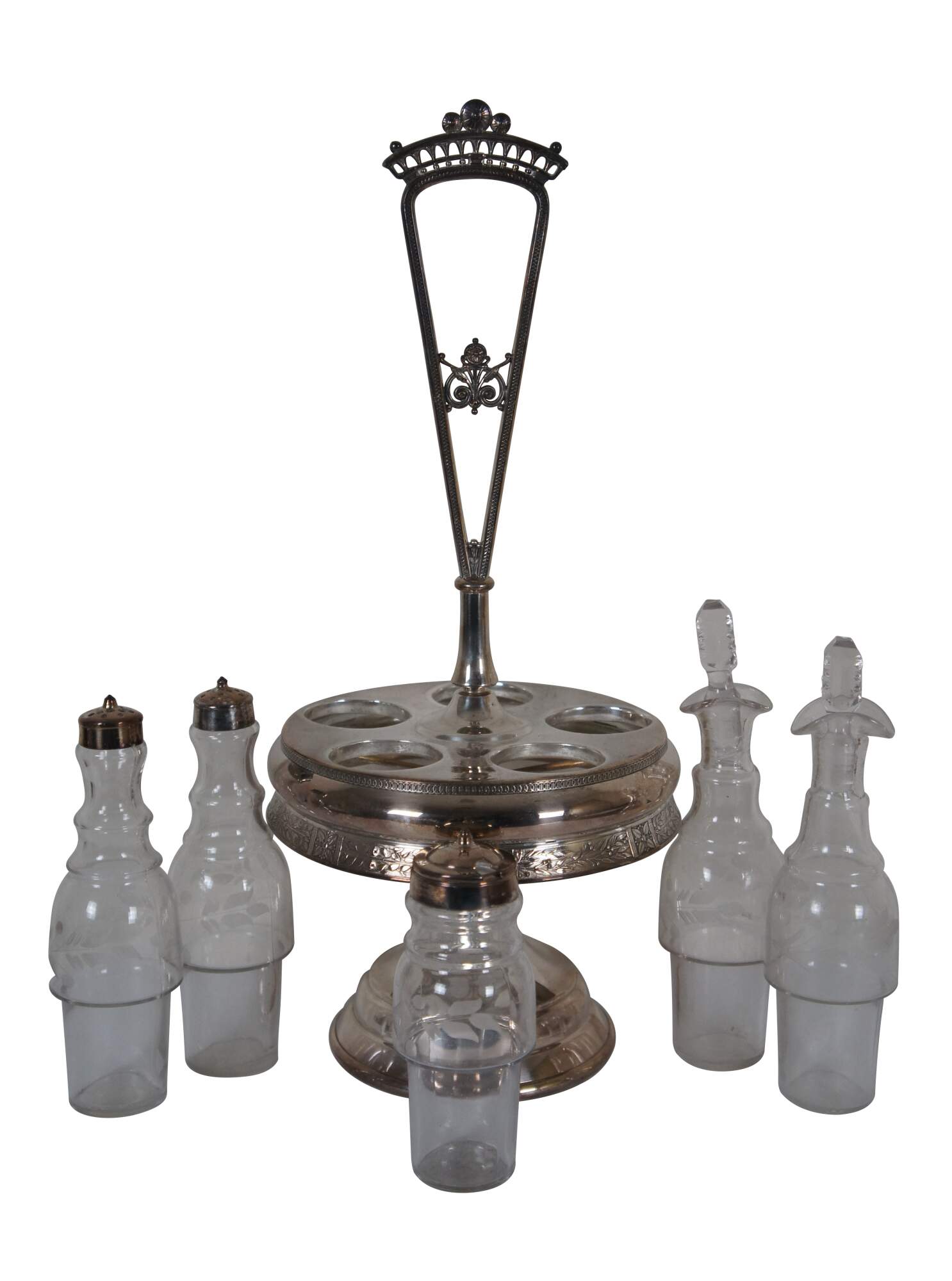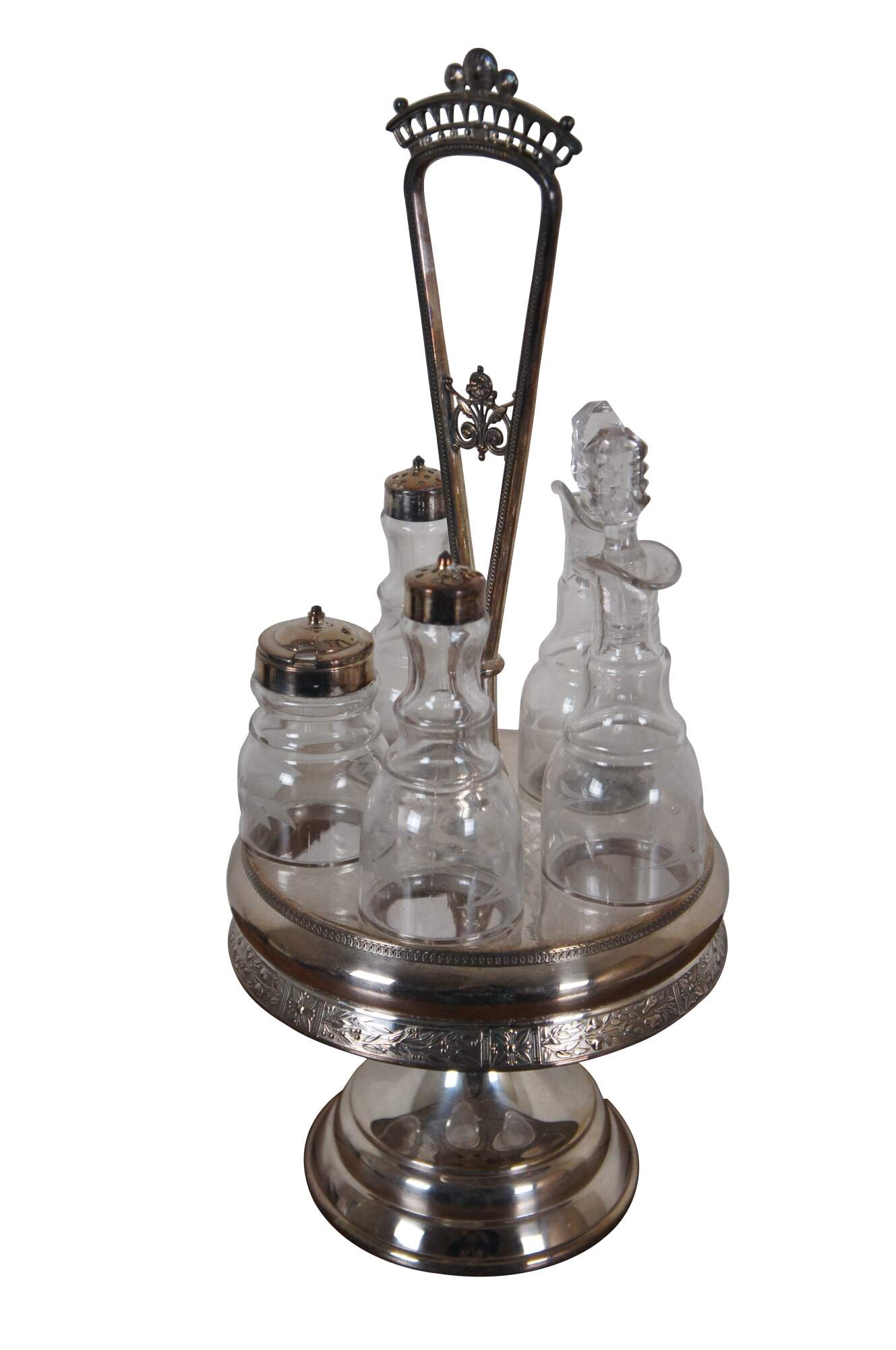Antique Victorian Reed & Barton cruet condiment set featuring pressed and etched glass bottles with ornate footed silverplate caddy