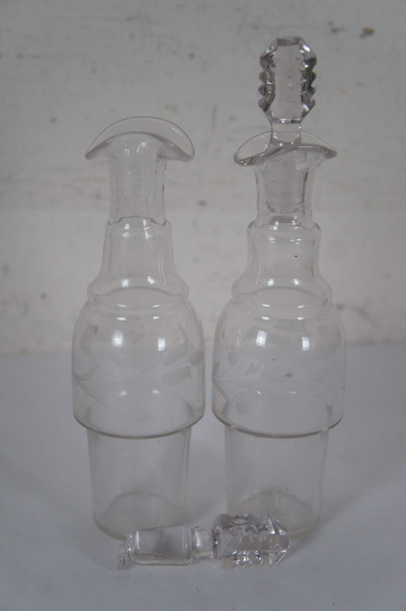 Good Overall - Gentle wear/tarnish; some chipping to top edge of bottles,base of stoppers; no jam spoon