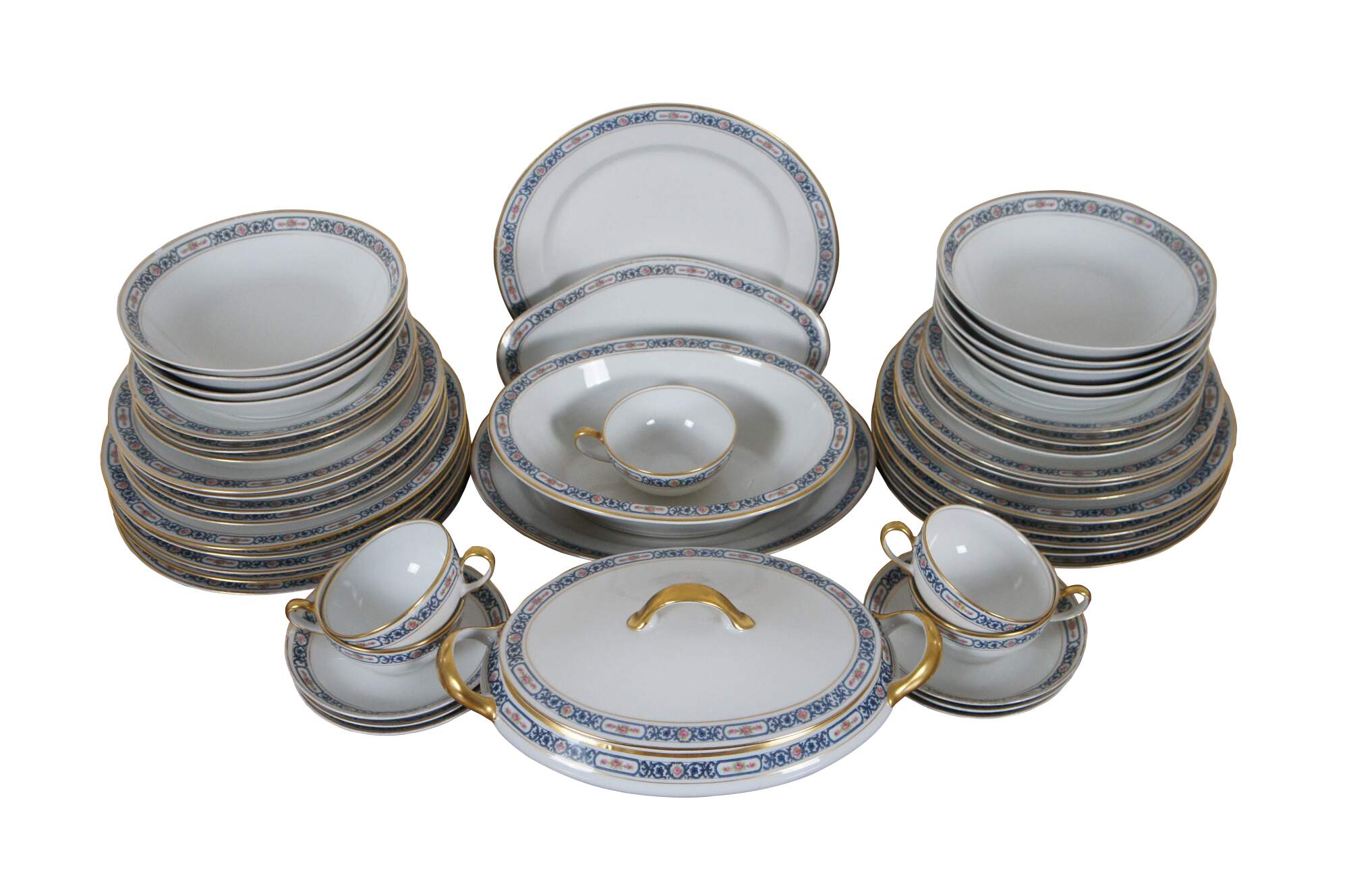 Exquisite antique 48 piece set of French La Porcelain Limousine Limoges porcelain dinnerware. Features a band of weaving blue flowering vines framing pink roses, with gilded gold trim.