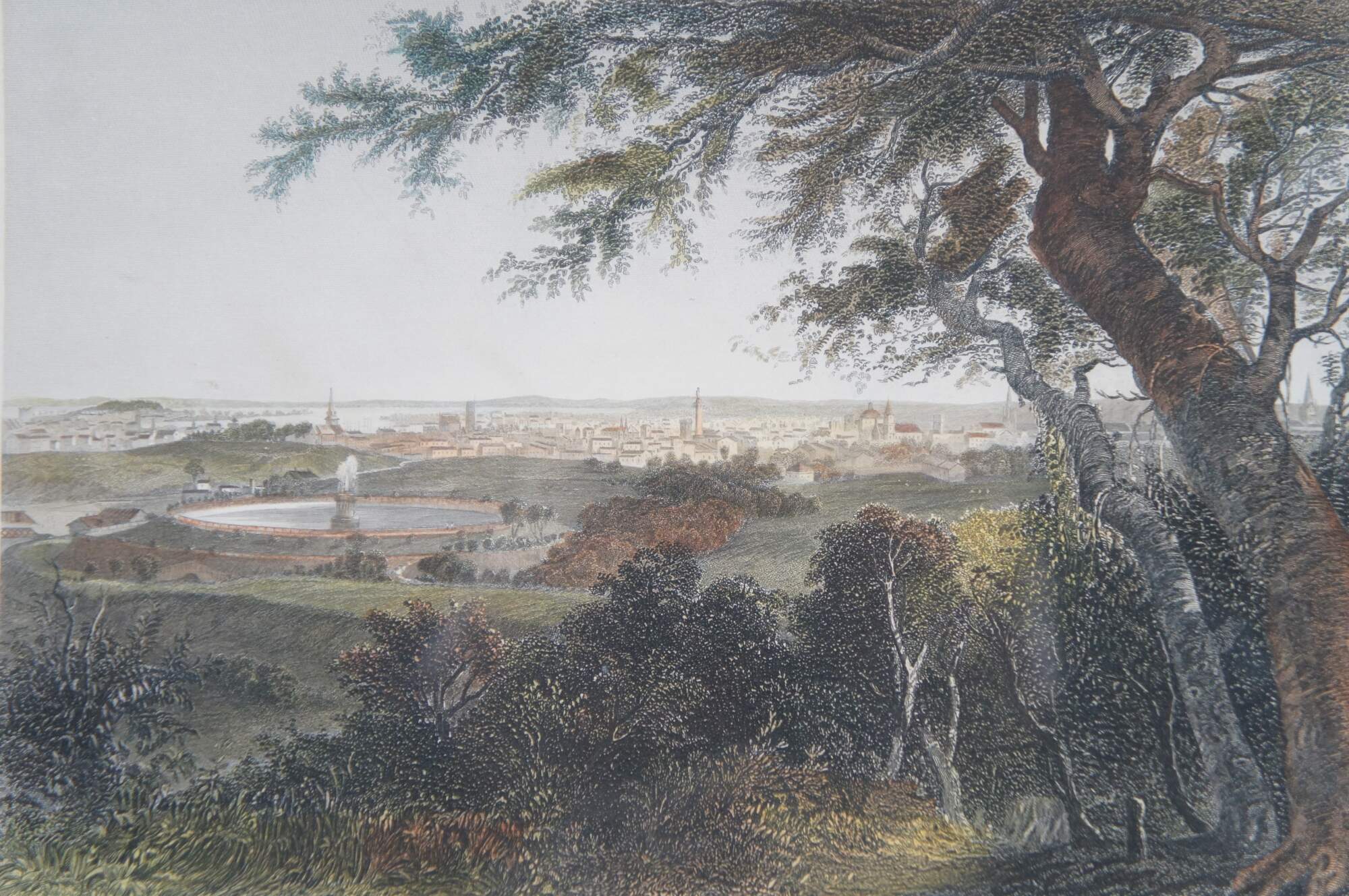 Antique framed 19th century hand colored engraving of the City of Baltimore (a view from Druid Hill Park) – G. Perkins / R. Hinshelwood / Entered according to Act of Congress A.D.1873 by D. Appleton & Co in the Office of the Librarian of Congress Washington.