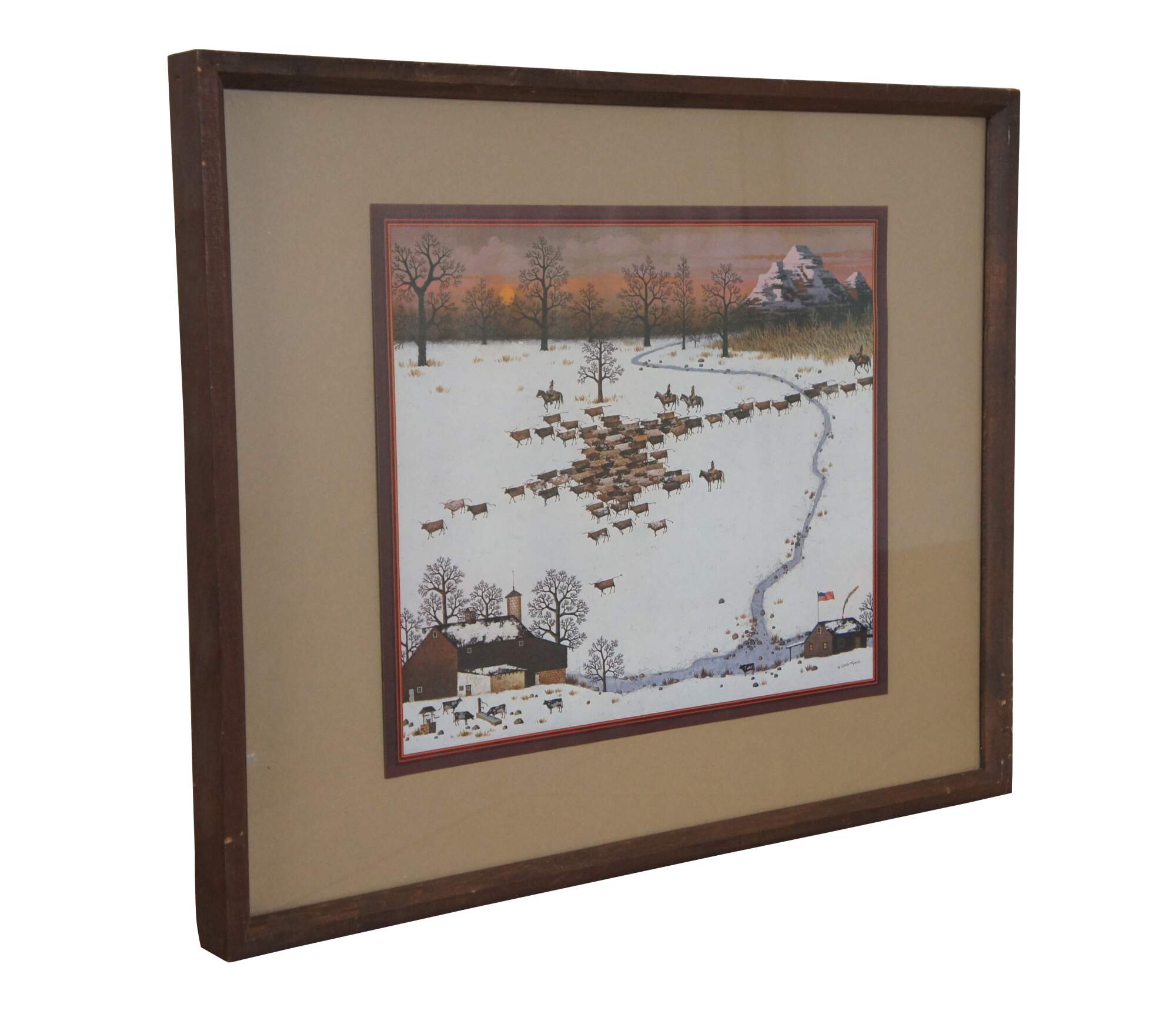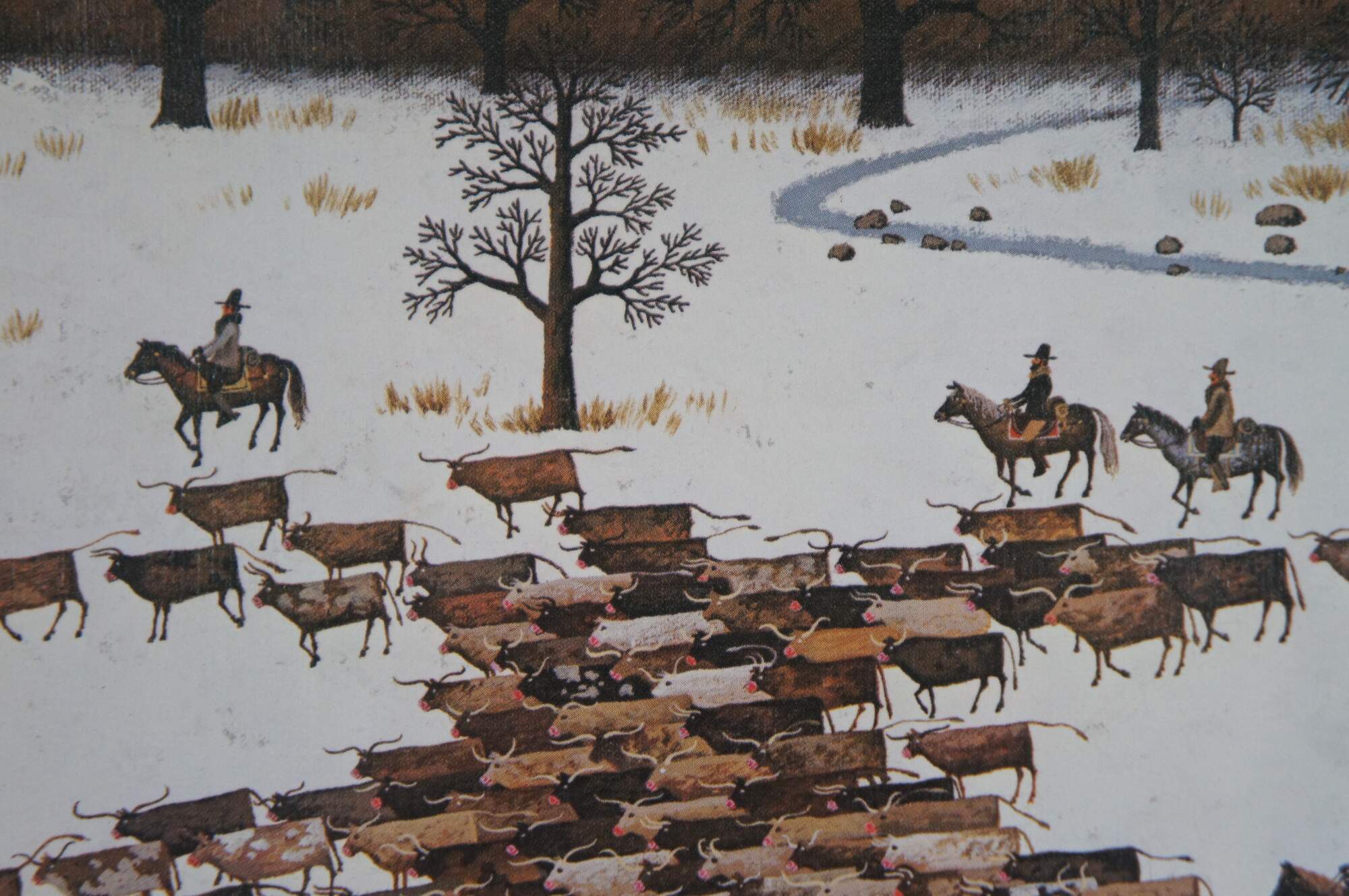 Vintage framed print of cowboys doing a cattle drive on a farmhouse ranch by Charles Wysocki.