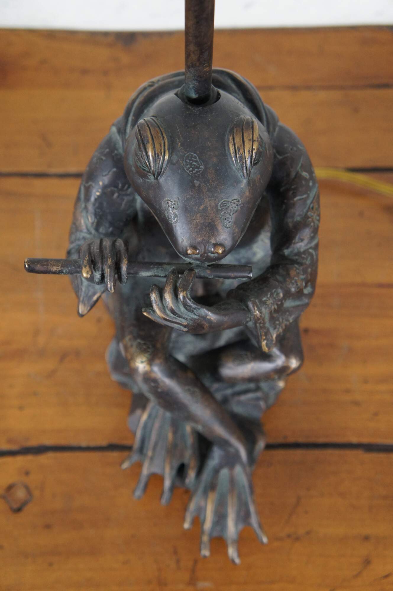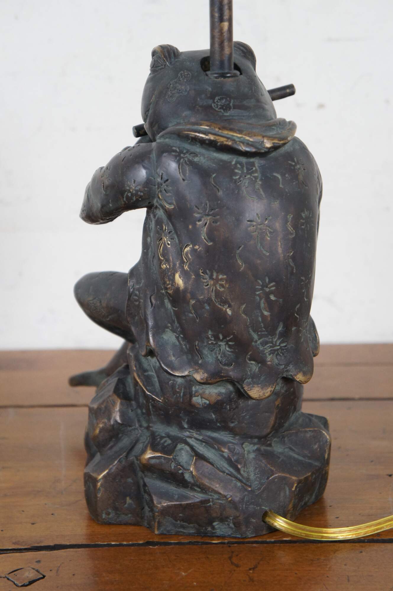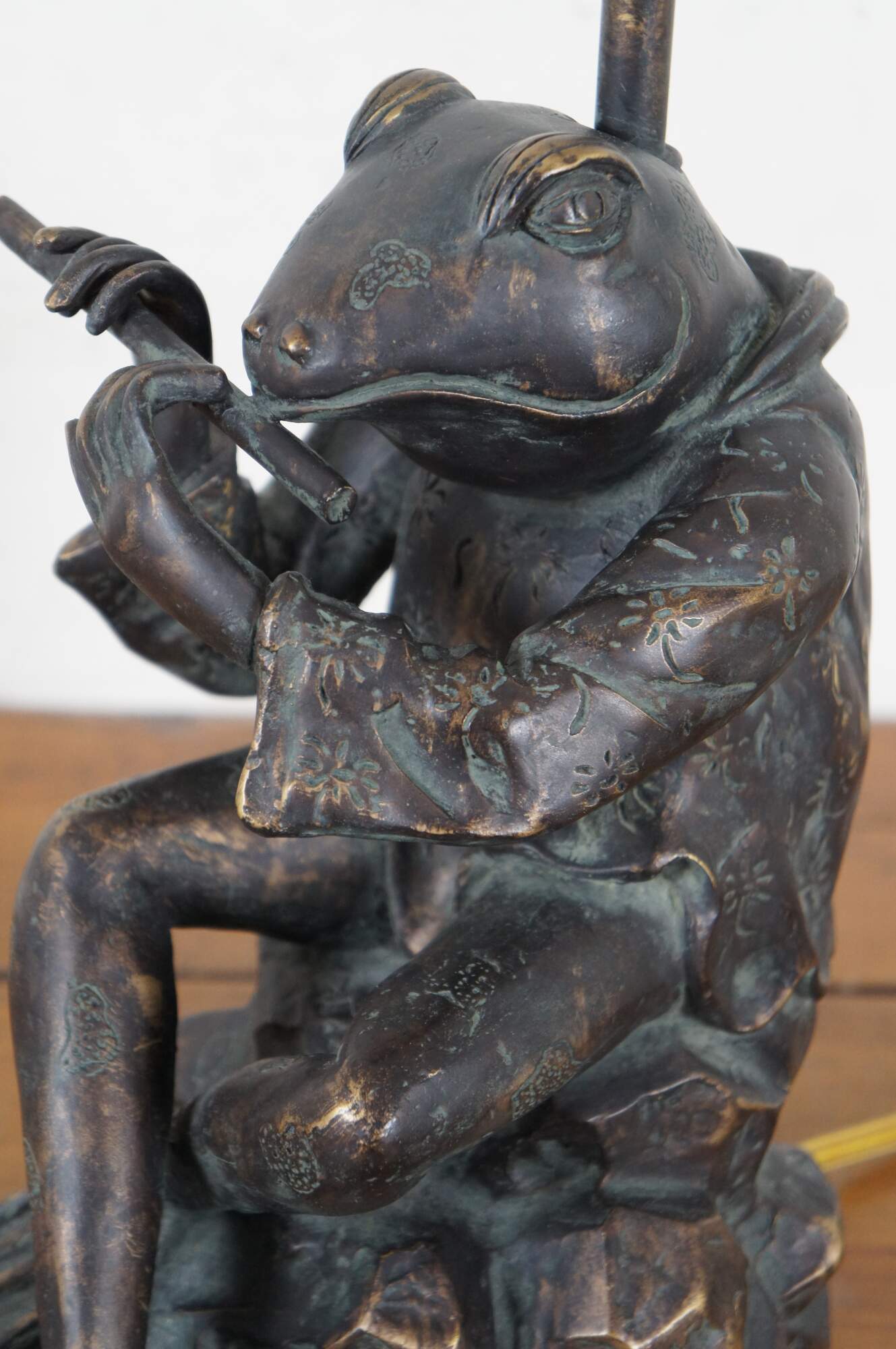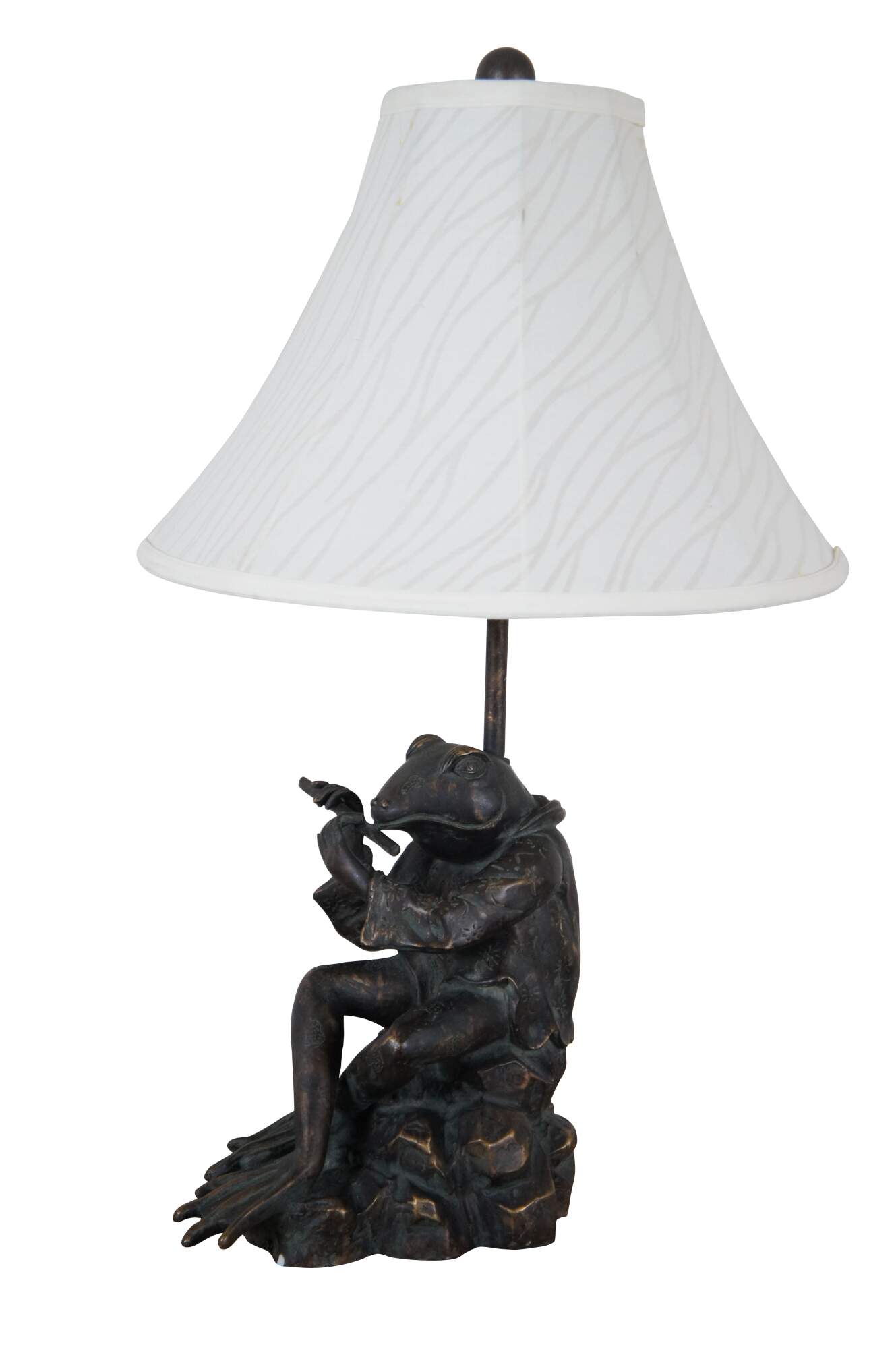 Sculptural composition table lamp in the shape of a bronzed anthropomorphic frog, dressed in a short patterned Japanese kimono jacket and playing a flute. Includes a white zebra patterned cloth shade and wood ball finial.