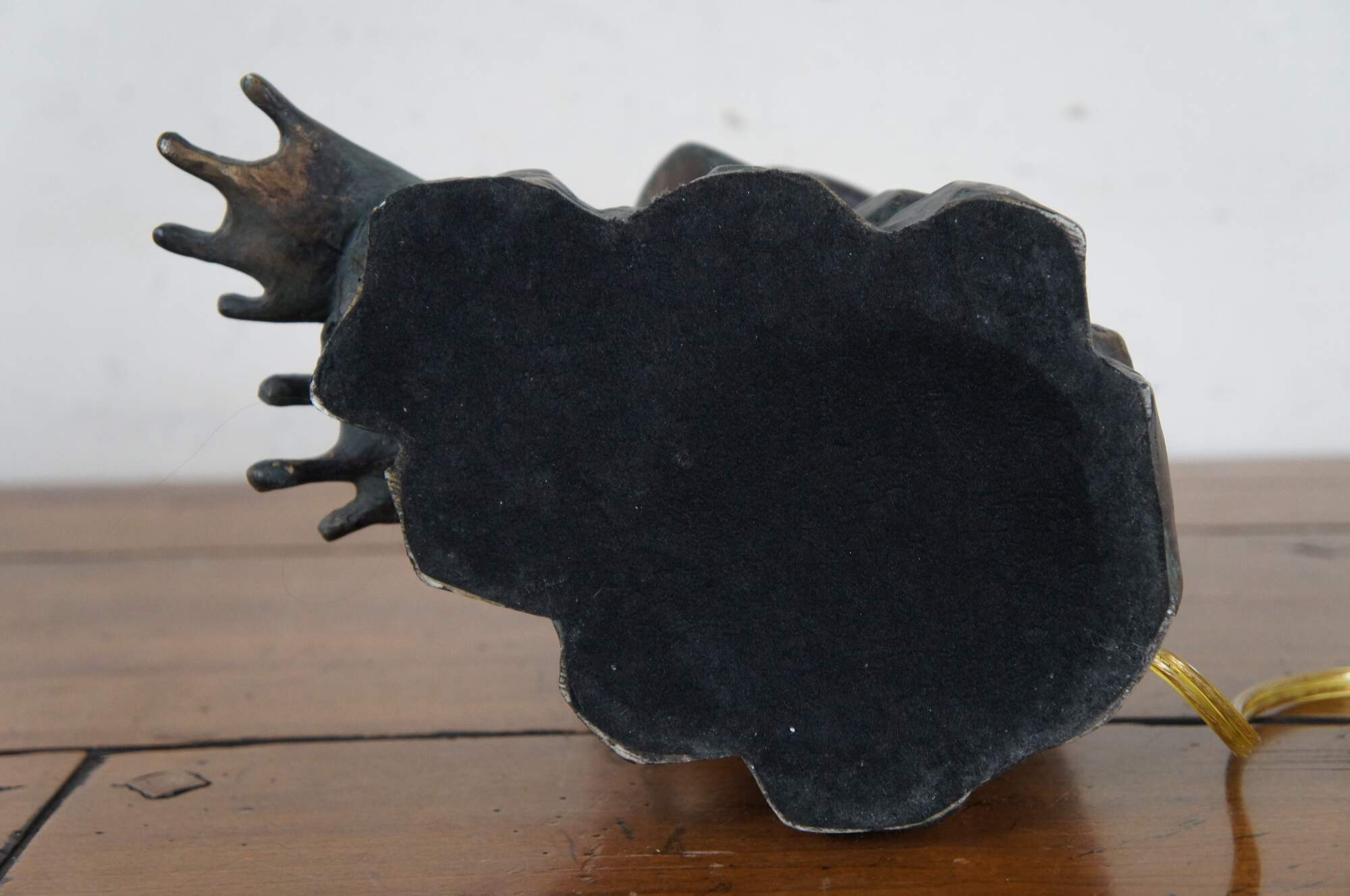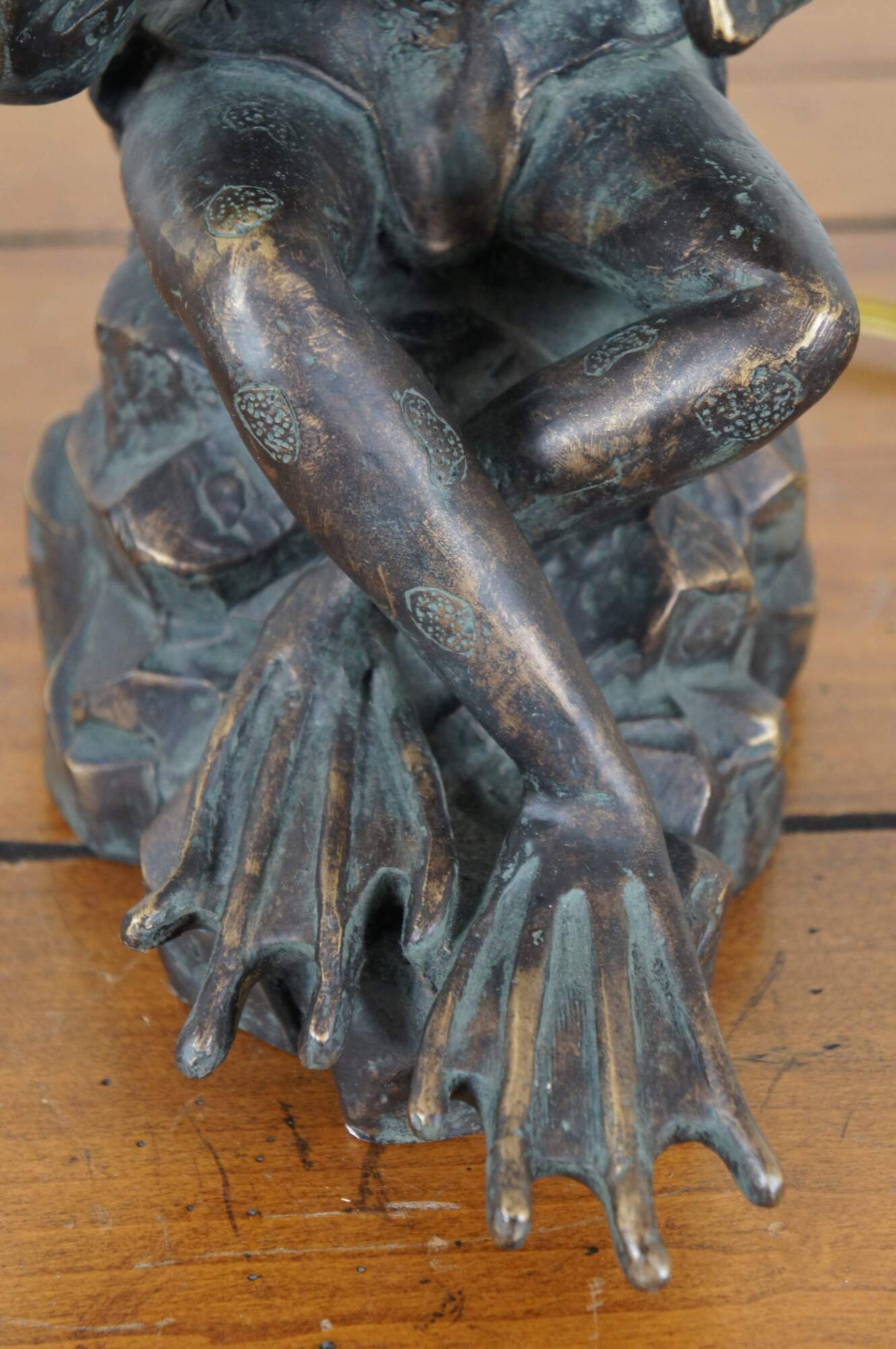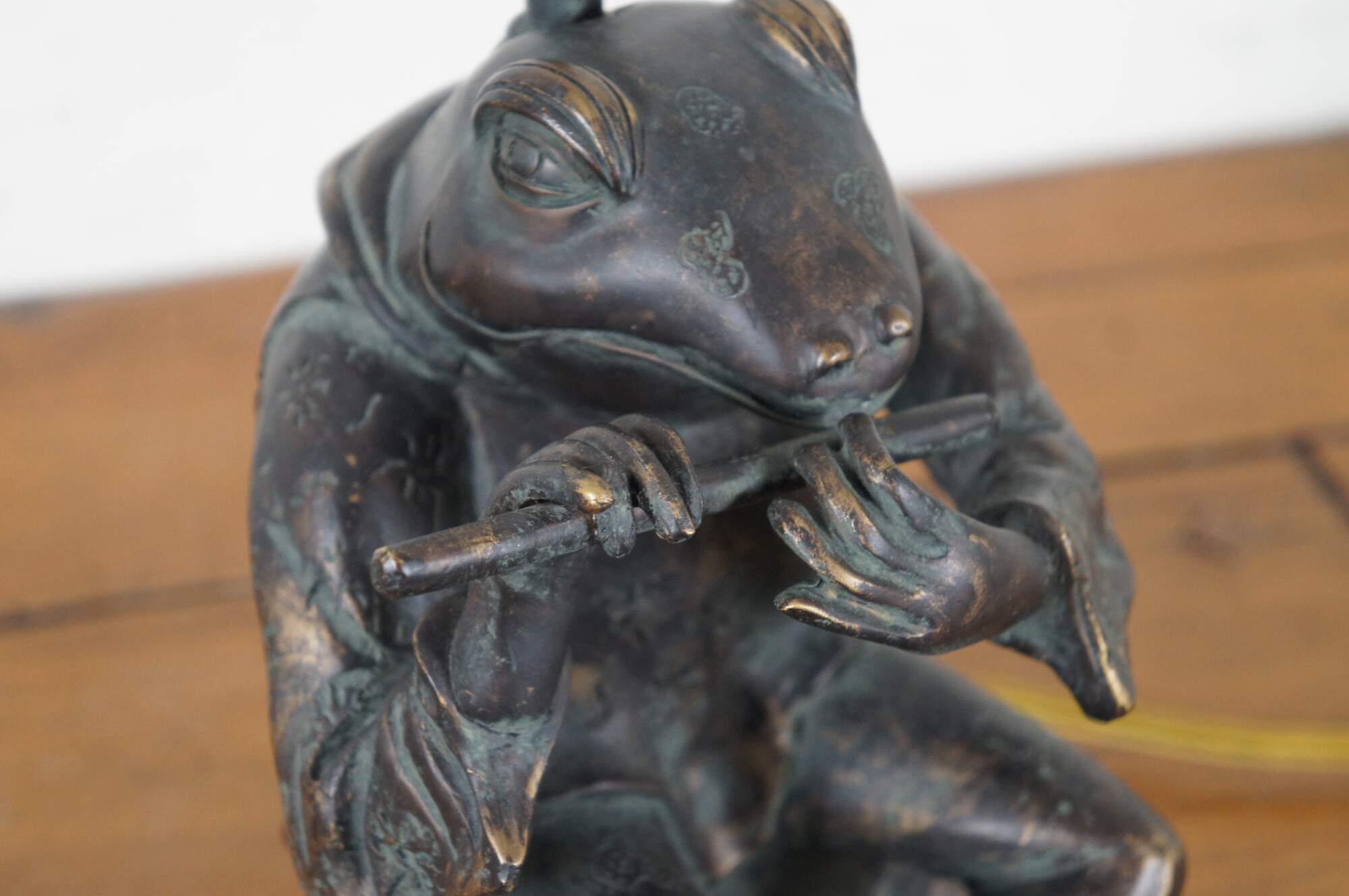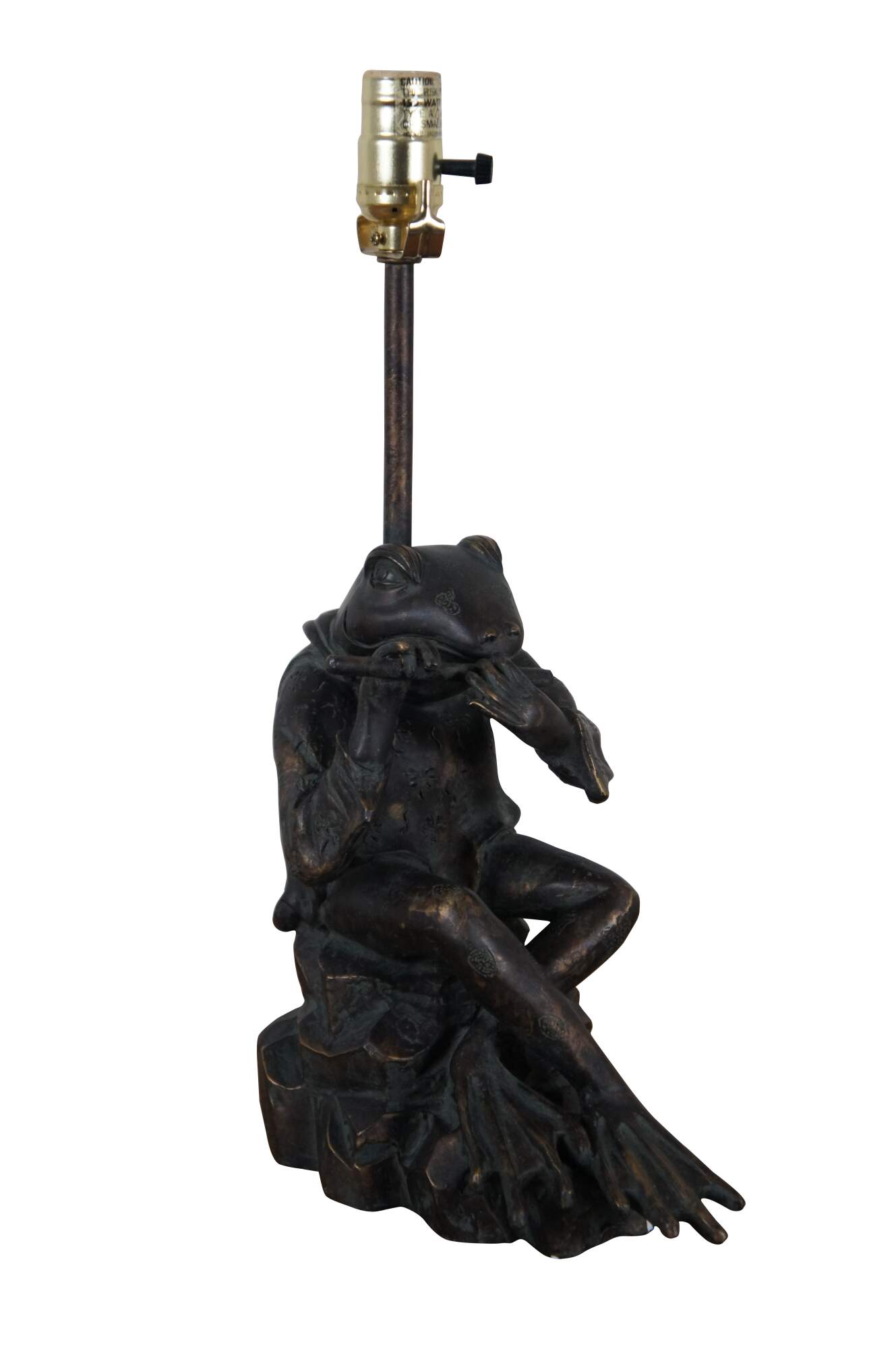 Sculptural composition table lamp in the shape of a bronzed anthropomorphic frog, dressed in a short patterned Japanese kimono jacket and playing a flute. Includes a white zebra patterned cloth shade and wood ball finial.