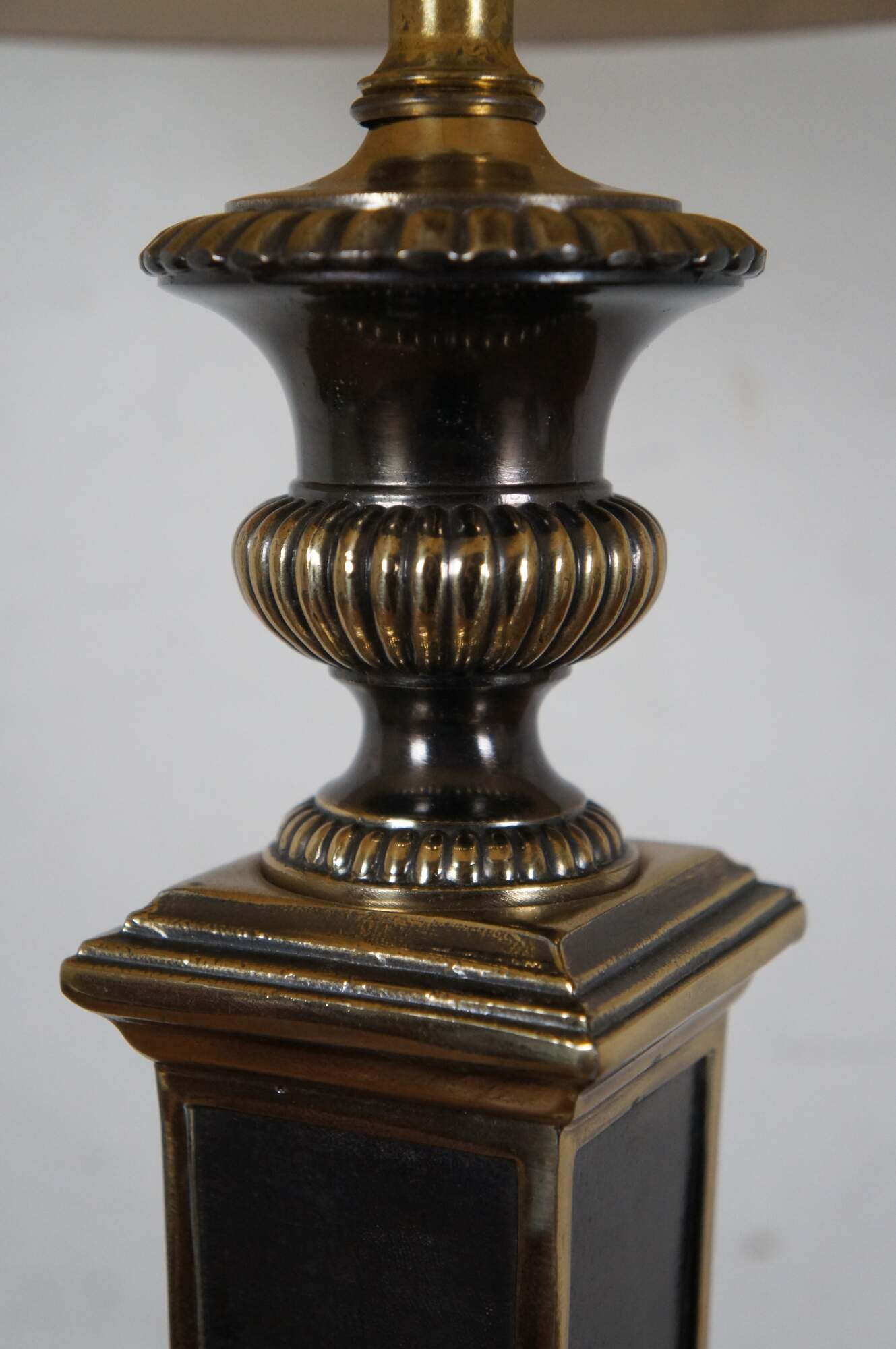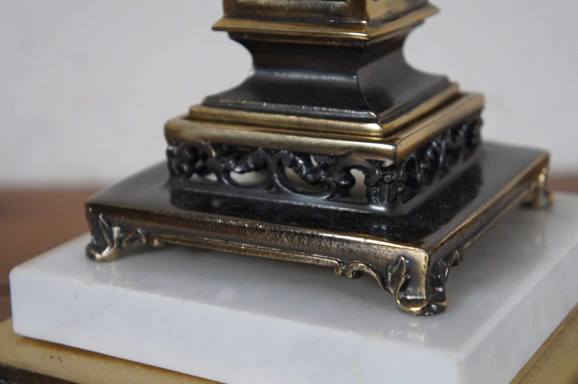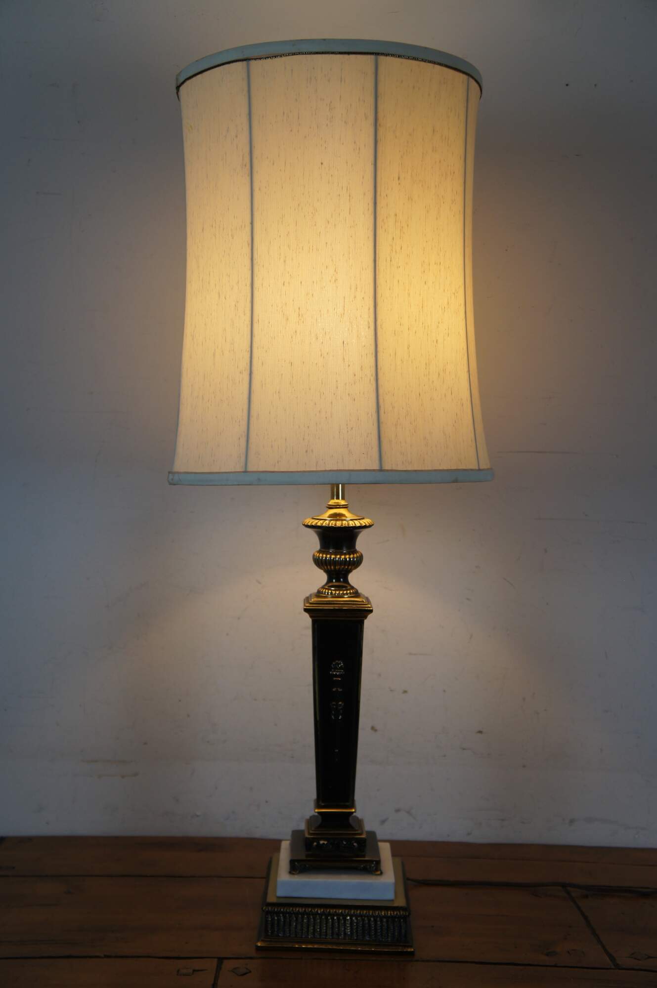 Vintage Empire style torchiere / square column / candlestick shaped table lamp, crafted of brass with dark accents and white marble on the base. Includes cap shaped finial and cylindrical white cloth shade with narrow trim.