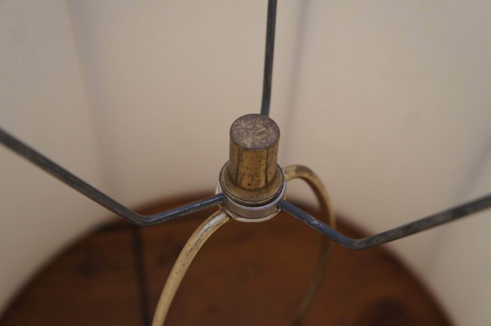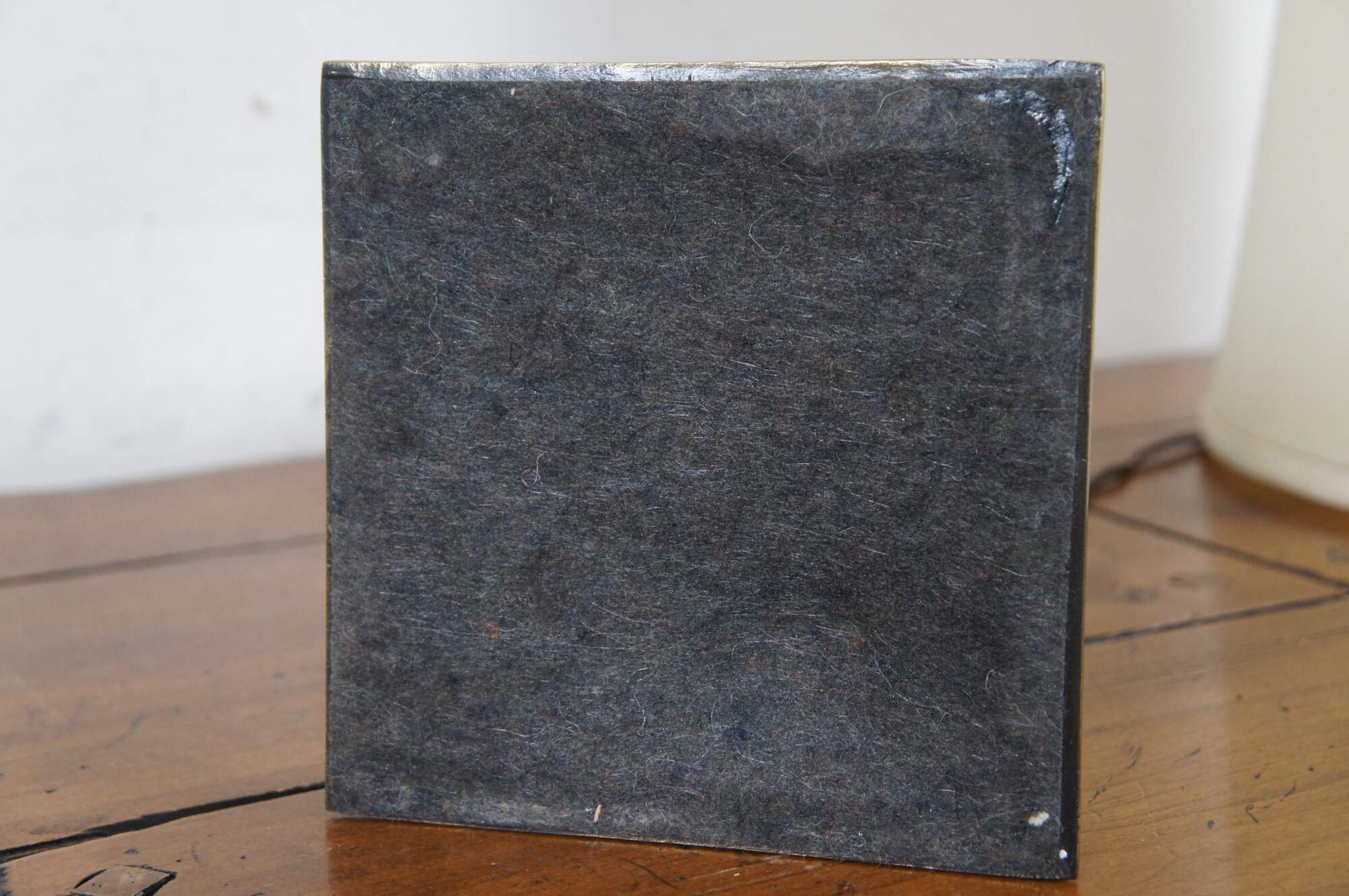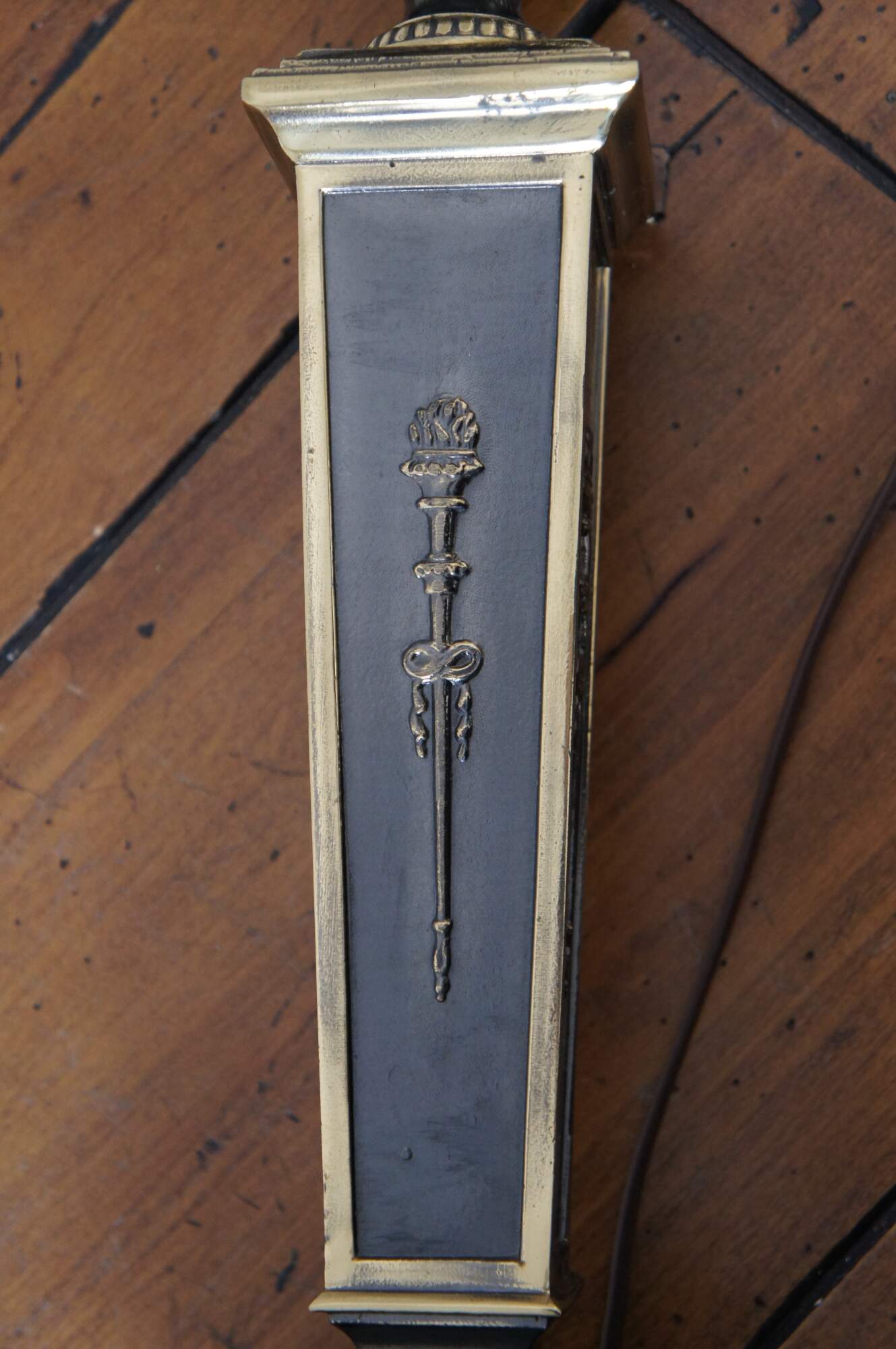 Vintage Empire style torchiere / square column / candlestick shaped table lamp, crafted of brass with dark accents and white marble on the base. Includes cap shaped finial and cylindrical white cloth shade with narrow trim.