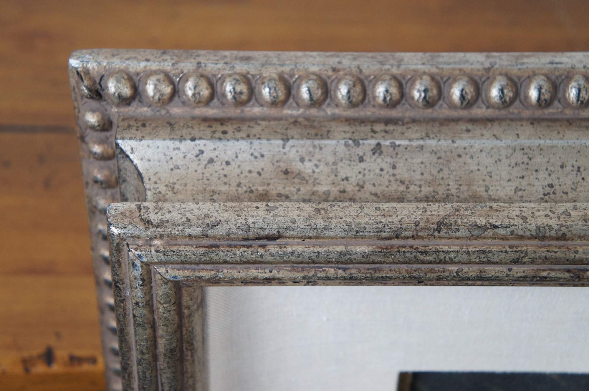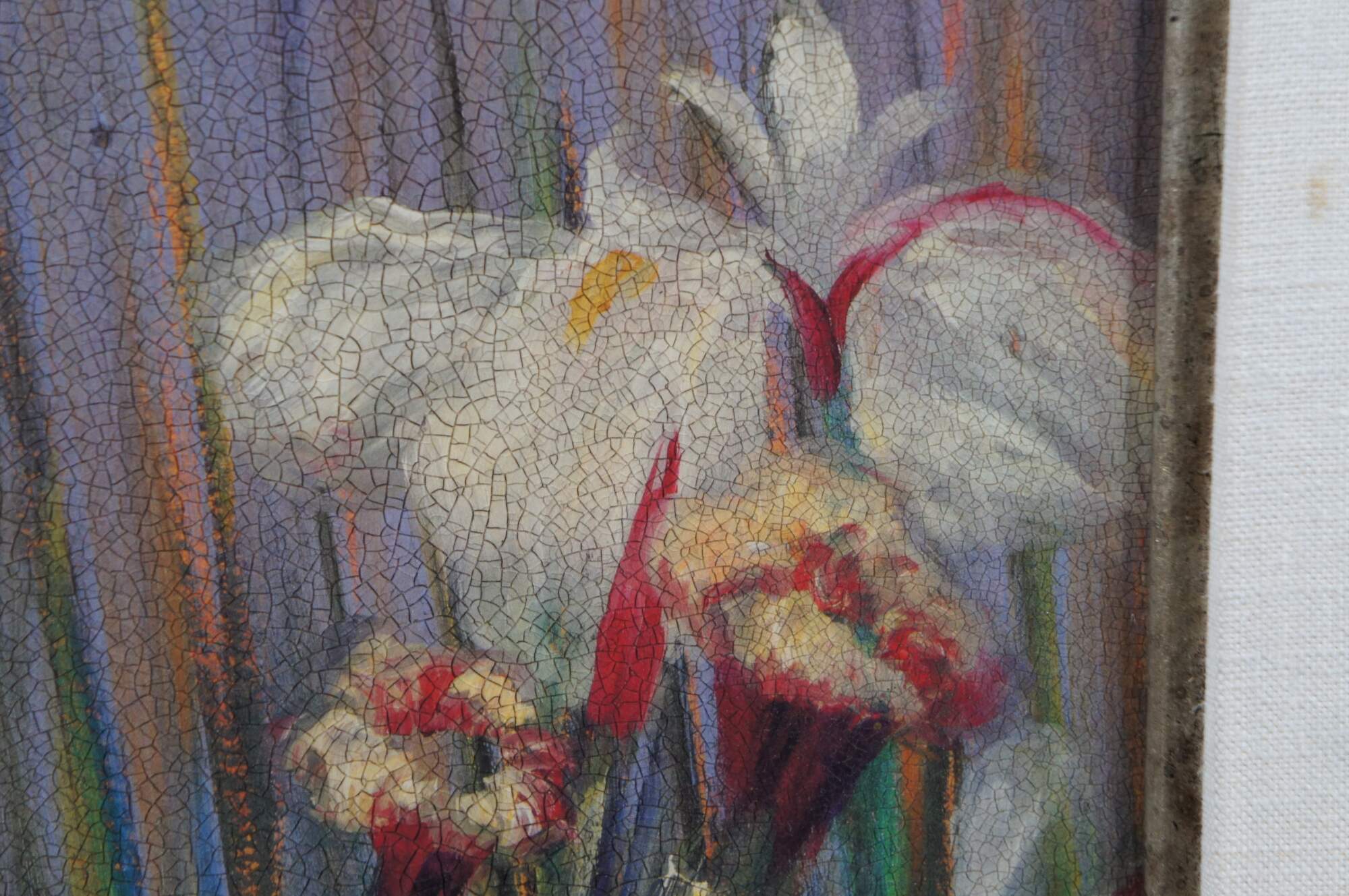 Vintage impressionist style framed print on board of “Wild Irises” by Greg Singley, showing a group of white irises growing at the edge of a pond.