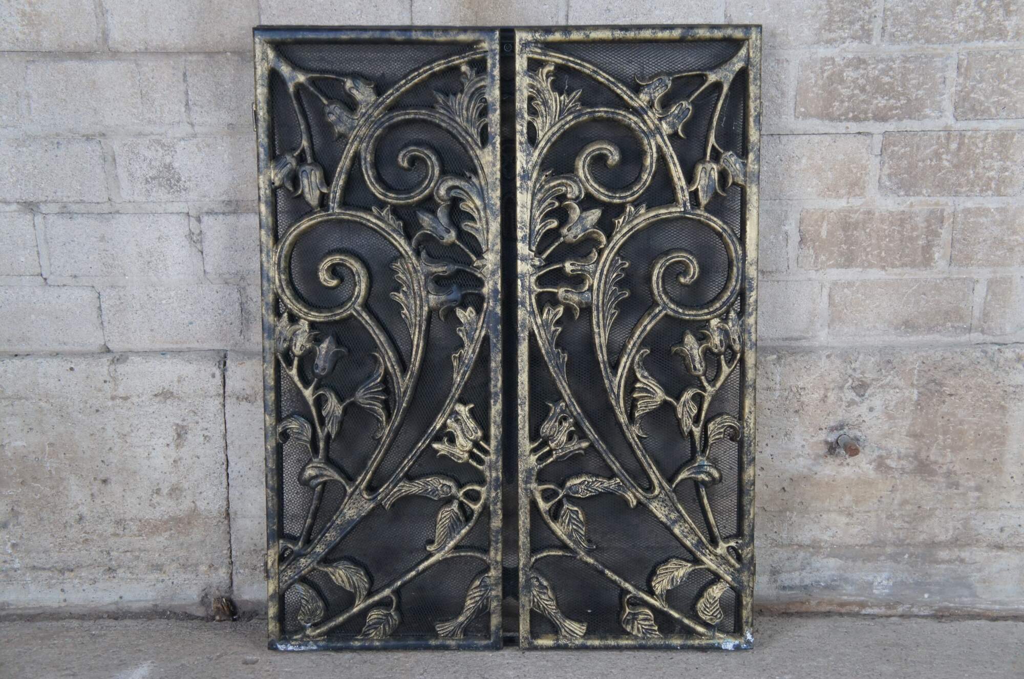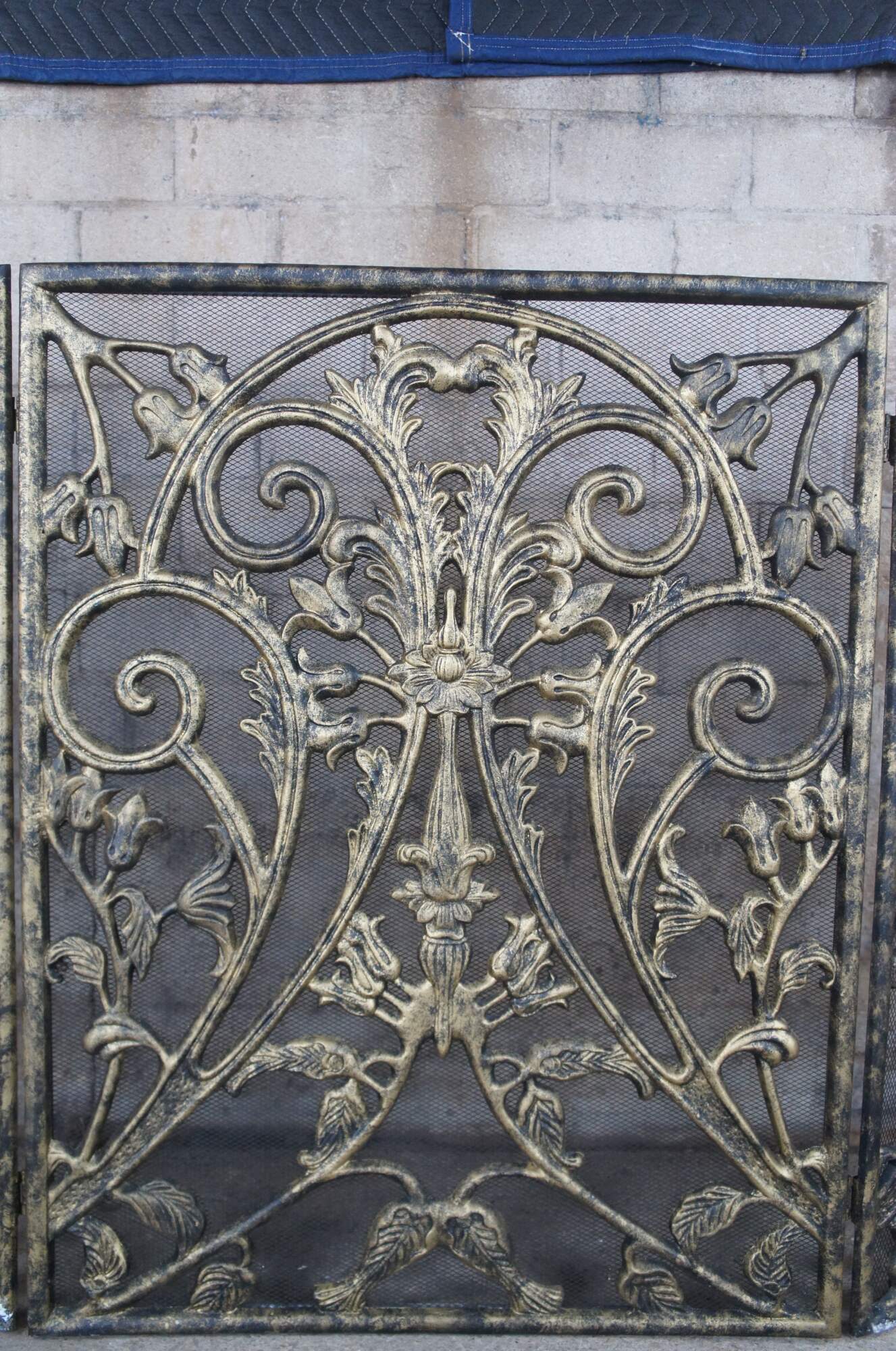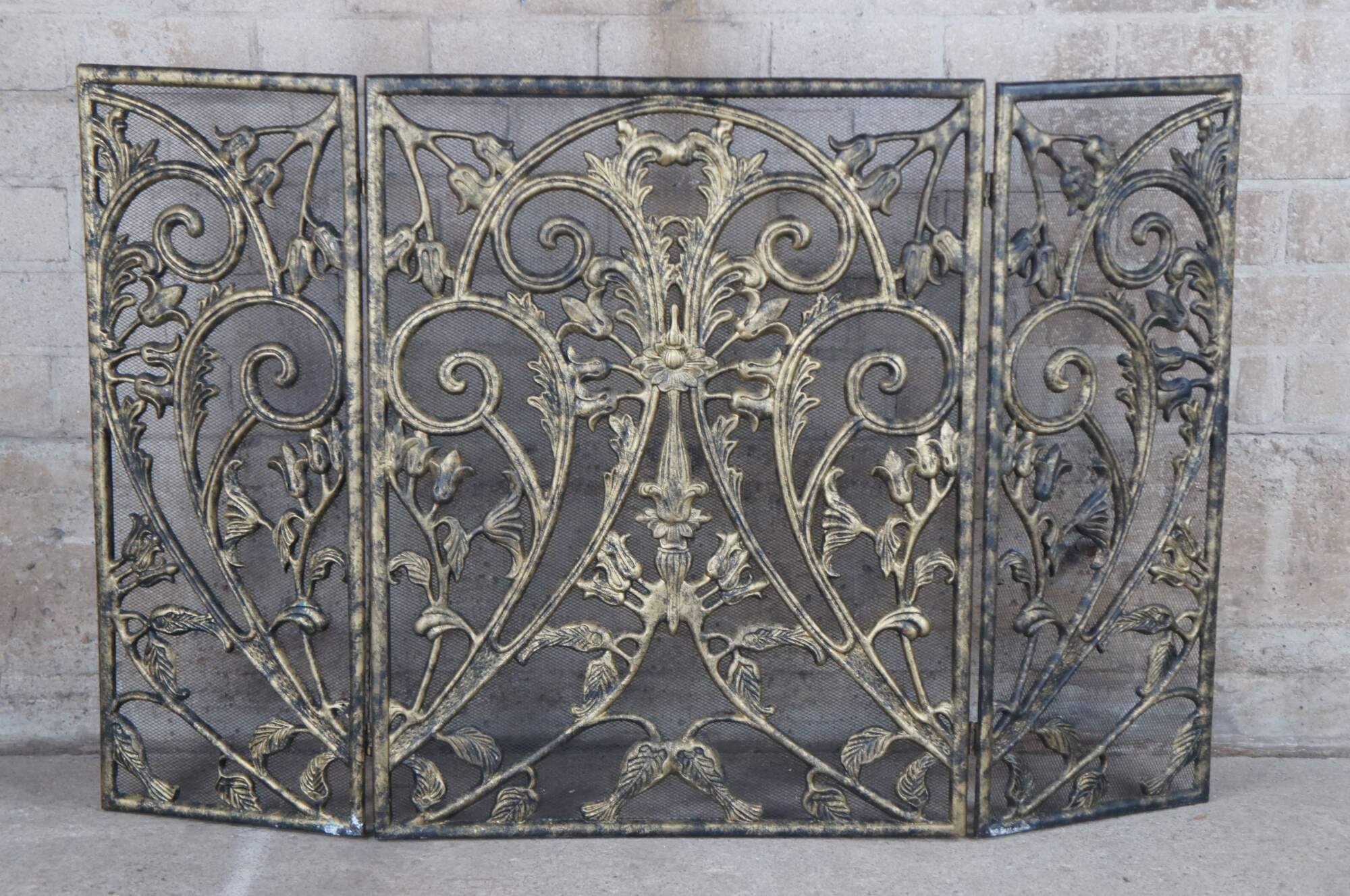 Vintage brass and mesh fireplace folding screen featuring a scrolled floral acanthus theme.