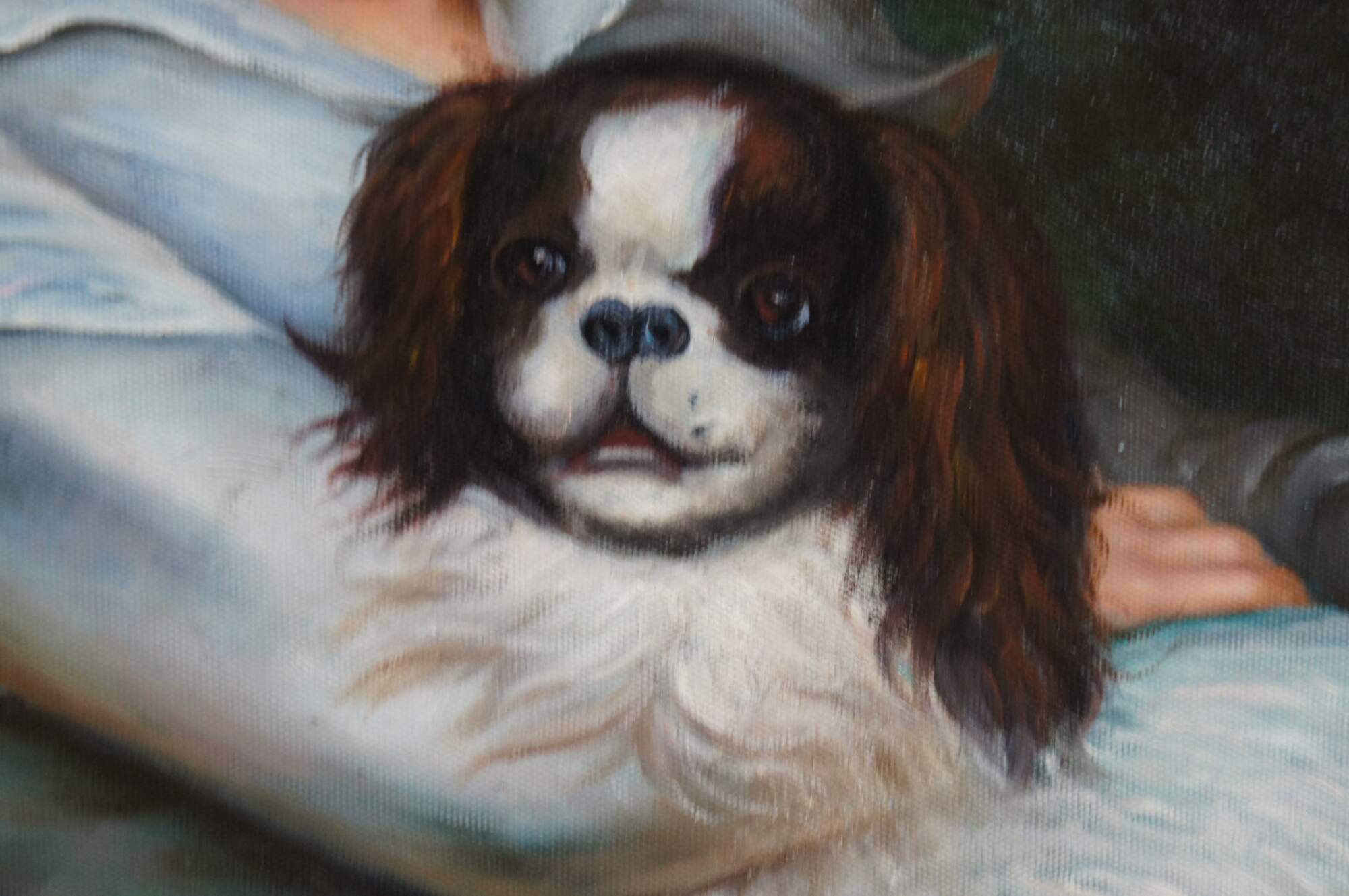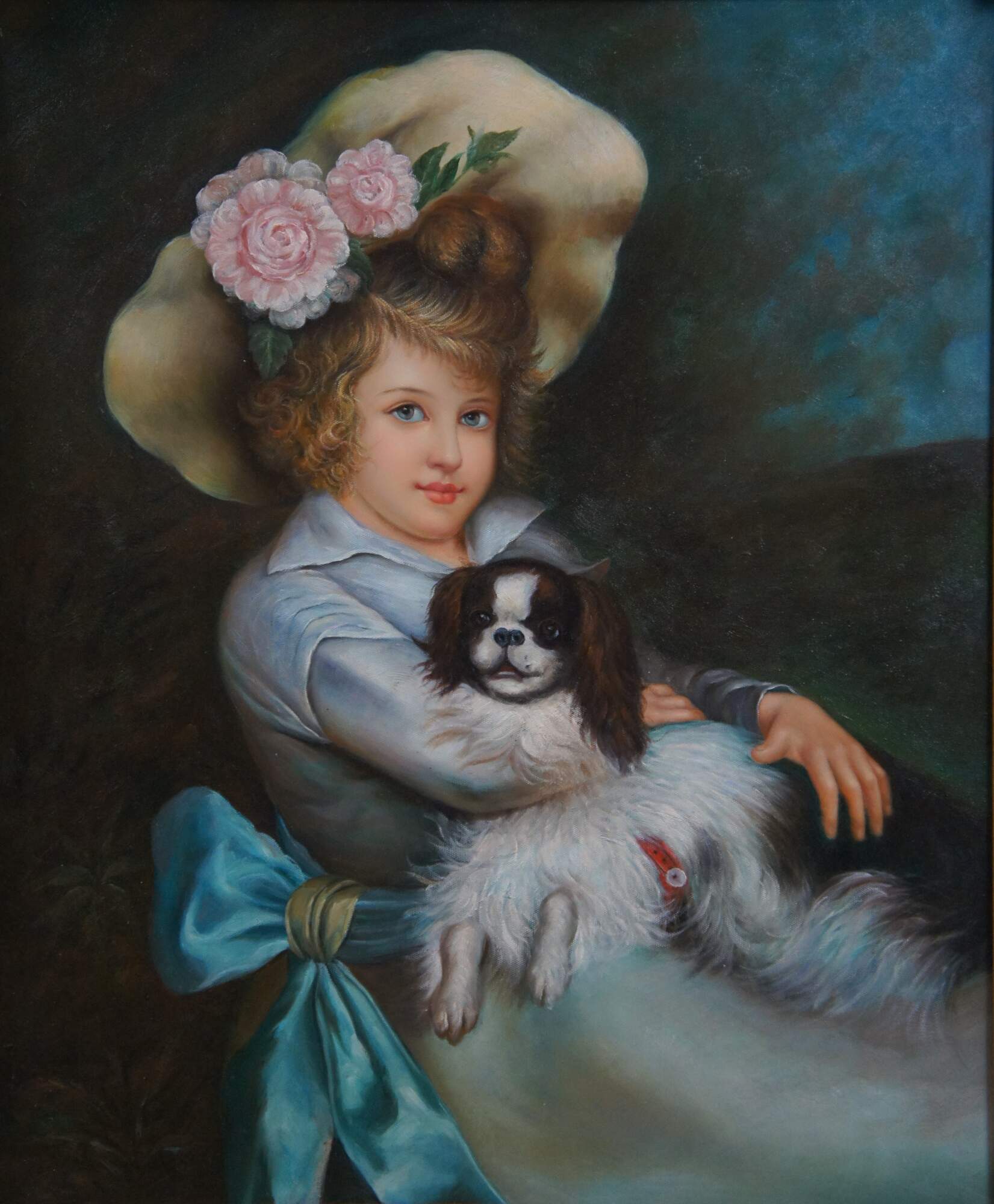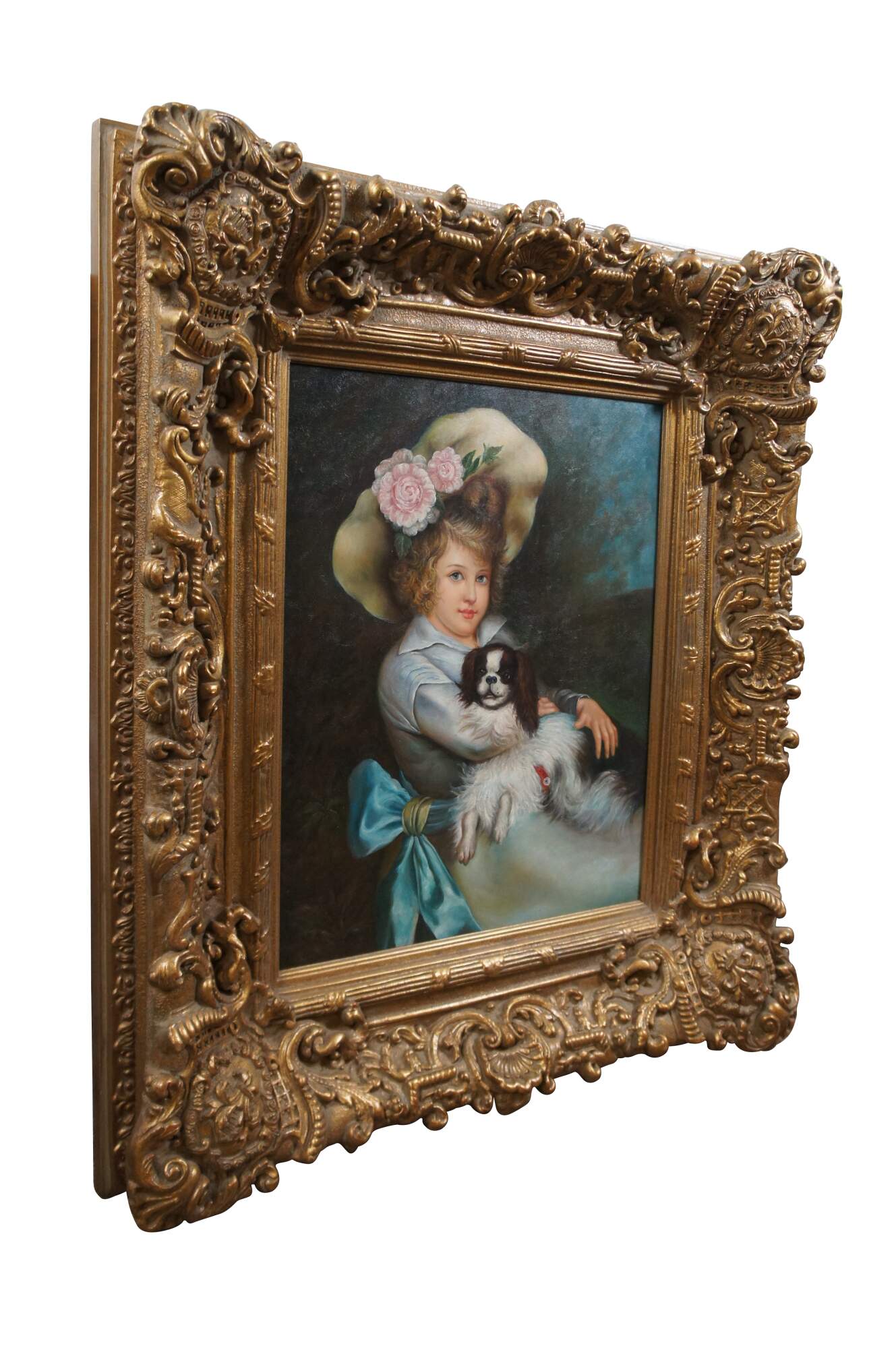 Late 20th century hand painted reproduction oil on canvas portrait painting after “Best of Friends” by Harry Humphrey Moore, showing a young girl in a flowered hat and blue sash, holding a brown and white King Charles Spaniel dog on her lap. Displayed in an ornate high relief baroque gold frame.