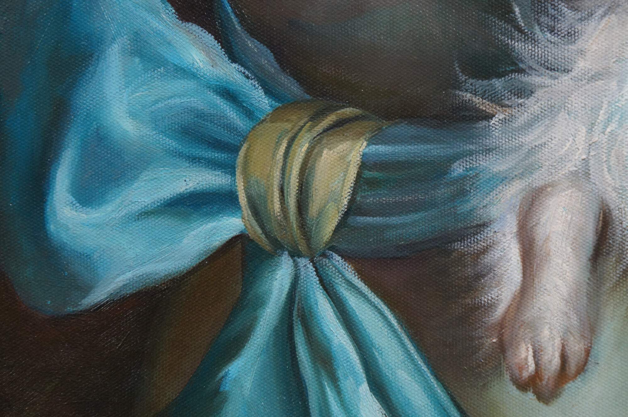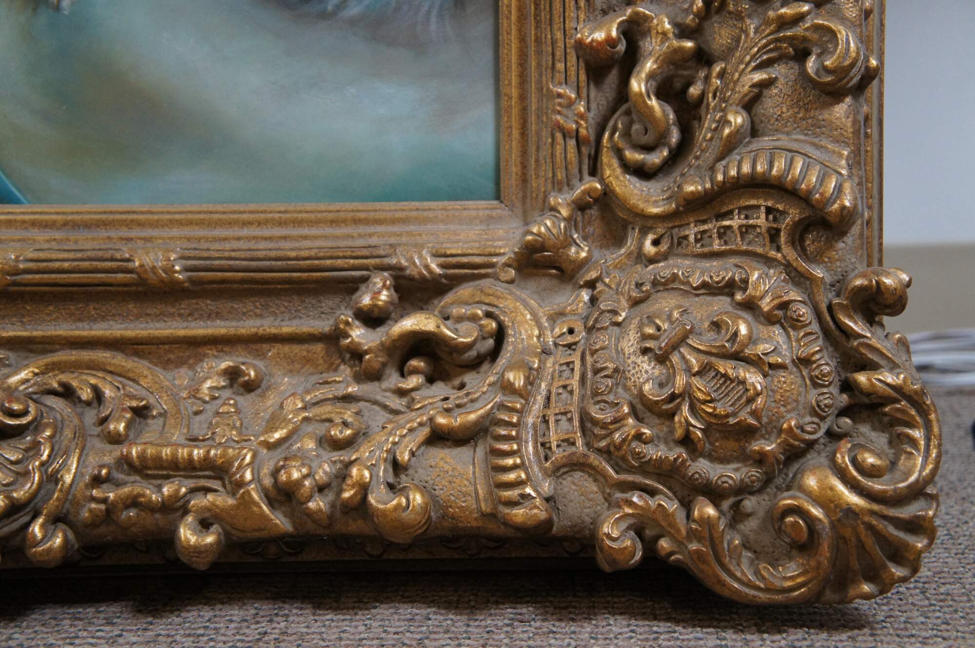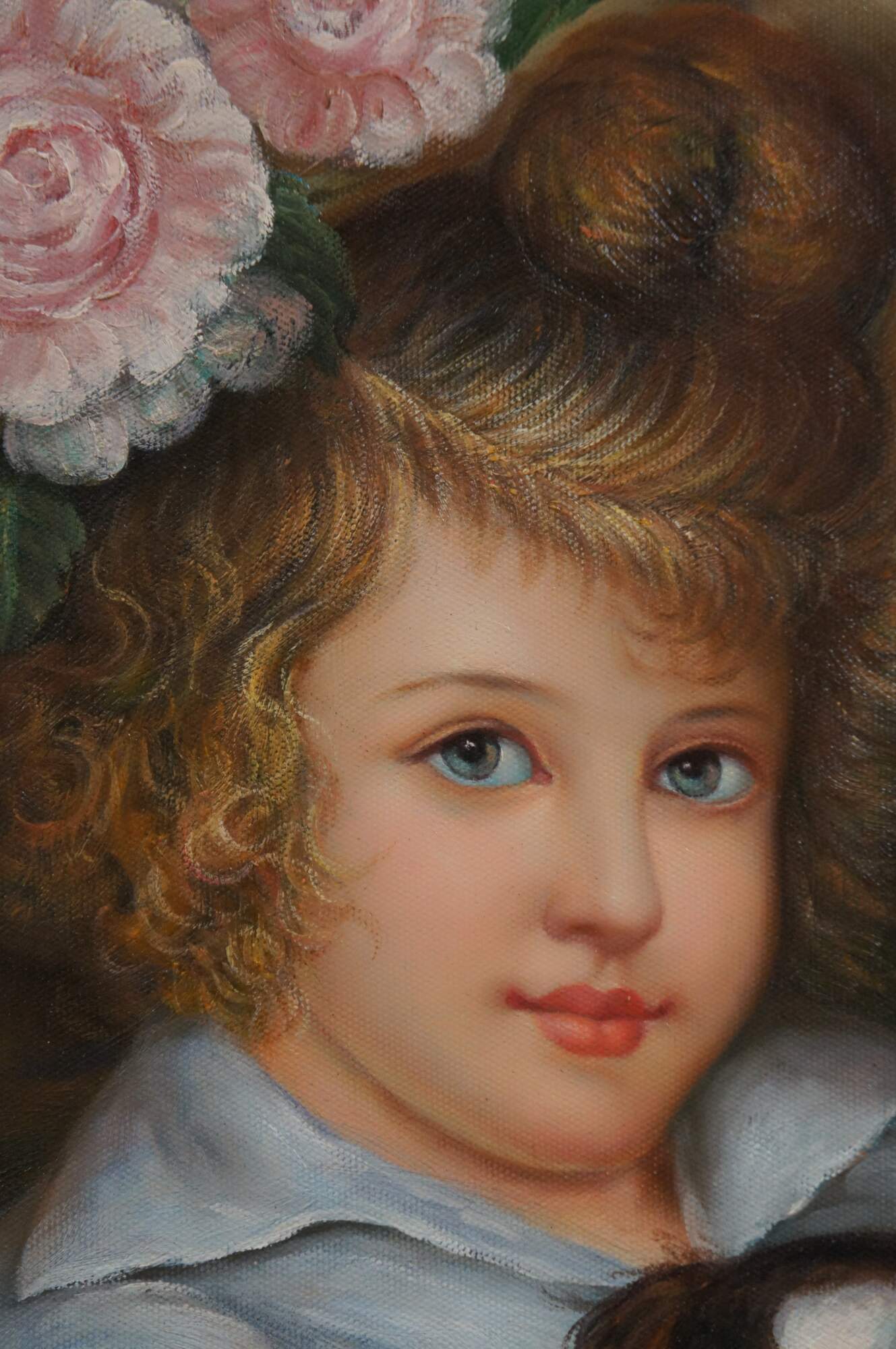 Late 20th century hand painted reproduction oil on canvas portrait painting after “Best of Friends” by Harry Humphrey Moore, showing a young girl in a flowered hat and blue sash, holding a brown and white King Charles Spaniel dog on her lap. Displayed in an ornate high relief baroque gold frame.