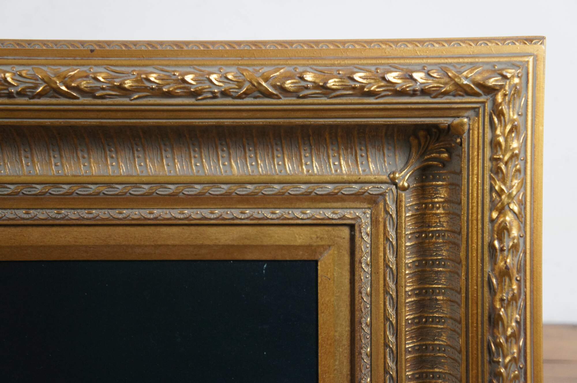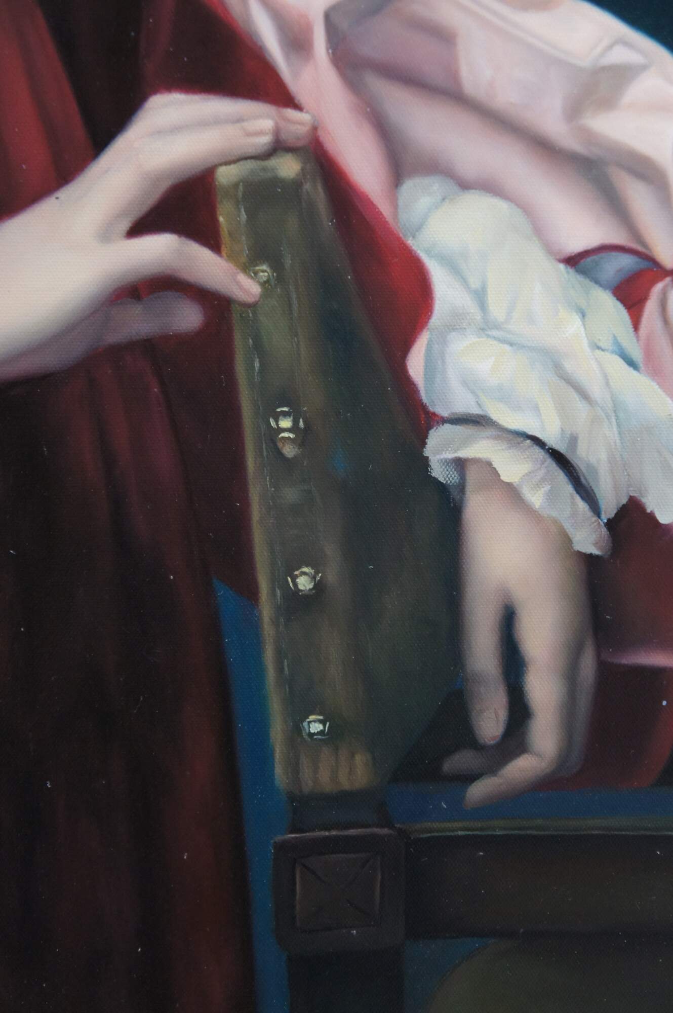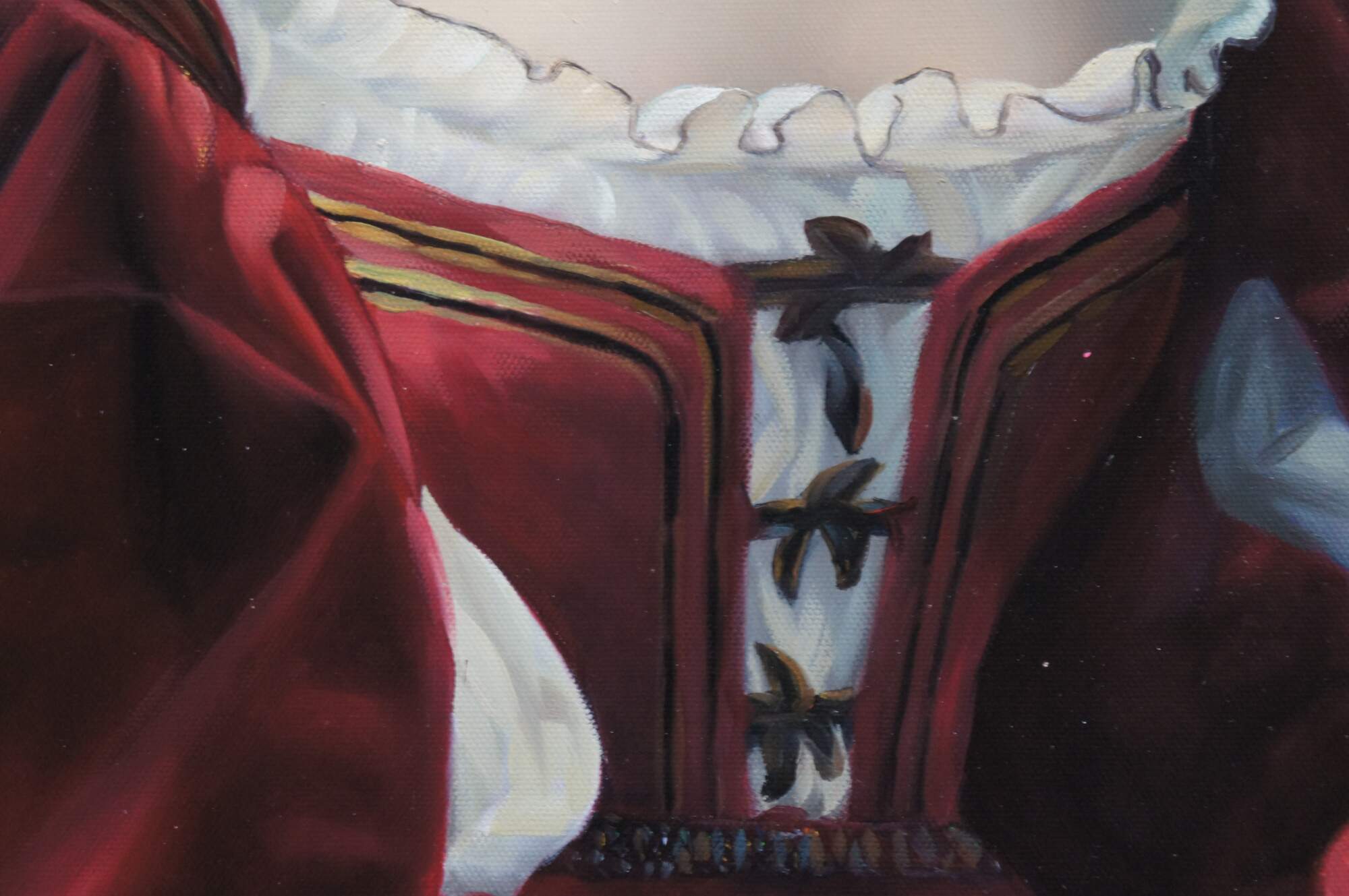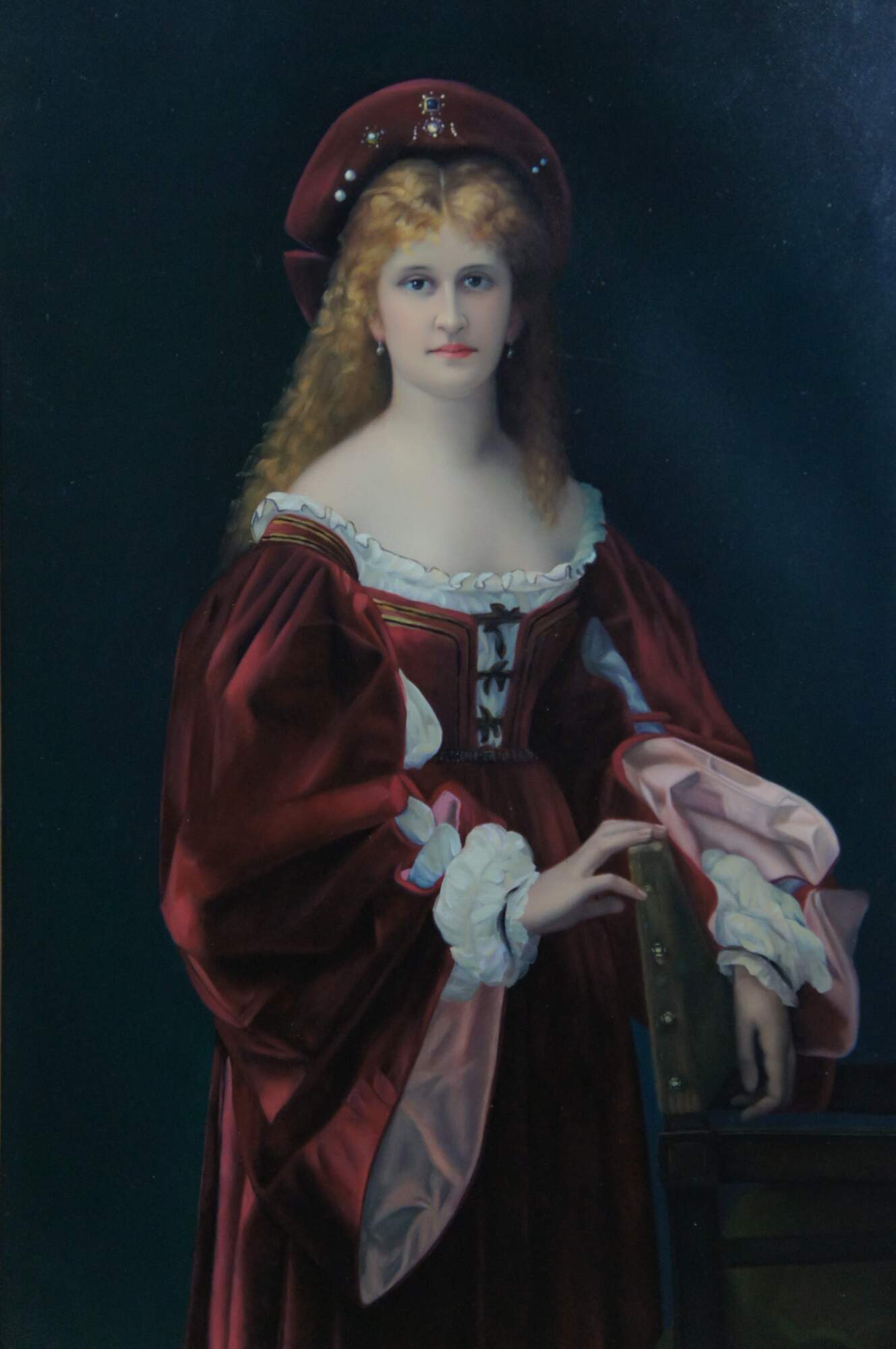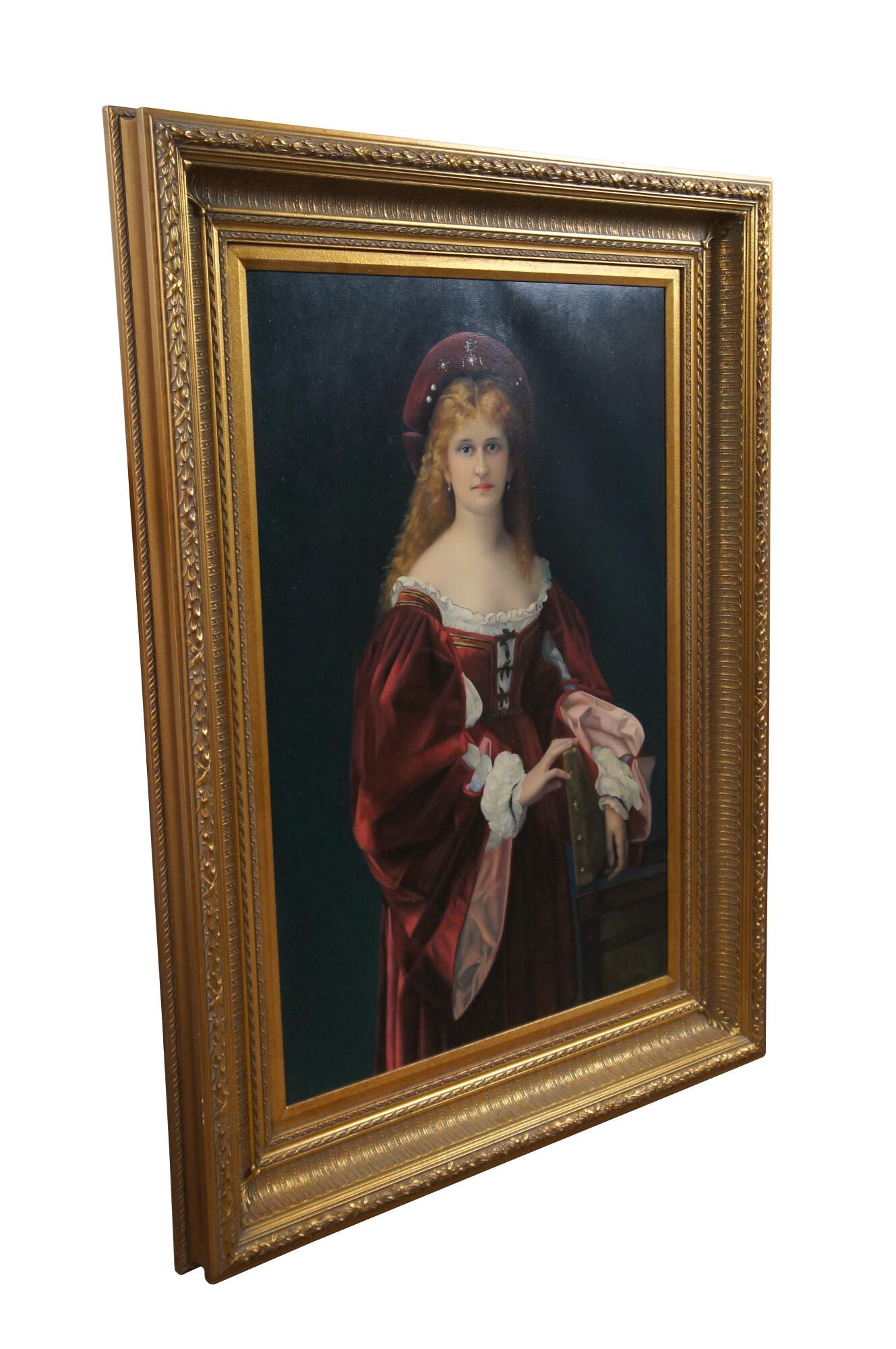 Very large and impressive hand painted reproduction oil portrait painting on canvas after “Patricienne de Venise” (Patrician of Venice) originally painted in 1881 by Alexandre Cabanel, showing a woman with long red hair in an elegant red Elizabethan gown, standing next to a chair. Displayed in a carved and beveled gilded frame.