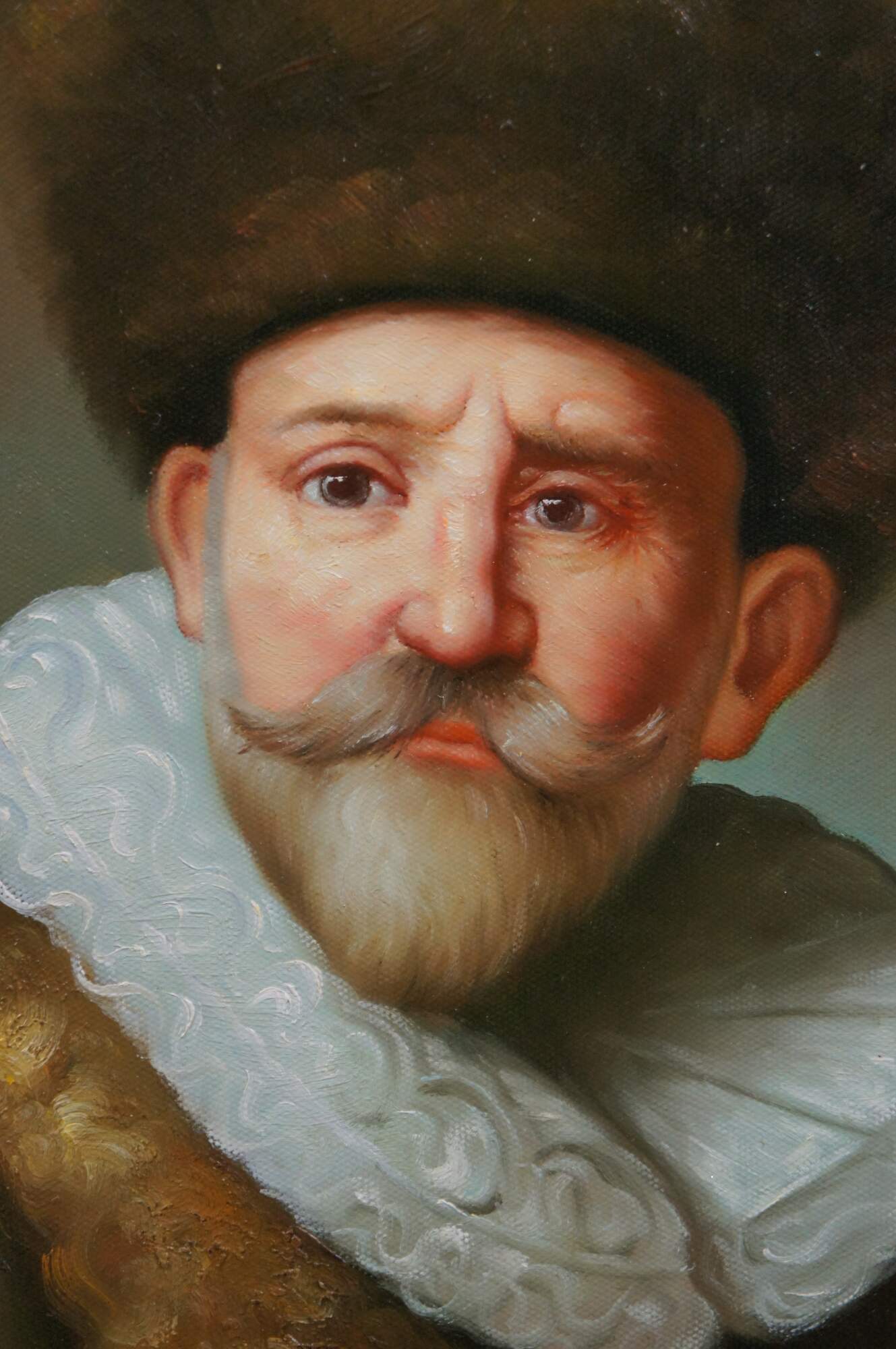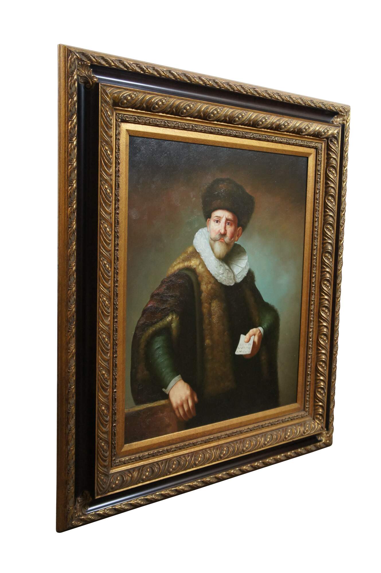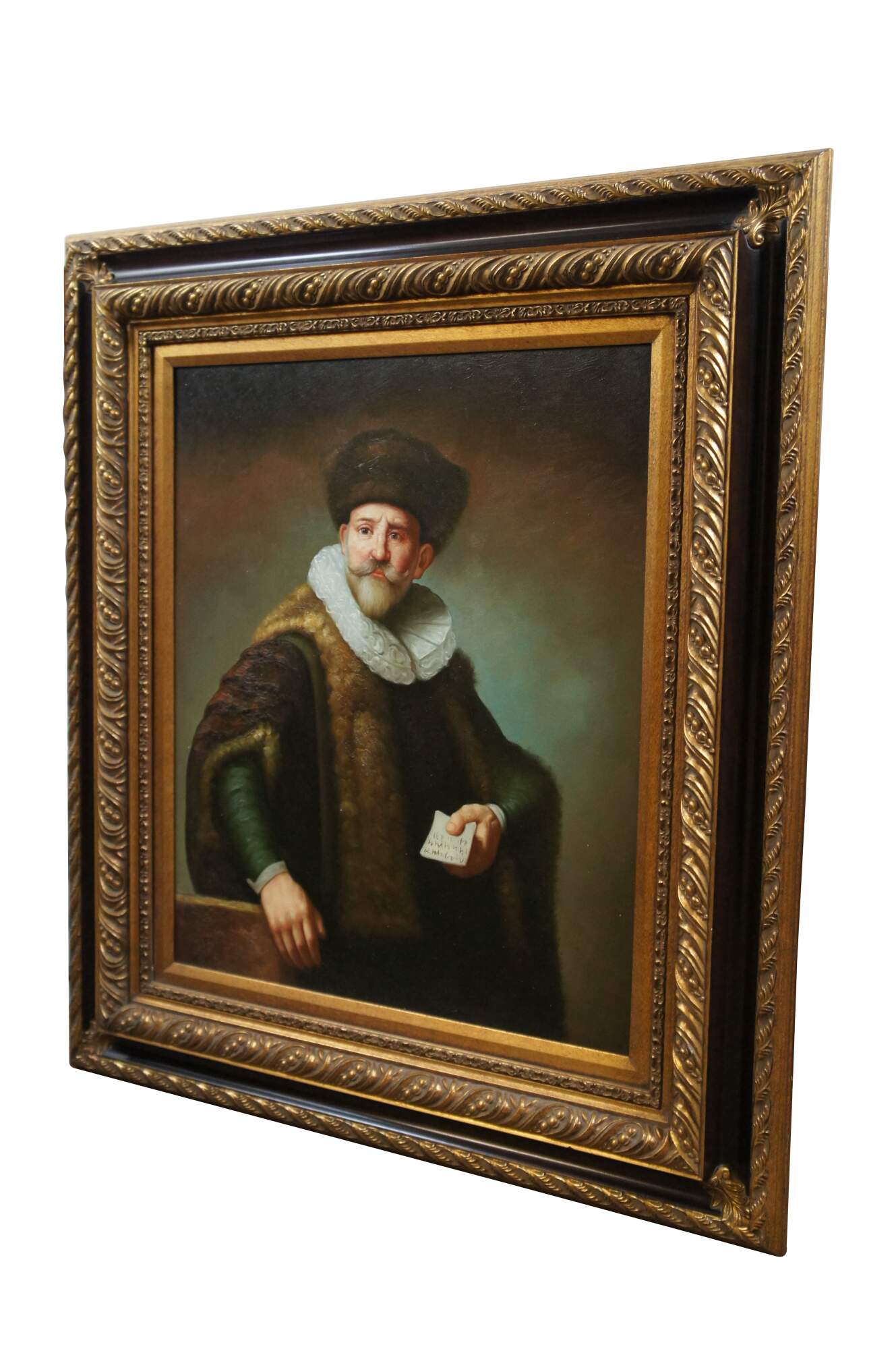 Late 20th century hand painted reproduction oil on canvas painting after “Portrait of Nicolaes Ruts” originally painted in 1631 by Rembrandt van Rijn. This portrait of a fur trader was one of Rembrandt's earliest commissioned pieces and helped launch his career as a portrait painter. Displayed in a carved gilded and ebonized frame.