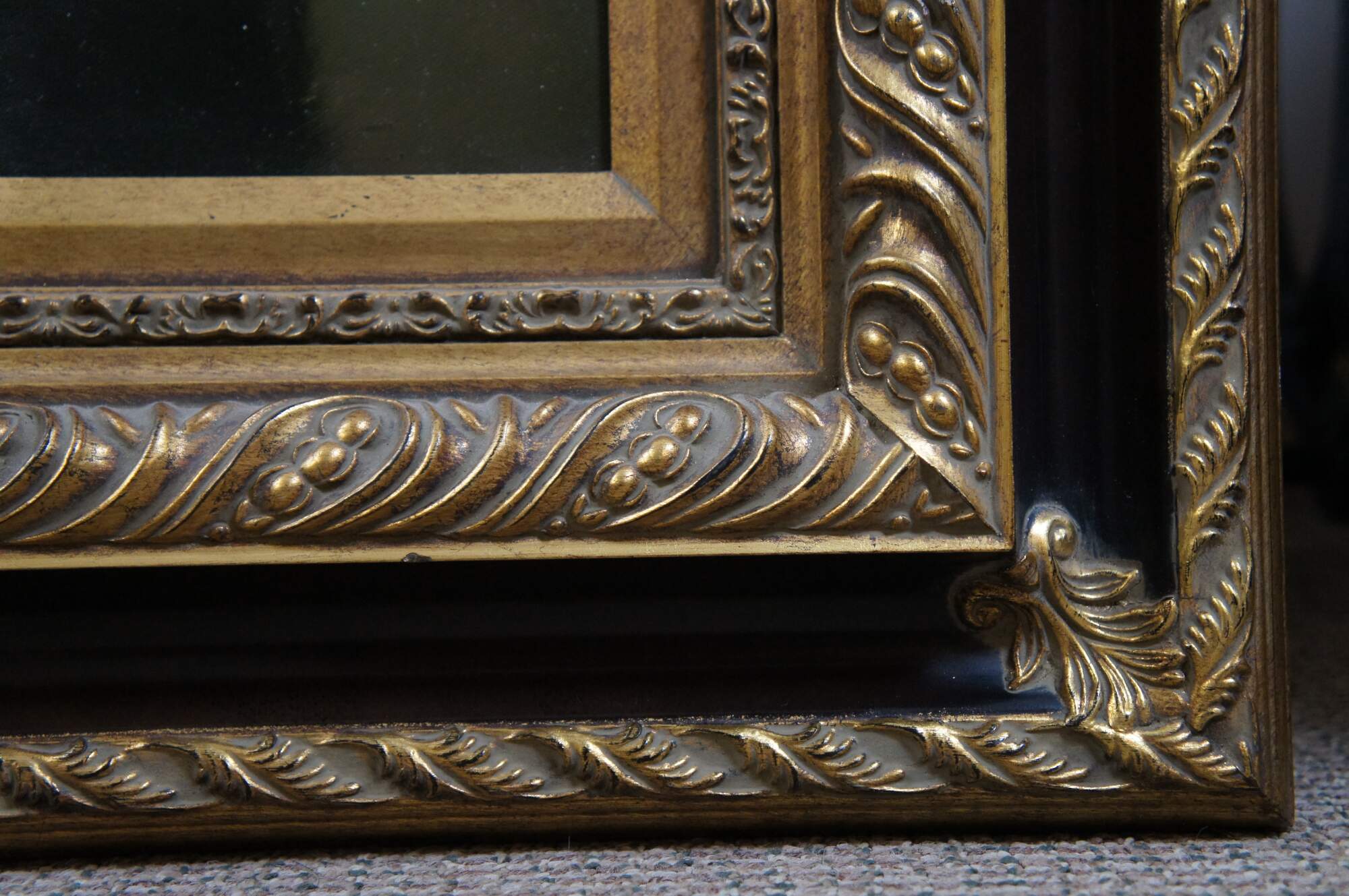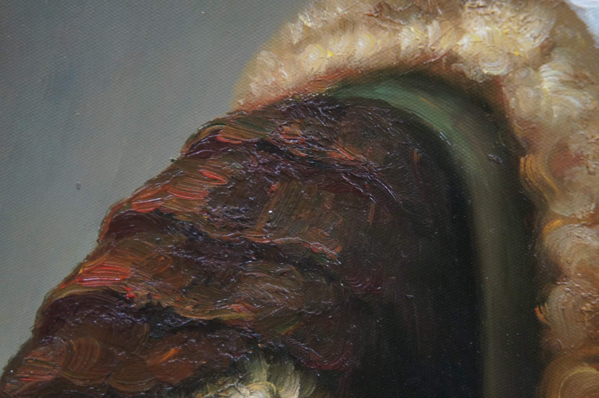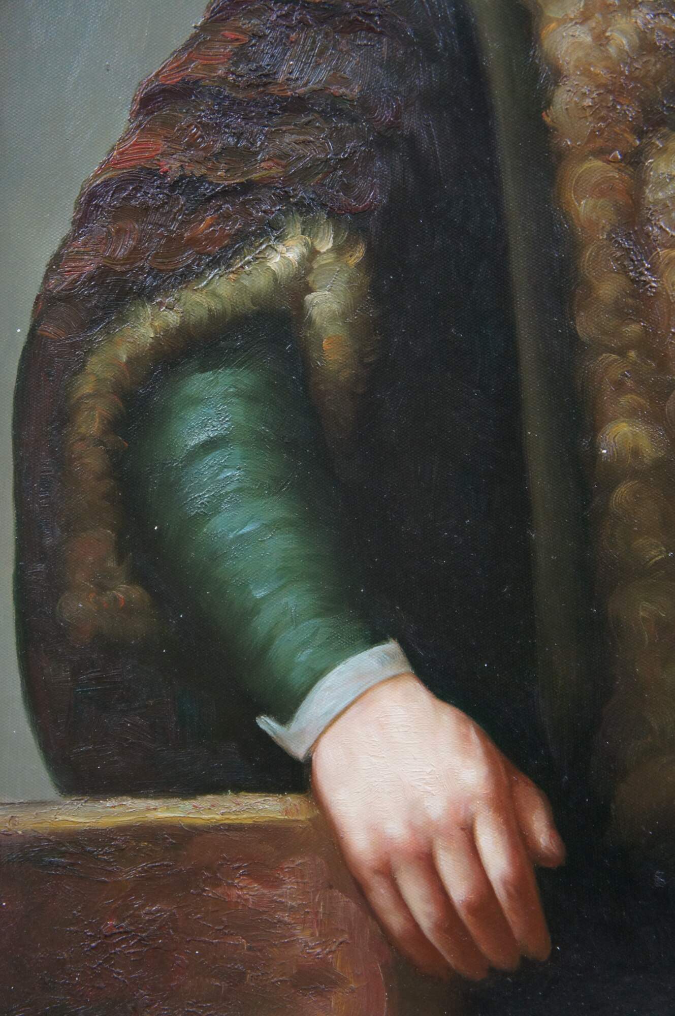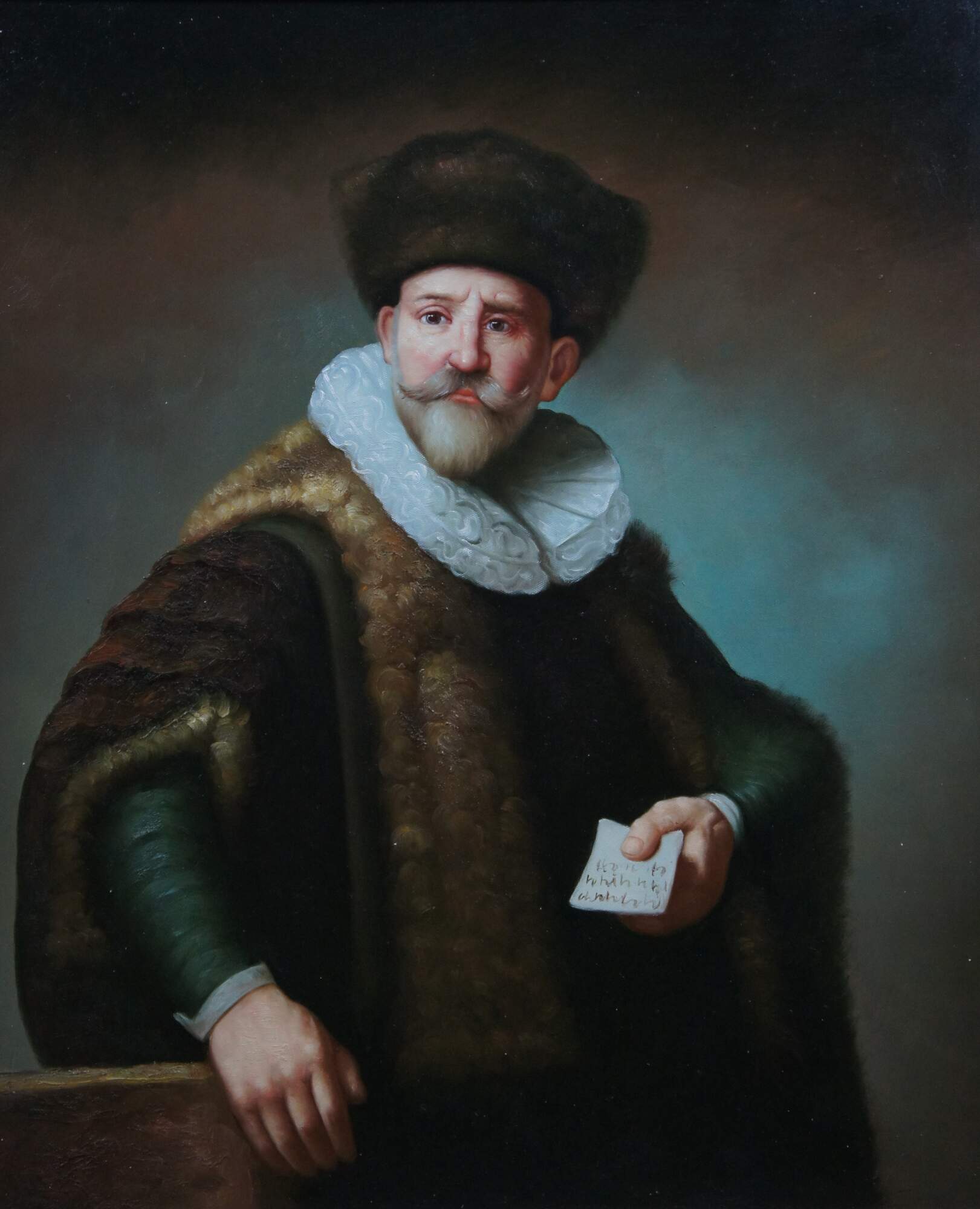 Late 20th century hand painted reproduction oil on canvas painting after “Portrait of Nicolaes Ruts” originally painted in 1631 by Rembrandt van Rijn. This portrait of a fur trader was one of Rembrandt's earliest commissioned pieces and helped launch his career as a portrait painter. Displayed in a carved gilded and ebonized frame.