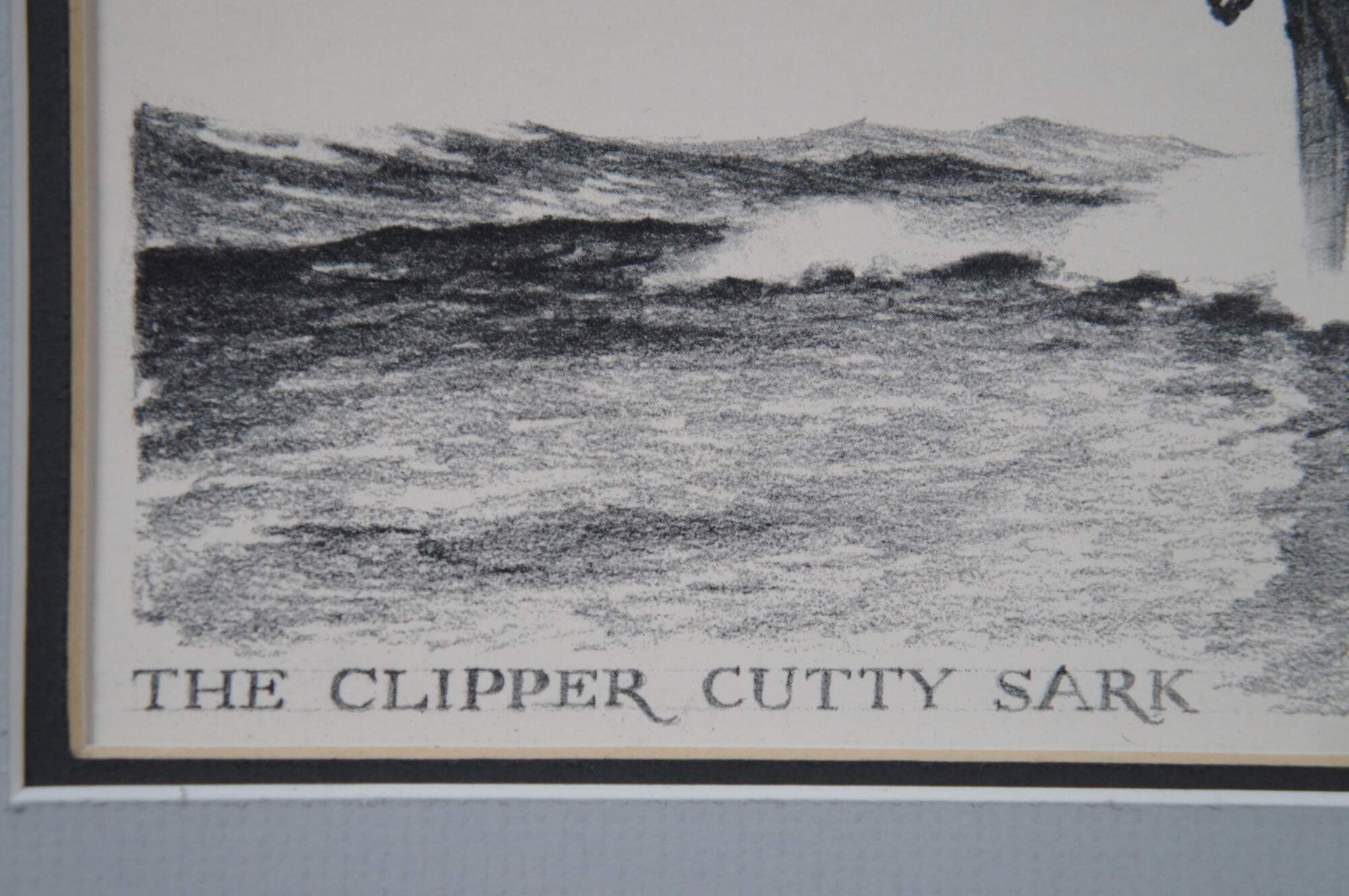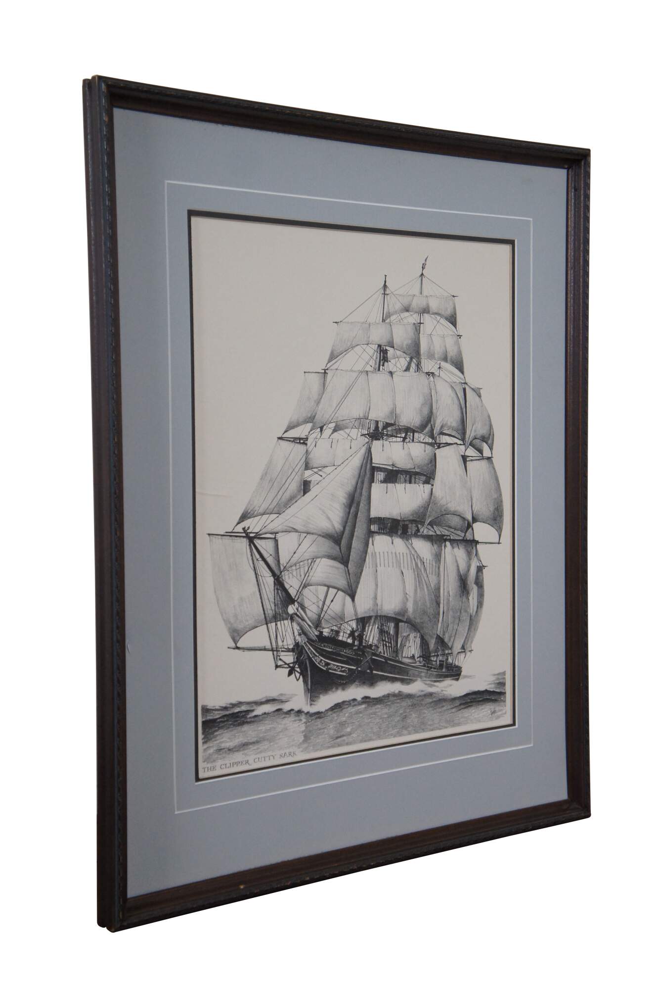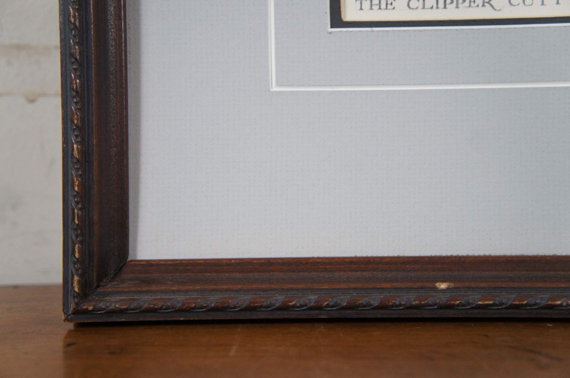 Late 20th century black and white seascape lithograph print depicting “The Clipper Cutty Sark” from an engraving by Fowler. Displayed in a neatly carved dark wood frame. Professionally framed and matted.