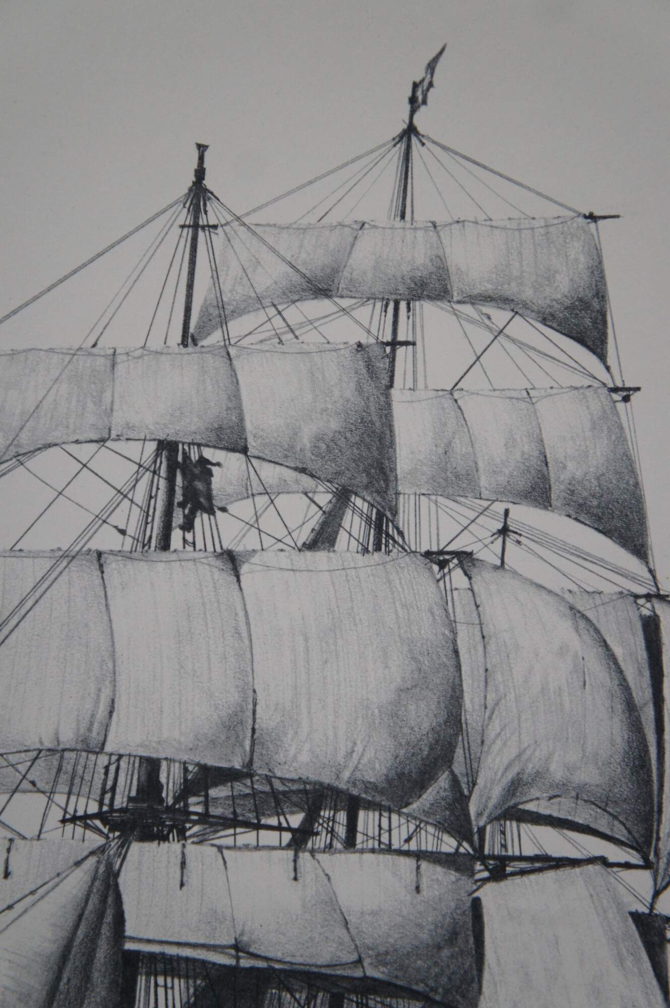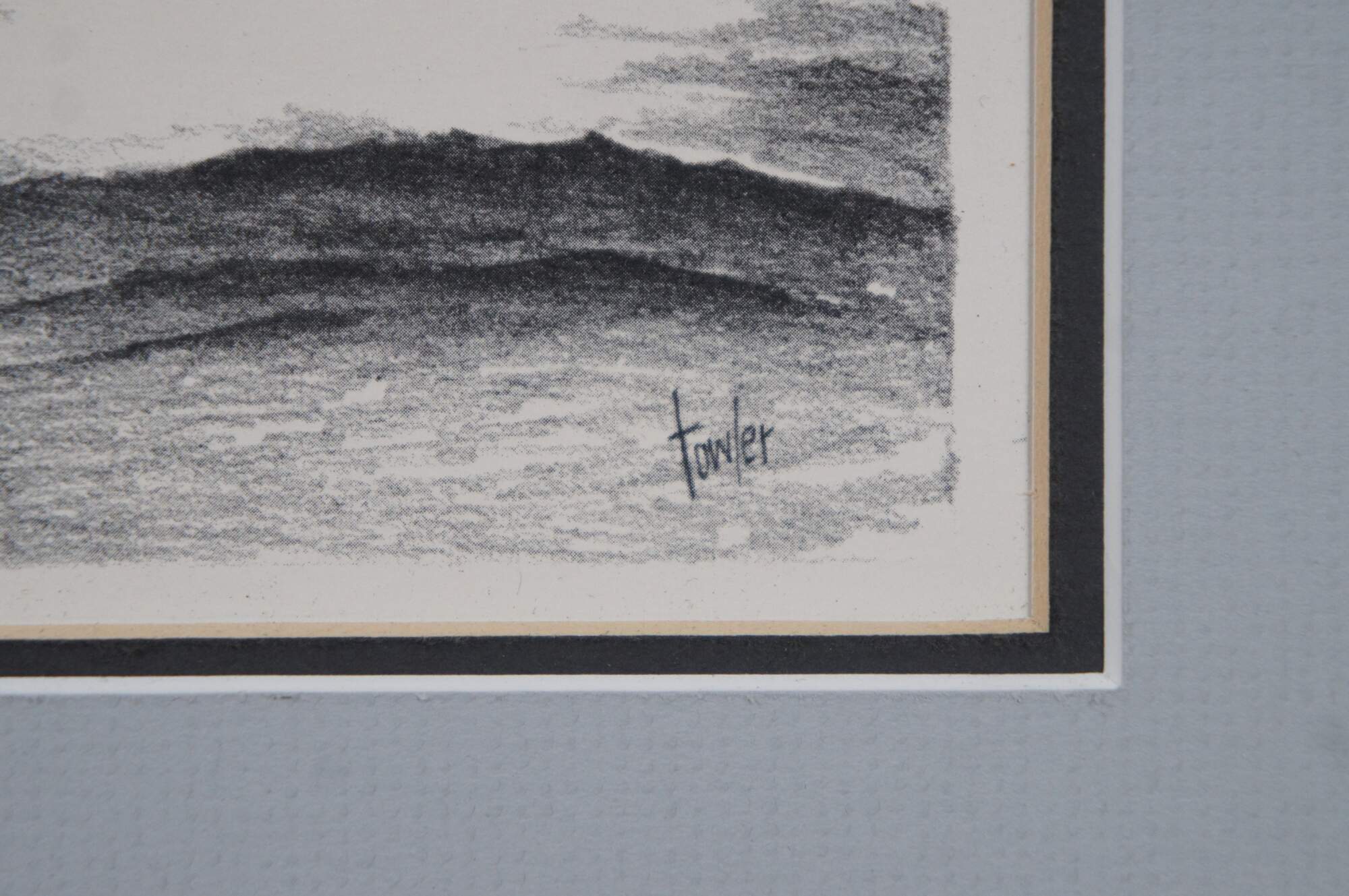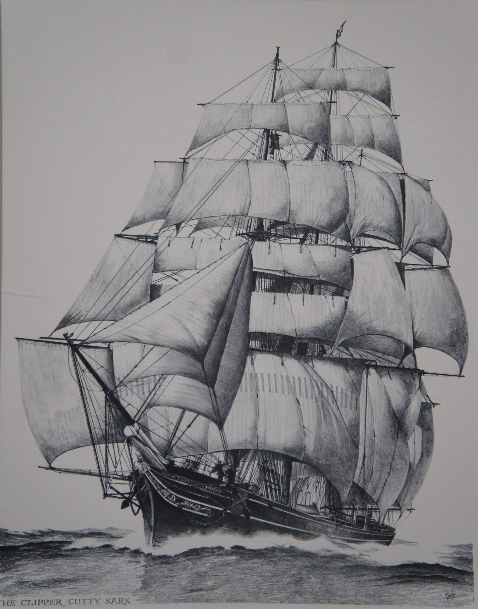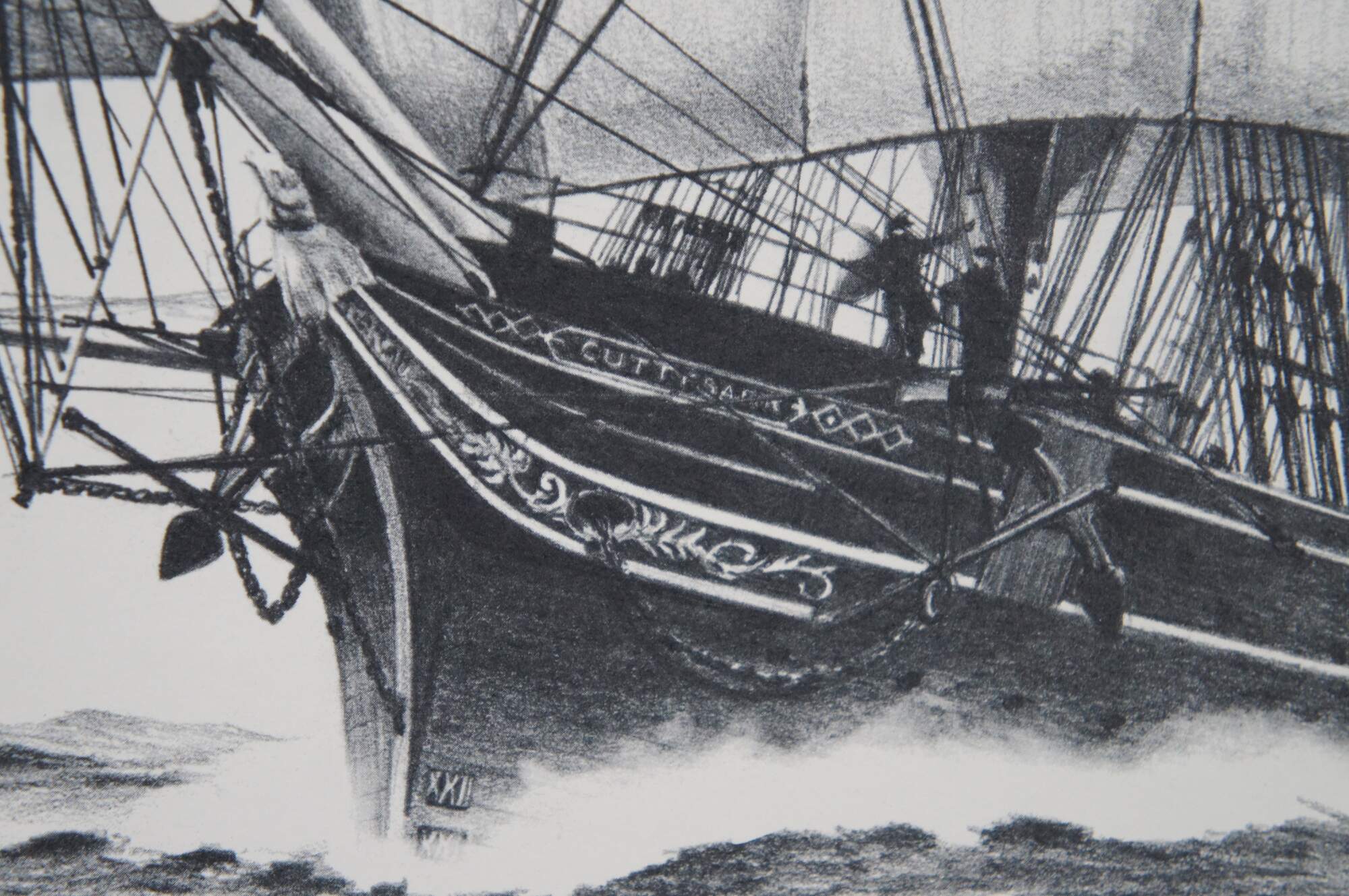 Late 20th century black and white seascape lithograph print depicting “The Clipper Cutty Sark” from an engraving by Fowler. Displayed in a neatly carved dark wood frame. Professionally framed and matted.