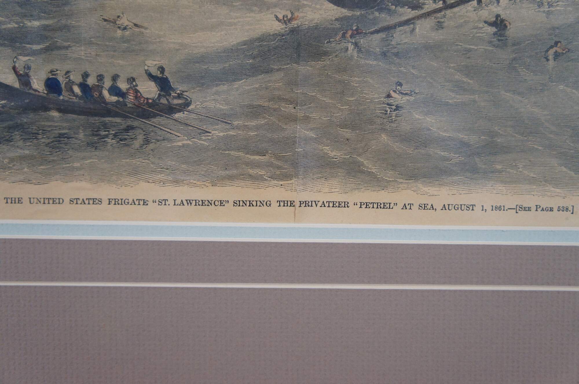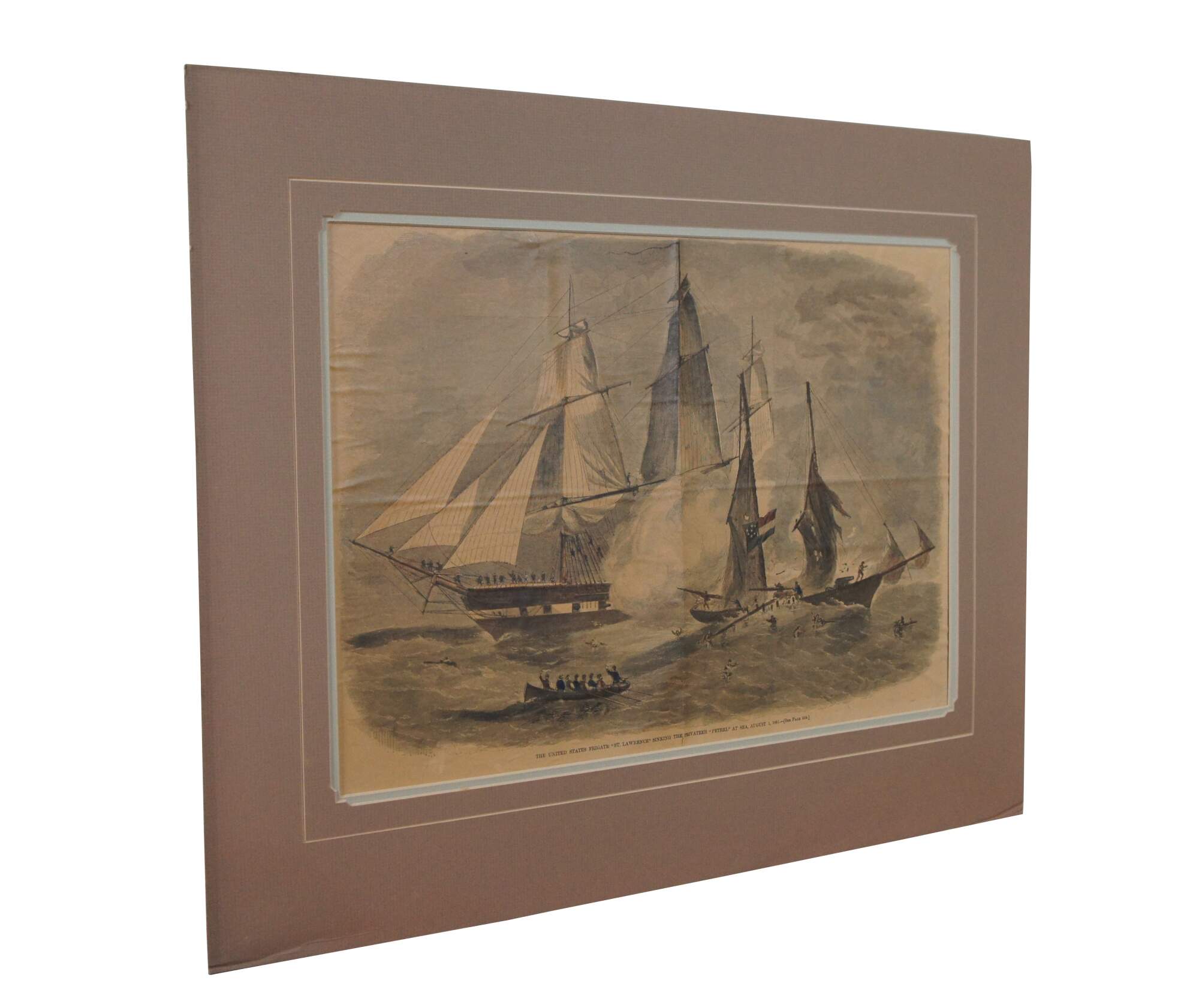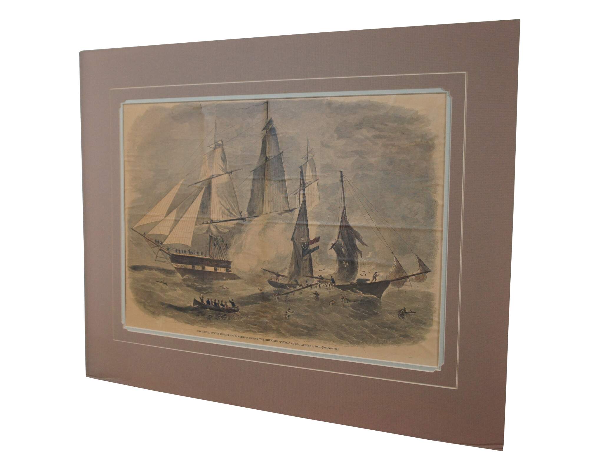 Antique hand colored engraving depicting “The United States Frigate ‘St. Lawrence’ Sinking the Privateer ‘Petrel’ at Sea, August 1, 1861,” extracted from the August 24, 1861 issue of Harper’s Weekly. From The American Civil War Conflict 1860-64.