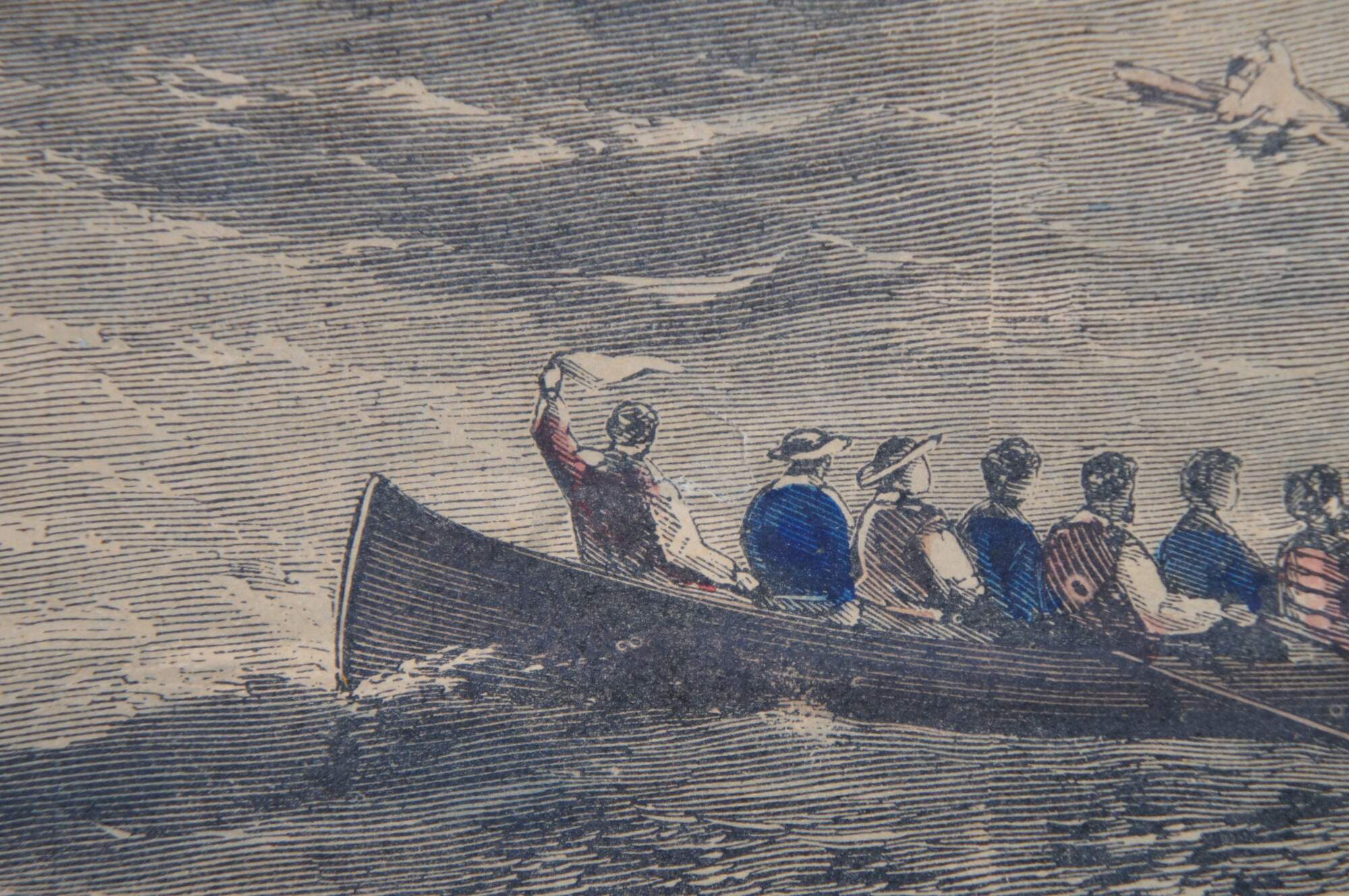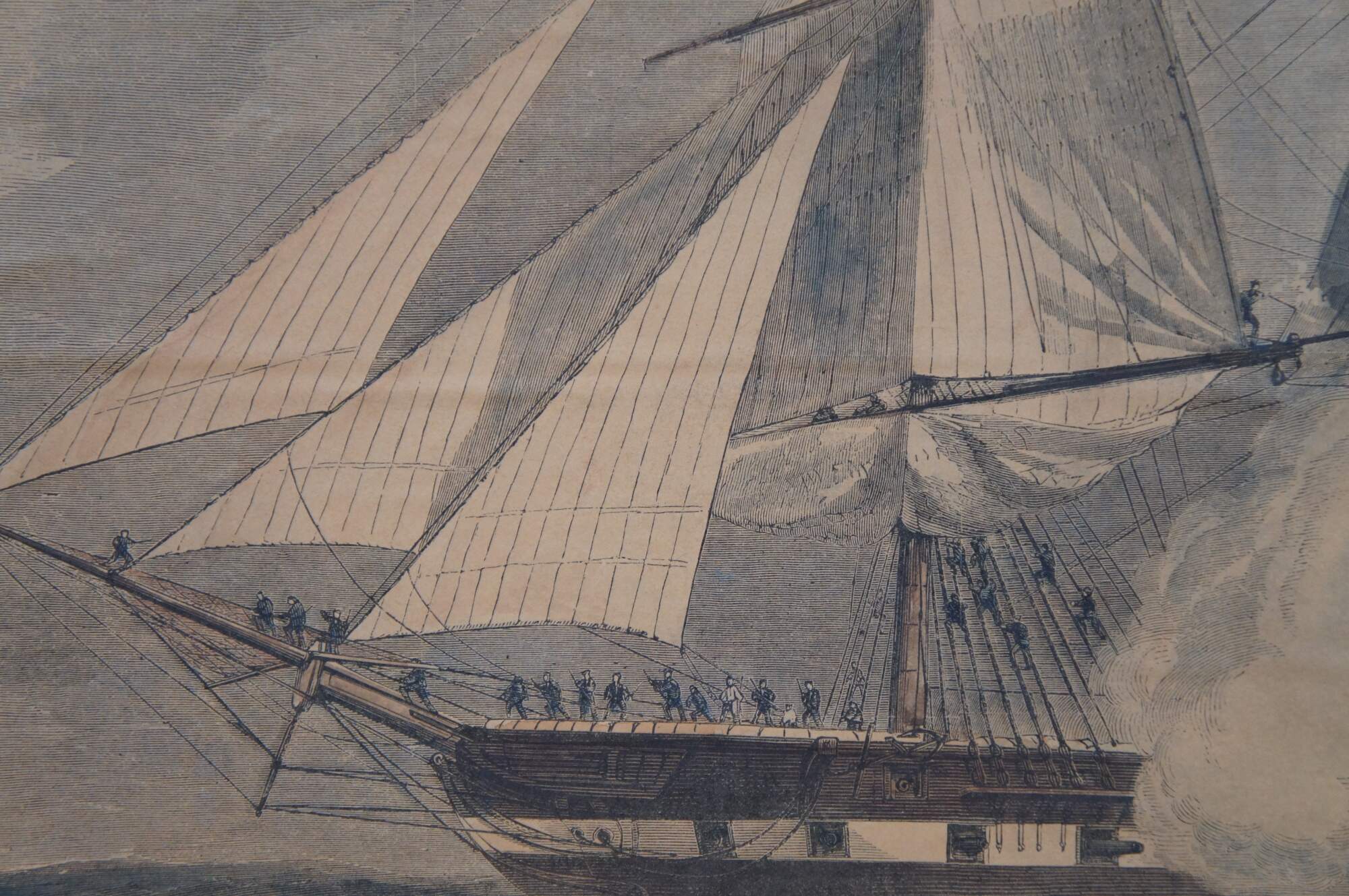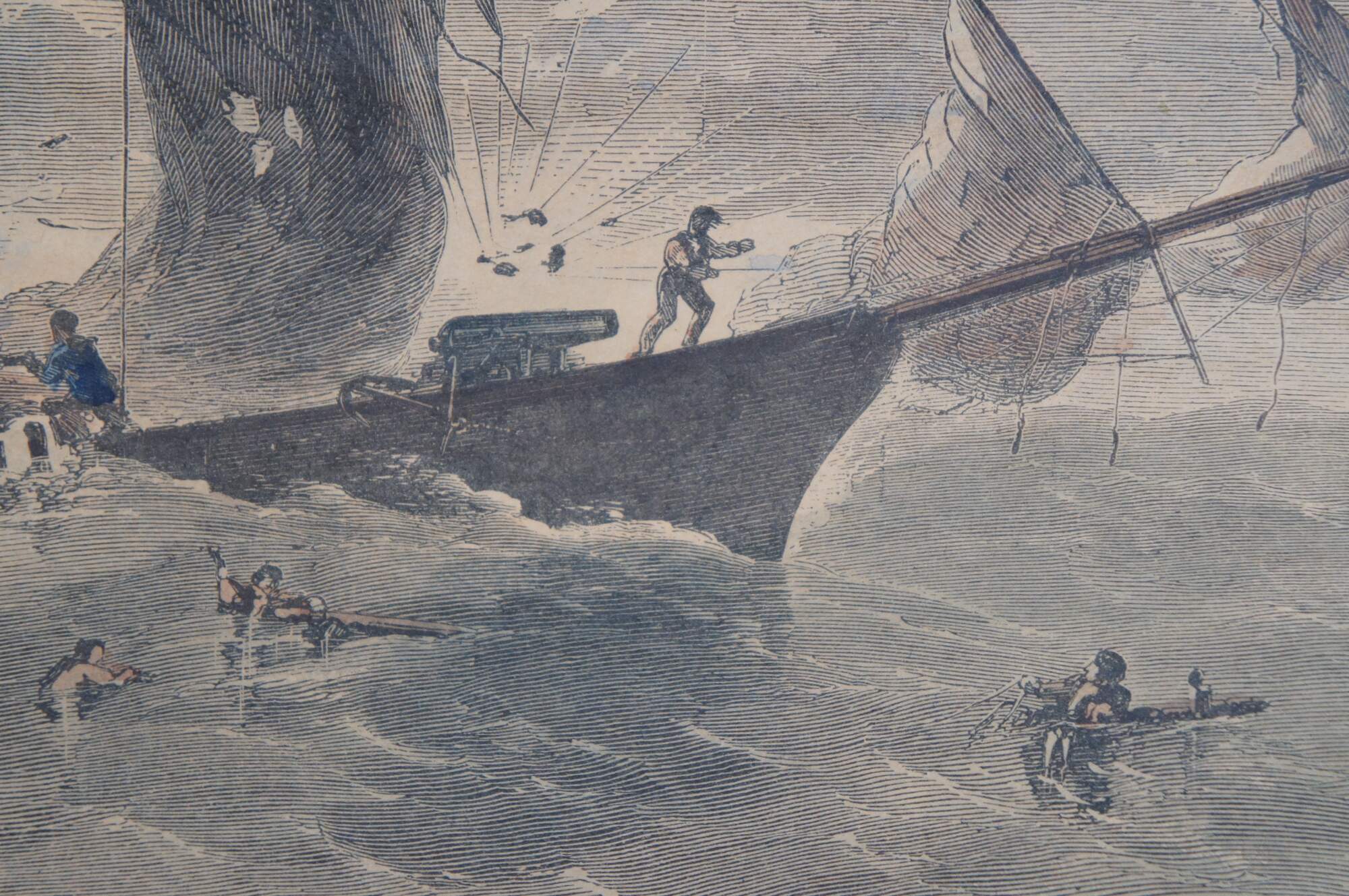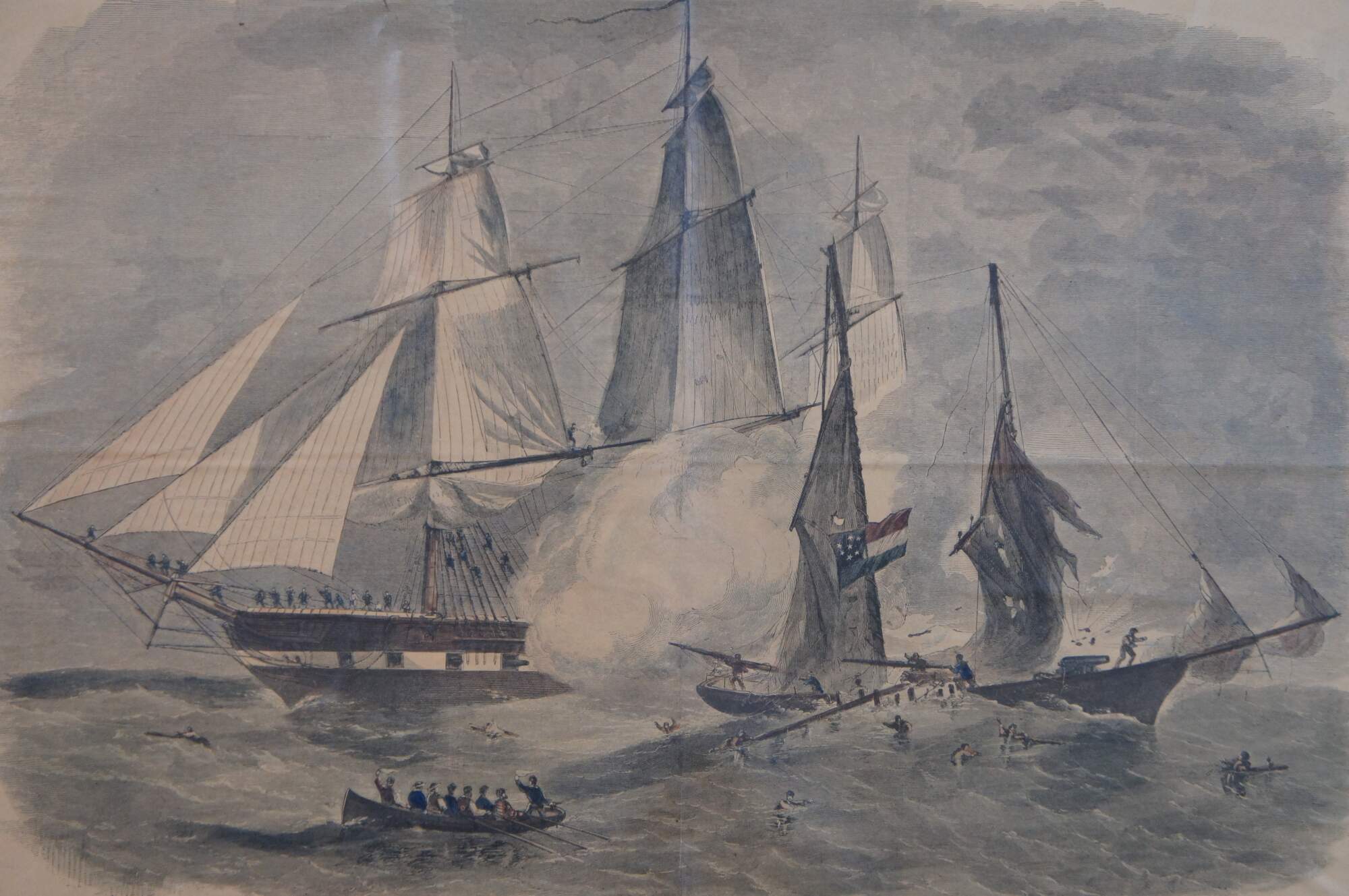Antique hand colored engraving depicting “The United States Frigate ‘St. Lawrence’ Sinking the Privateer ‘Petrel’ at Sea, August 1, 1861,” extracted from the August 24, 1861 issue of Harper’s Weekly. From The American Civil War Conflict 1860-64.